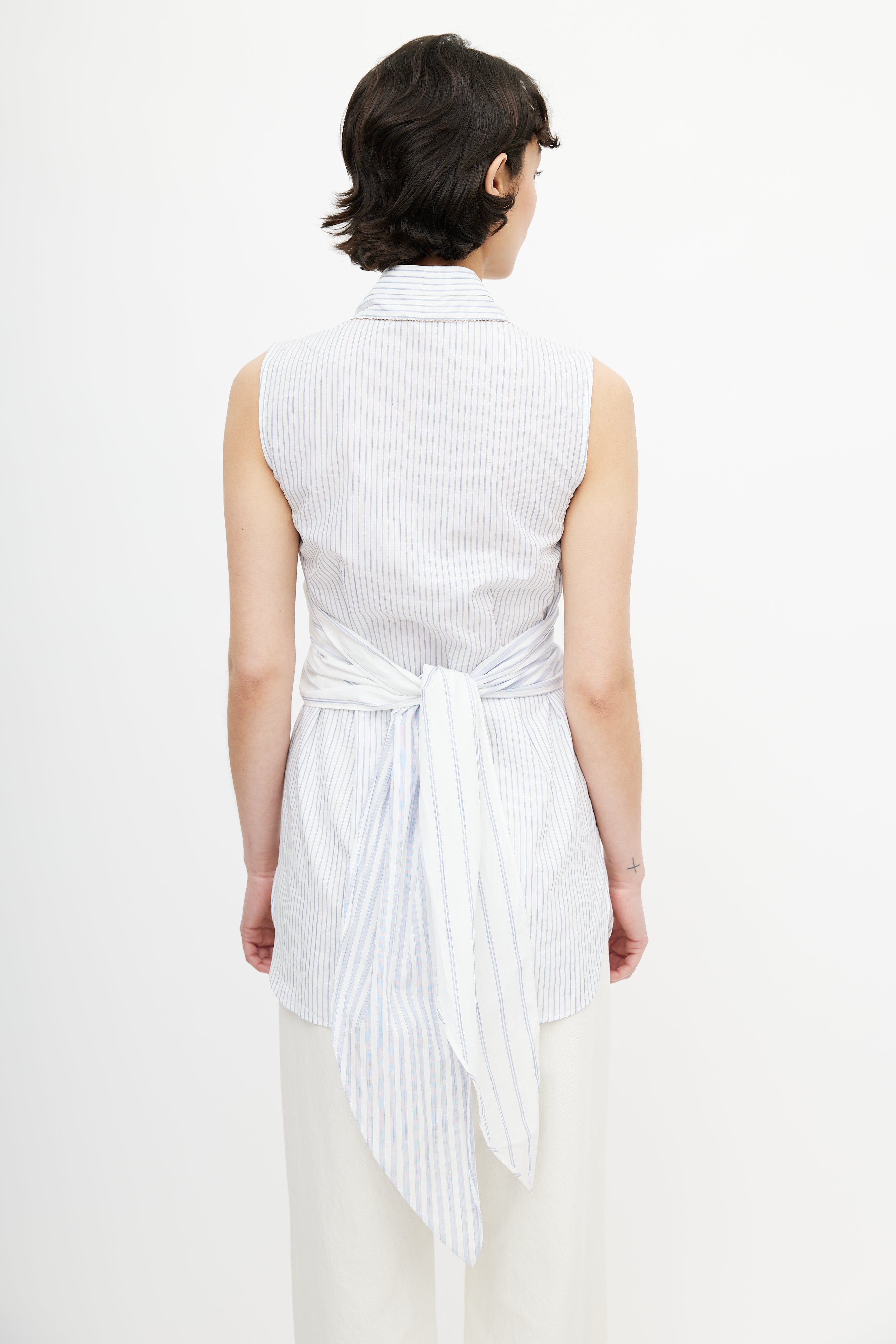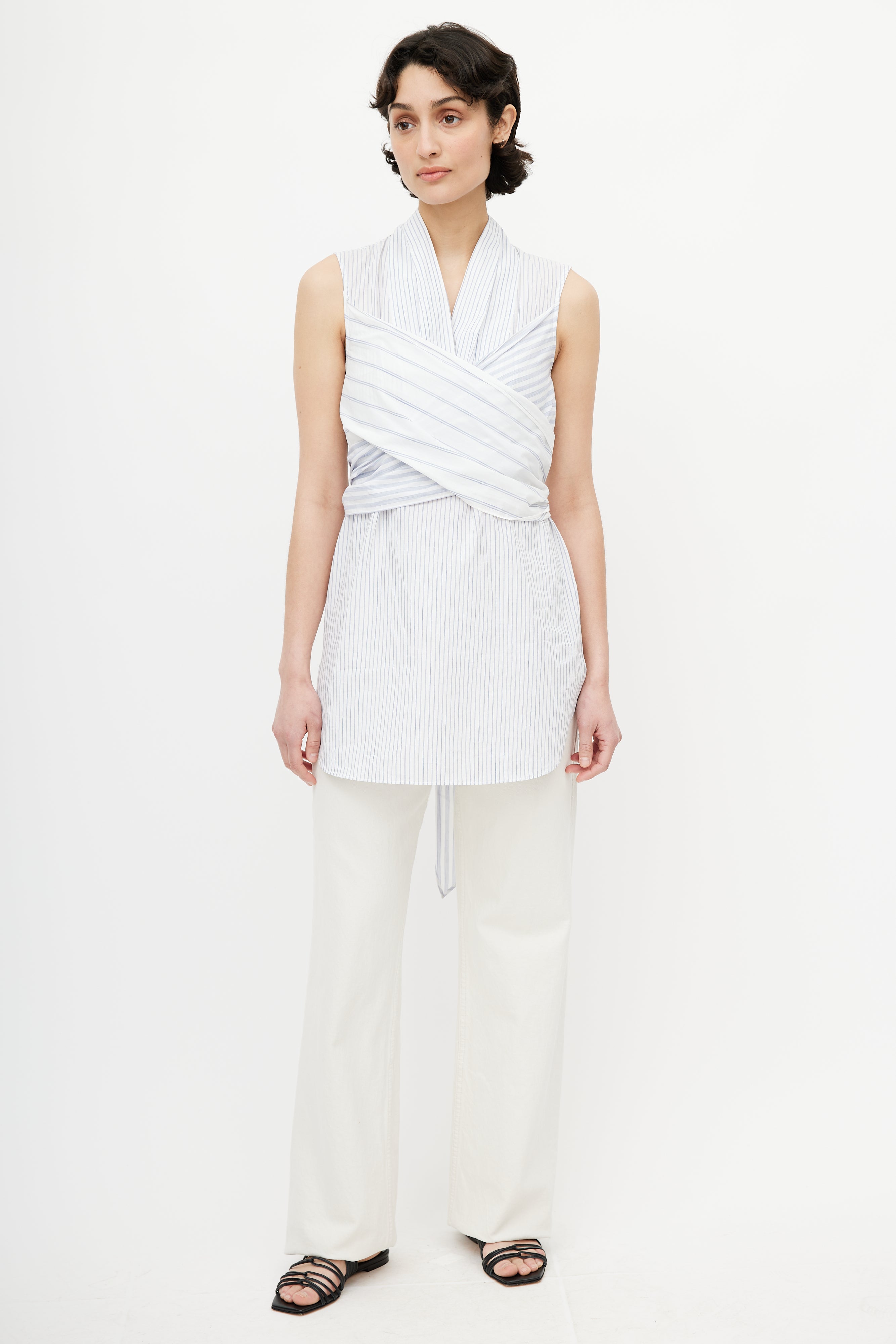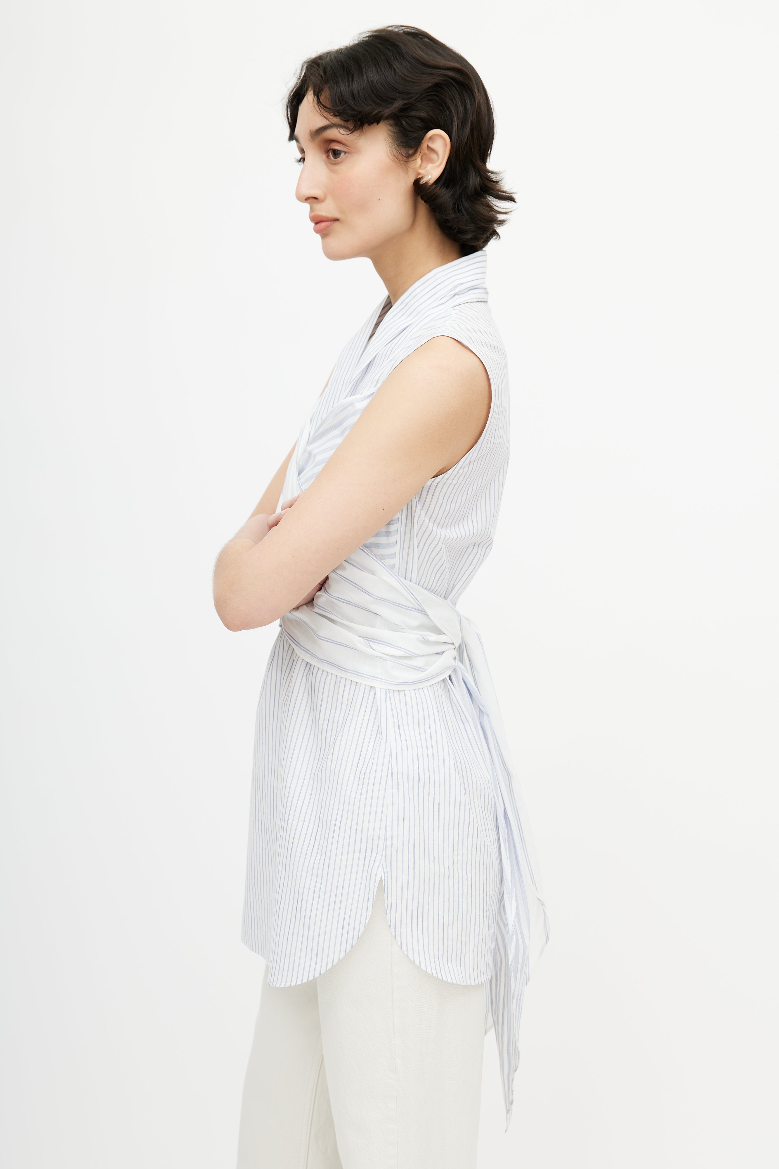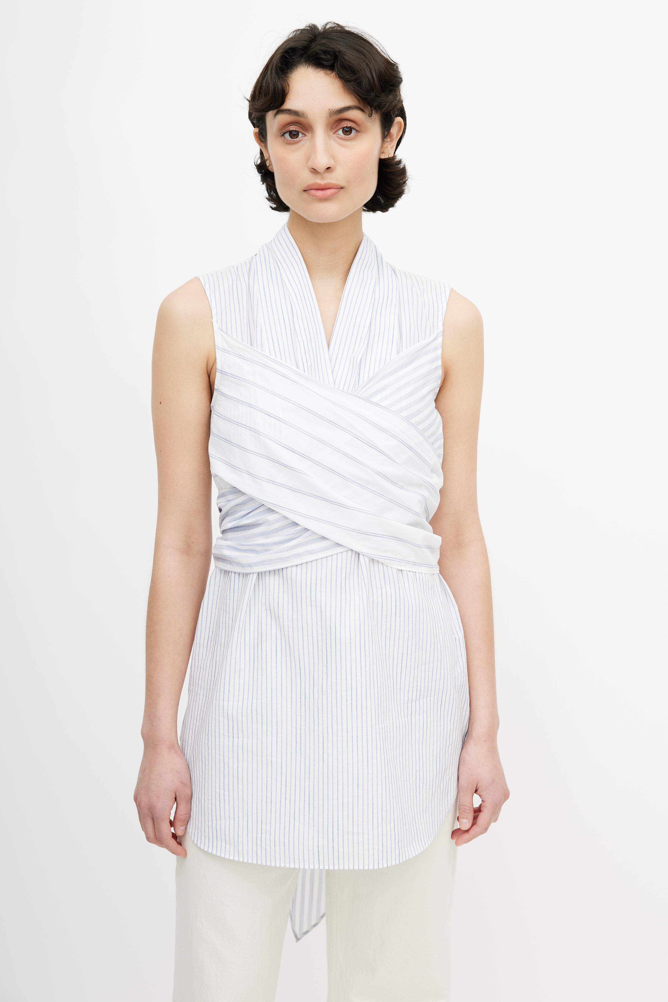 Pre-owned Brunello Cucinelli blue and white top featuring a striped pattern throughout, V-neckline with Monili bead trim, criss cross tie wrap at front, darted front, and slits at side seam.