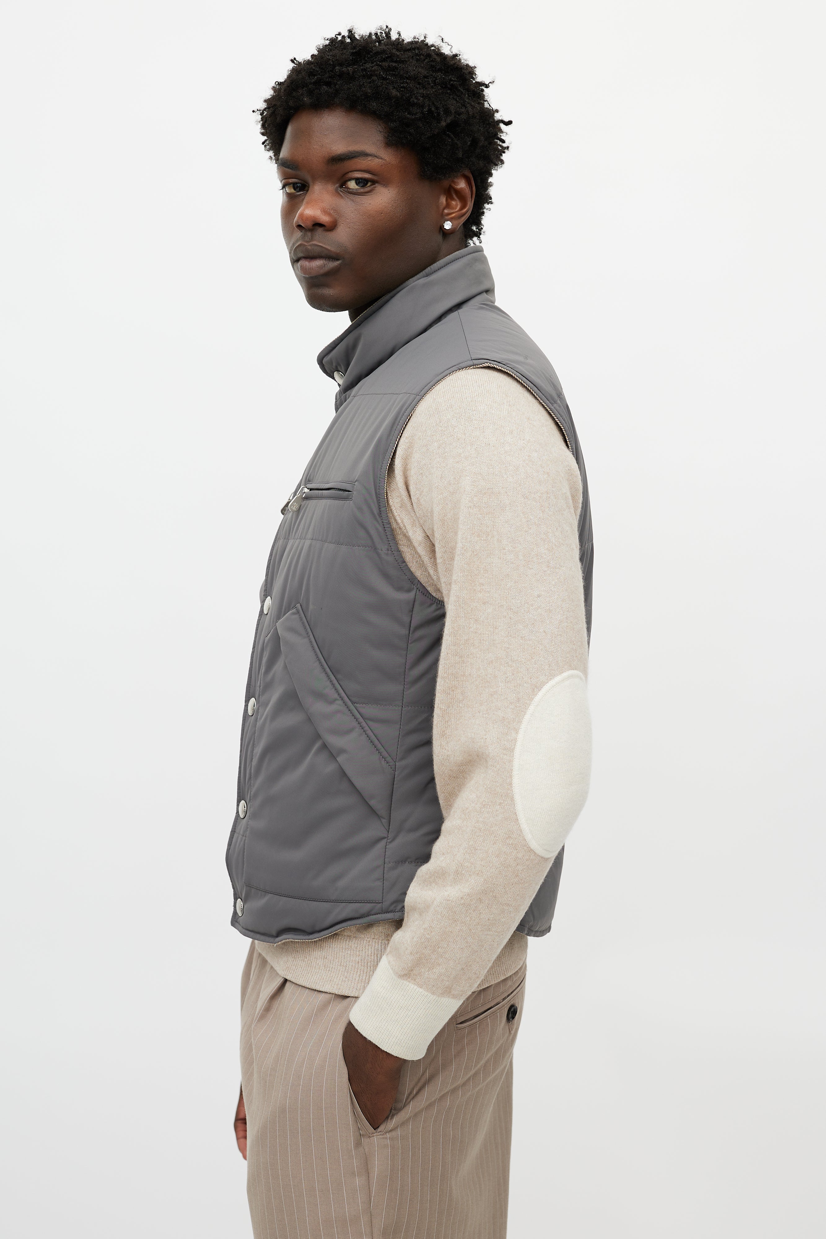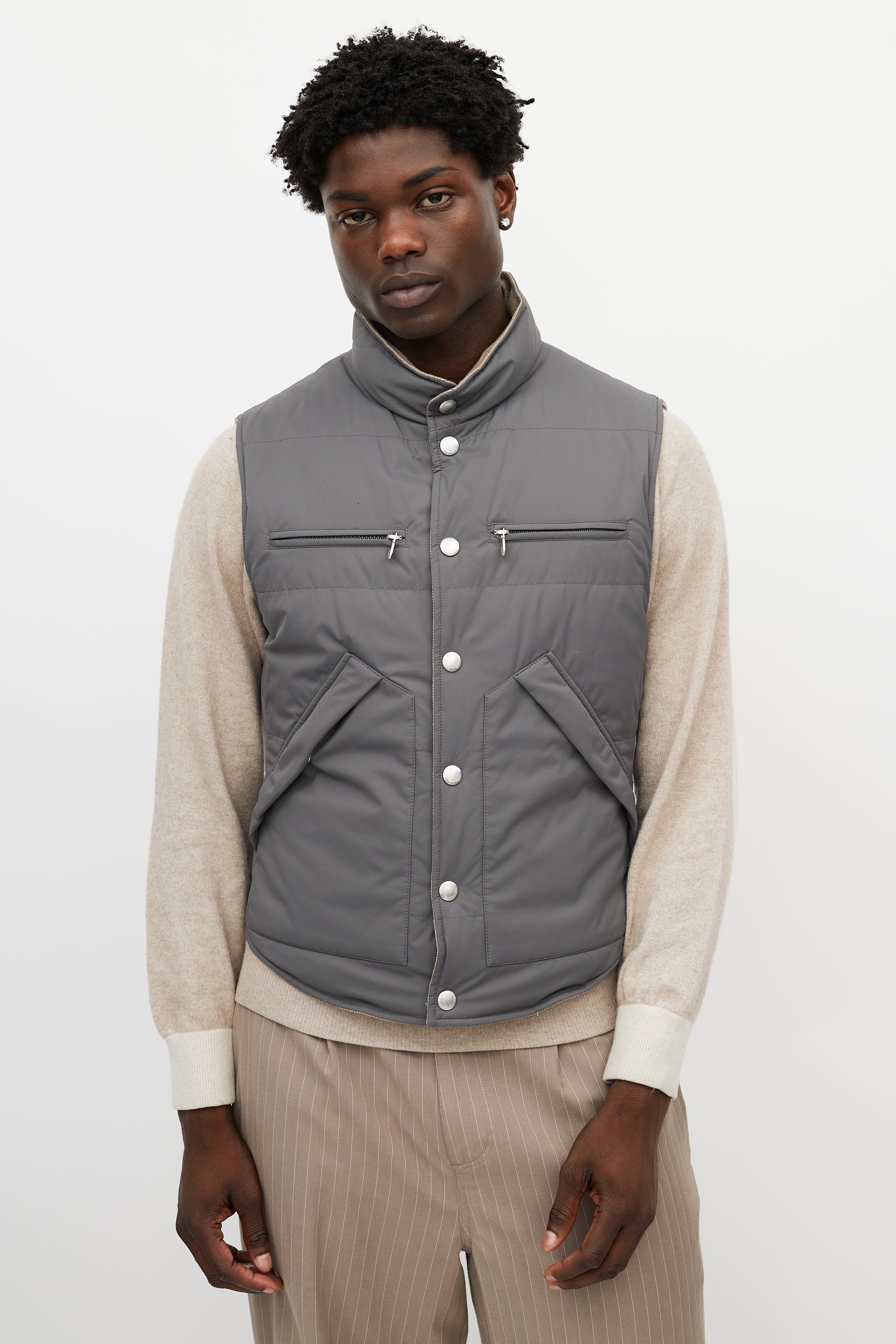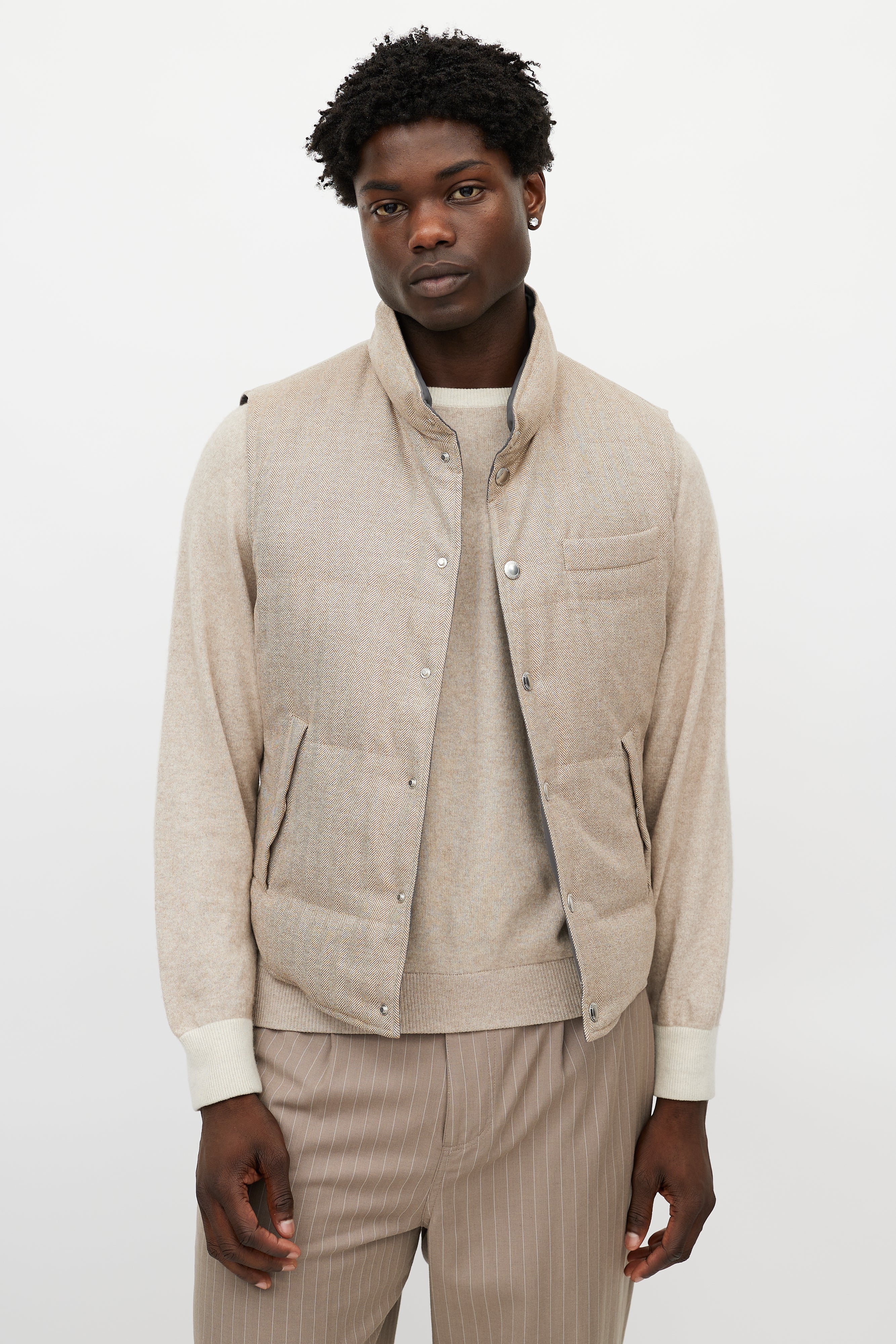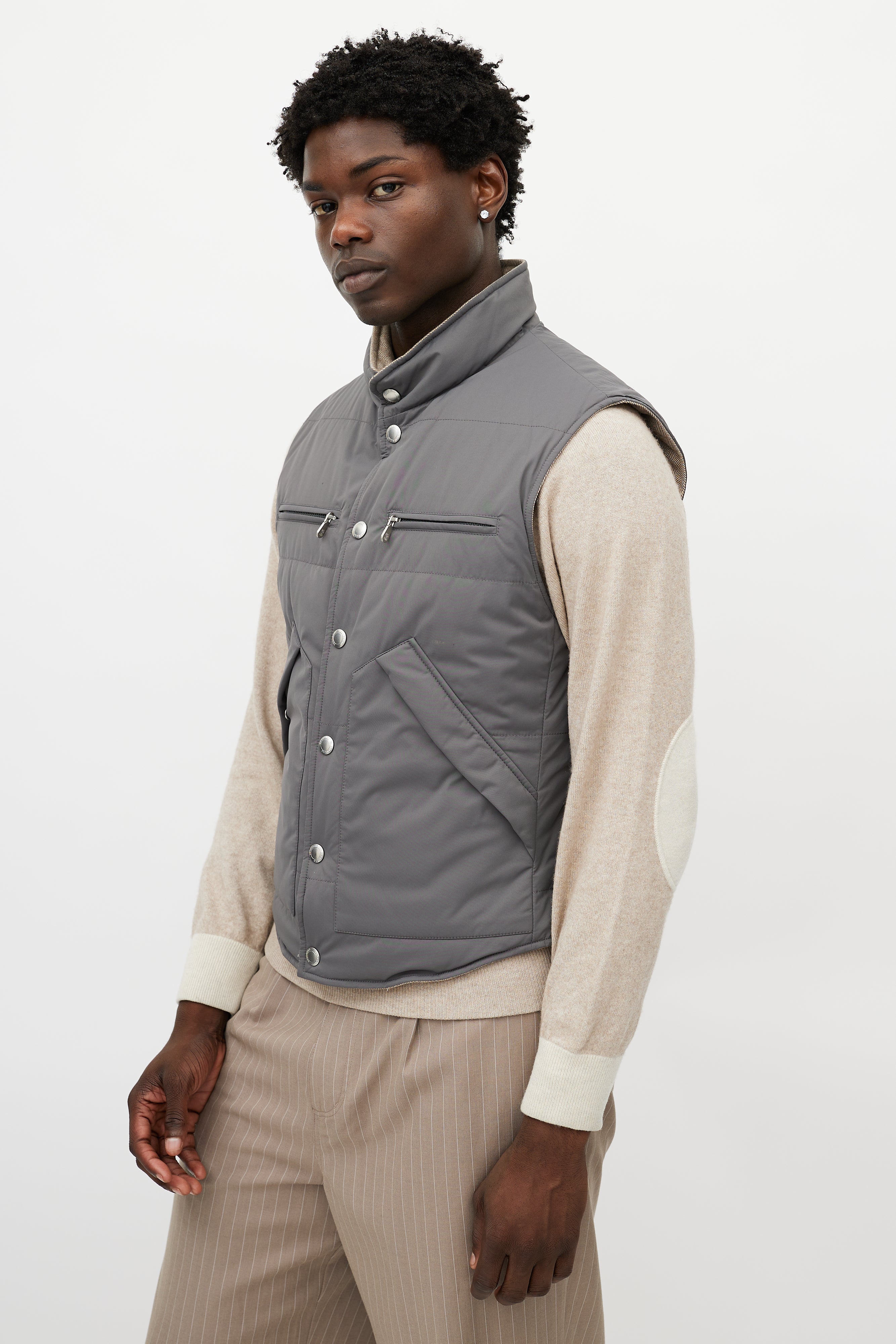 Pre-owned Brunello Cucinelli brown and grey reversible tweed vest featuring a funnel neck collar, one slip pocket at chest, two slip pockets at hip, and snap button closure.