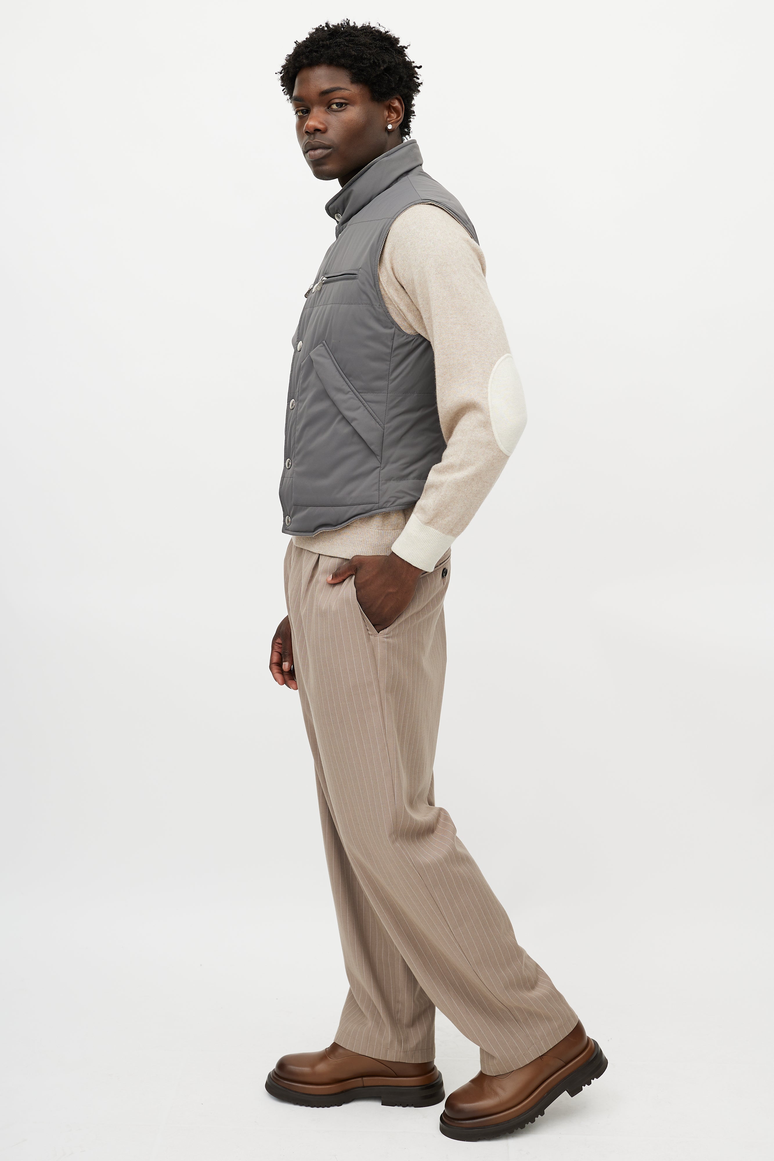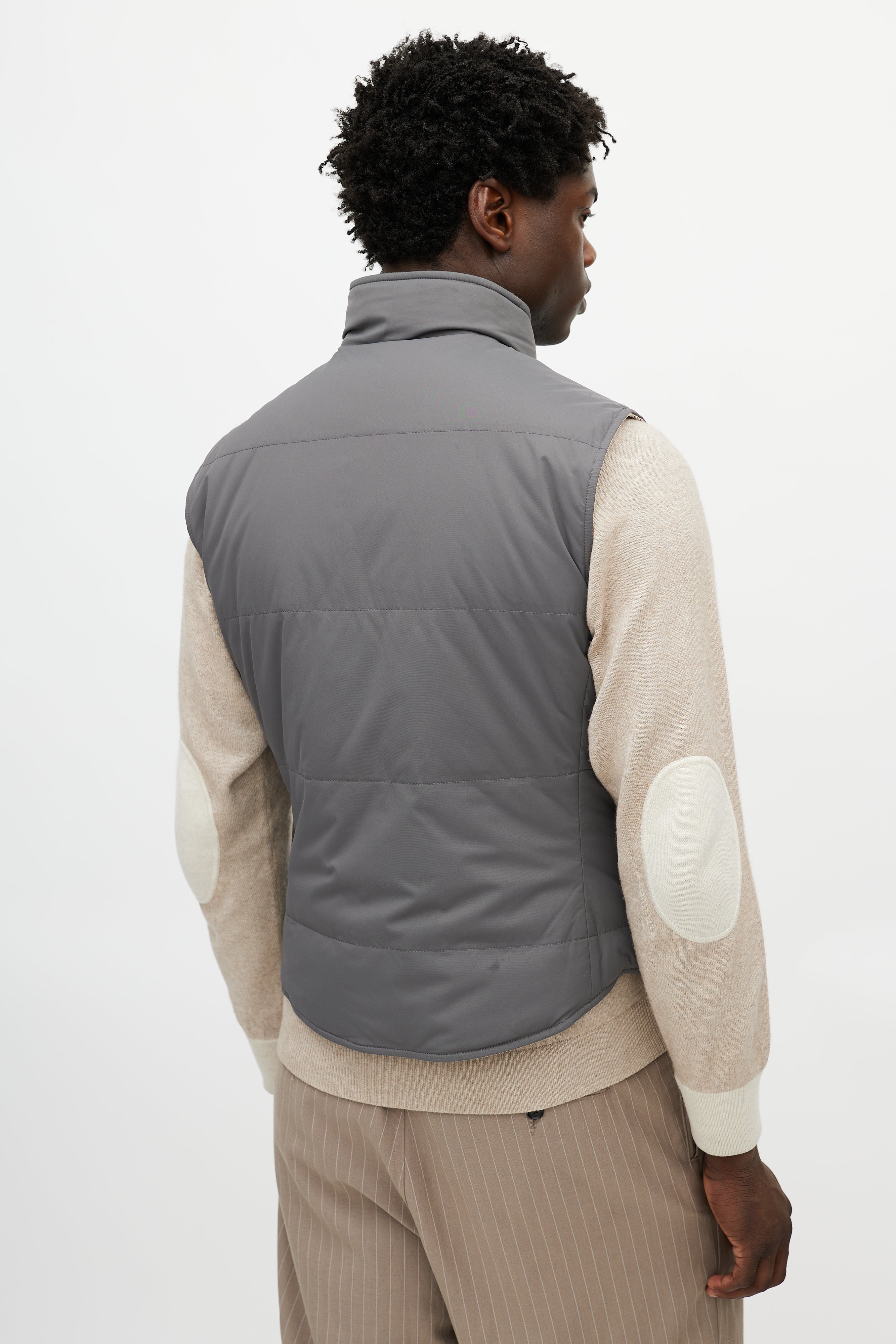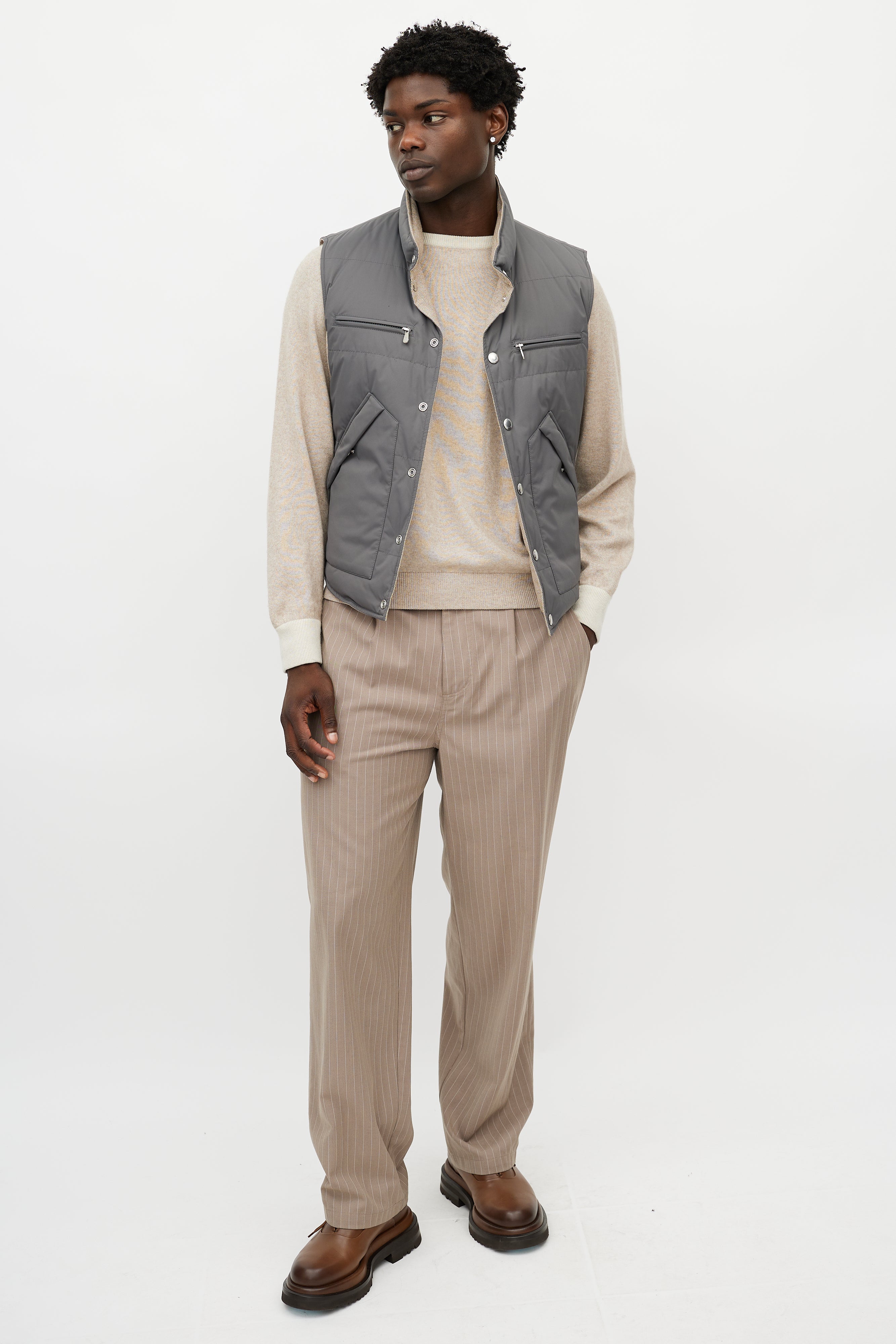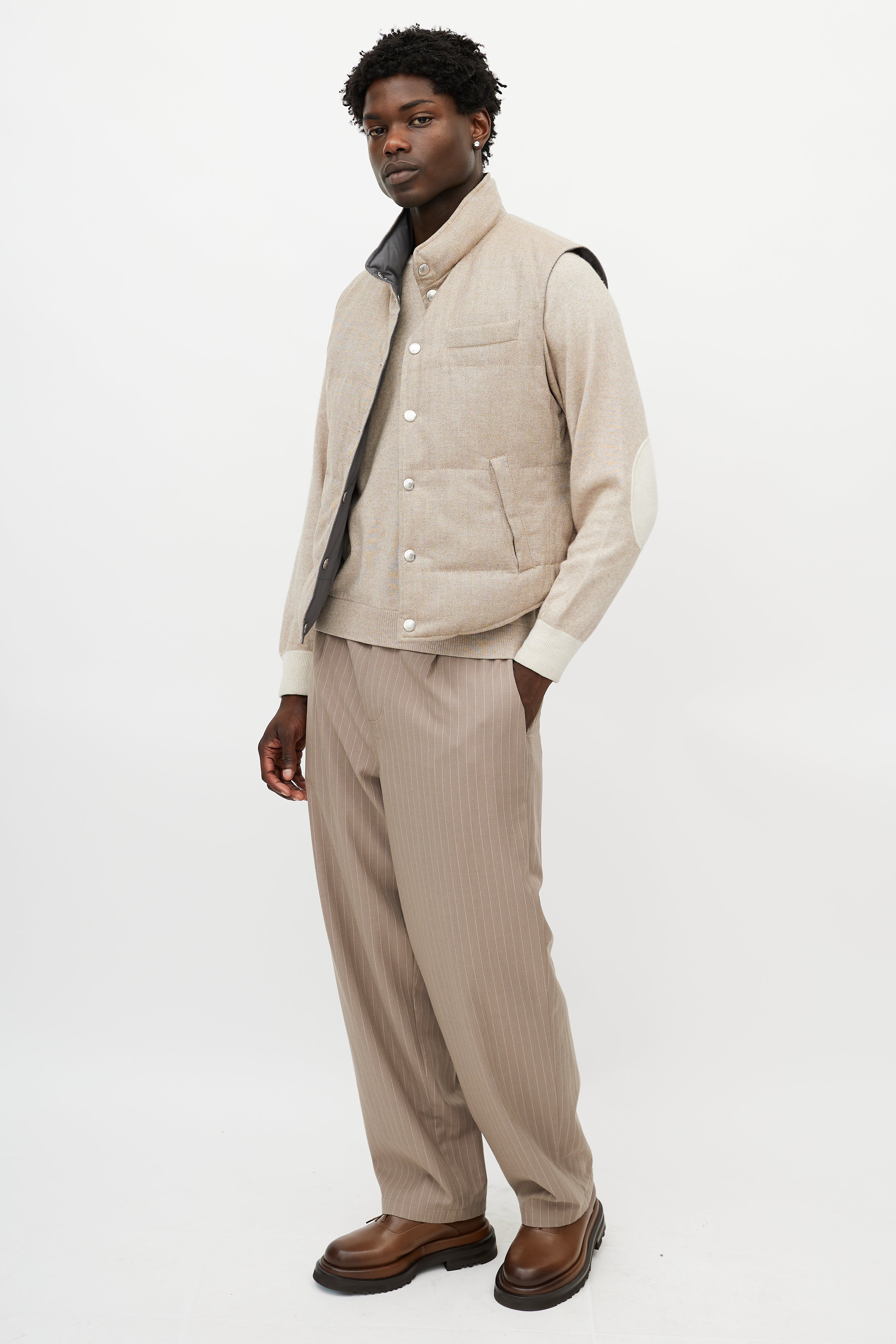 Pre-owned Brunello Cucinelli brown and grey reversible tweed vest featuring a funnel neck collar, one slip pocket at chest, two slip pockets at hip, and snap button closure.