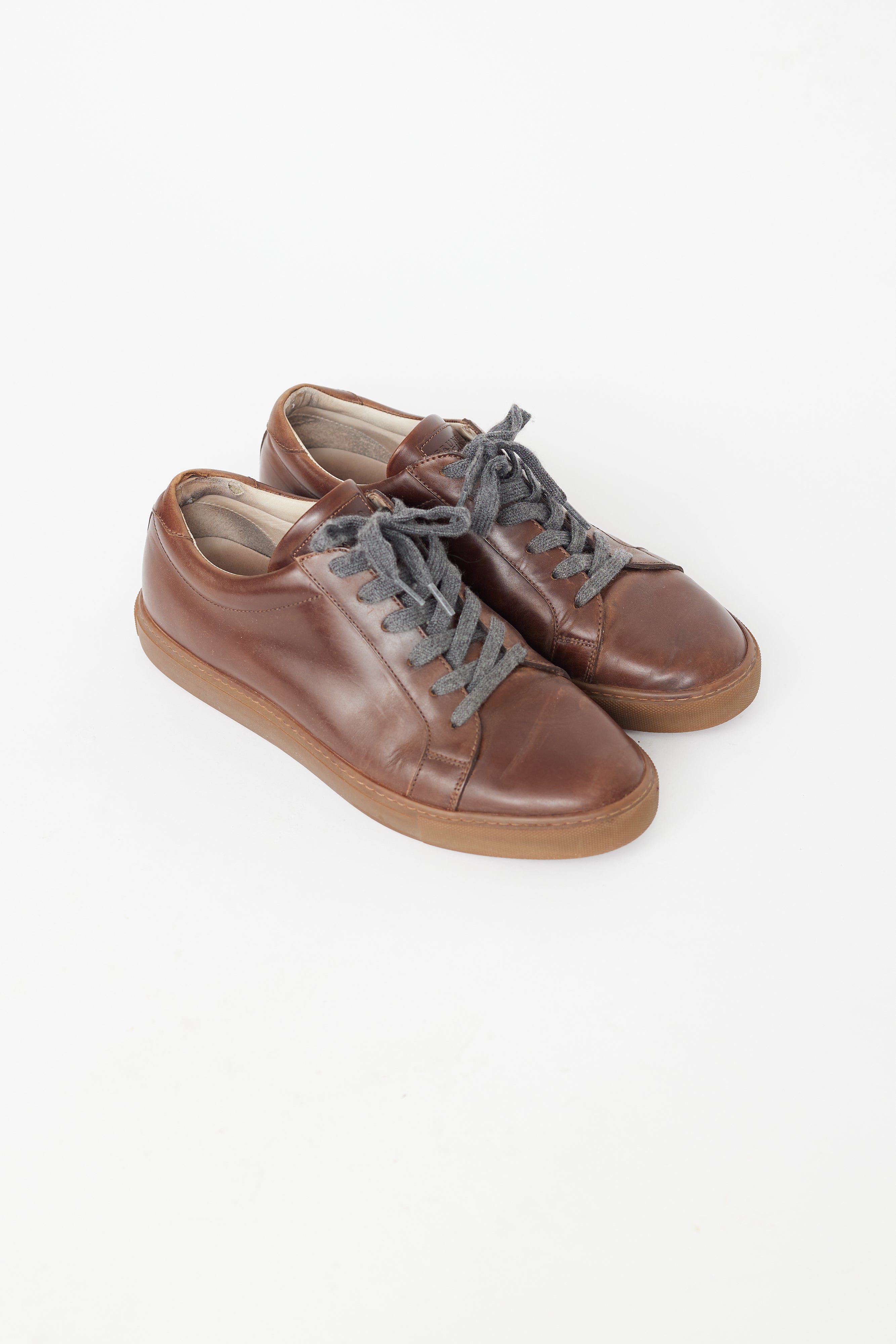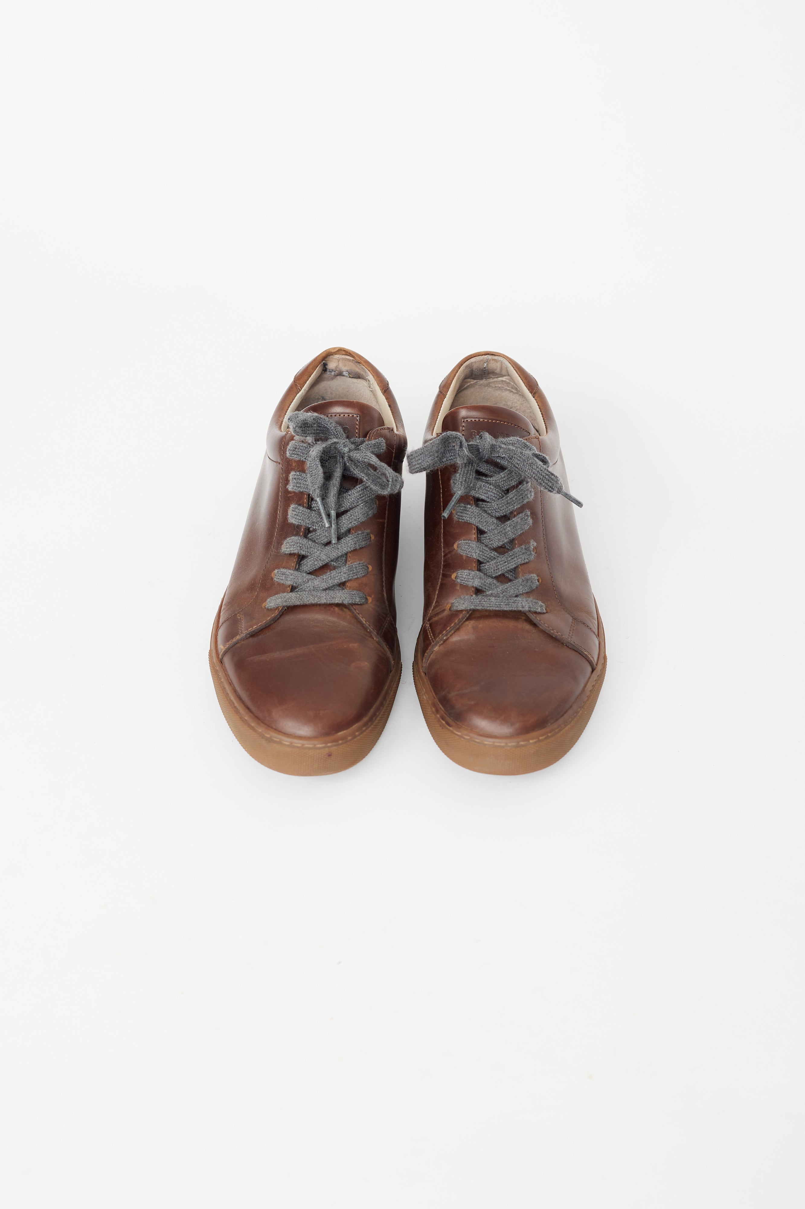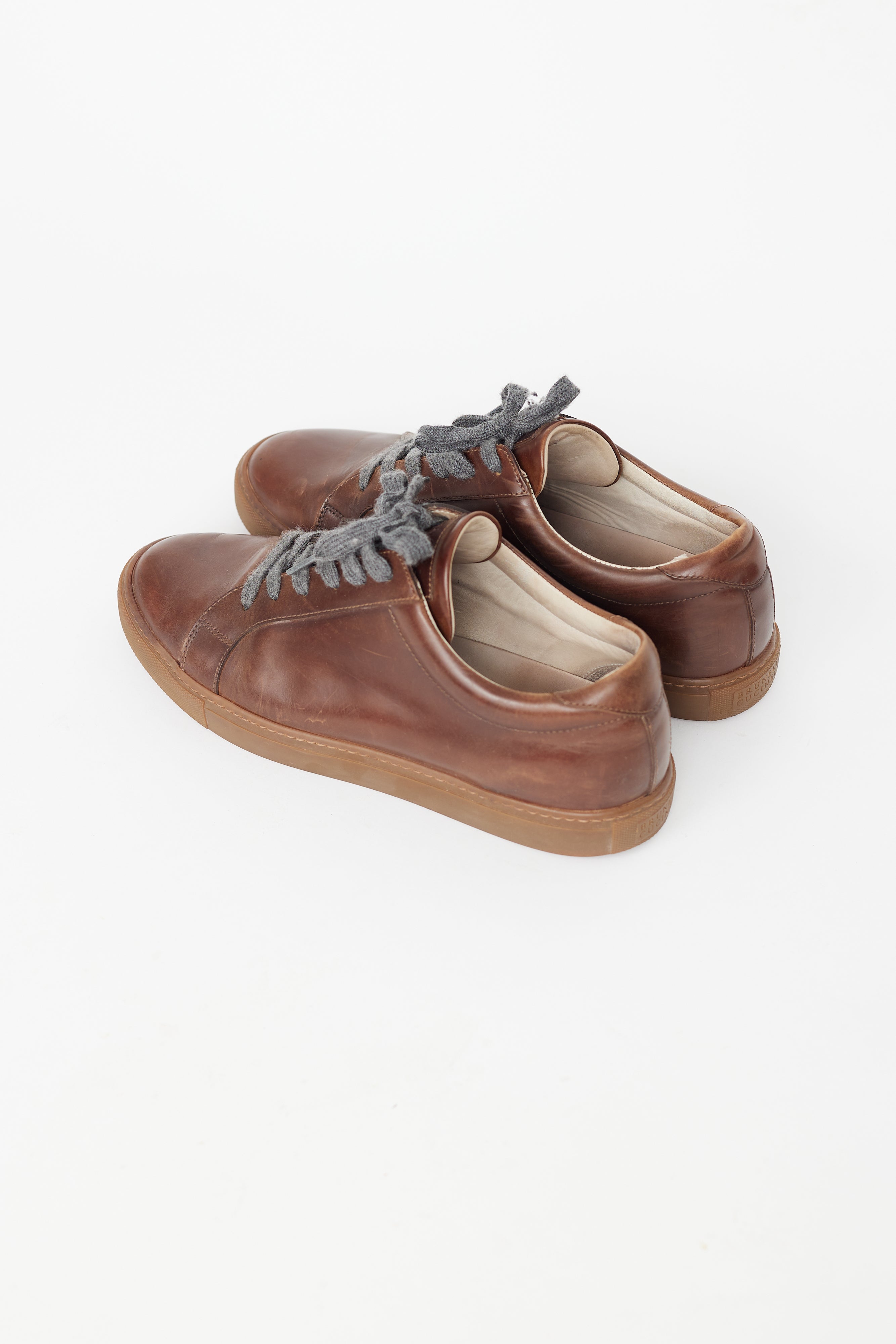 Pre-owned Brunello Cucinelli brown sneakers featuring leather upper, lace up vamp, brown rubber outsole, leather insole and embossed logo at tongue and at back. Comes with original dust bag.