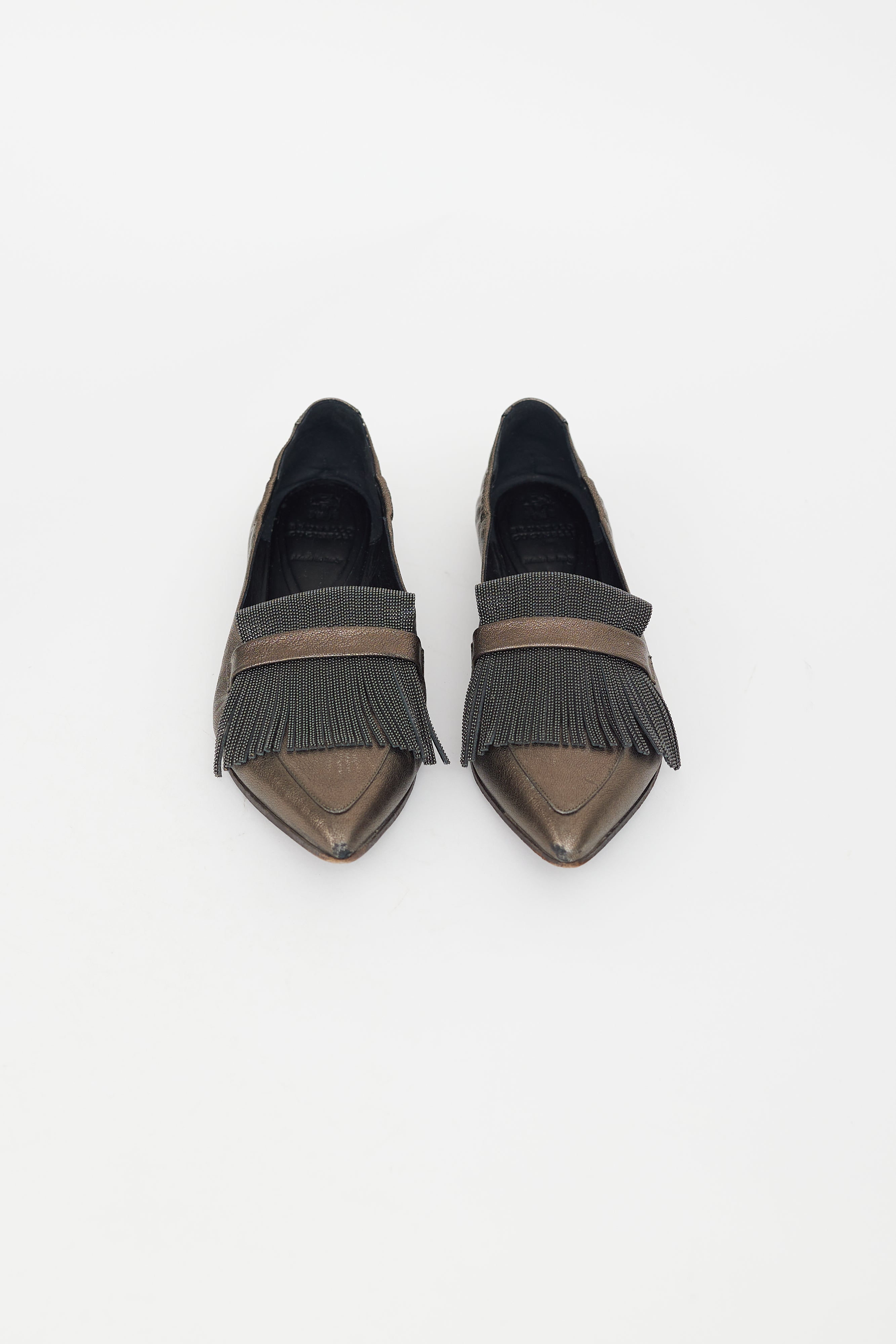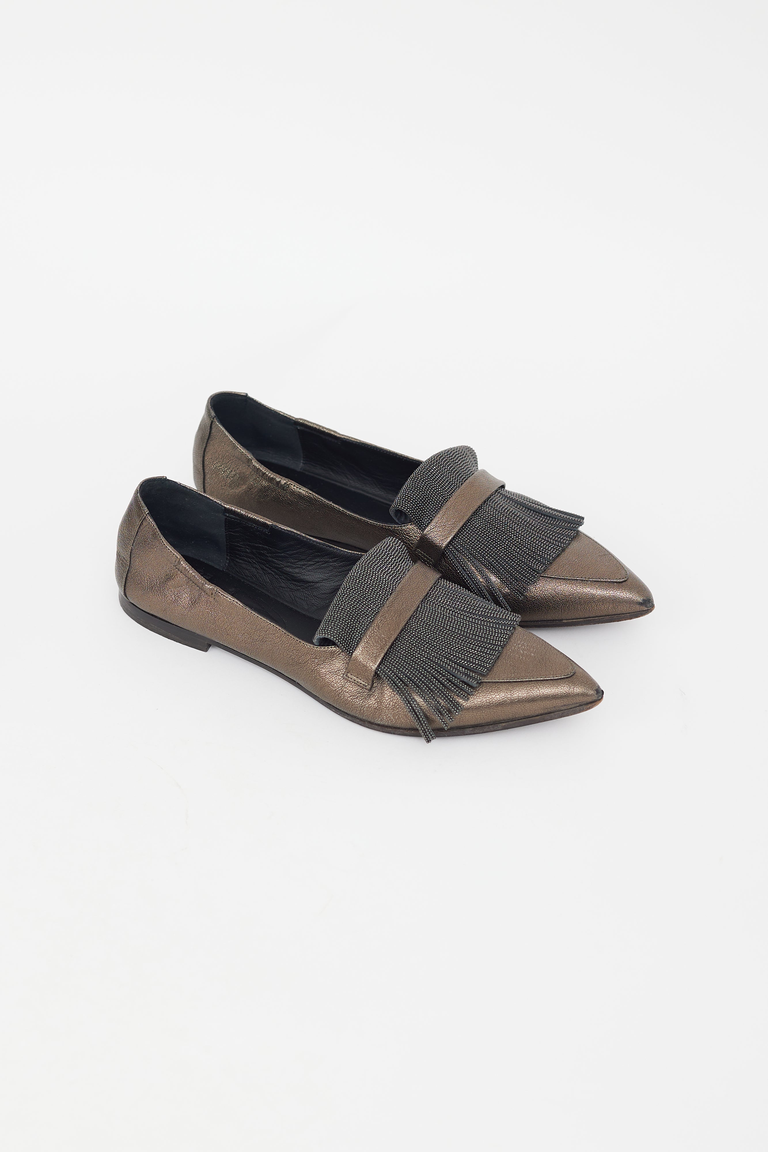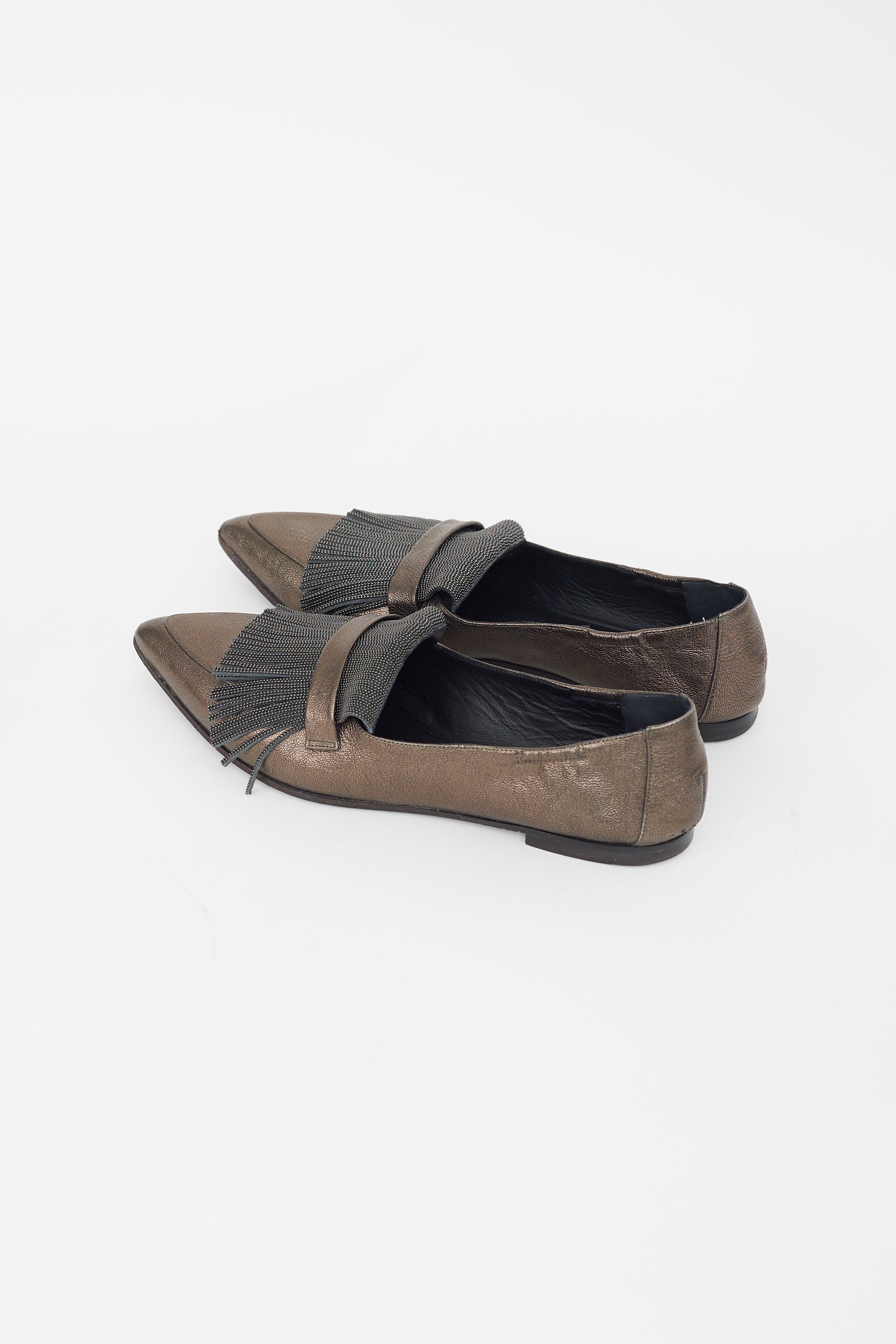 Pre-owned Brunello Cucinelli brown metallic loafers featuring pointed toe, Monili bead embellished fringe at front, slip on entry, and stacked low heel.