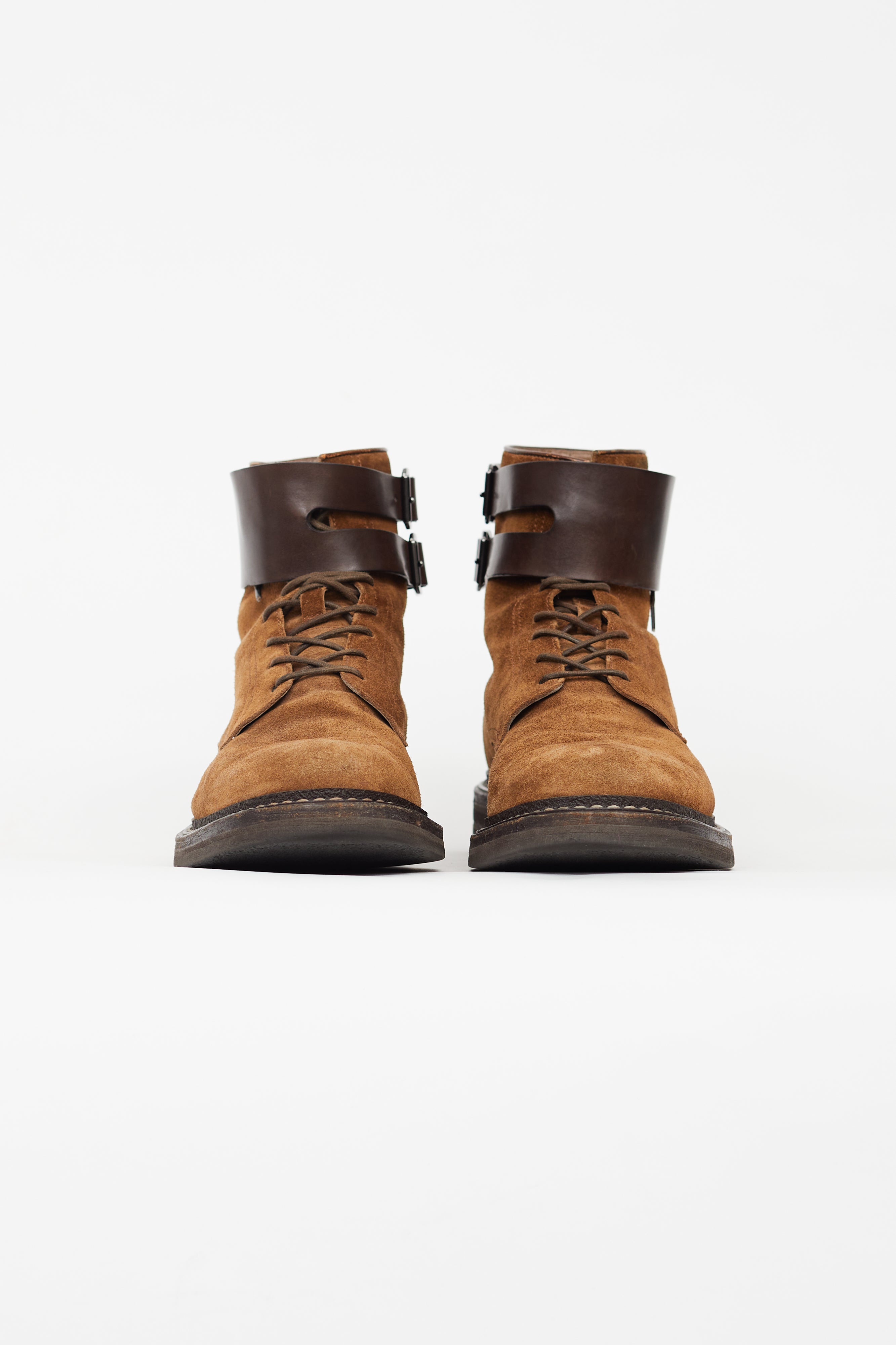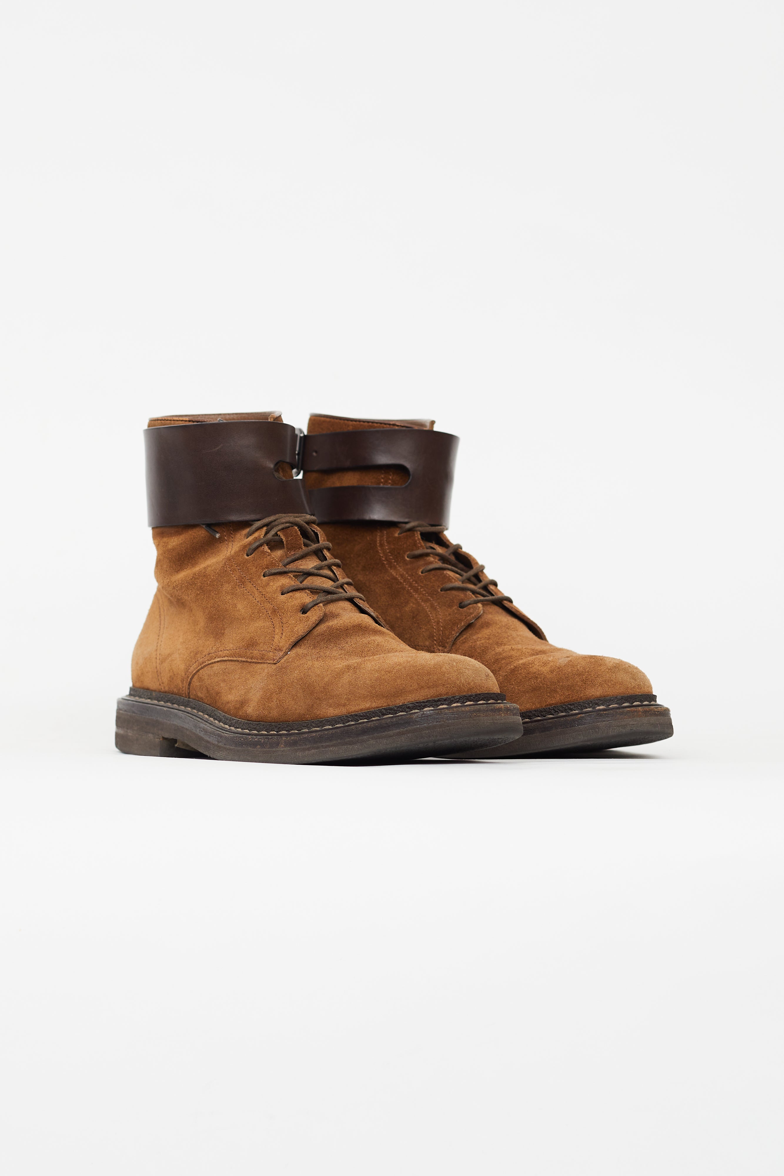 Pre-owned Brunello Cucinelli brown boots featuring rounded toe, tonal leather buckled strap at opening, lace up vamp, slip on entry, and rubber outsole.