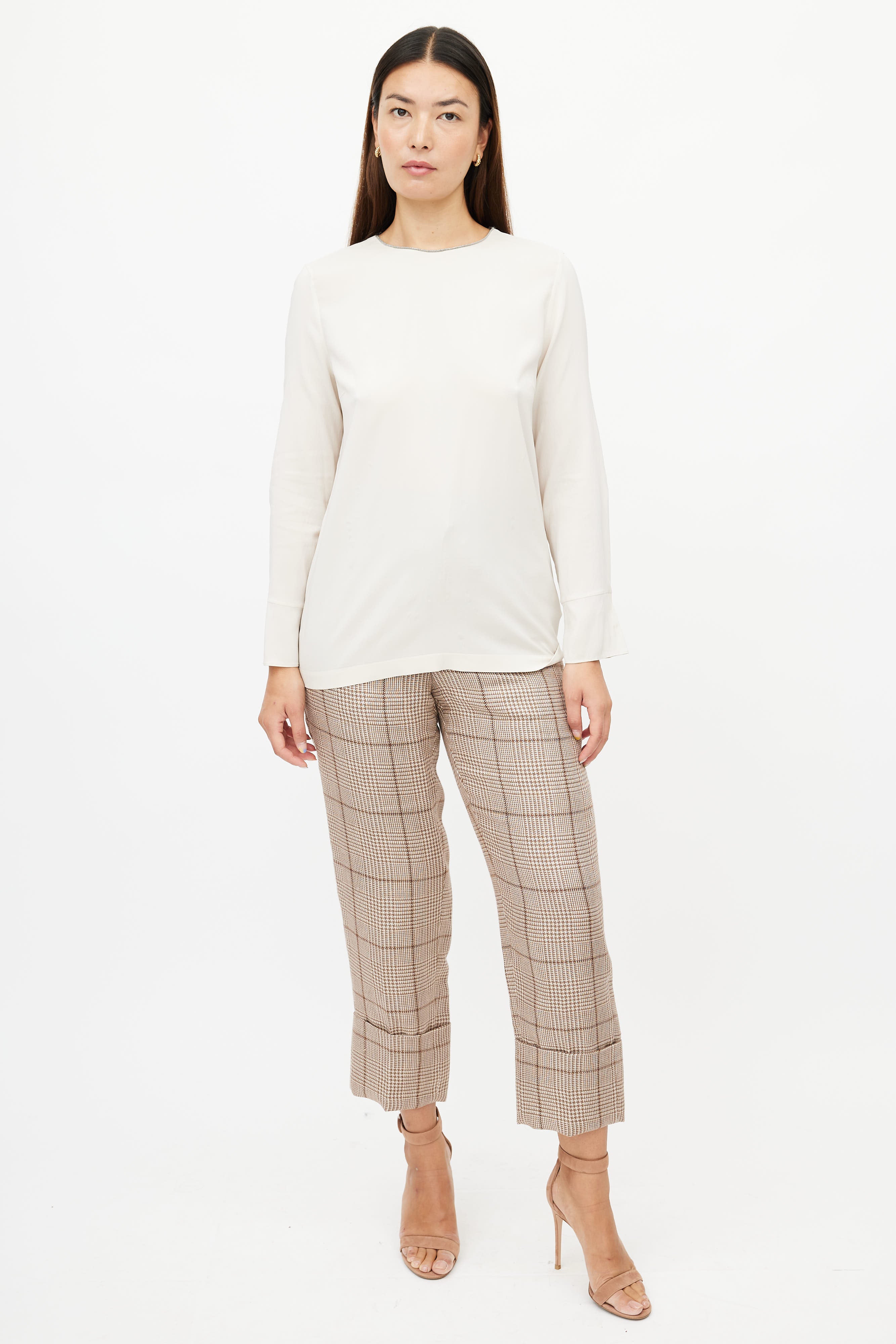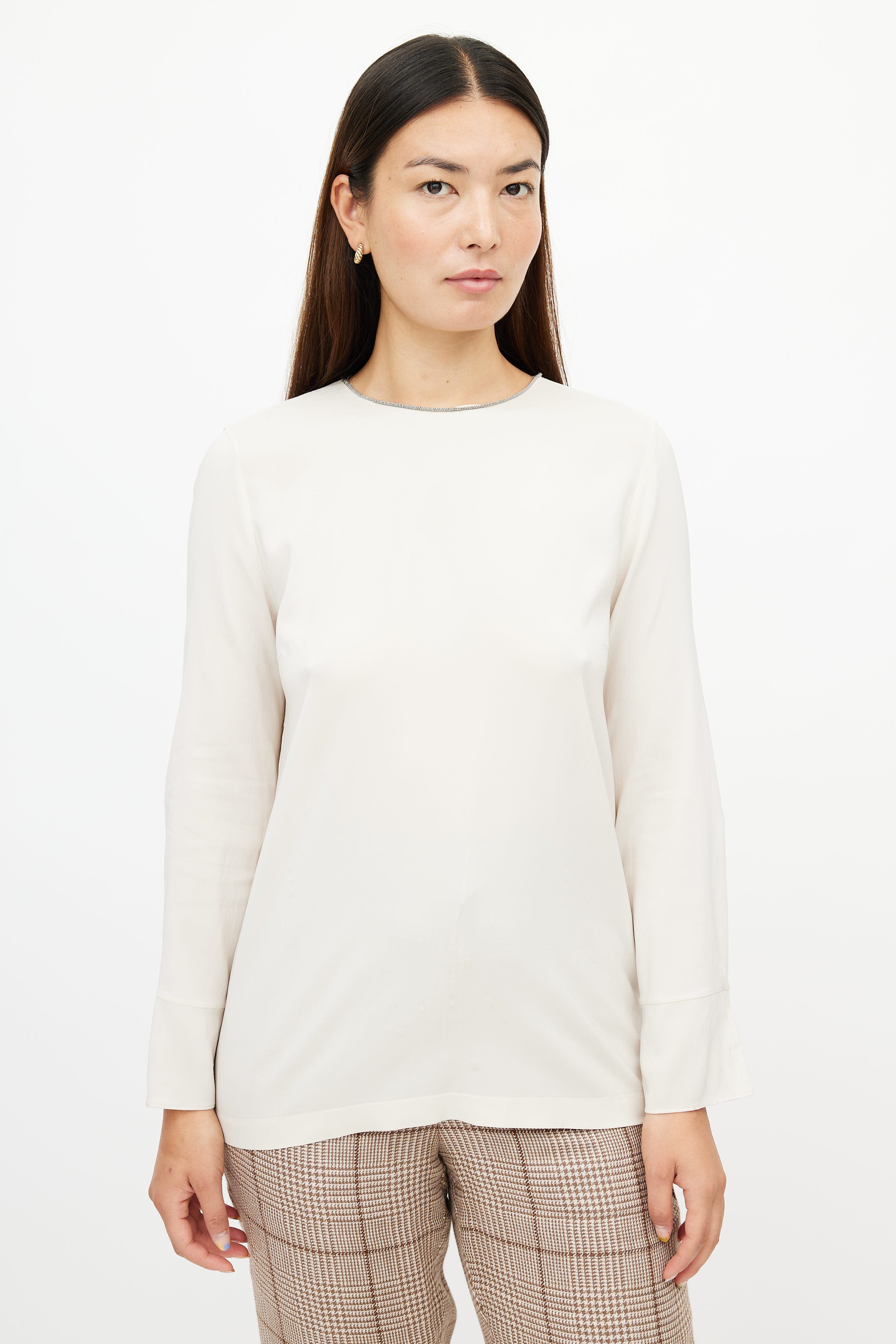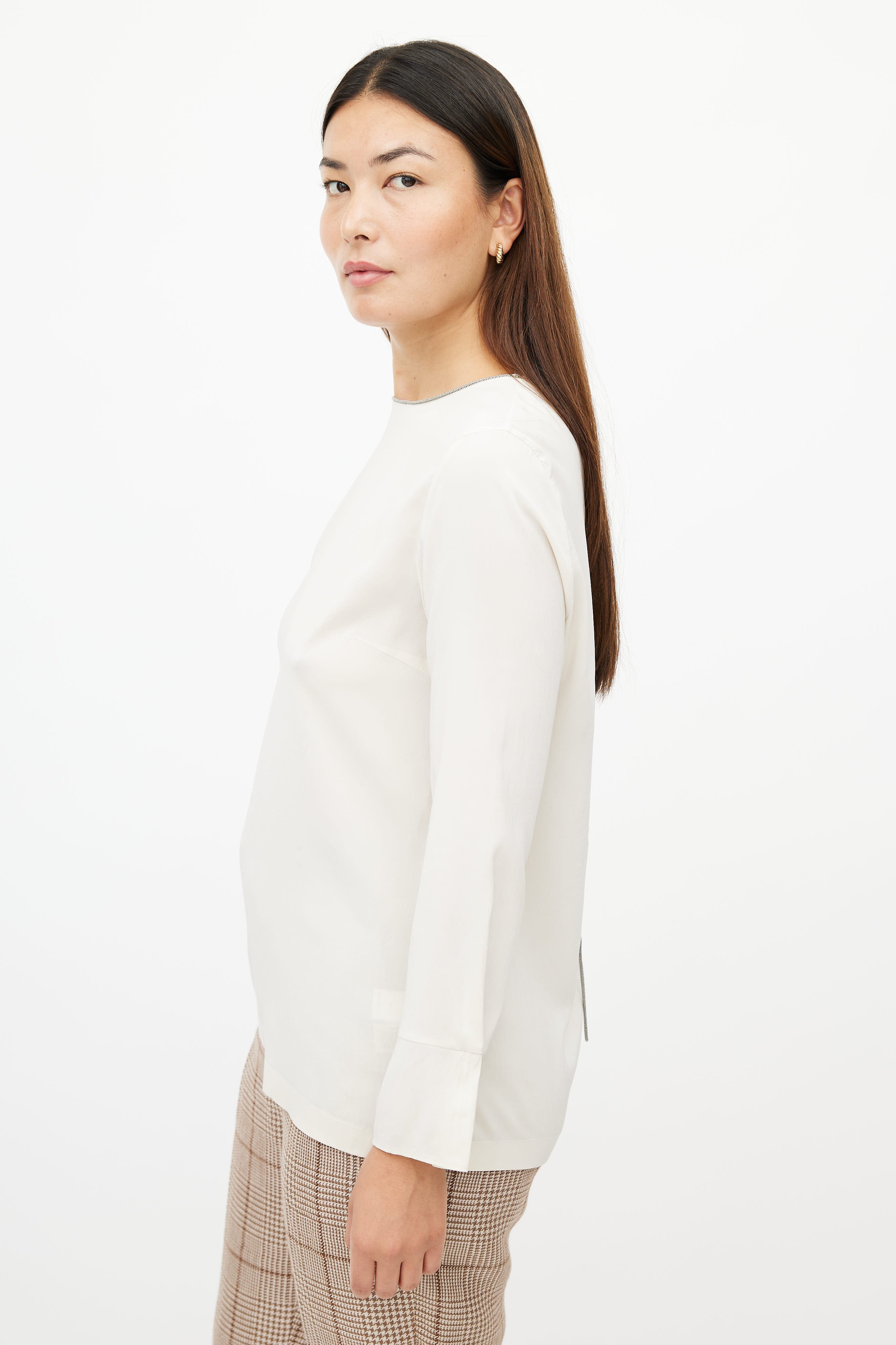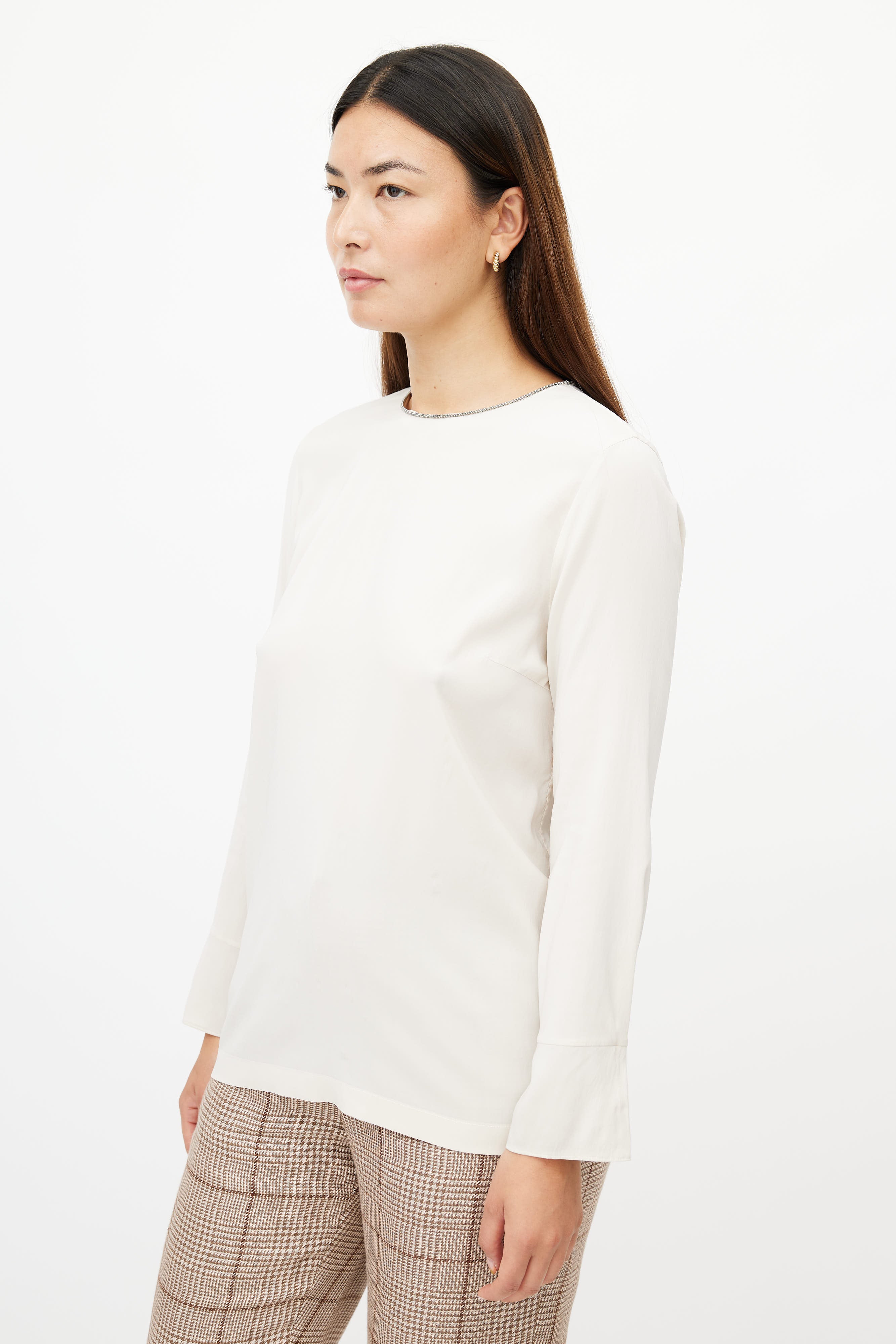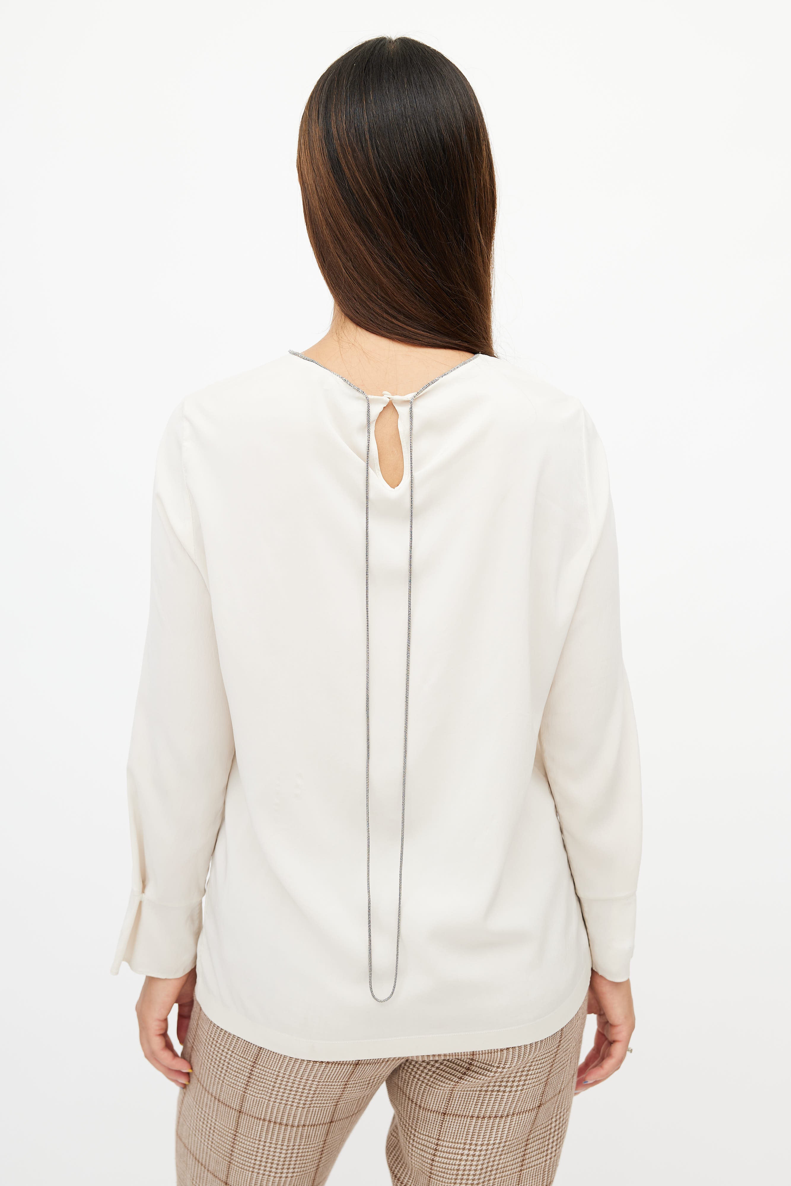 Pre-owned Brunello Cucinelli cream silk top featuring a Monilli chain trim at neckline, darted front, long sleeves, and a button closure at back.