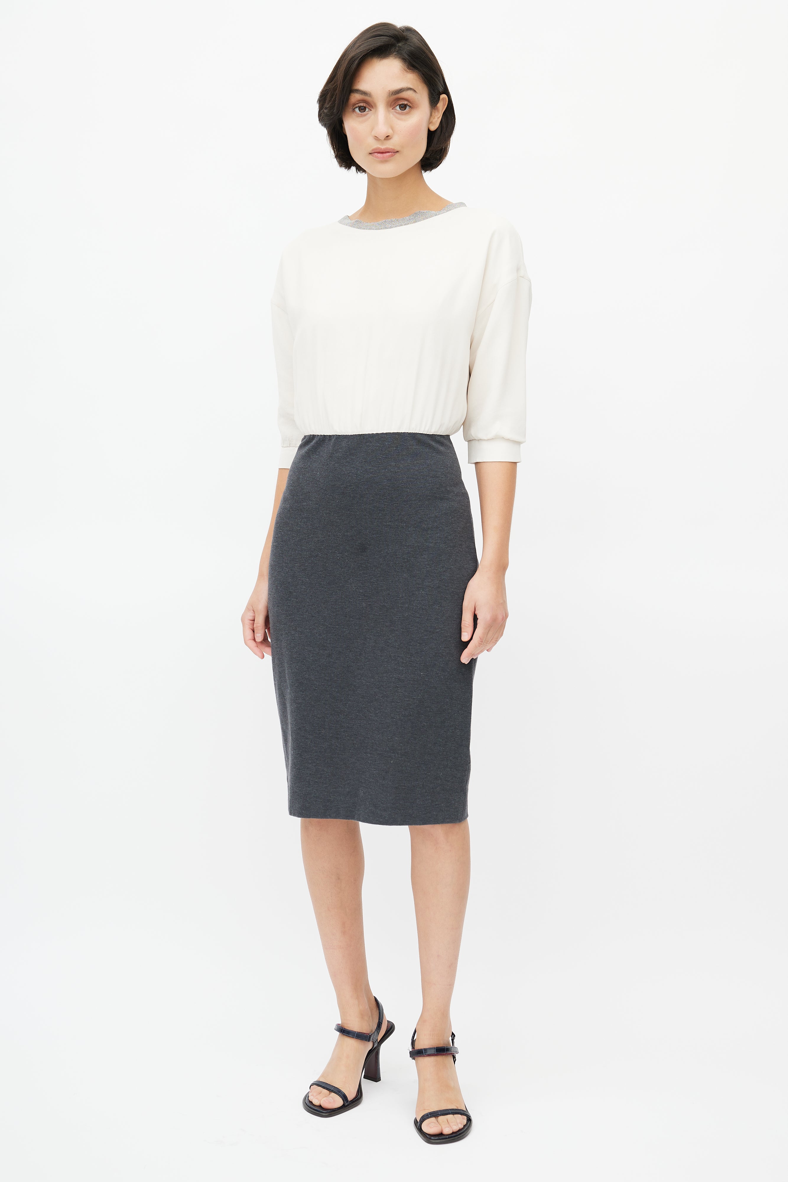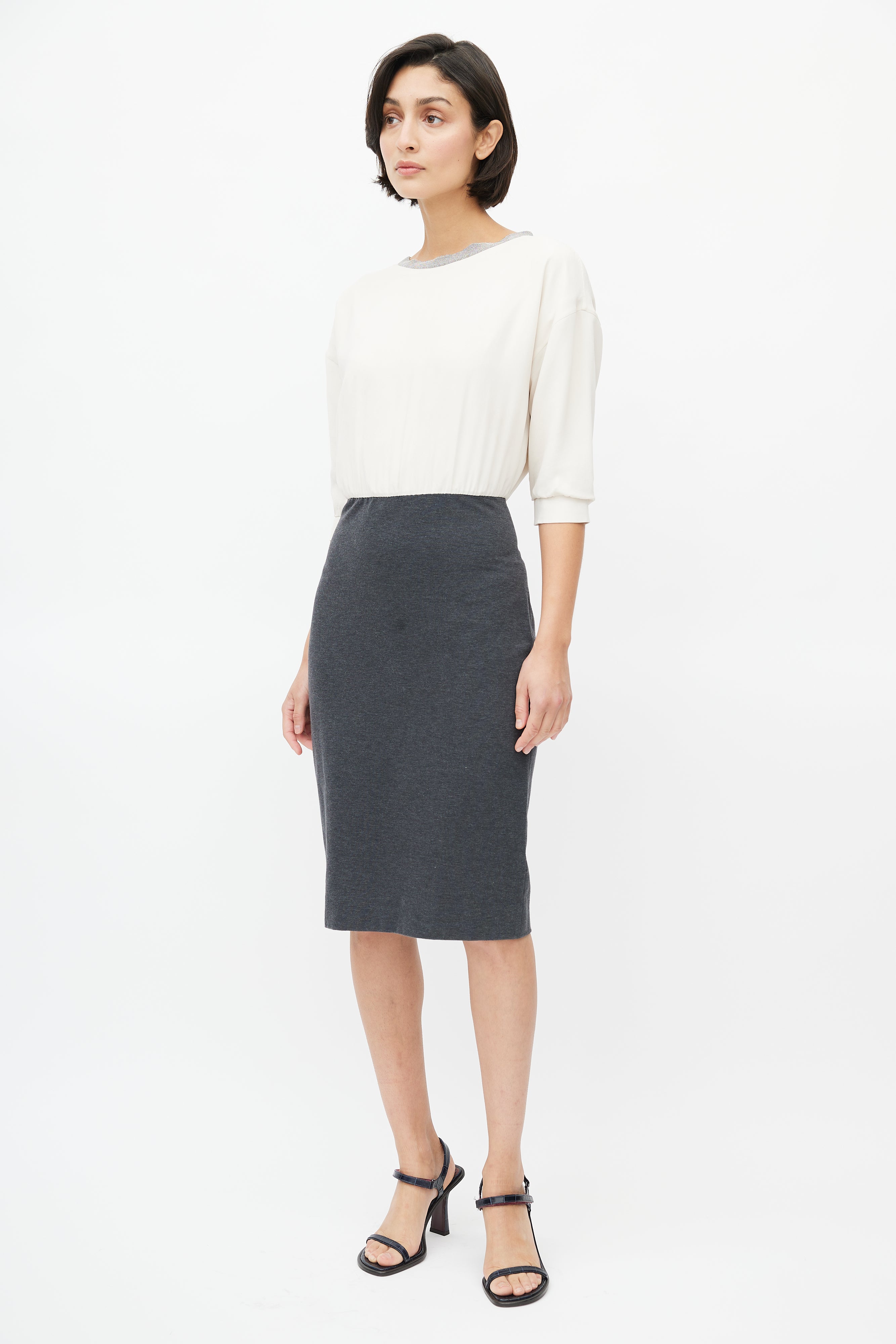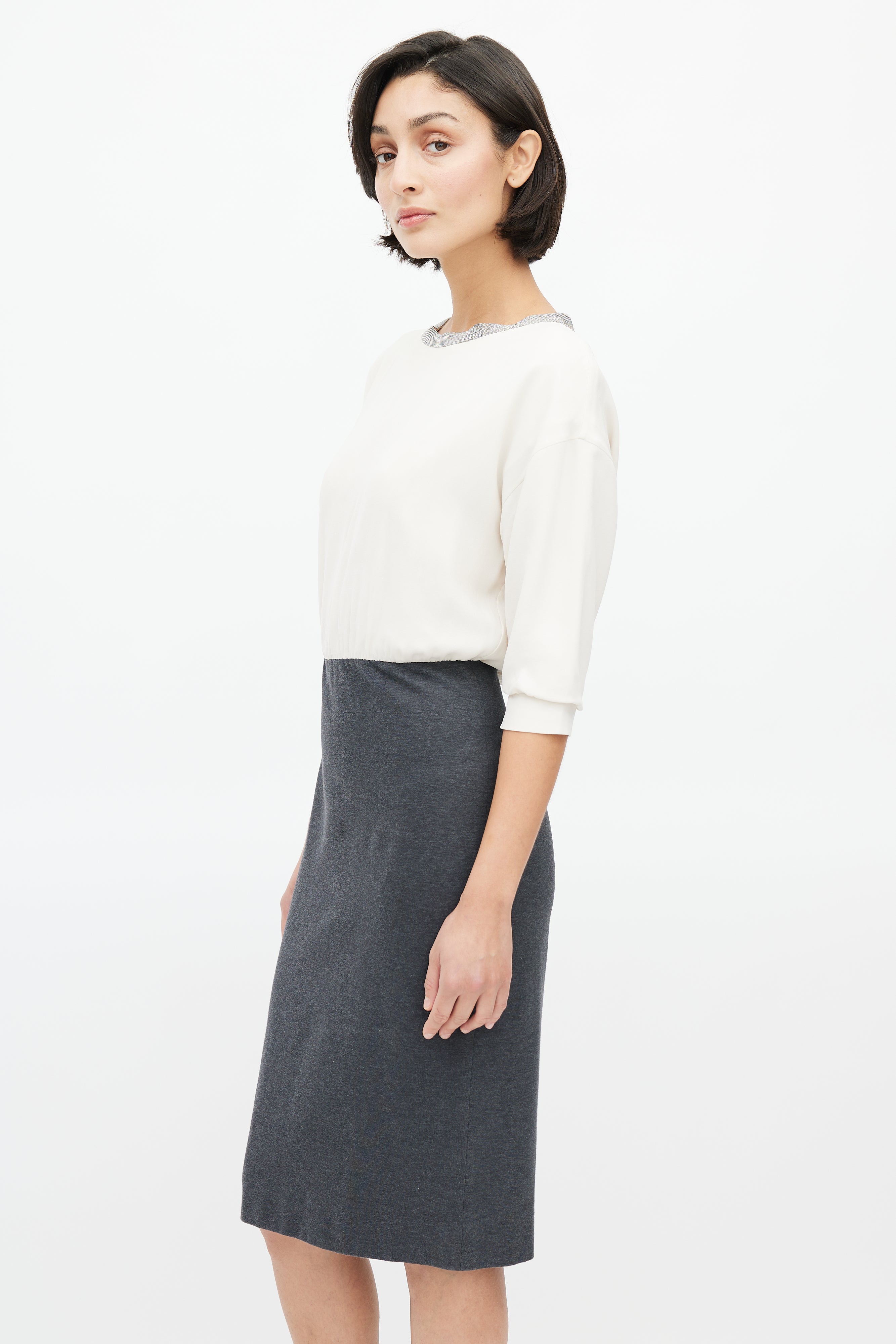Pre-owned Brunello Cucinelli cream and grey dress featuring round neckline with Monili bead embellishment, cream silk bodice, grey cotton pencil skirt, three quarter sleeves with gathered cuffs, and concealed zip closure at back.