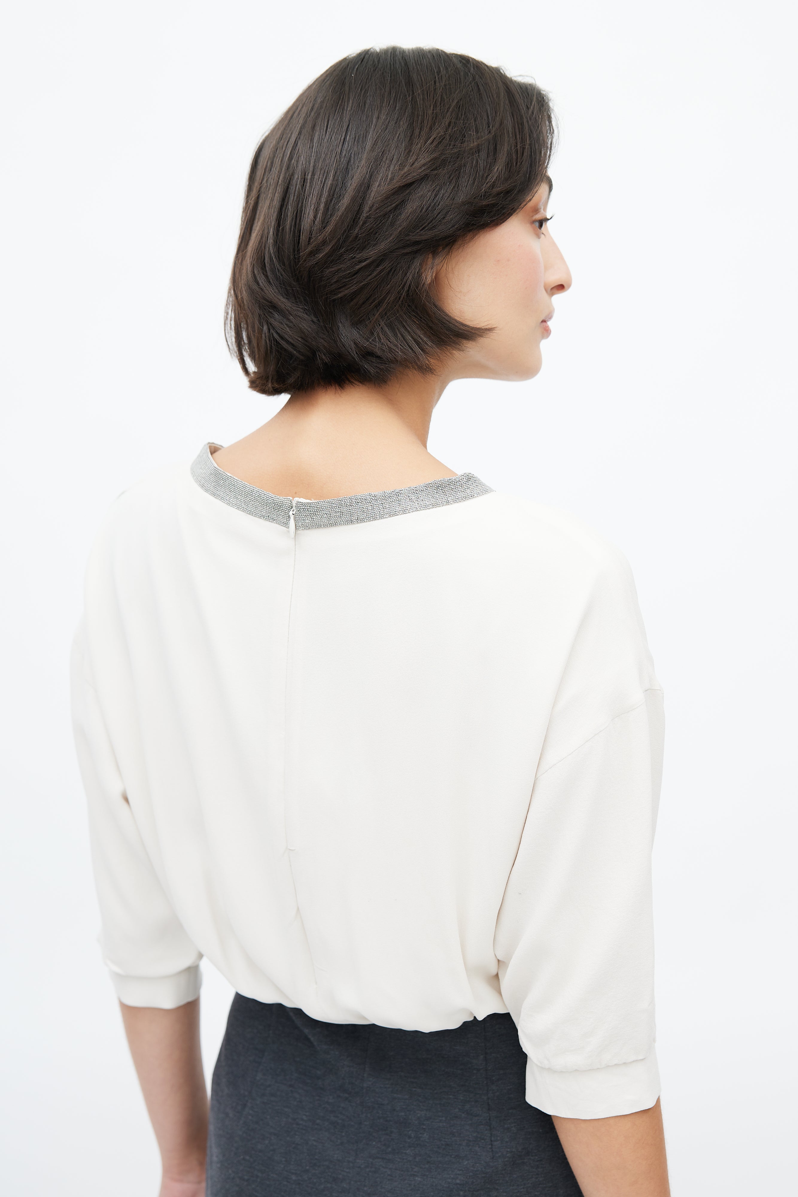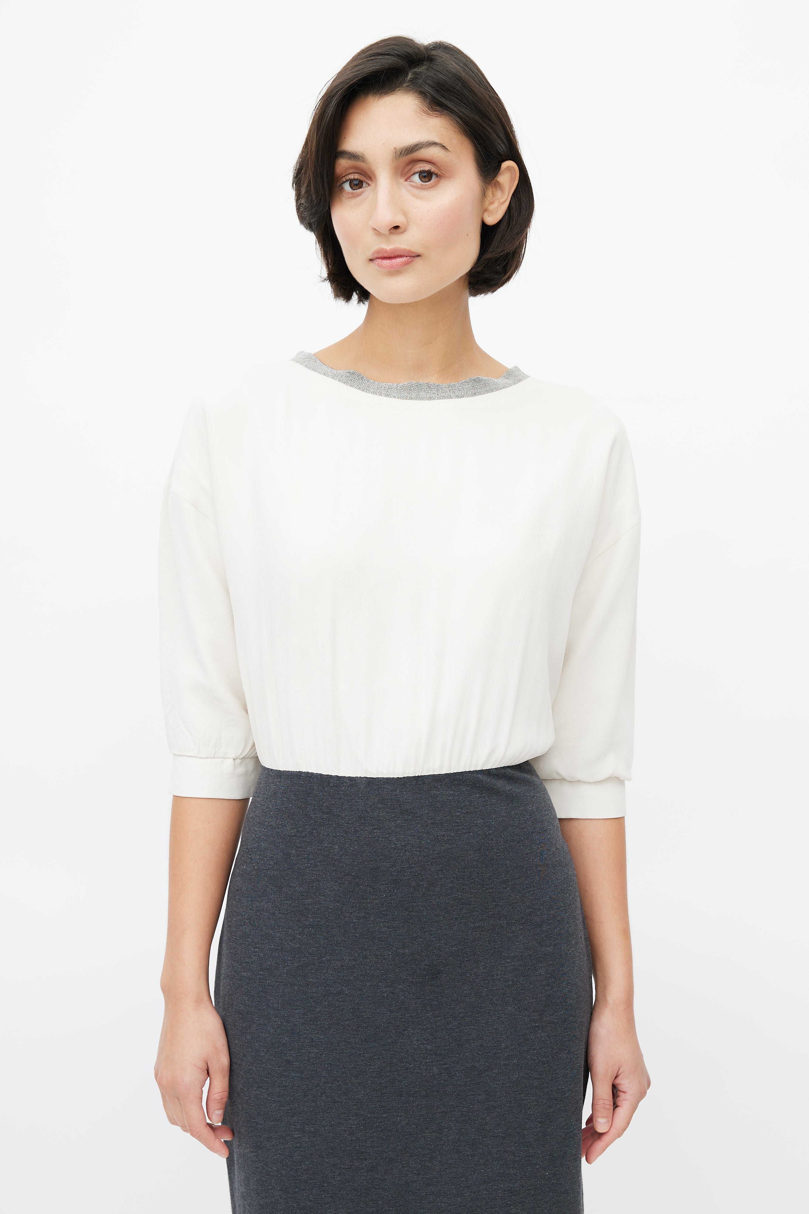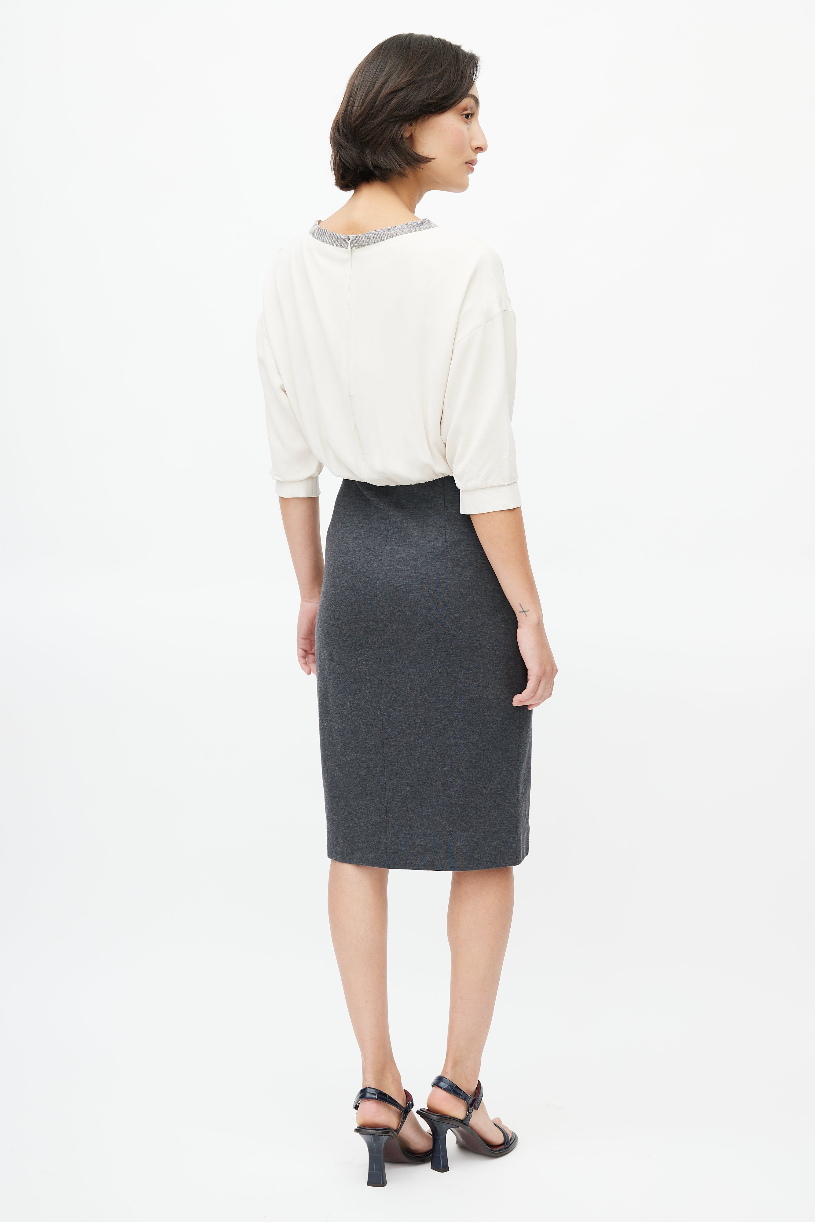 Pre-owned Brunello Cucinelli cream and grey dress featuring round neckline with Monili bead embellishment, cream silk bodice, grey cotton pencil skirt, three quarter sleeves with gathered cuffs, and concealed zip closure at back.