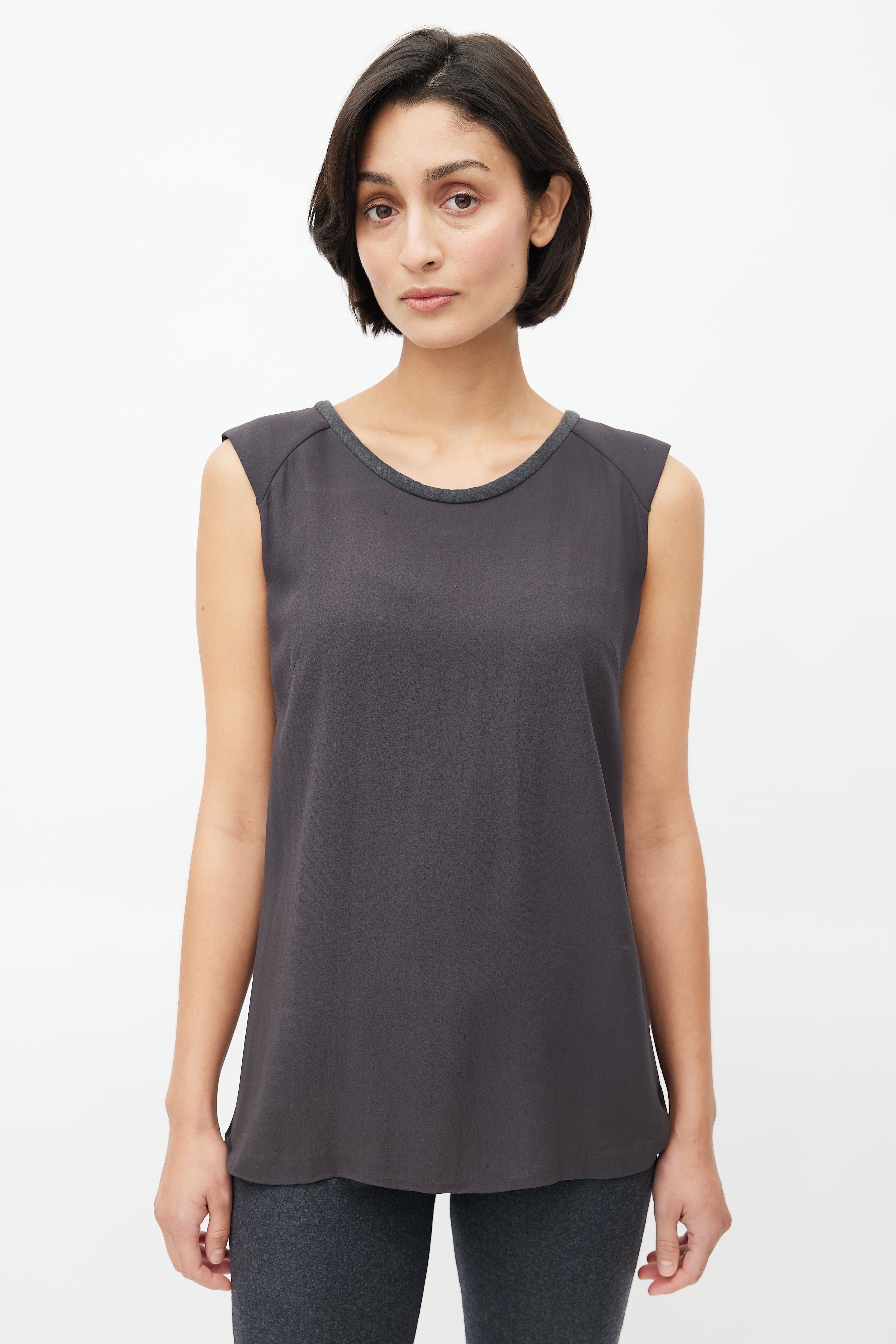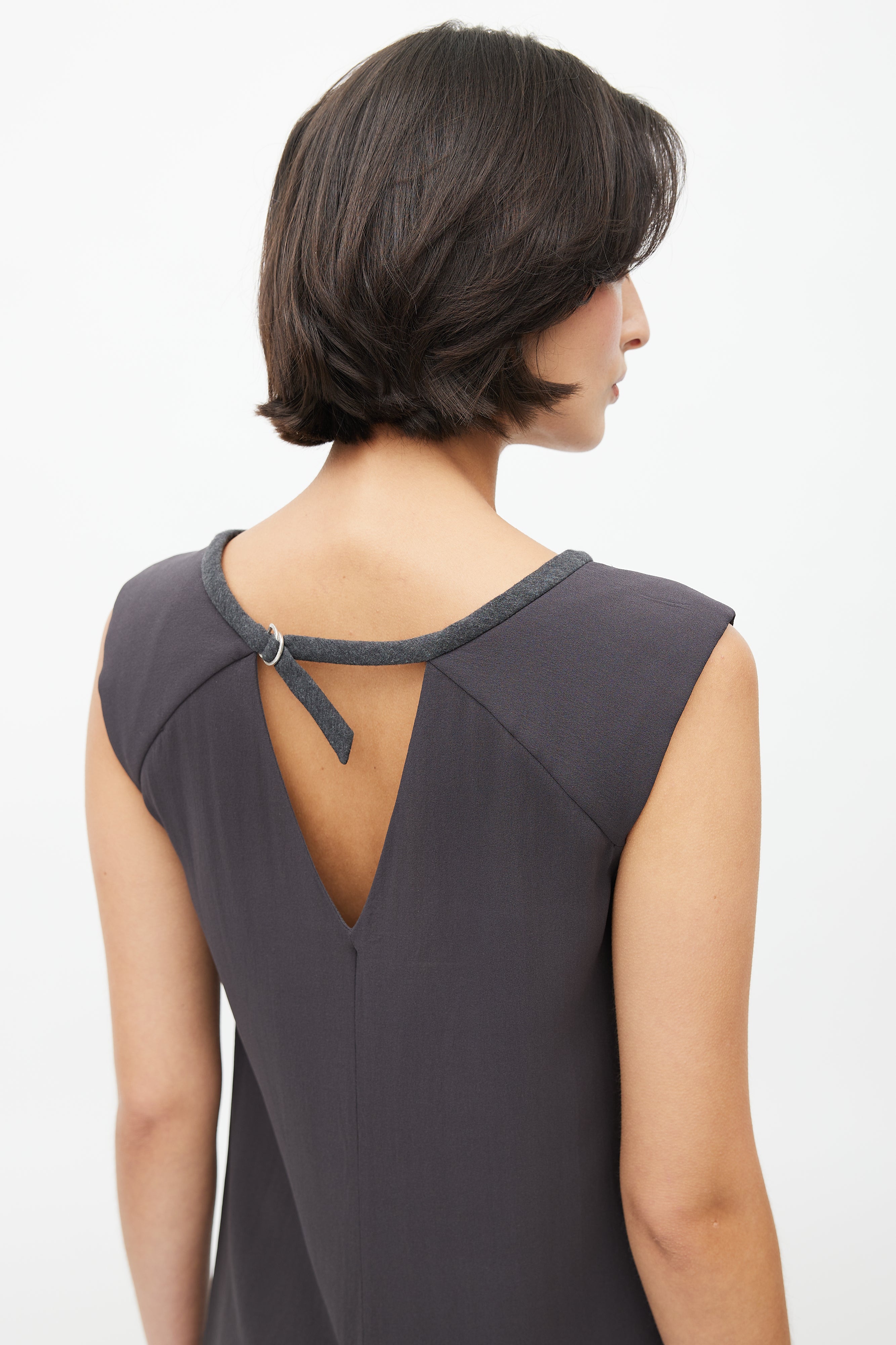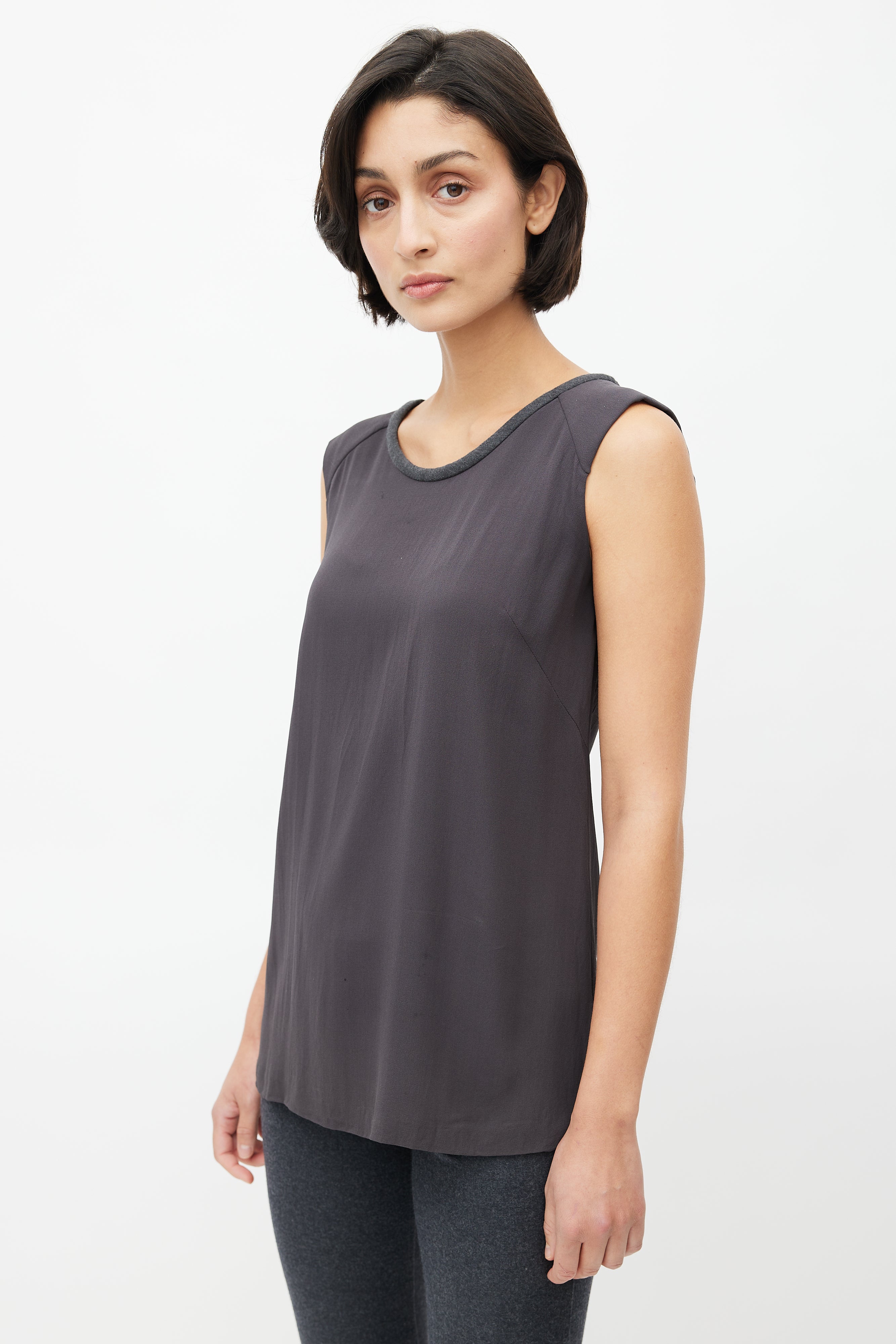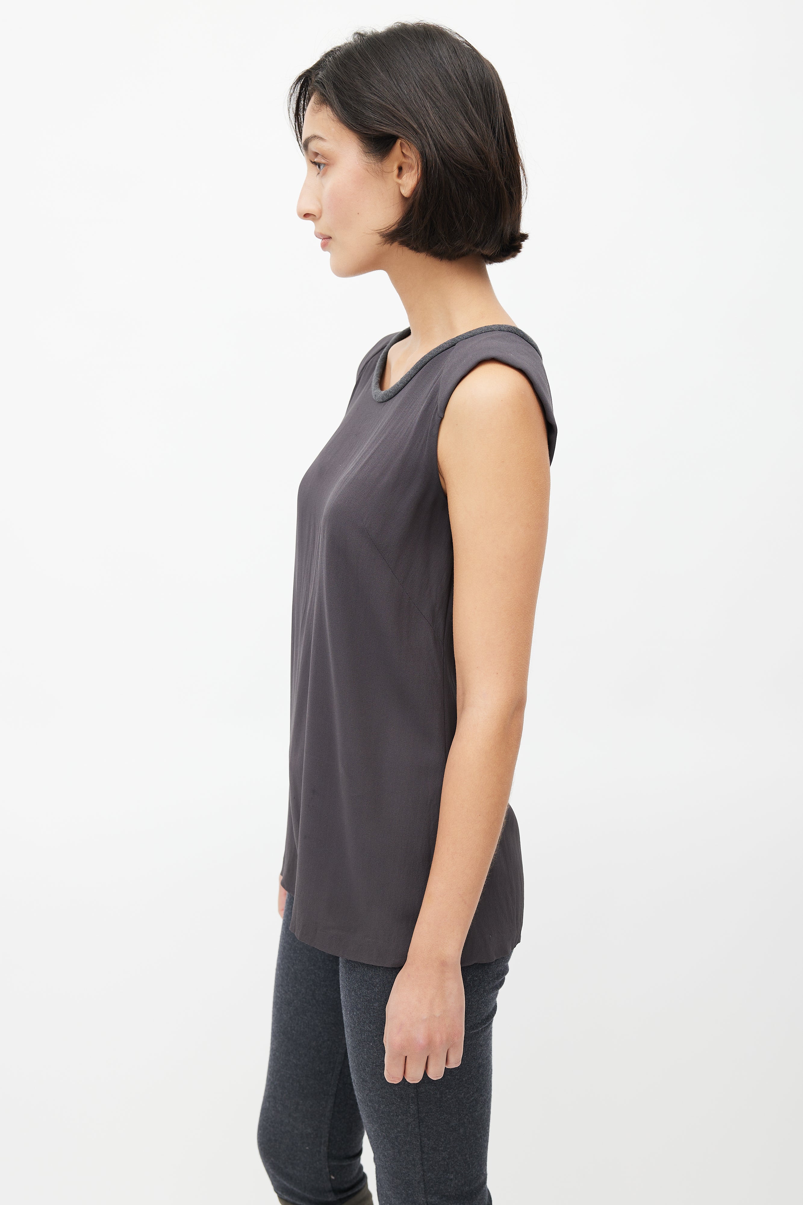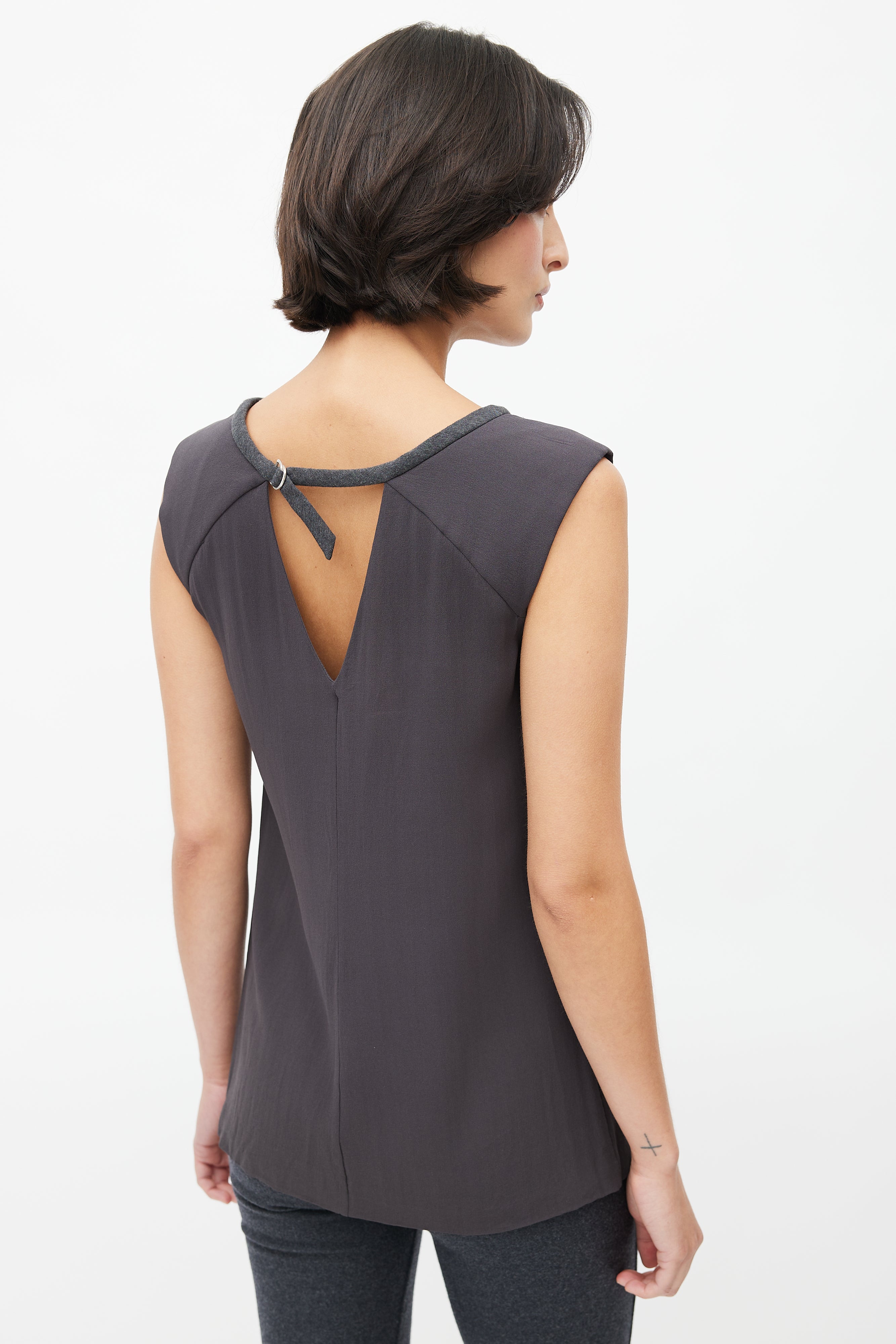 Pre-owned Brunello Cucinelli dark grey silk blouse featuring wide neckline, slight padded shoulder, tonal wool trim at collar with buckle fastening, and keyhole back.