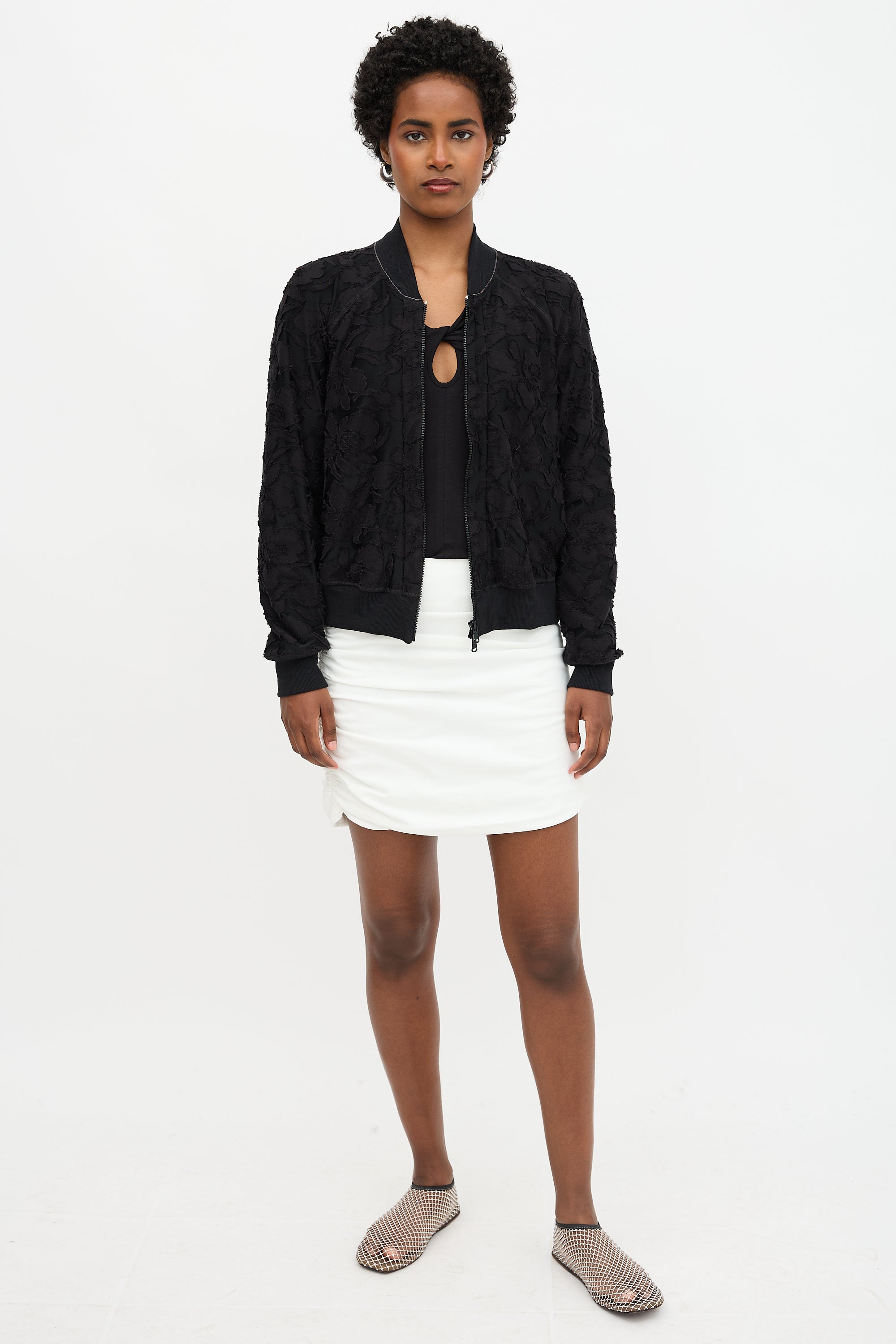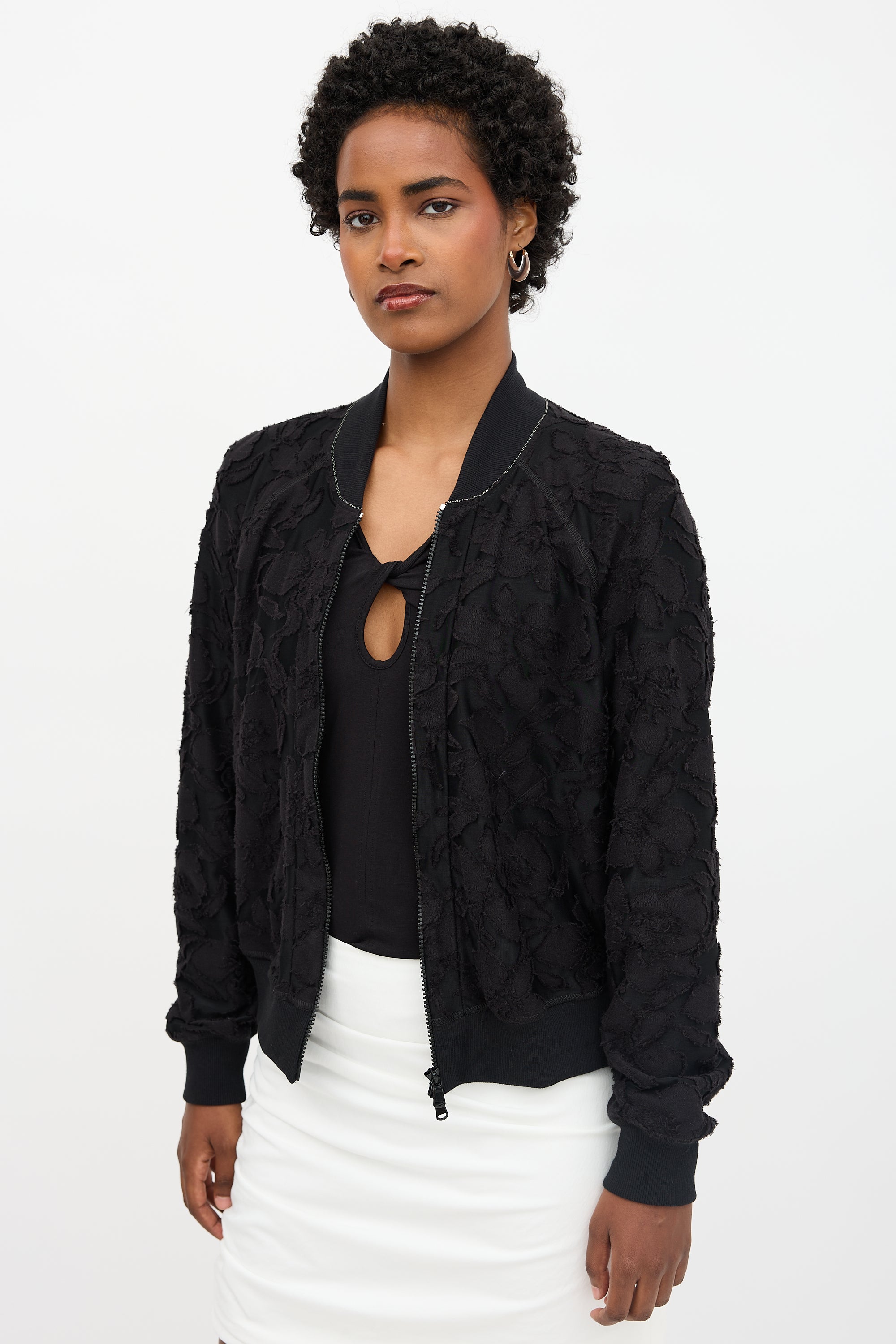 Pre-owned Brunello Cucinelli black floral brocade bomber jacket featuring a ribbed stand collar with Monili bead detail, dual zip front, two pockets at hip, and a ribbed hem and cuffs. Lined.
