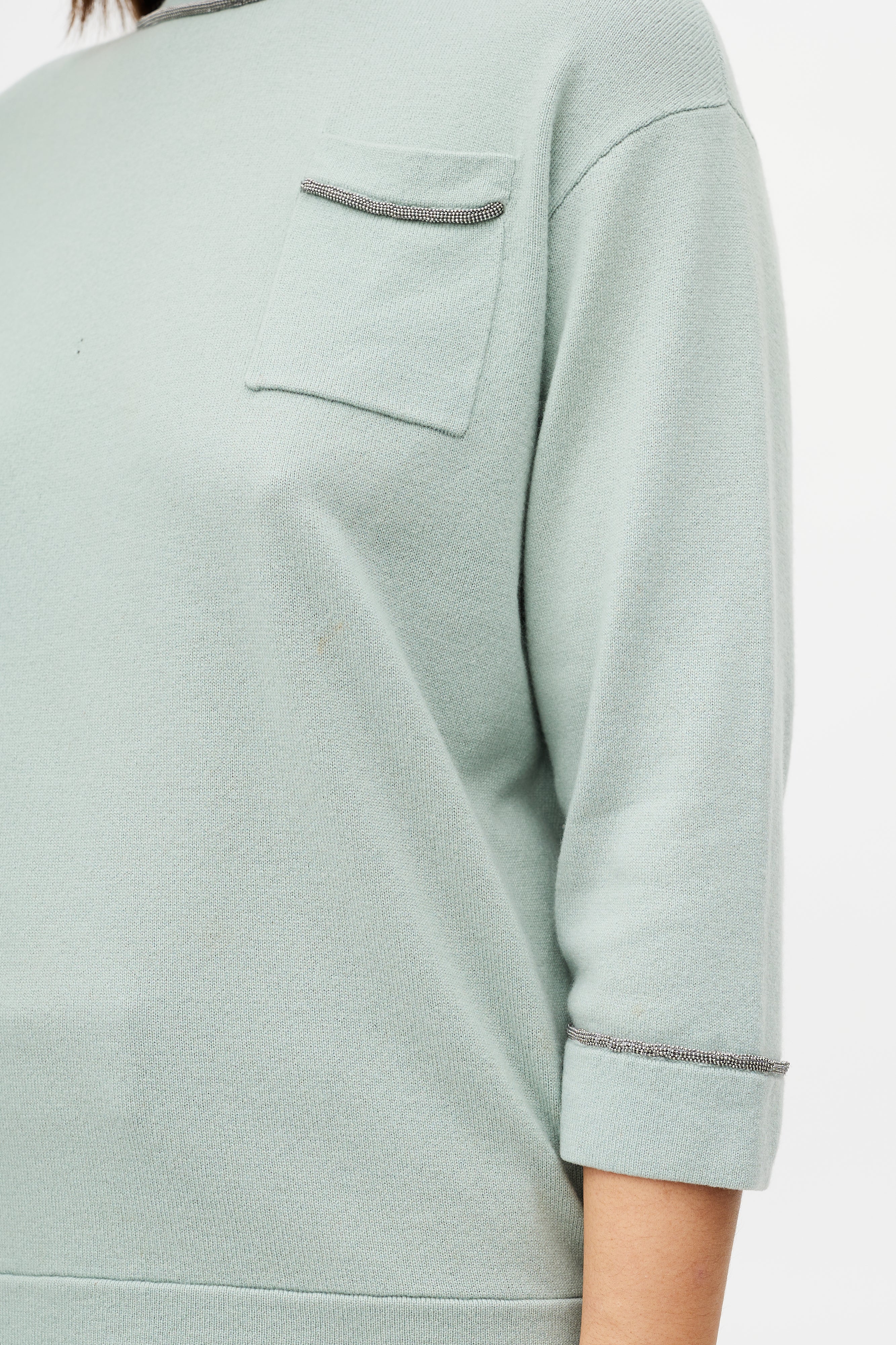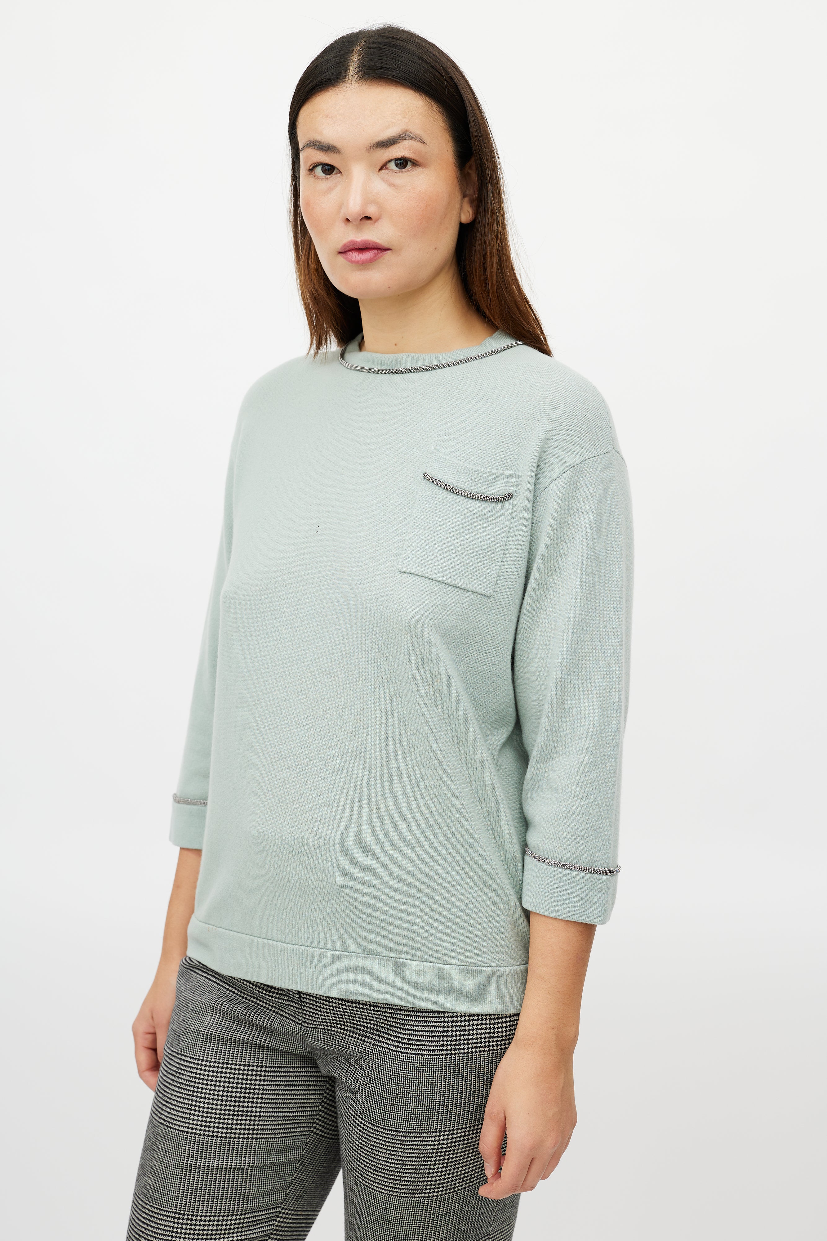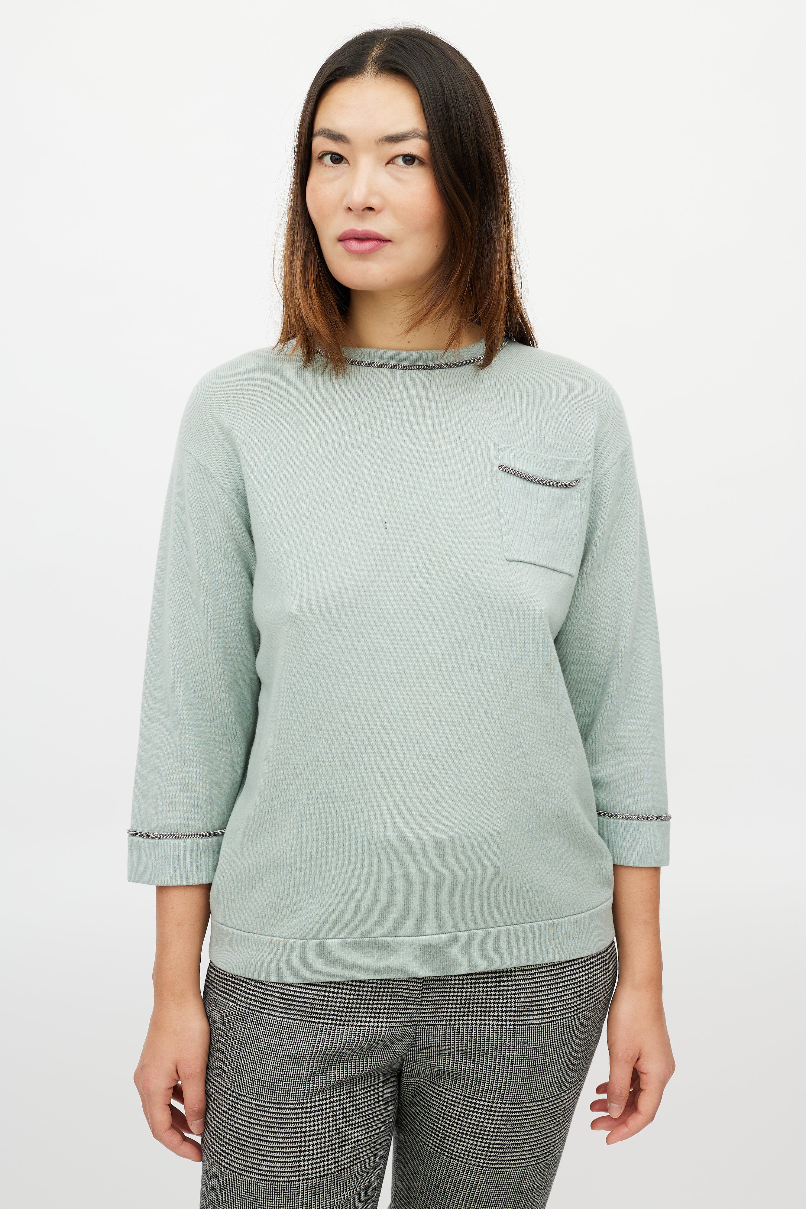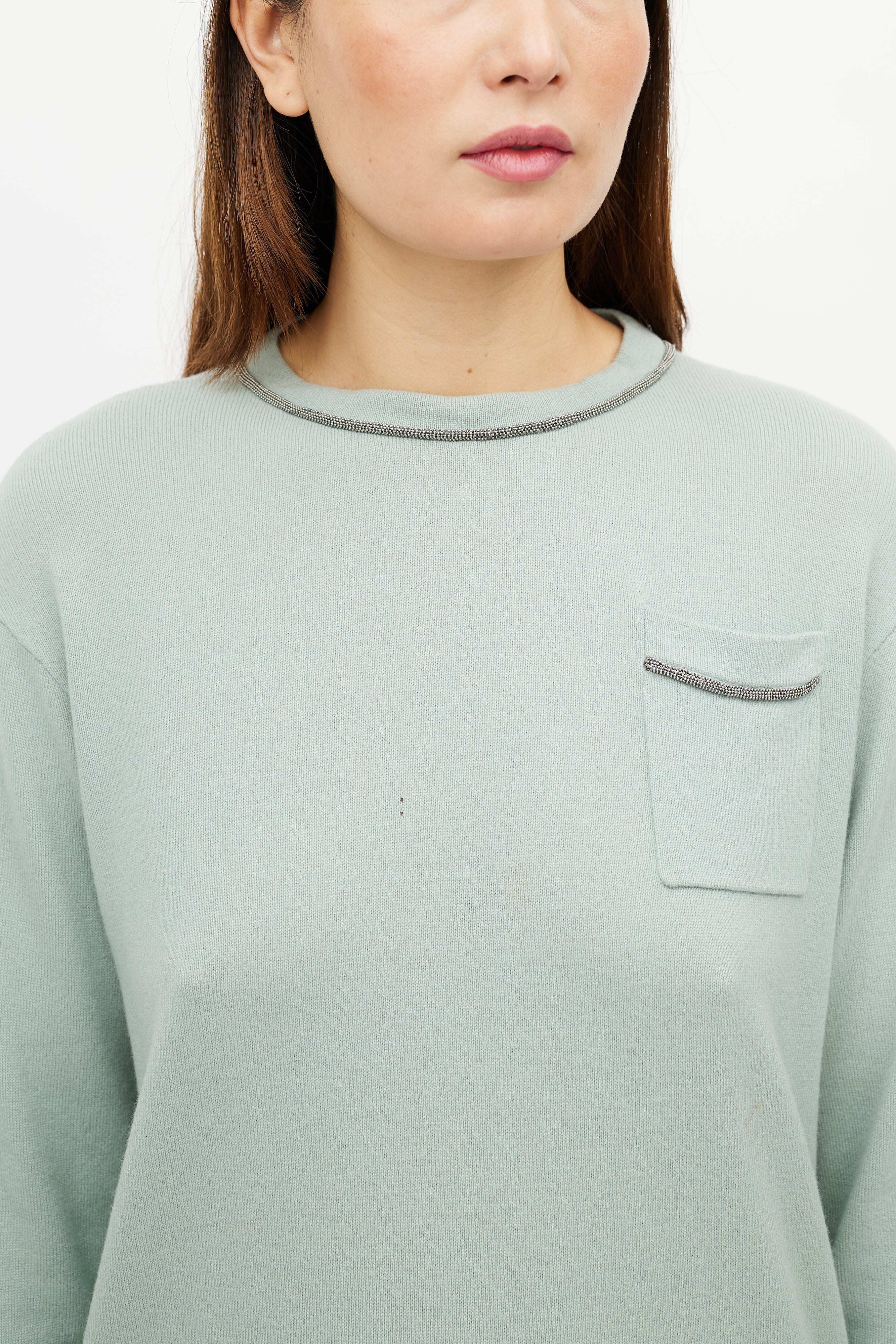 Pre-owned Brunello Cucinelli green cashmere knit sweater featuring a round neckline, one patch pocket at front, monili bead trim throughout, and button closure at back.