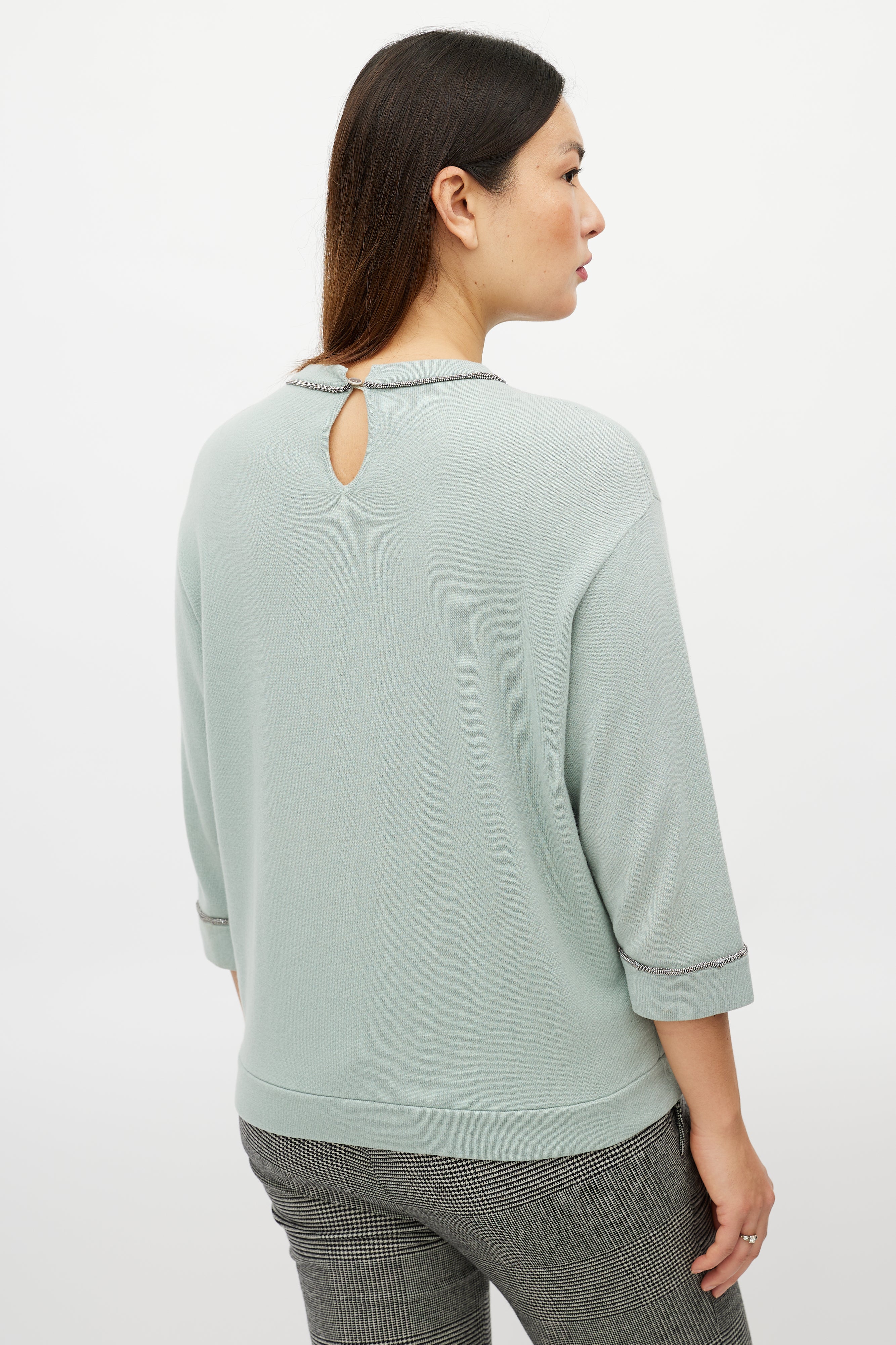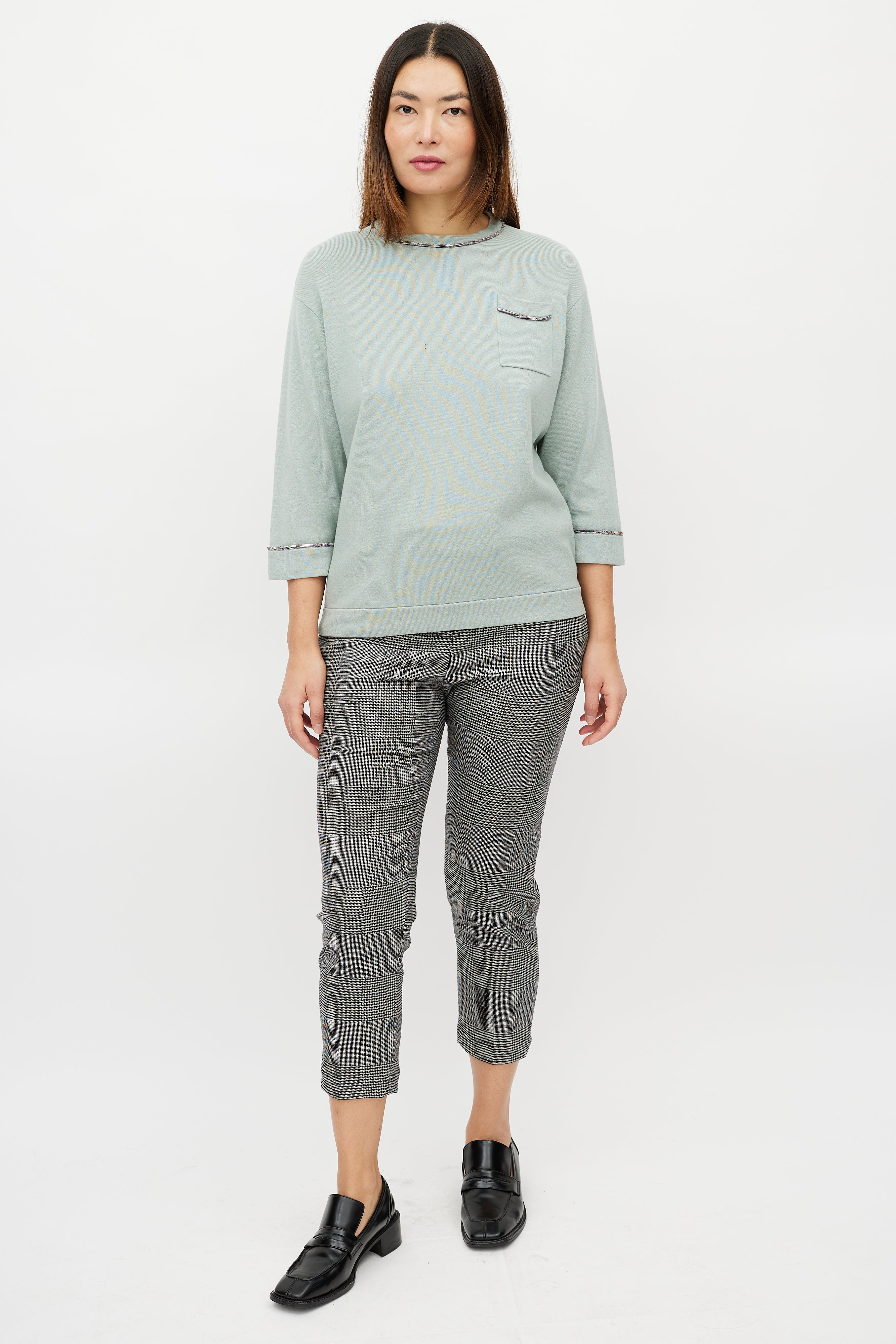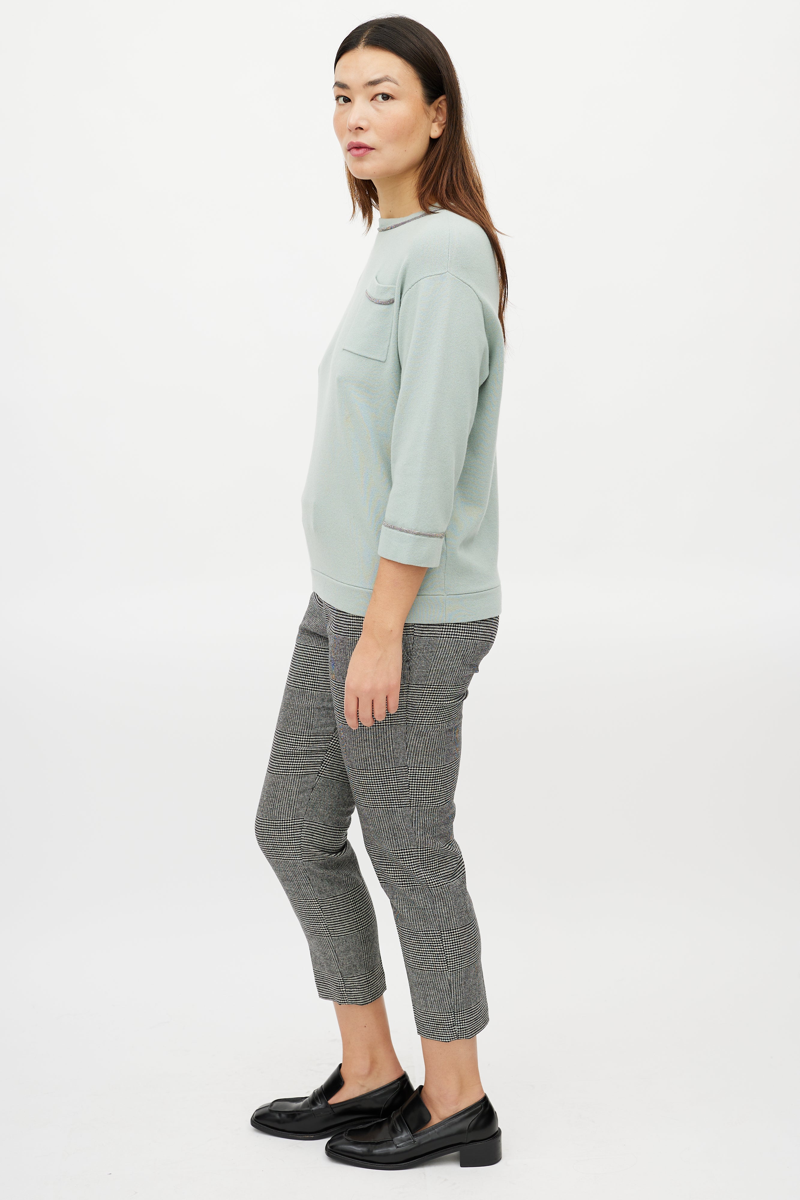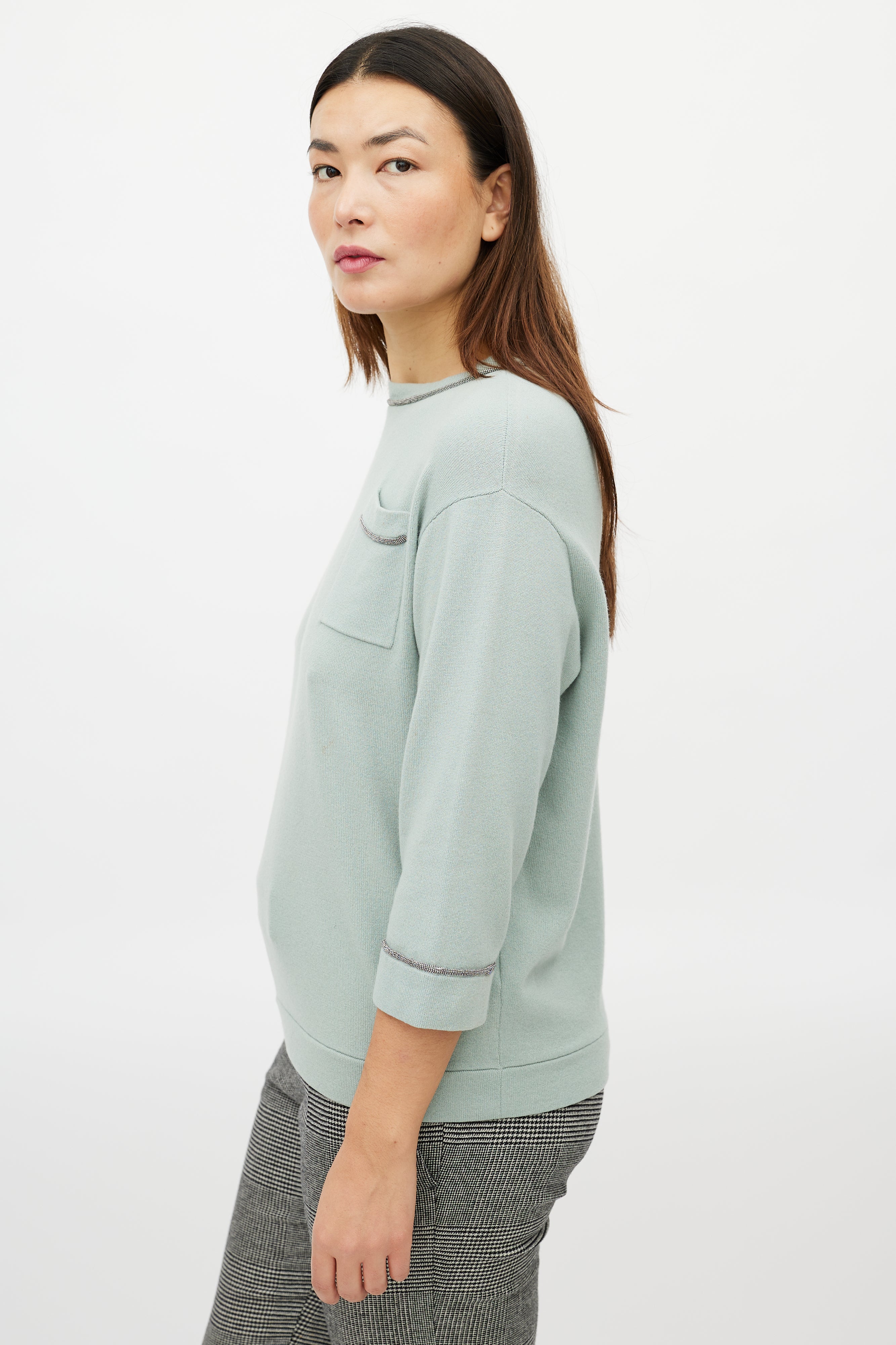 Pre-owned Brunello Cucinelli green cashmere knit sweater featuring a round neckline, one patch pocket at front, monili bead trim throughout, and button closure at back.