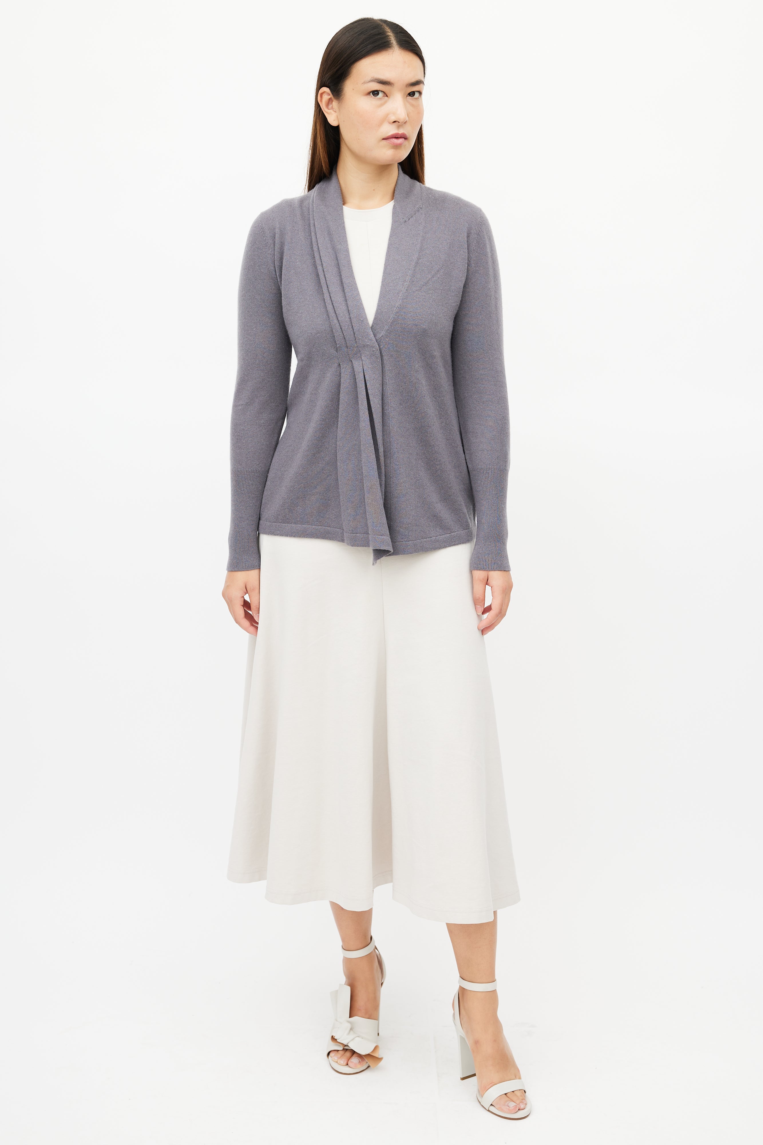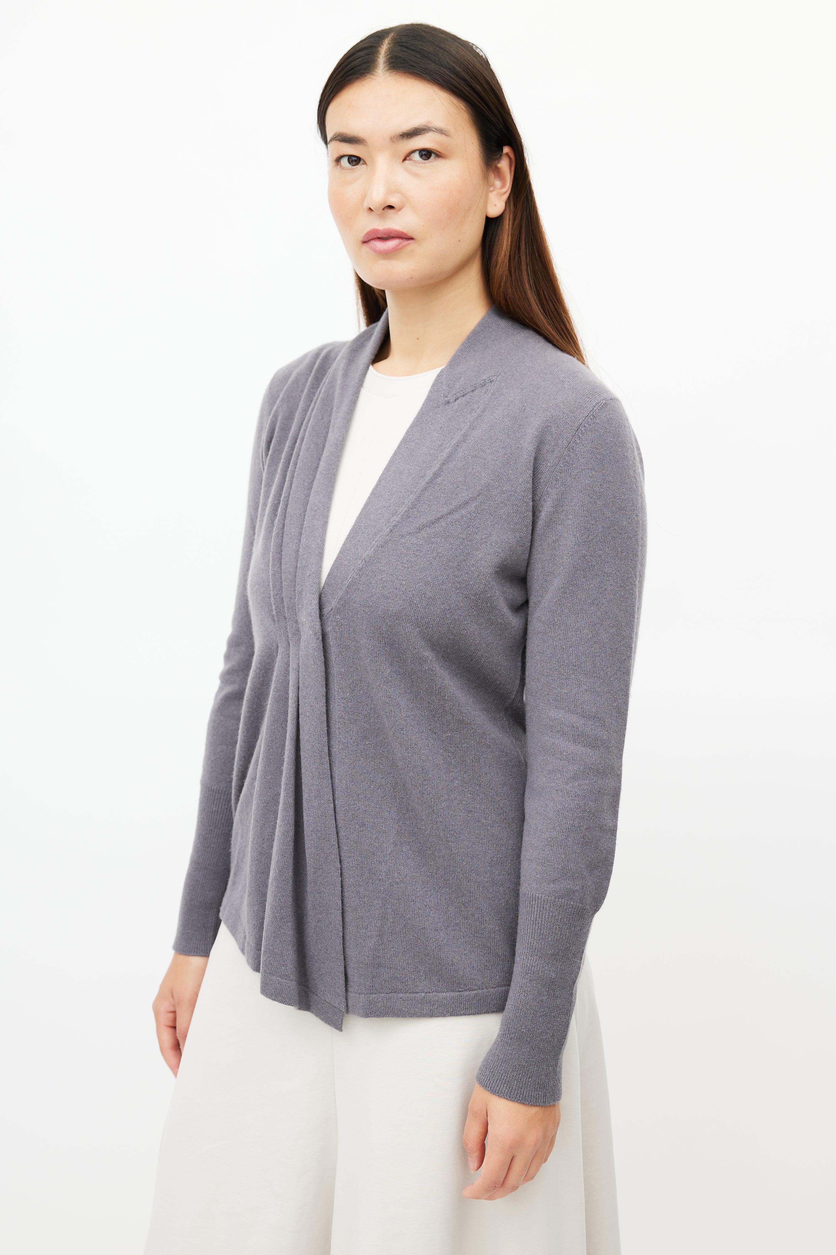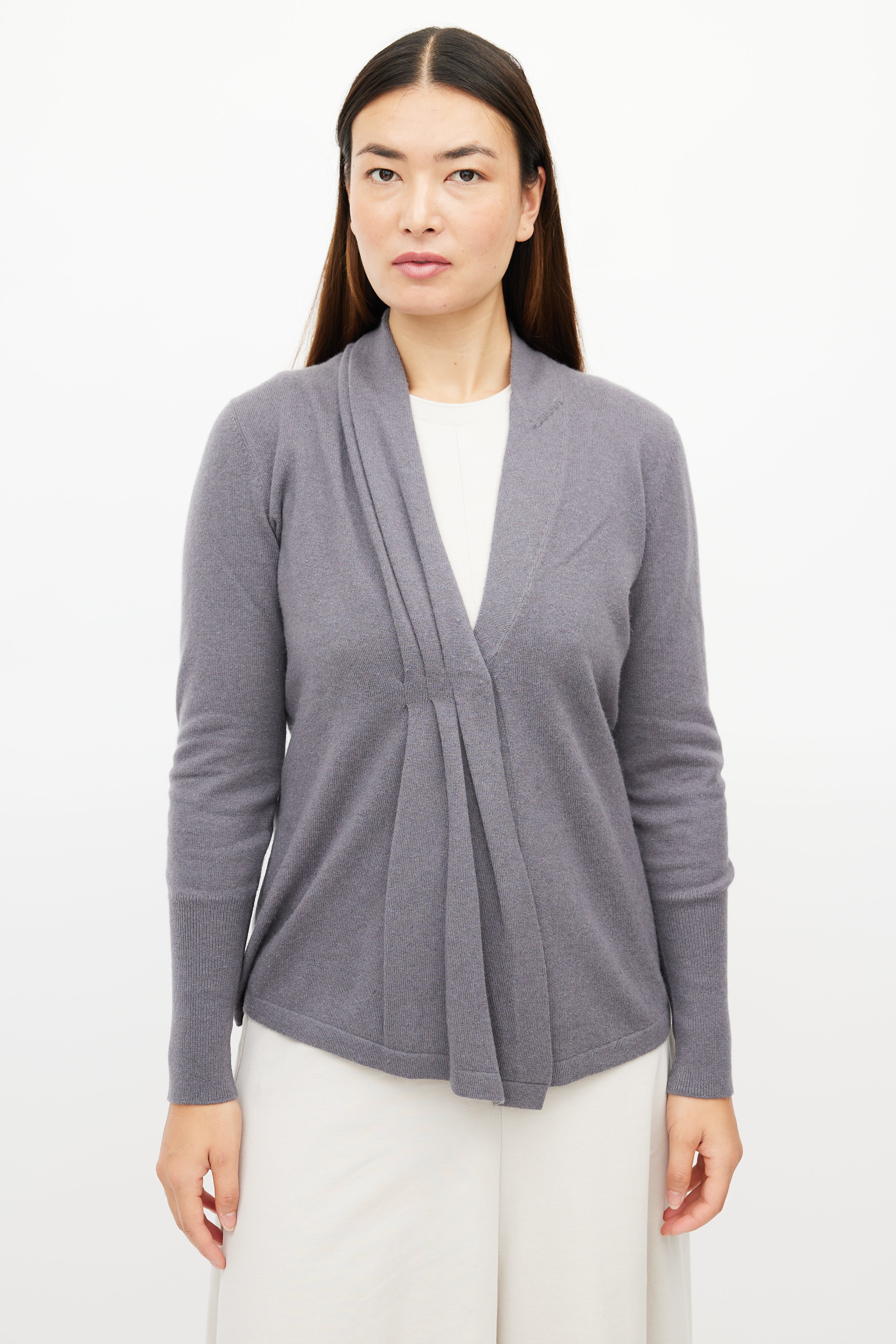 Pre-owned Brunello Cucinelli grey cashmere cardigan featuring a shawl collar, long sleeves, pleated detail at waist, and snap button closure.