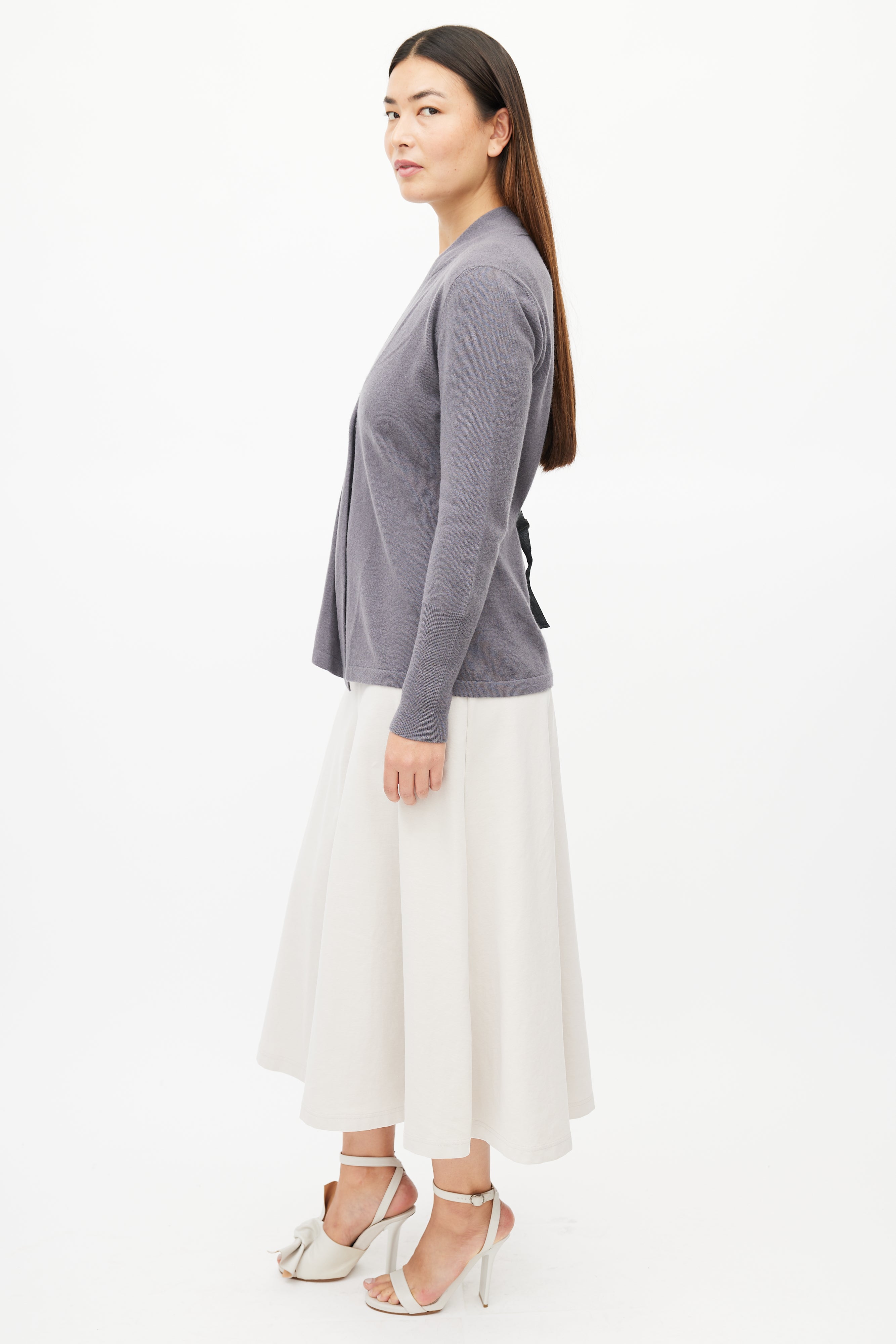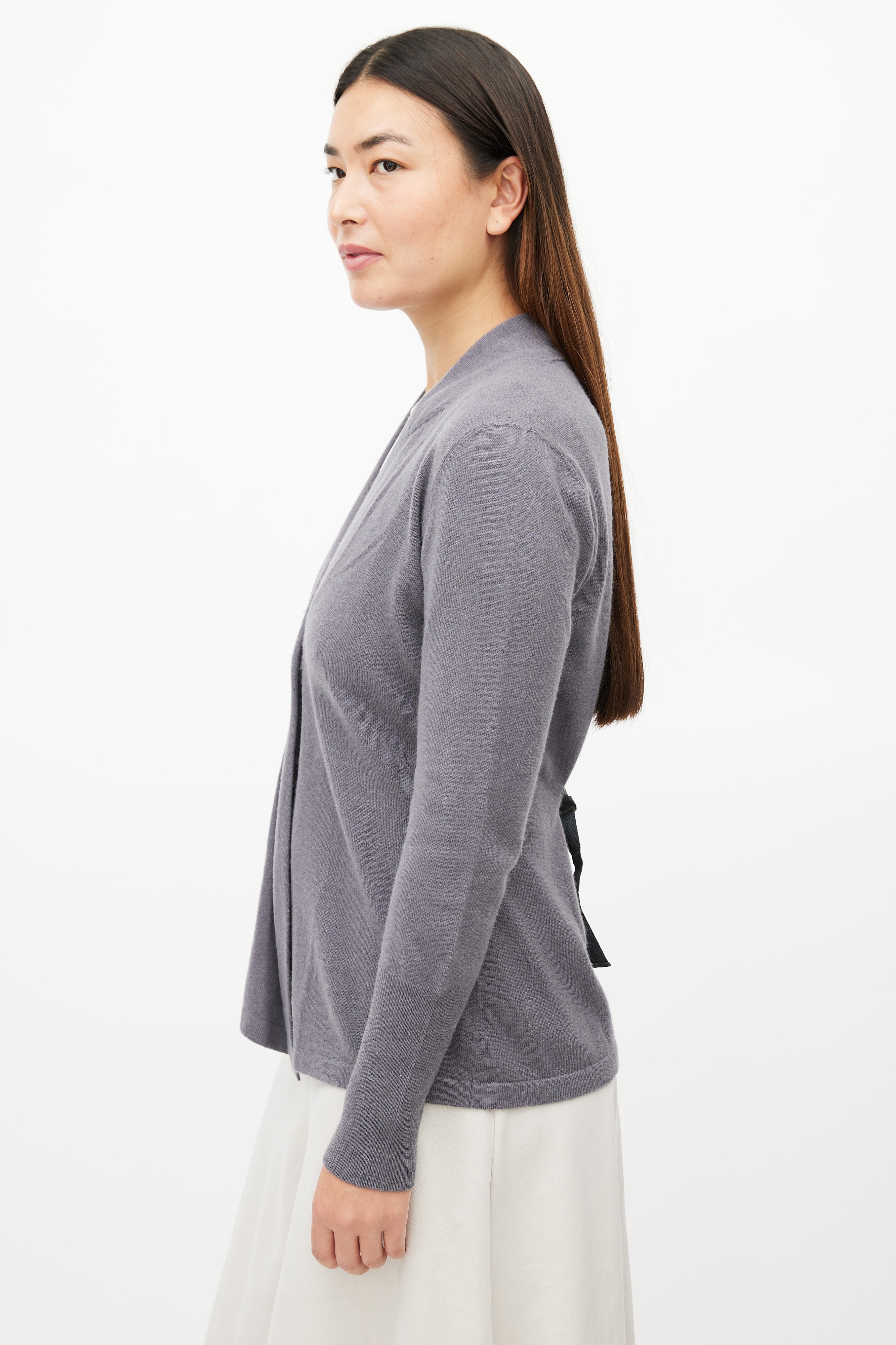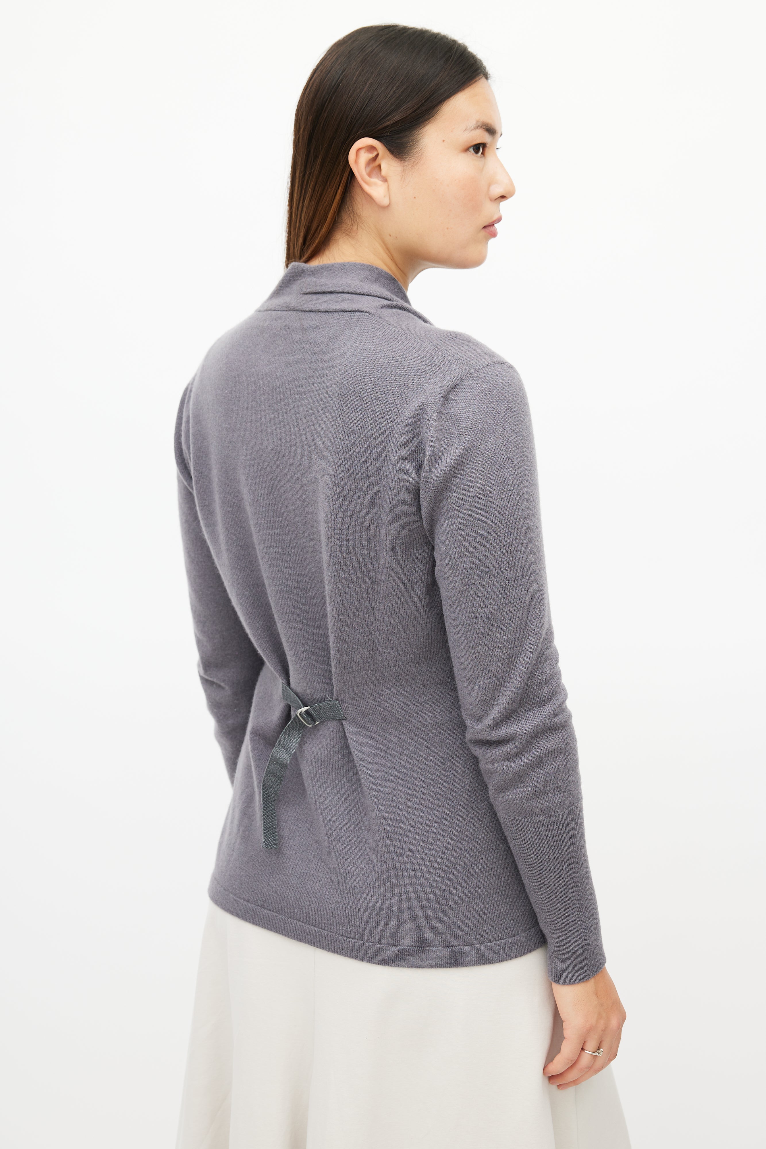 Pre-owned Brunello Cucinelli grey cashmere cardigan featuring a shawl collar, long sleeves, pleated detail at waist, and snap button closure.