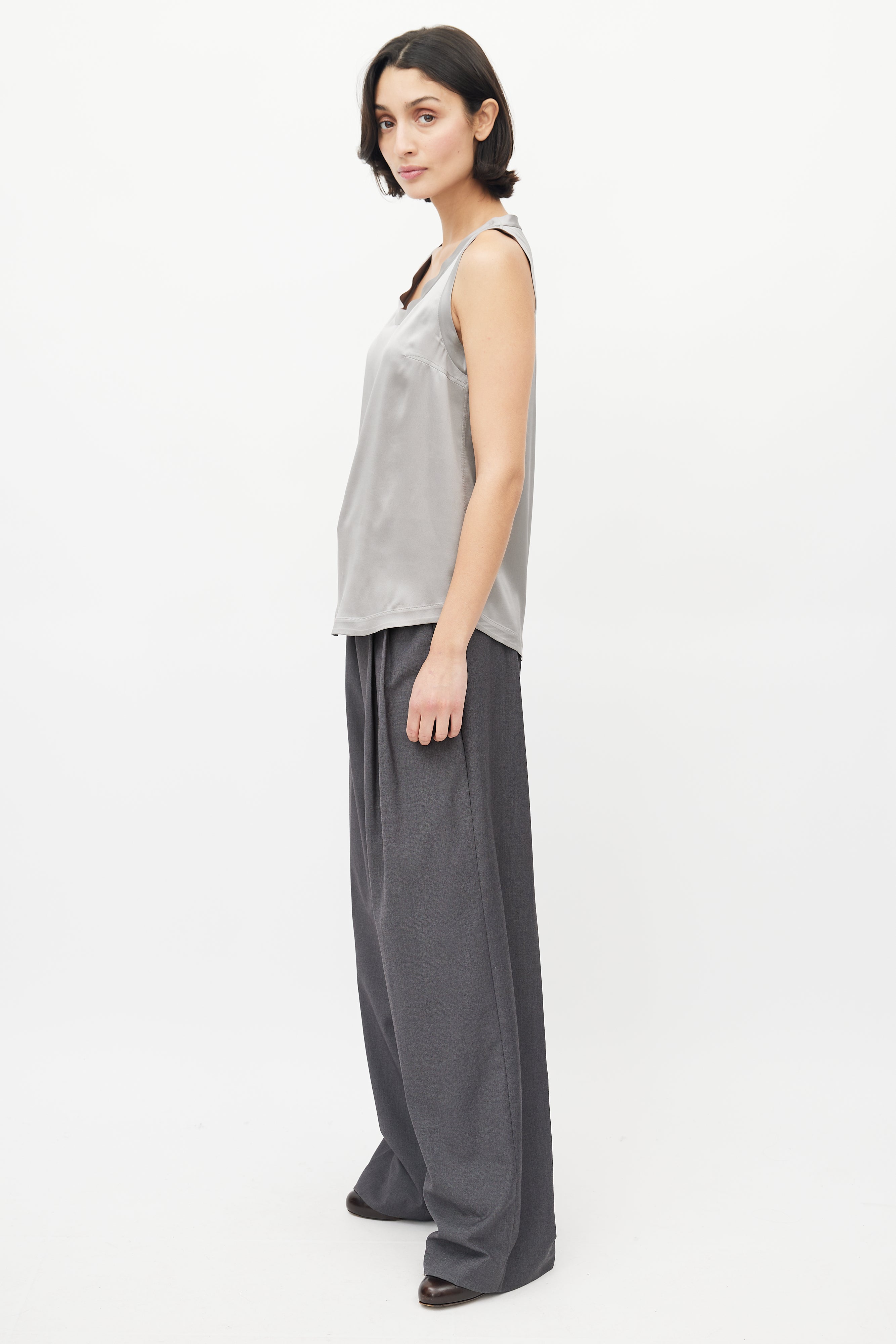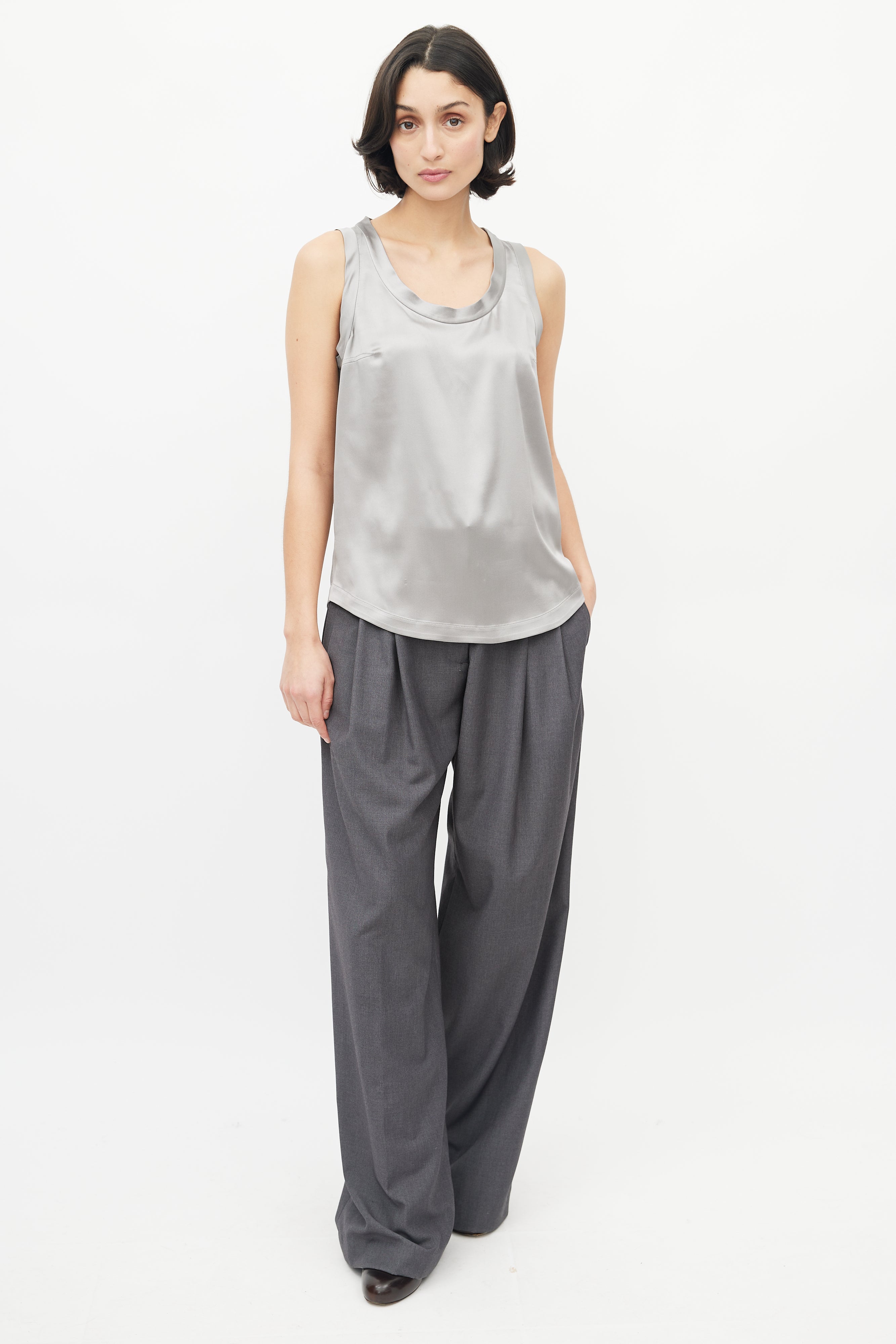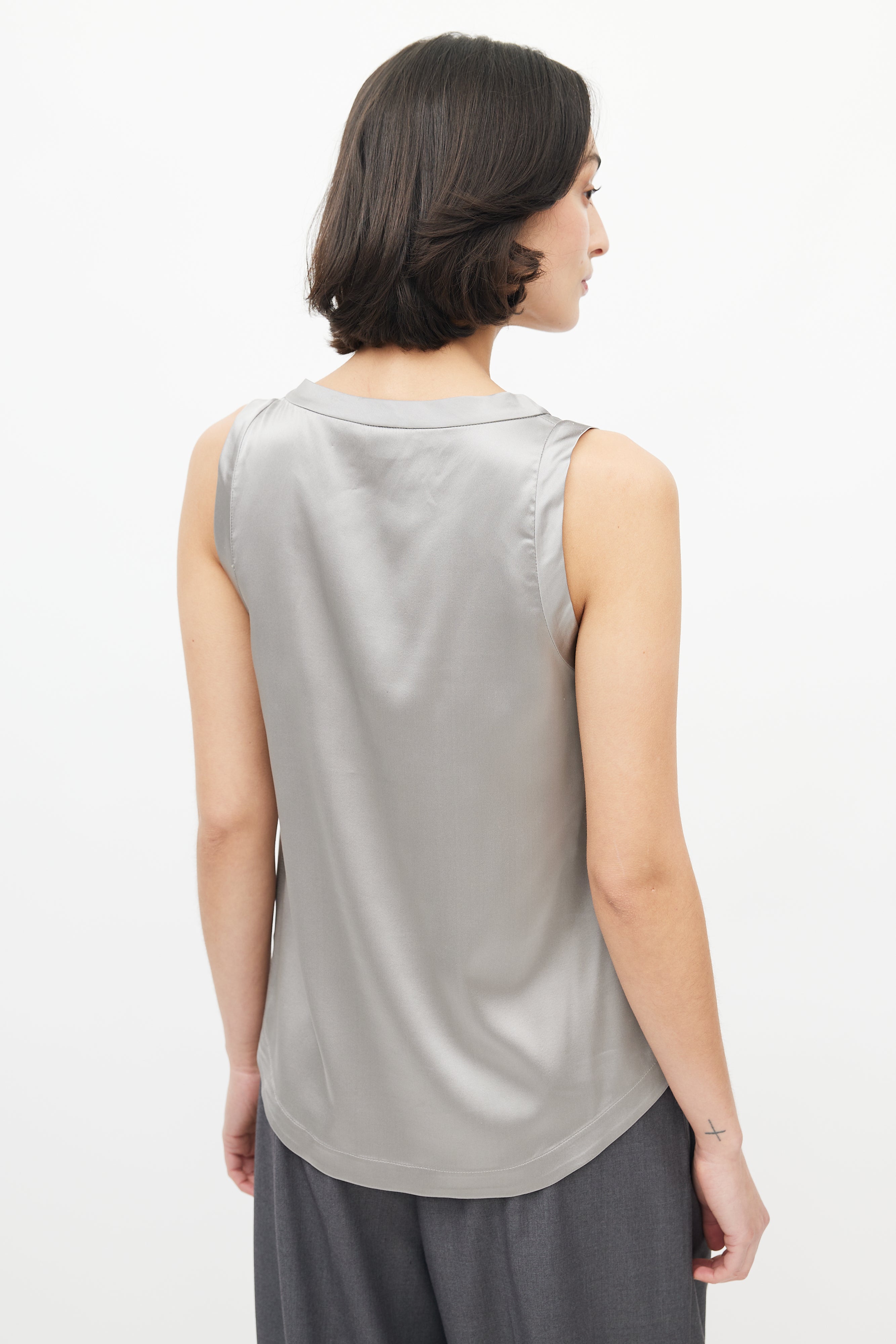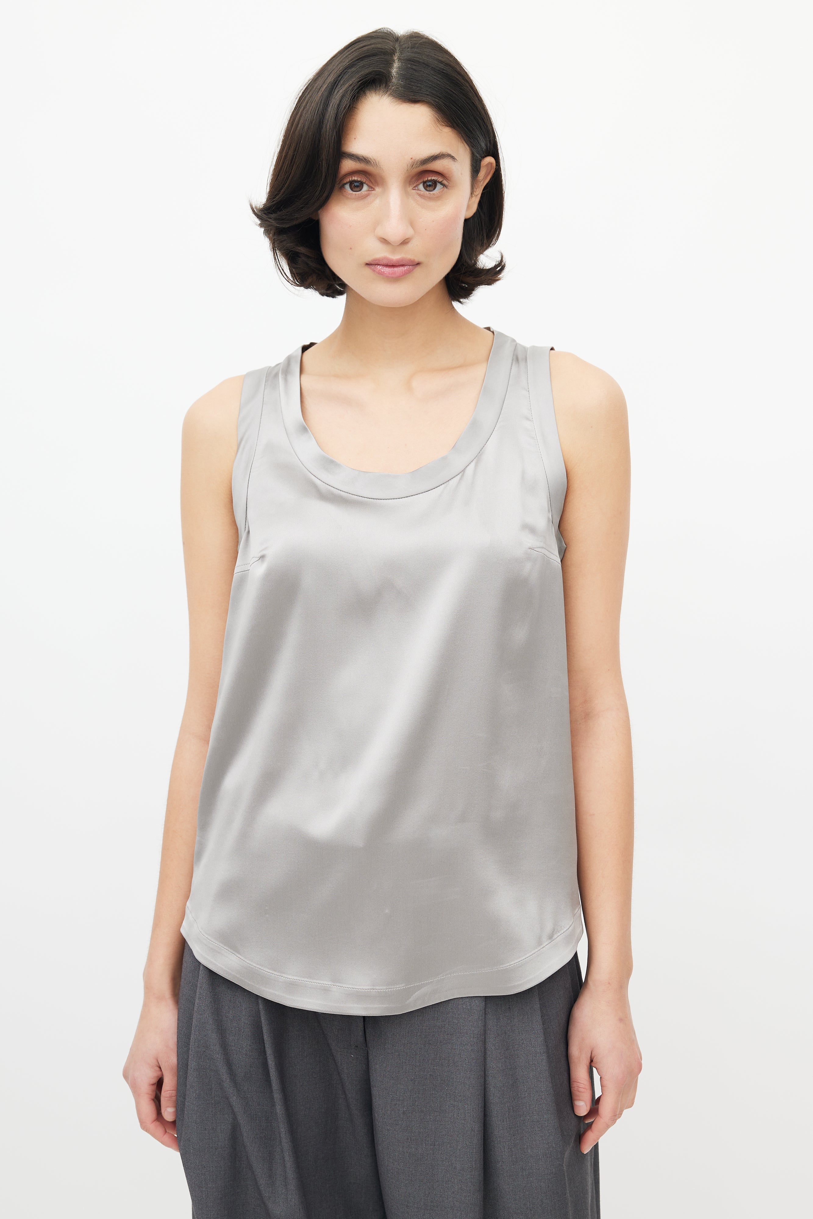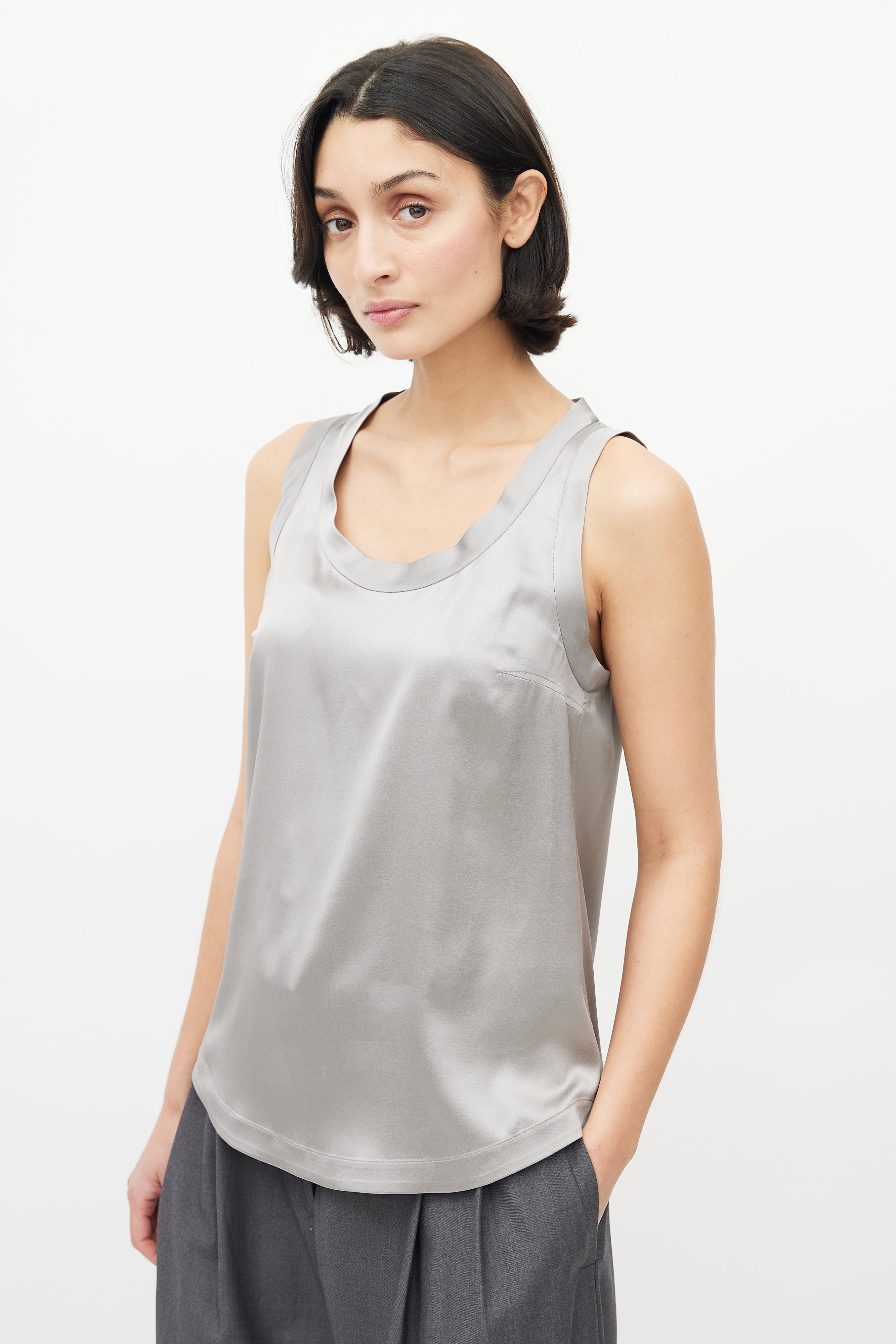 Pre-owned Brunello Cucinelli grey satin tank top featuring a crew neckline, darted front, and sleeveless styling.