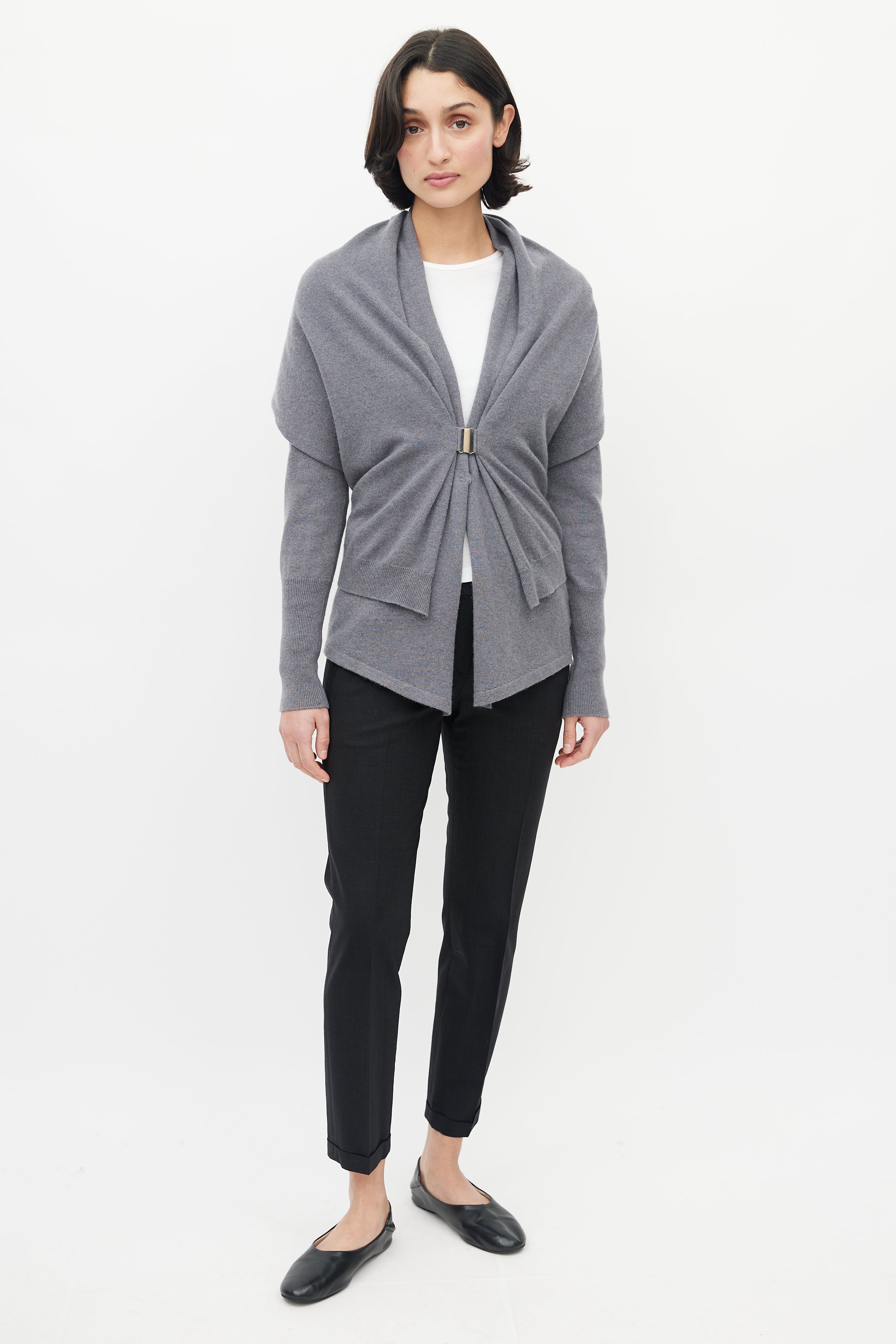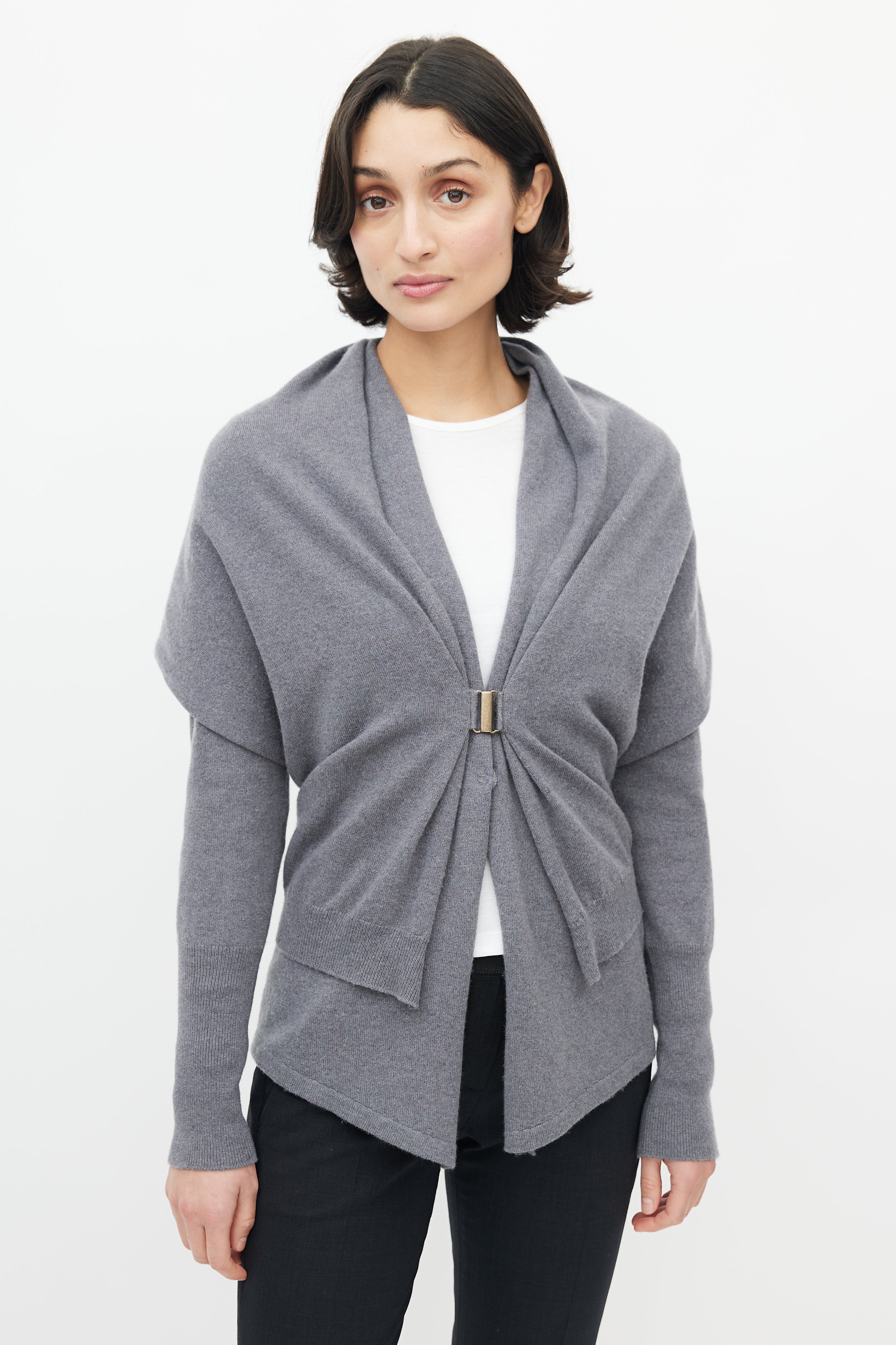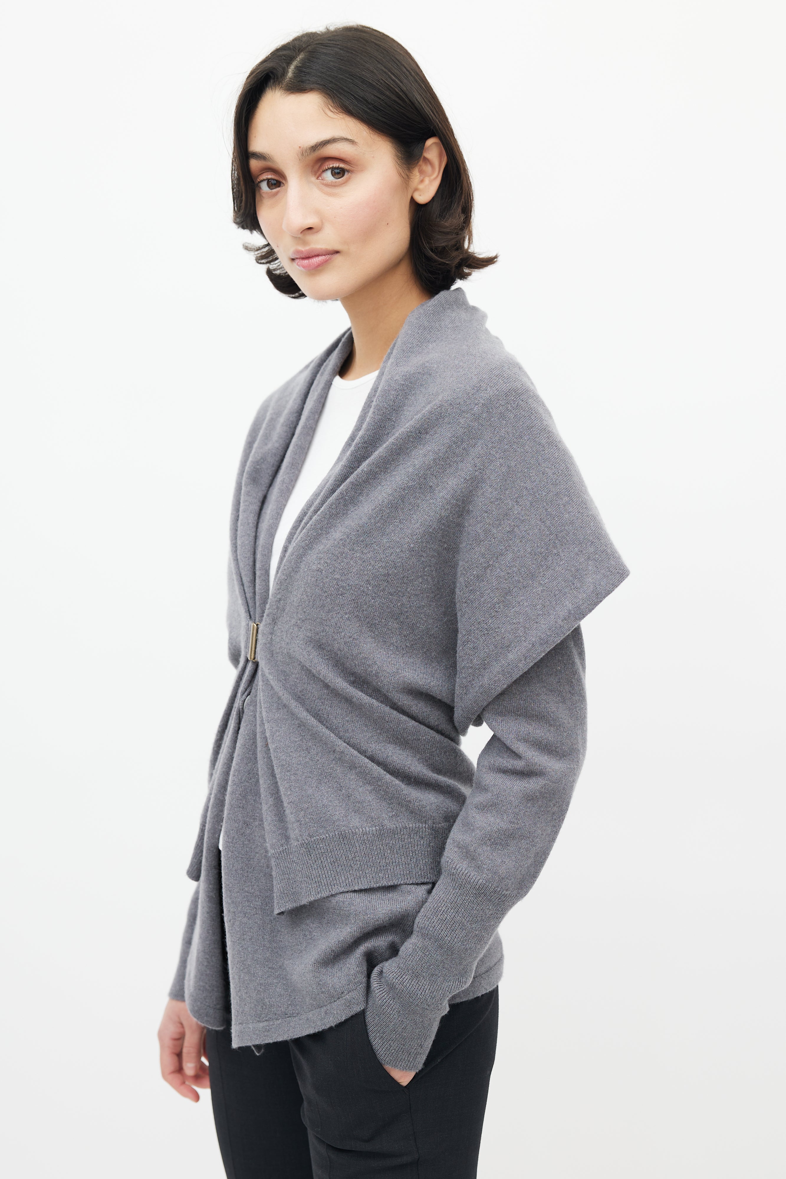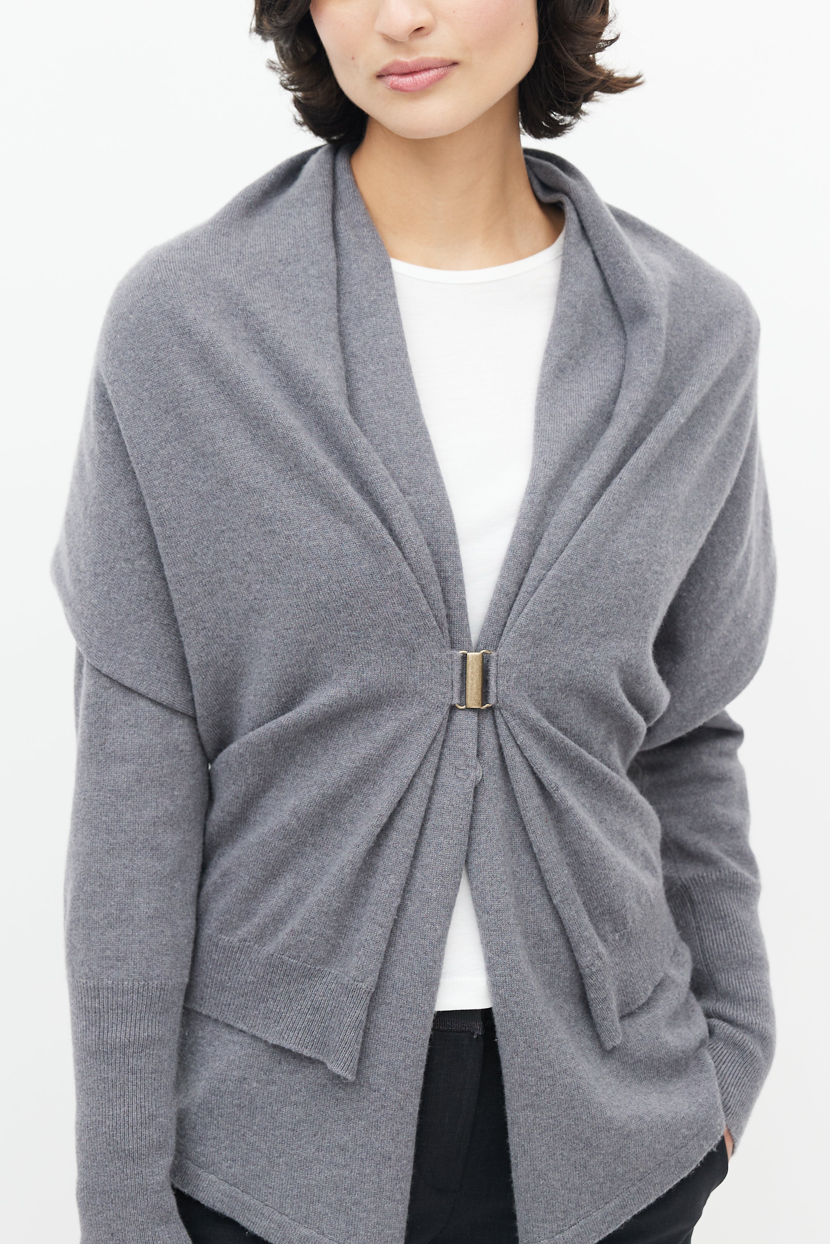Pre-owned Brunello Cucinelli grey cashmere knit cardigan featuring a shawl collar, ribbed hem, and clasp closure.