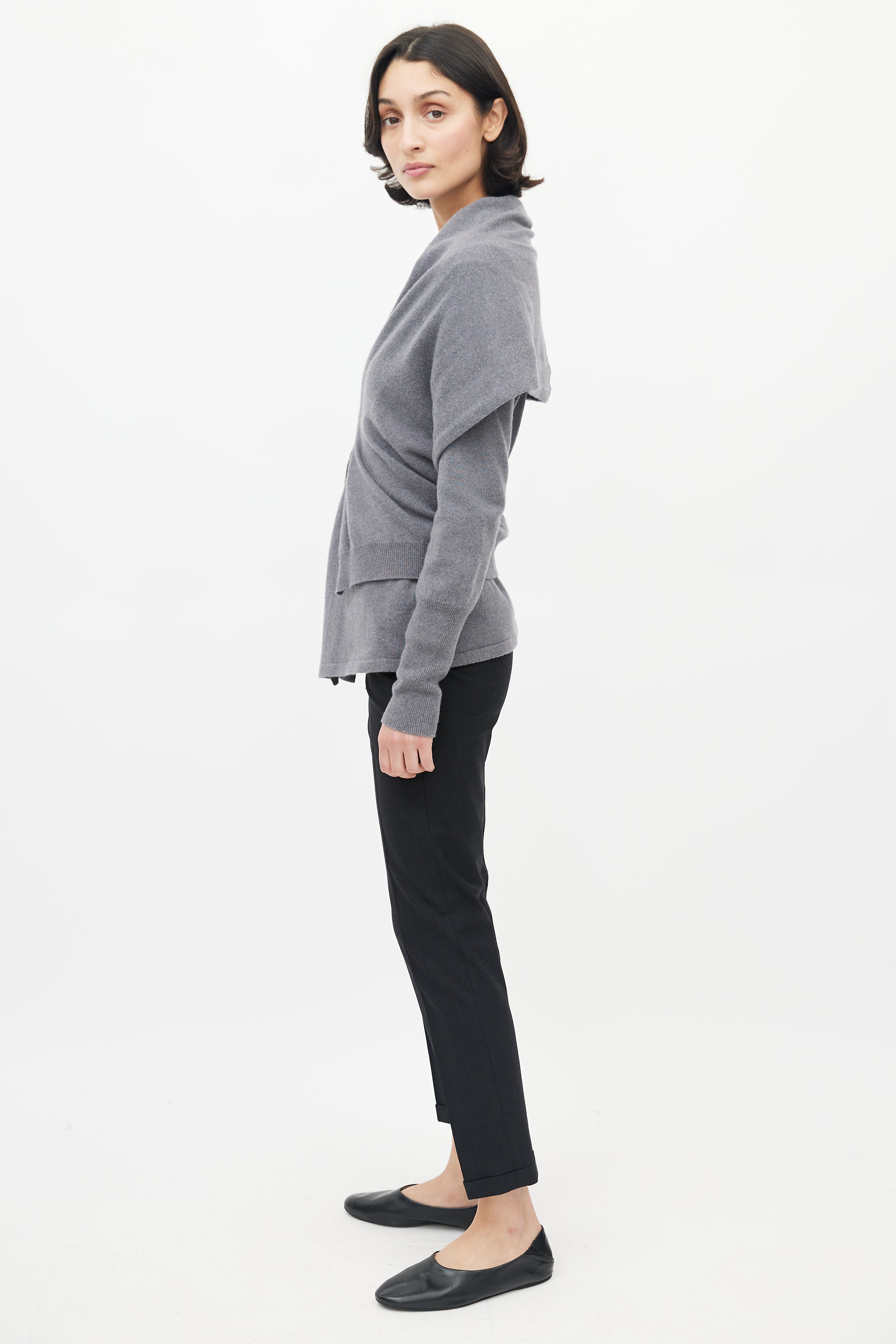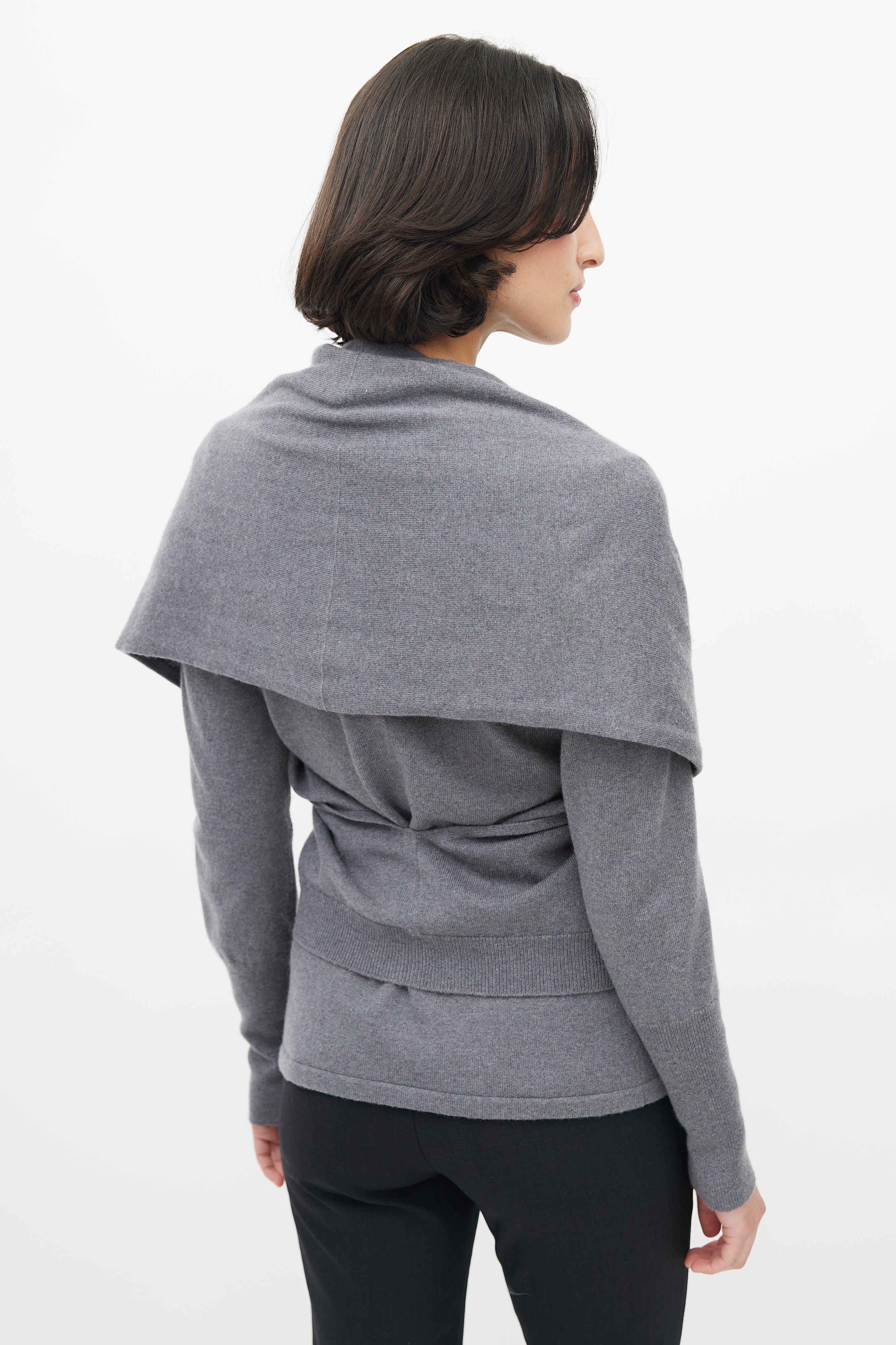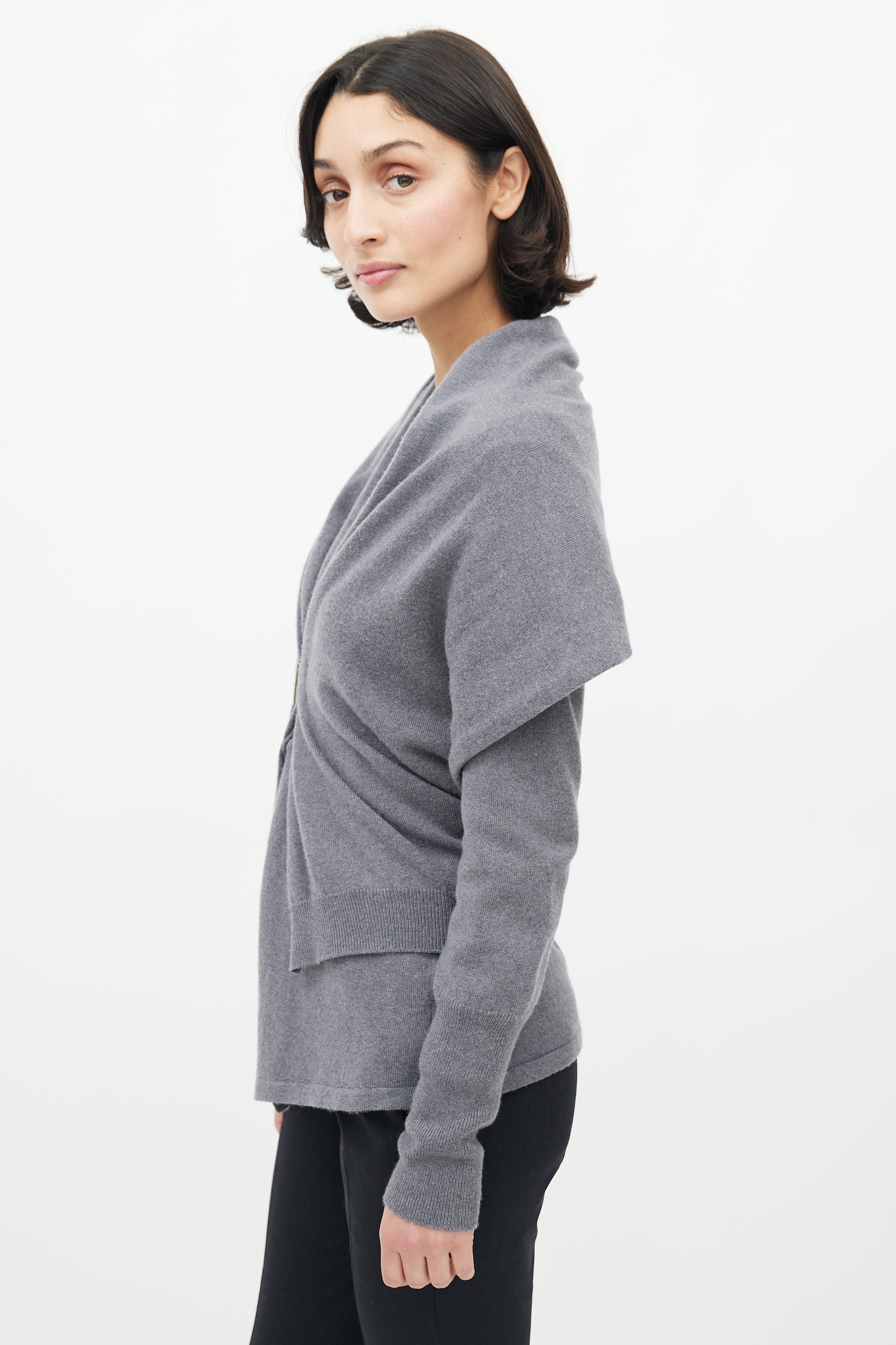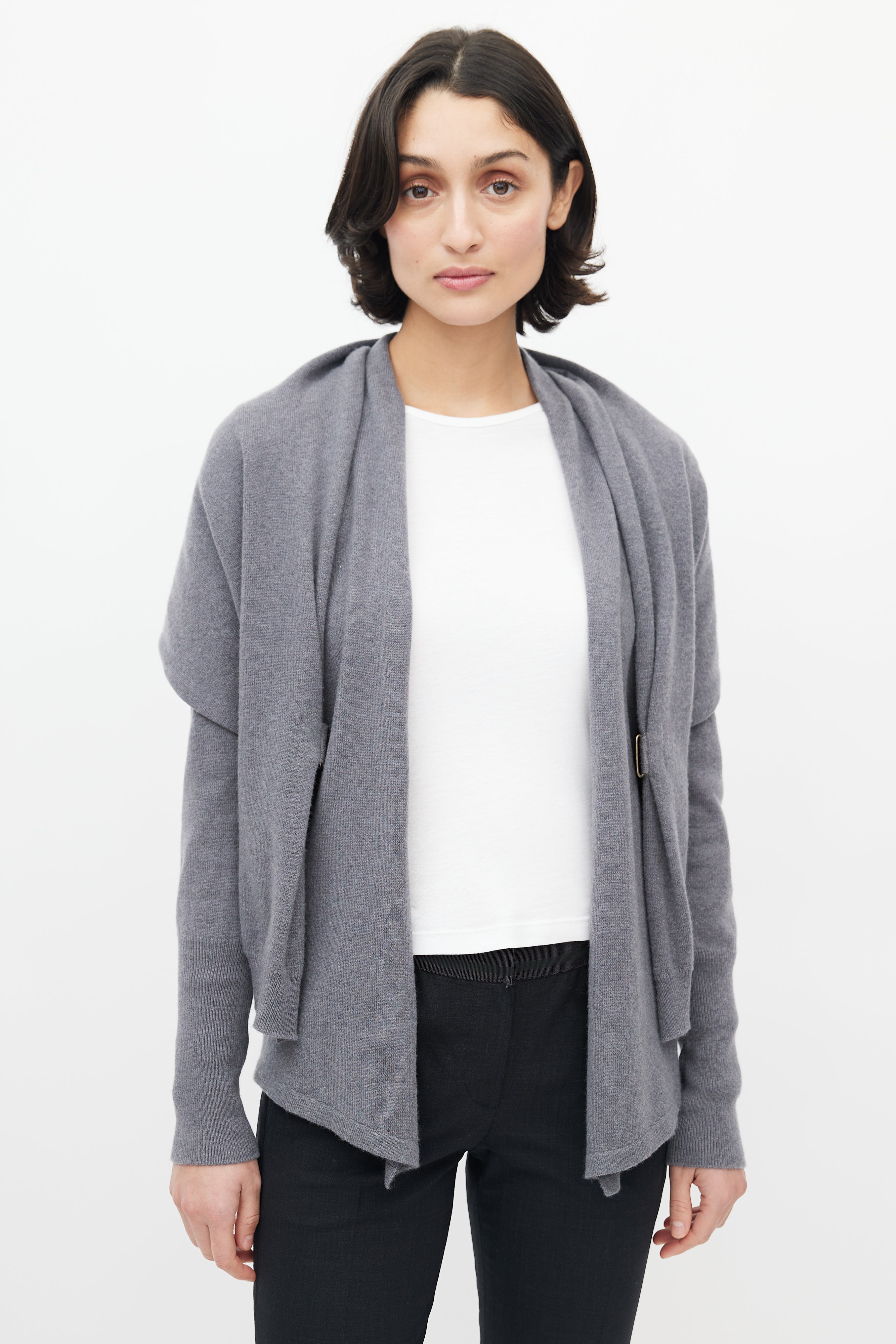 Pre-owned Brunello Cucinelli grey cashmere knit cardigan featuring a shawl collar, ribbed hem, and clasp closure.