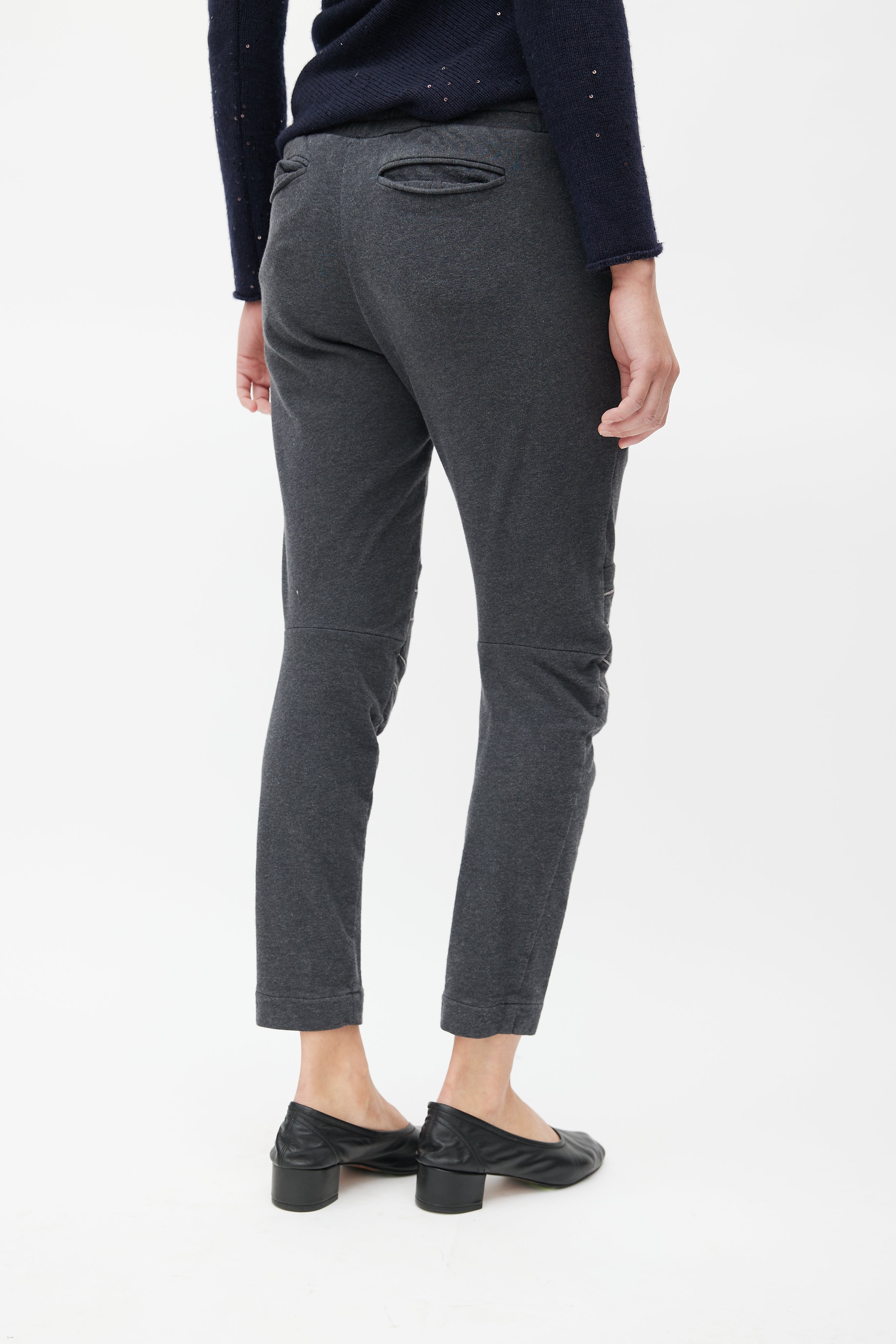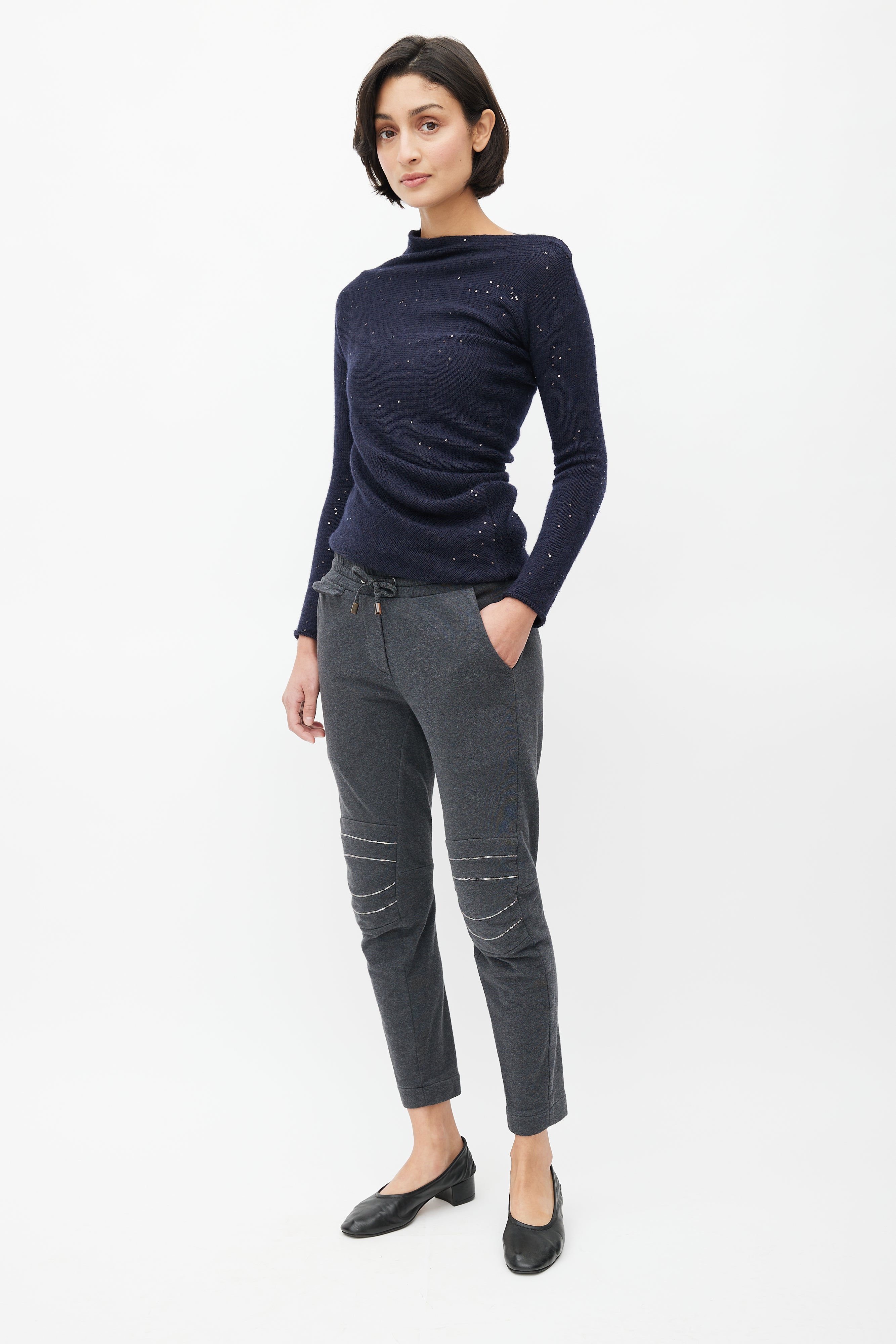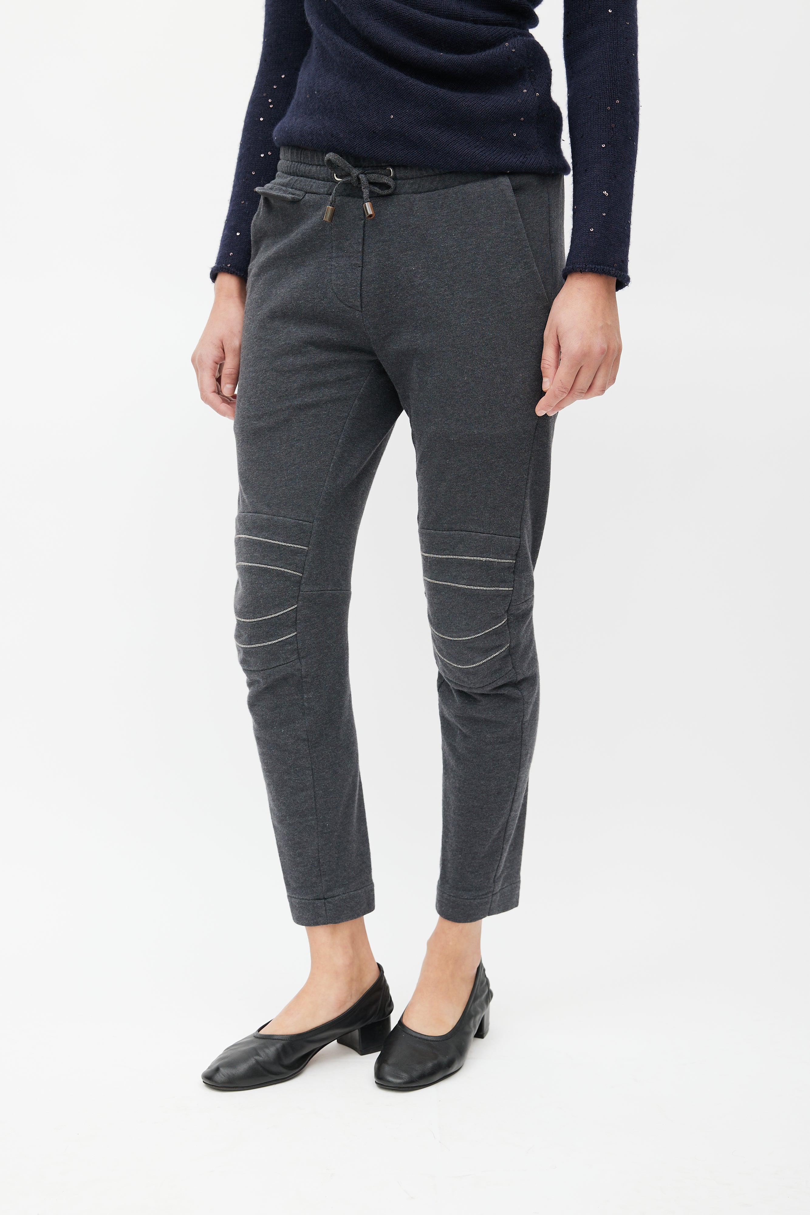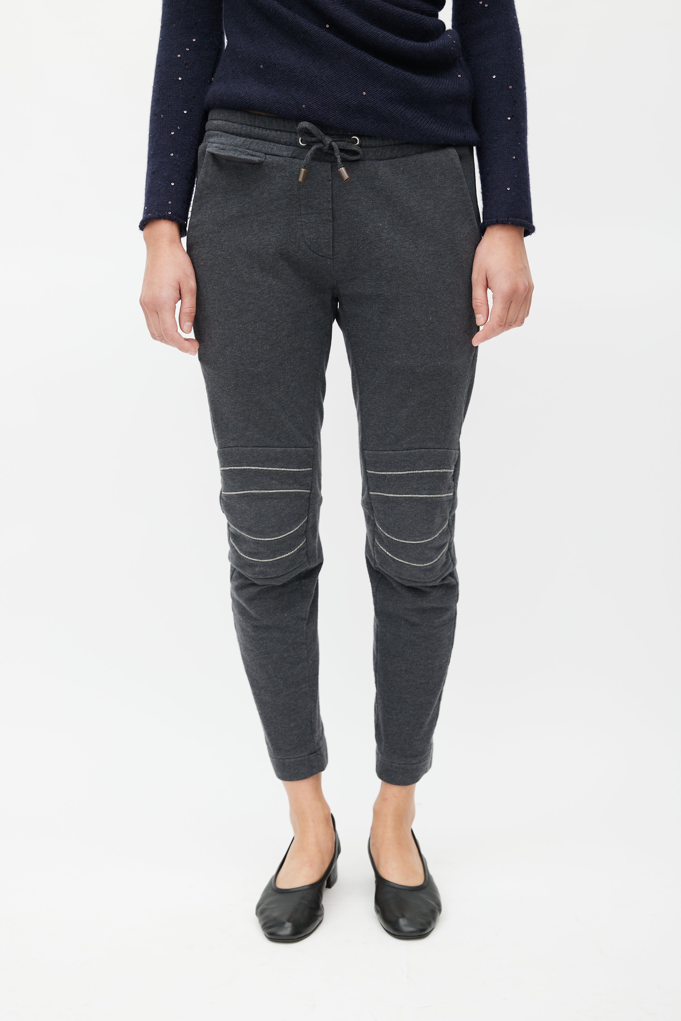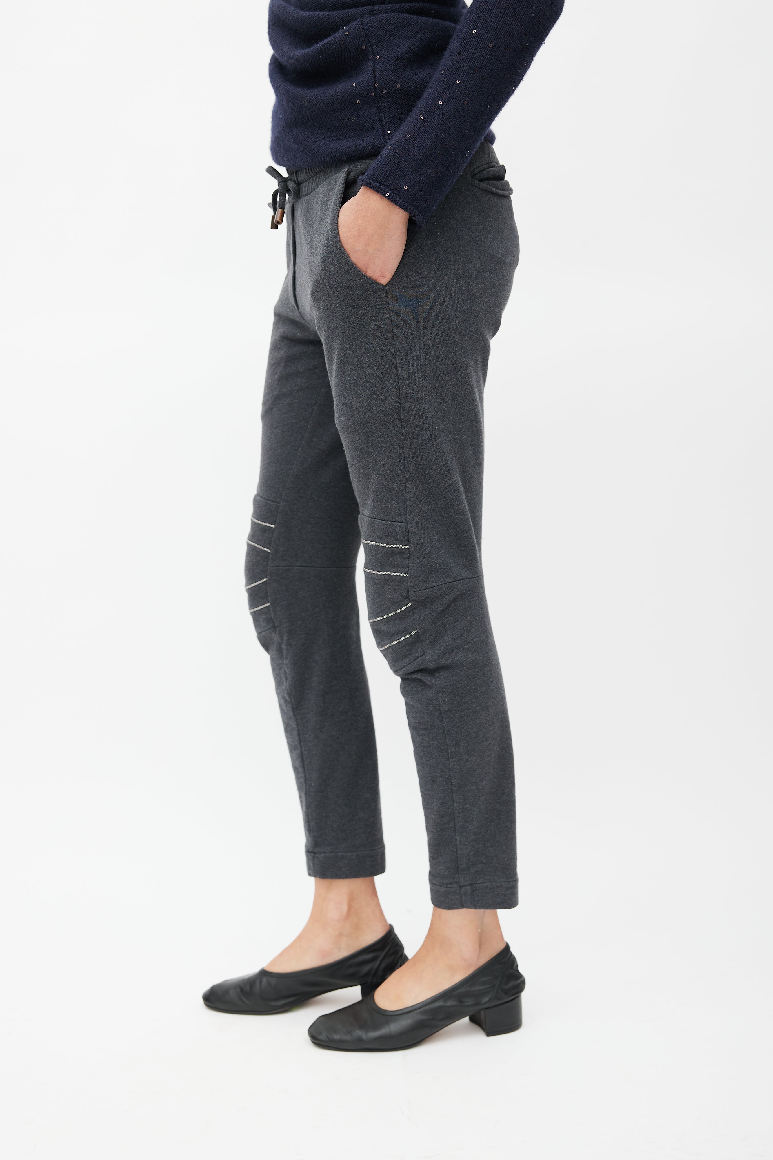 Pre-owned Brunello Cucinelli grey sweatpants featuring elasticized waist with drawstring fastening, two slash pockets at hips, two welt pockets at back, and Monili beads embellishment at knees.