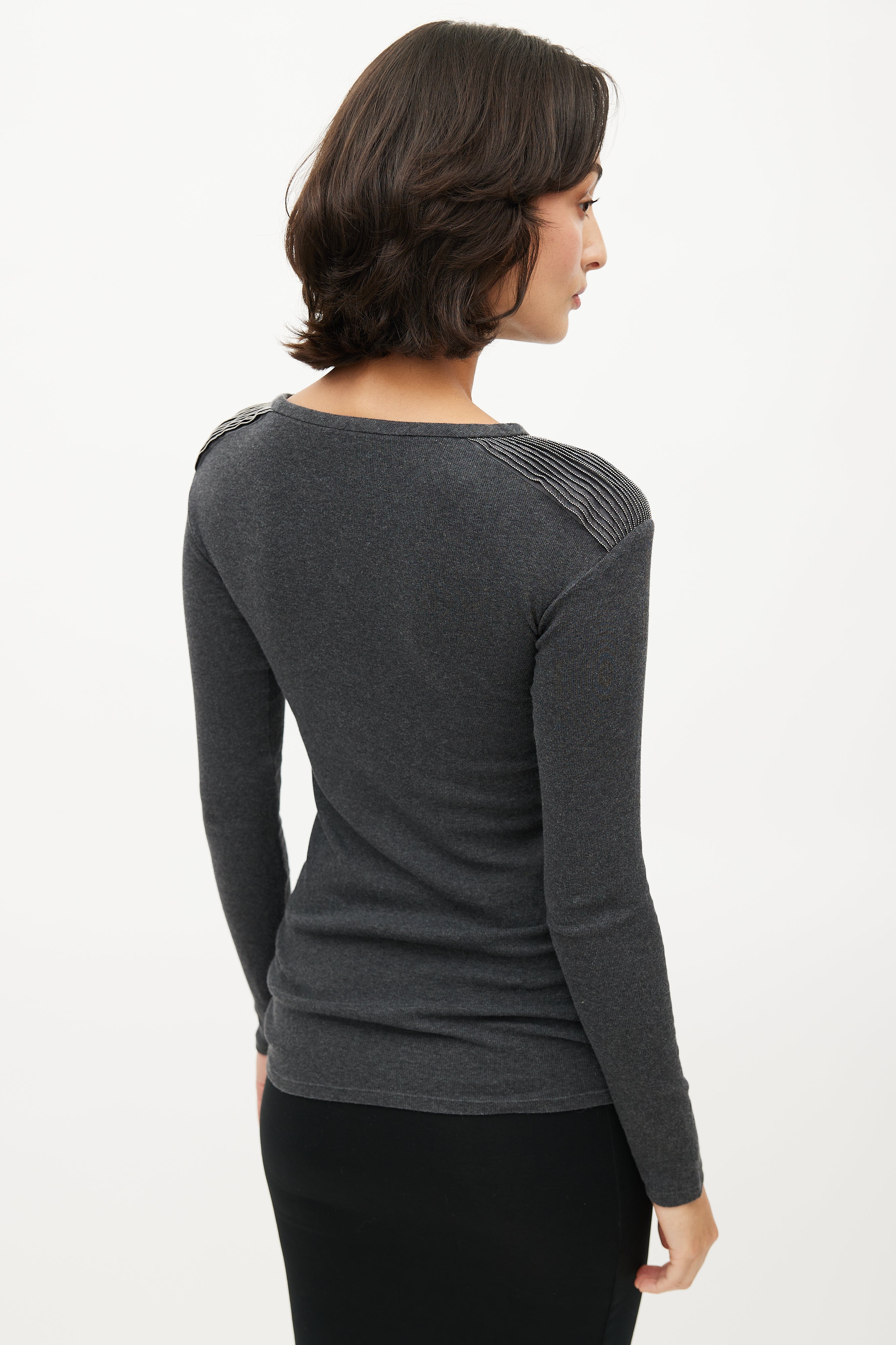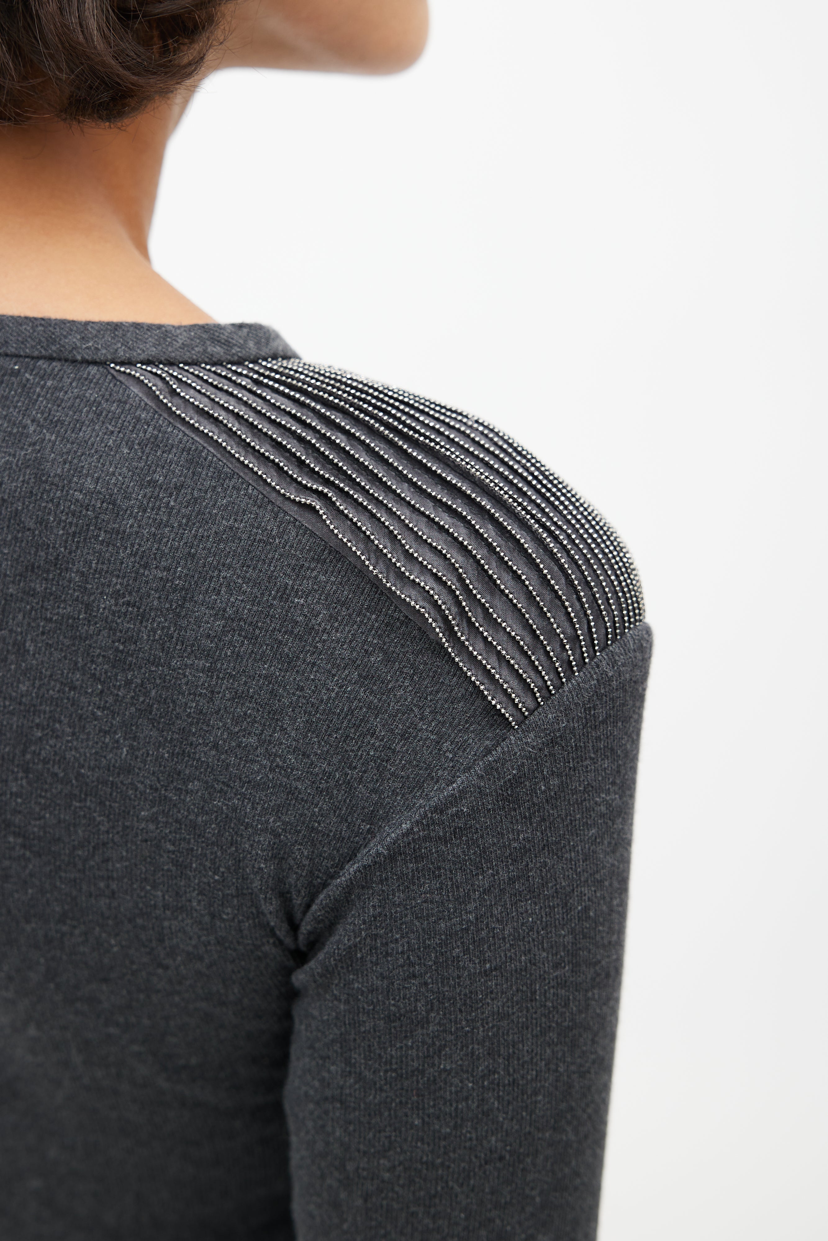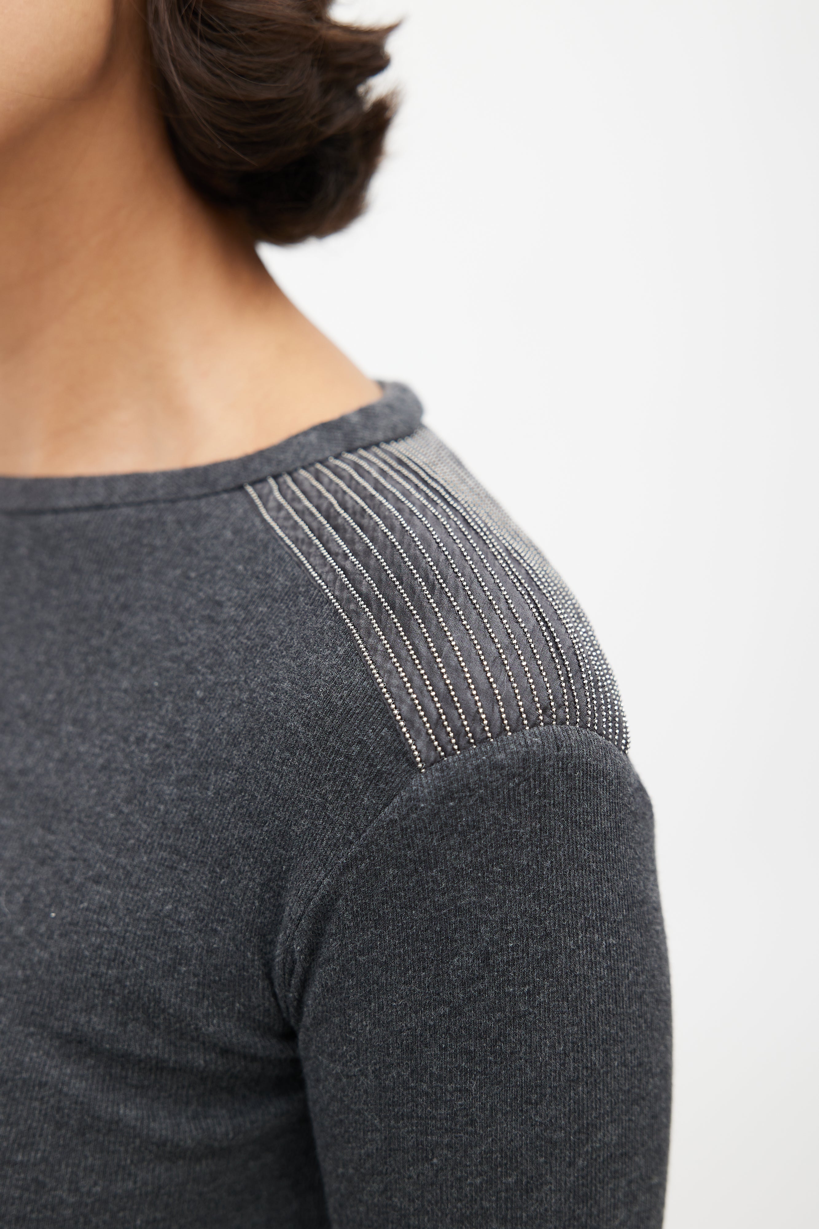 Pre-owned Brunello Cucinelli grey sweater featuring a round neckline, pleated detail at shoulder with Monili bead trim, and long sleeves.