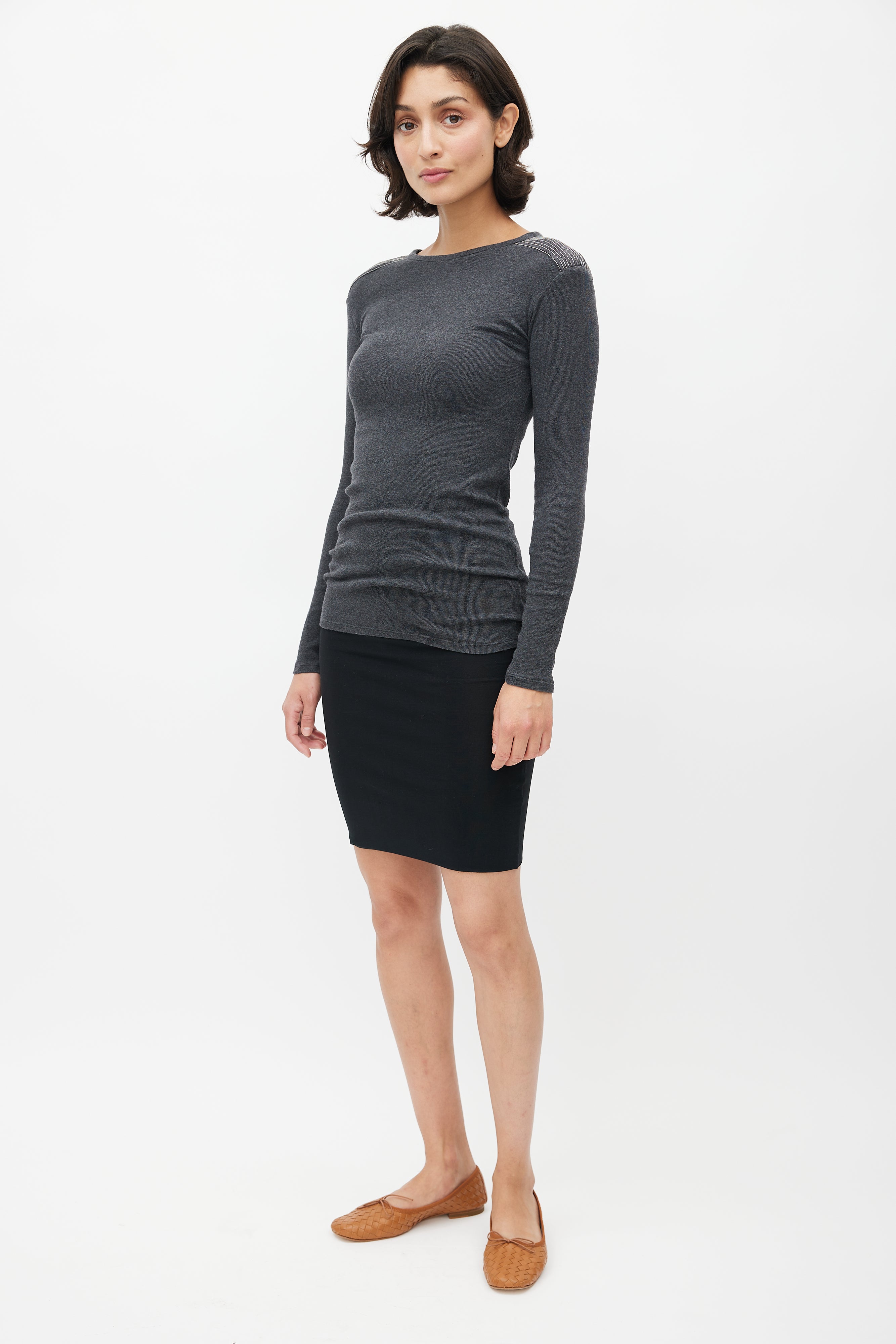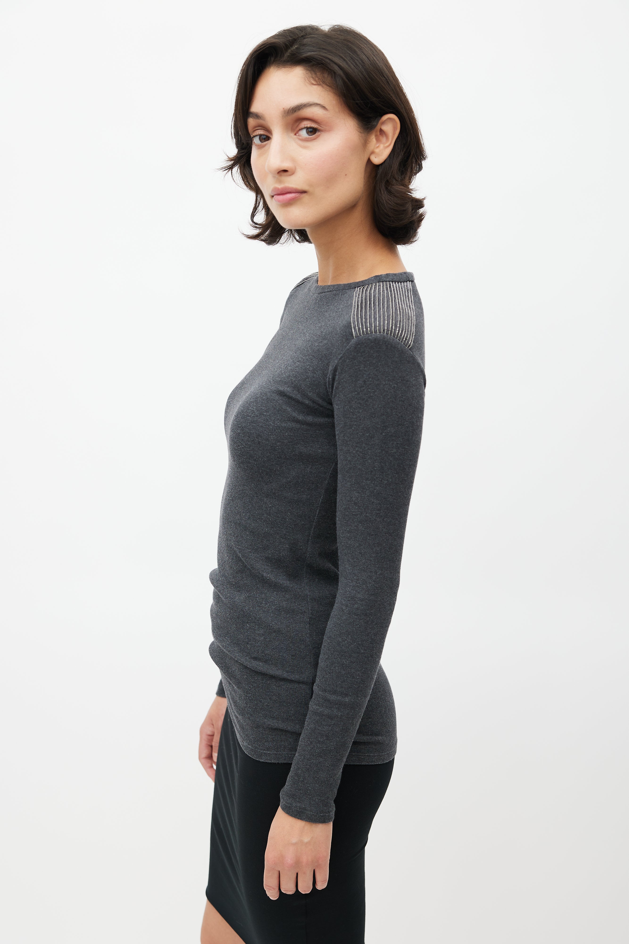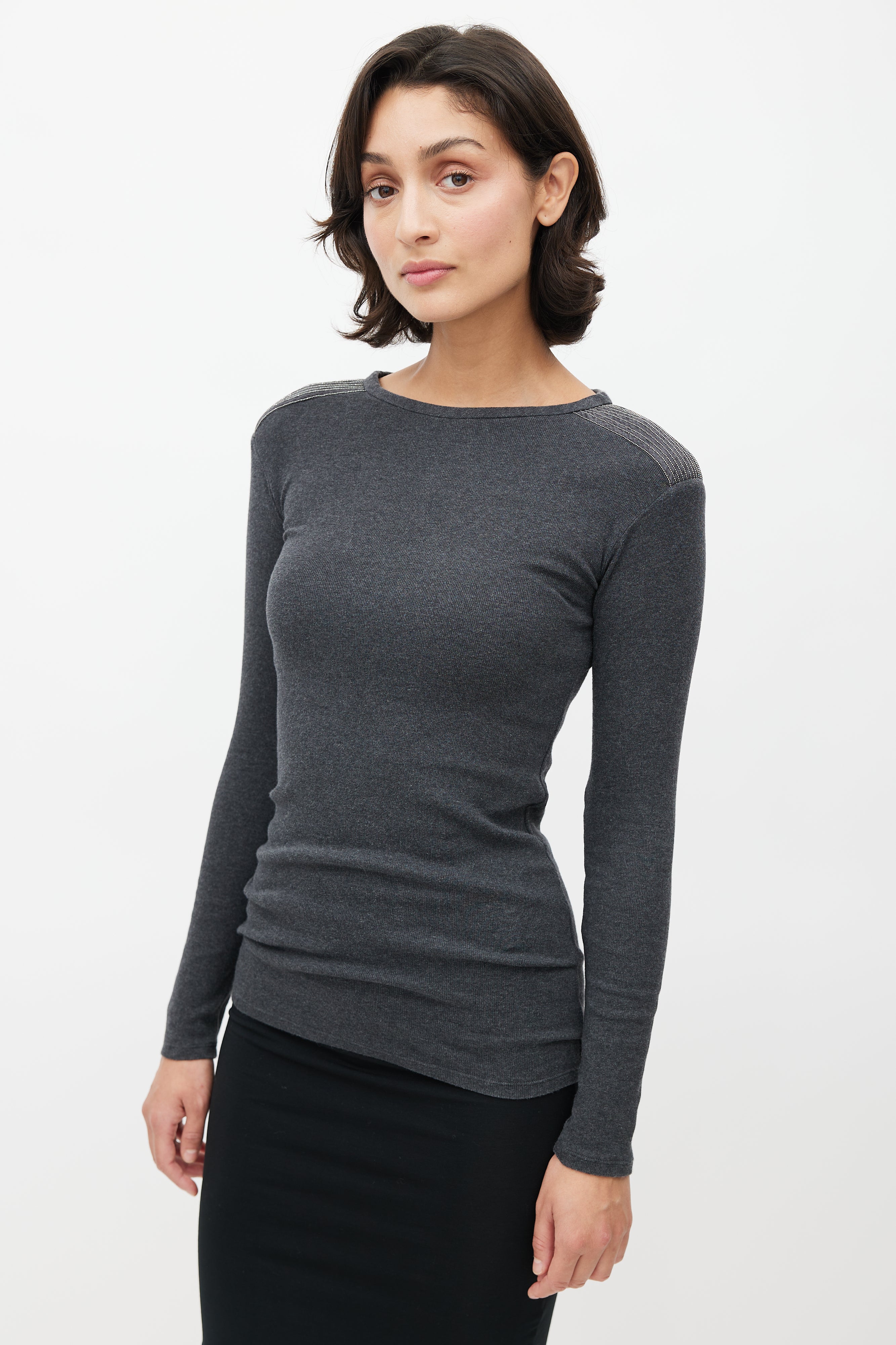 Pre-owned Brunello Cucinelli grey sweater featuring a round neckline, pleated detail at shoulder with Monili bead trim, and long sleeves.
