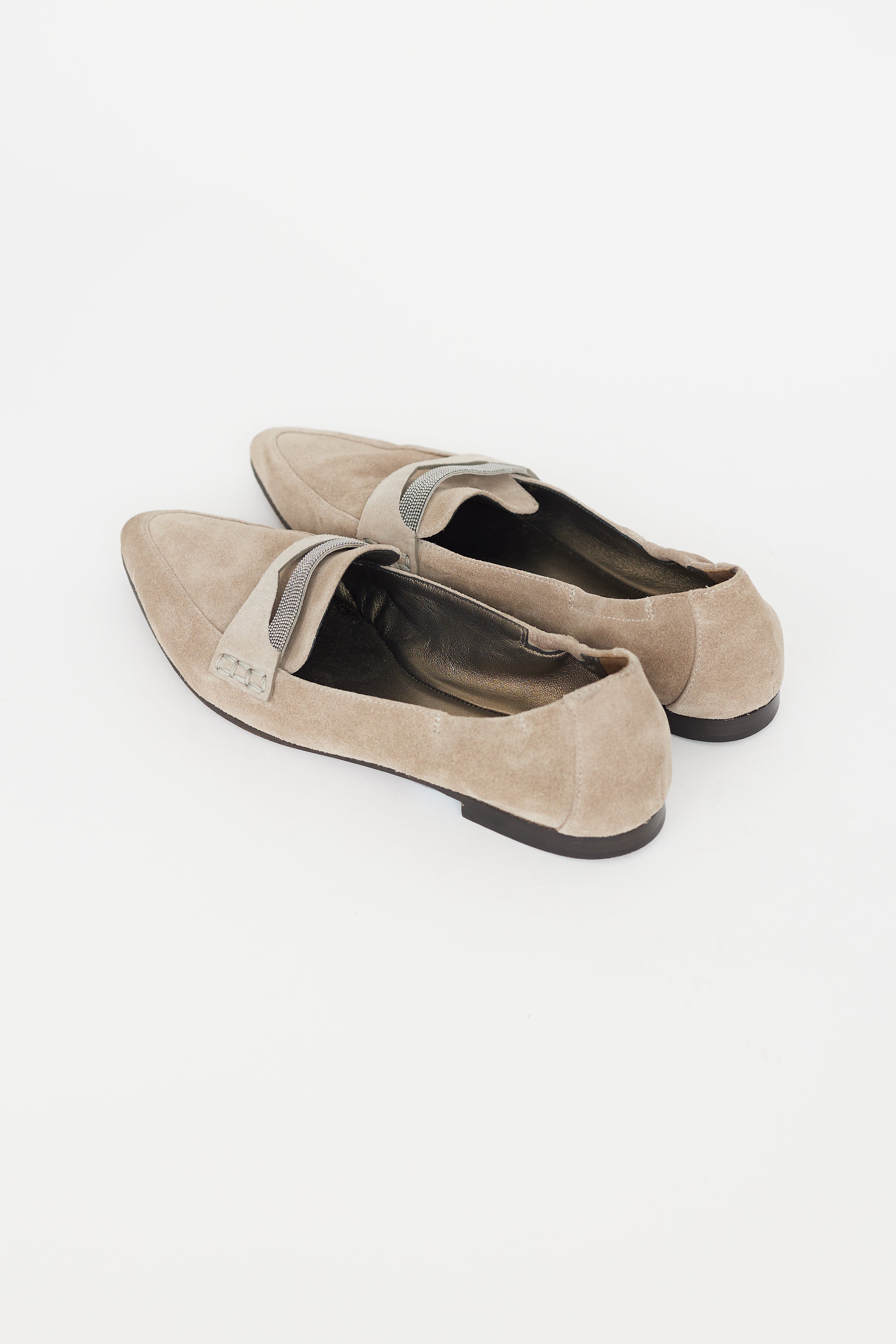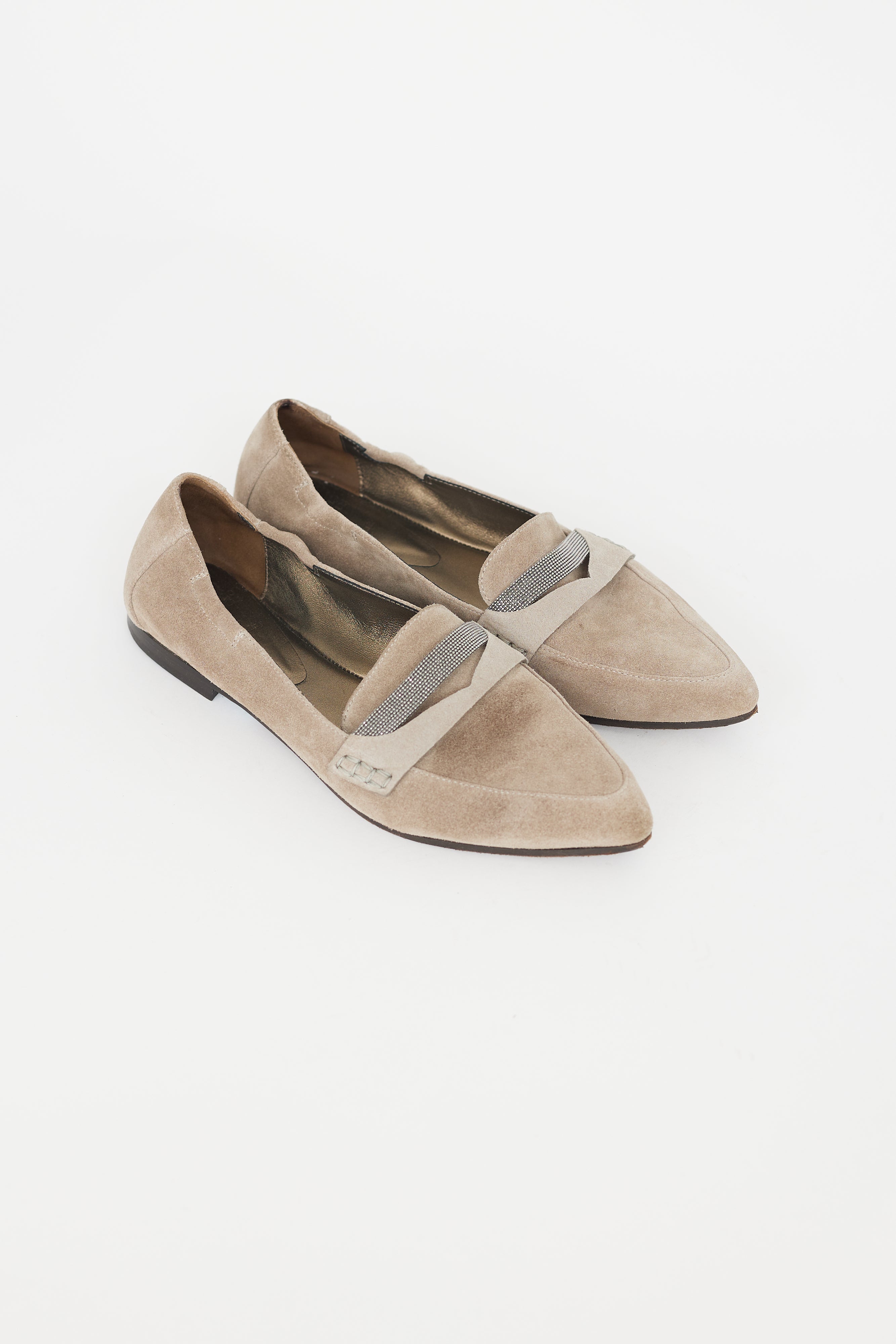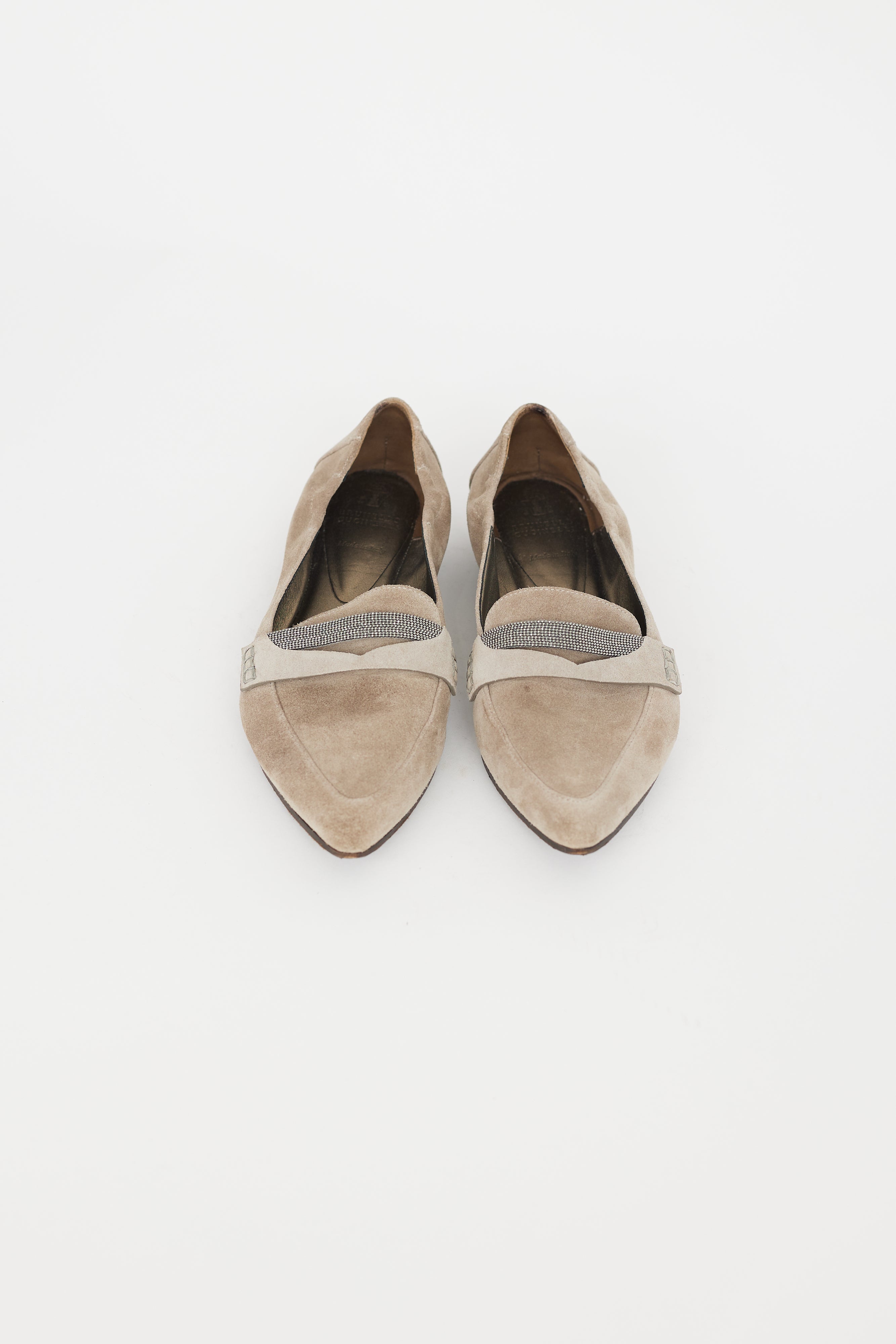 Pre-owned Brunello Cucinelli grey suede flat featuring pointed toe, Monili embellished strap at tongue, and wooden heel. Comes with dust bag.