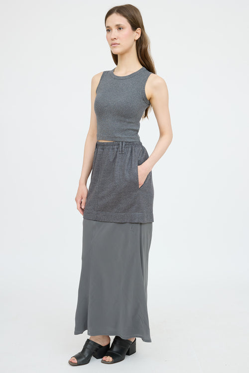 Pre-owned Brunello Cucinelli grey midi skirt featuring elastic waistband, belt loops, slit pockets at hip, and layered styling.