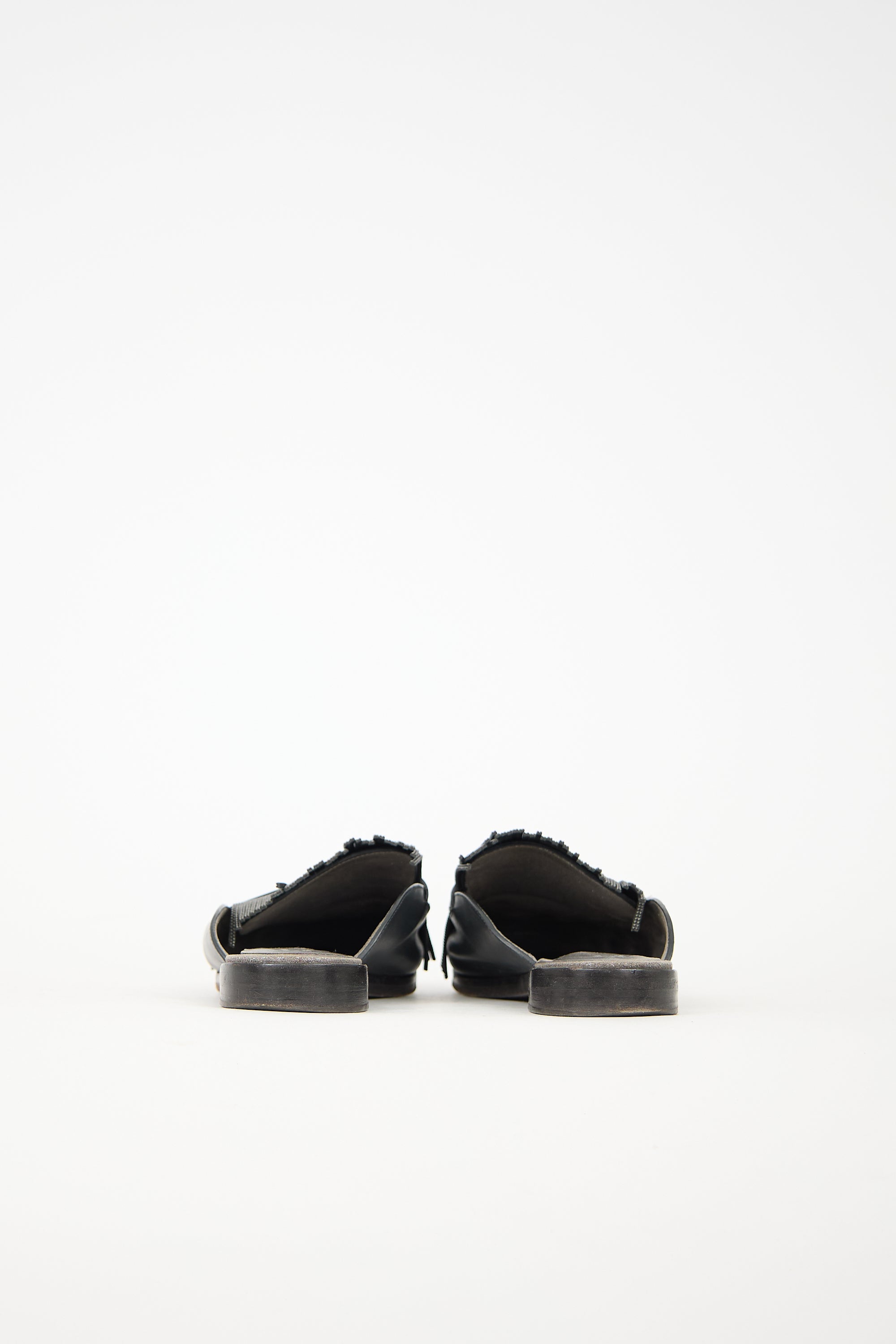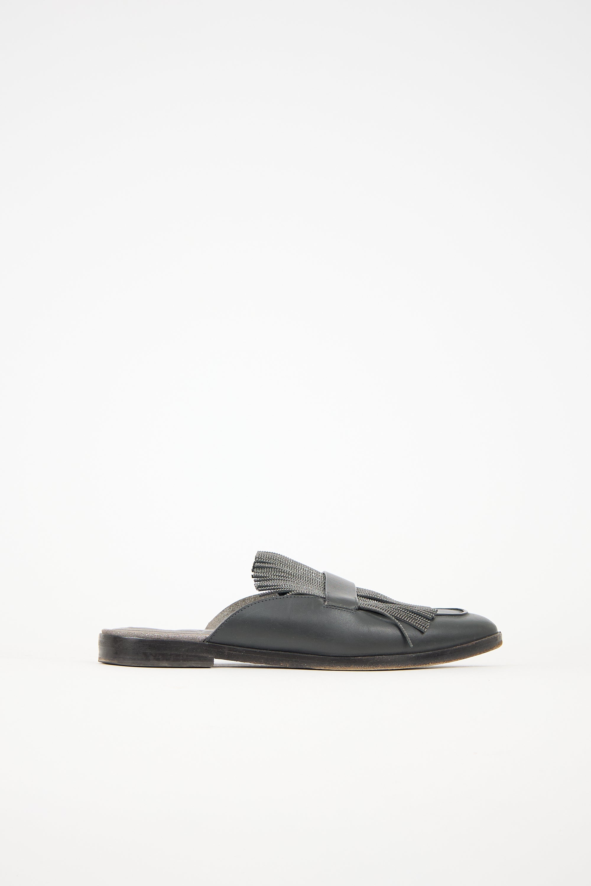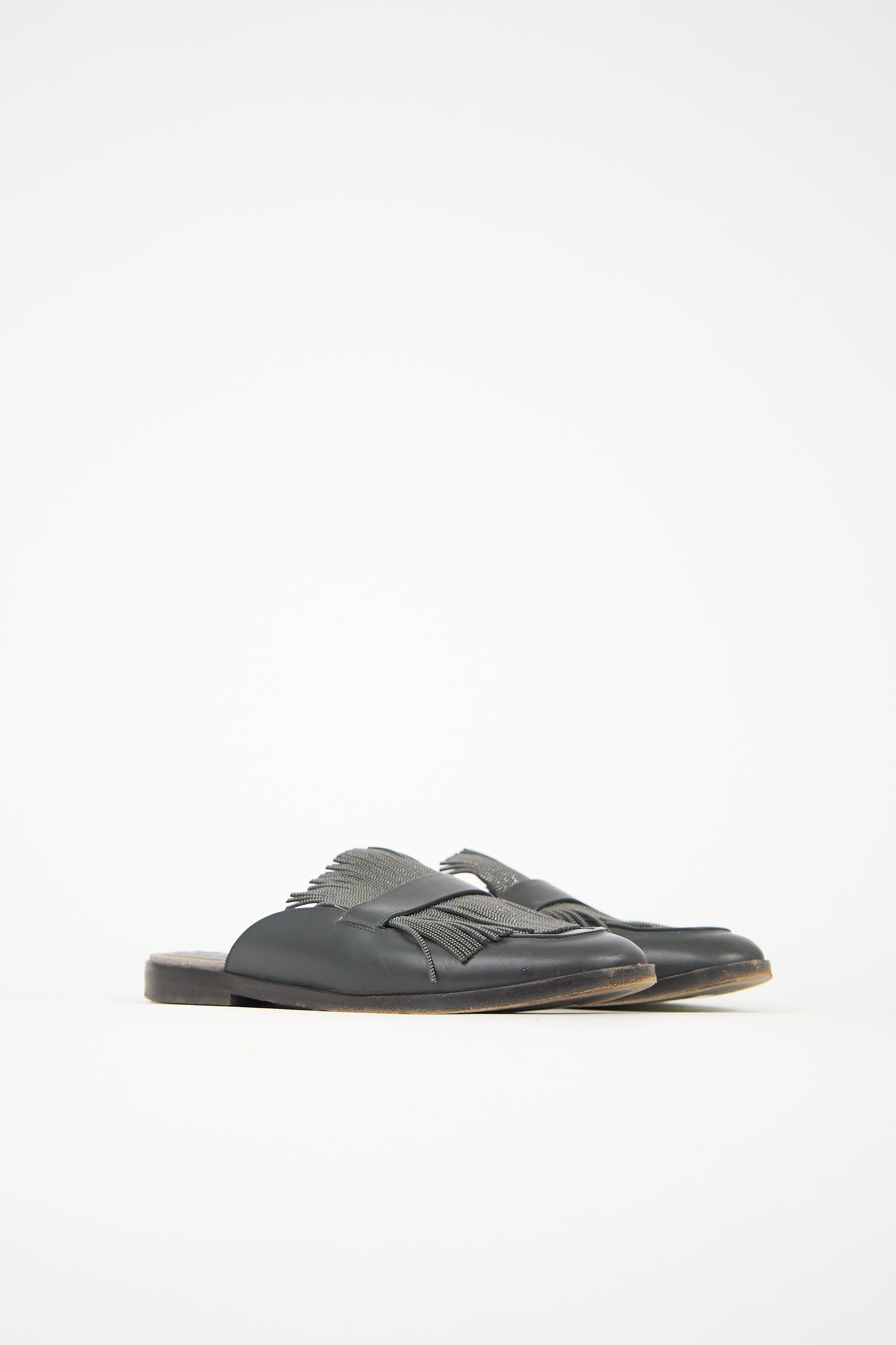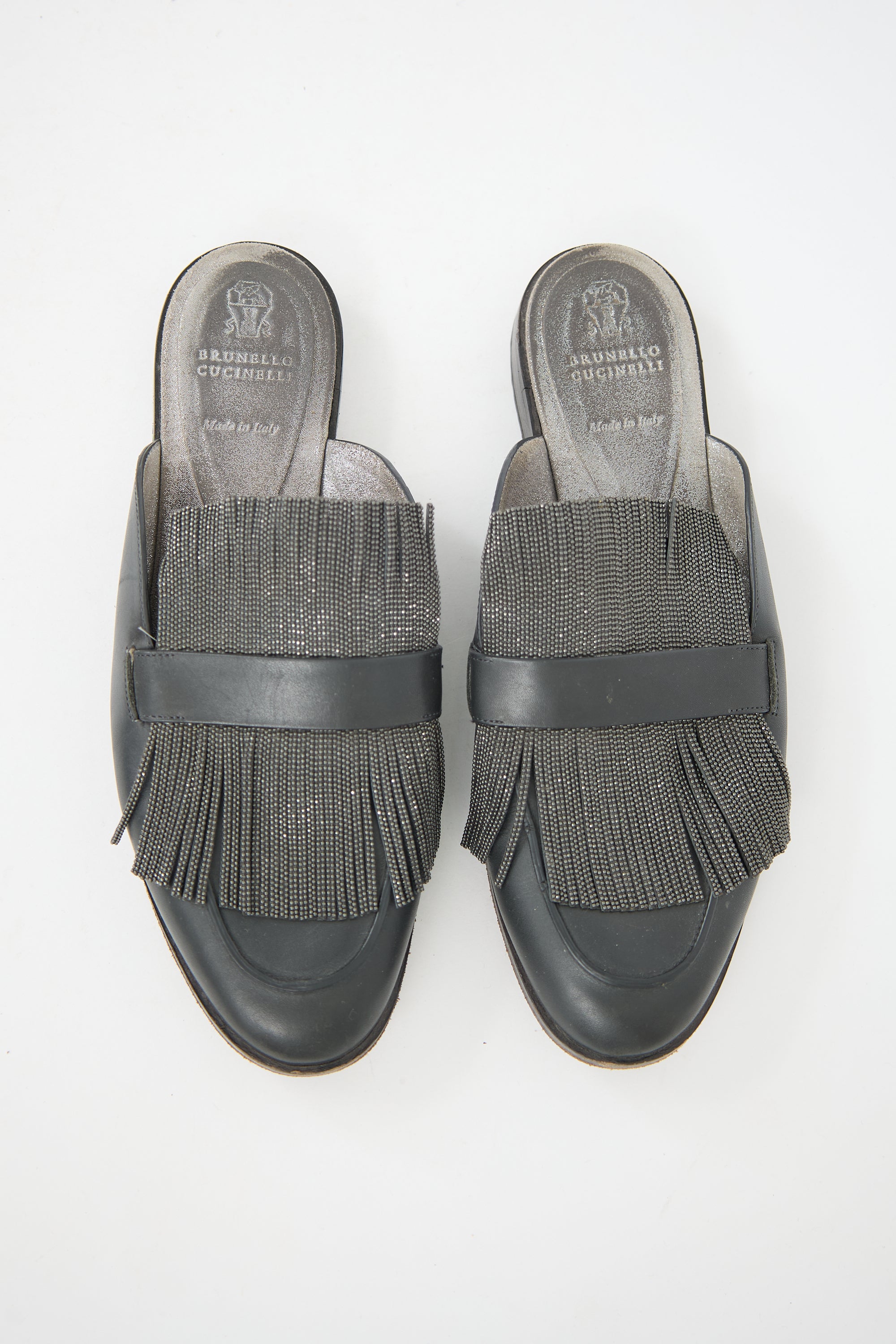 Pre-owned Brunello Cucinelli black leather mules featuring almond toe, signature Monili embellished fringe at upper, and short stacked heel.