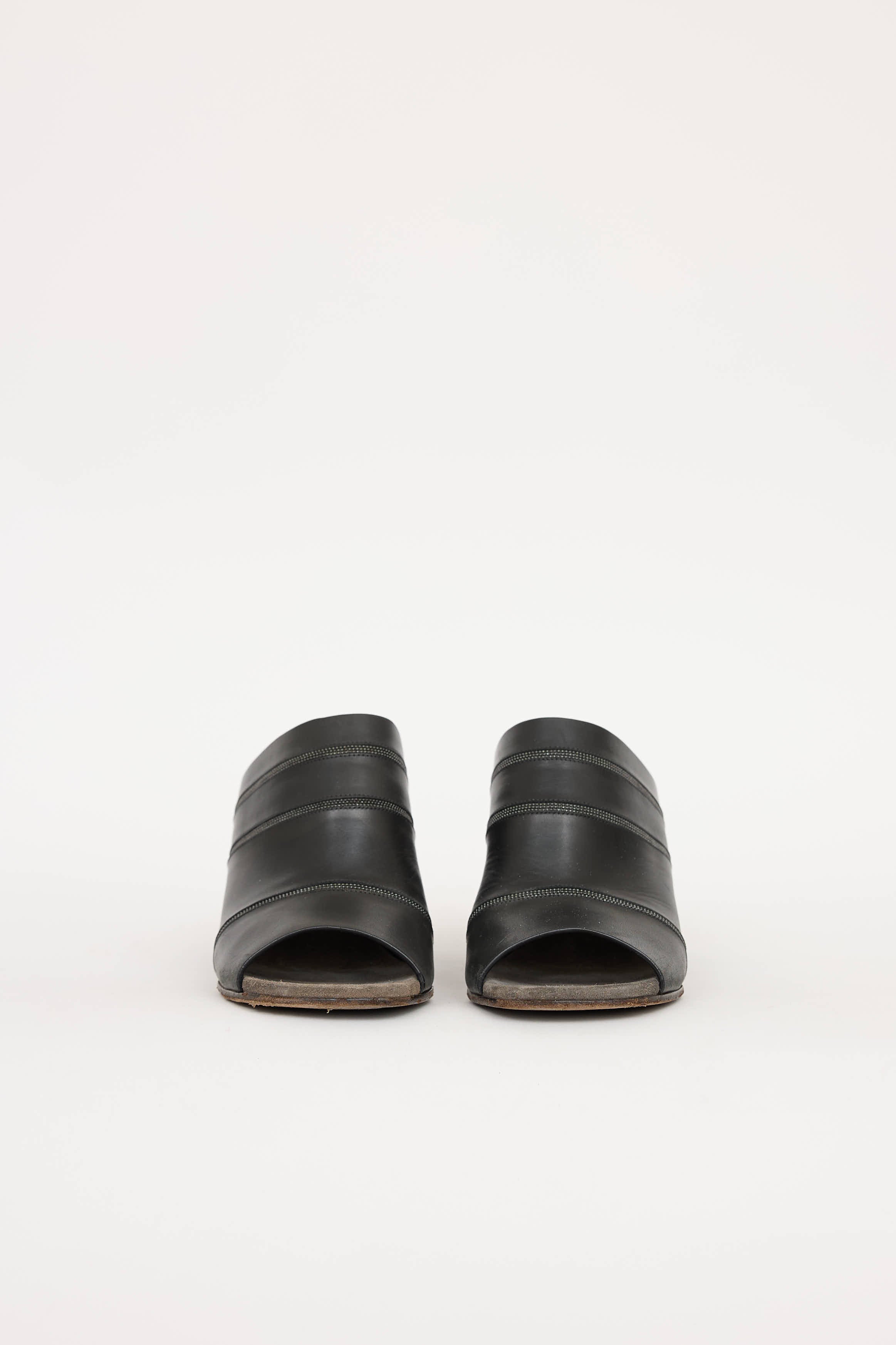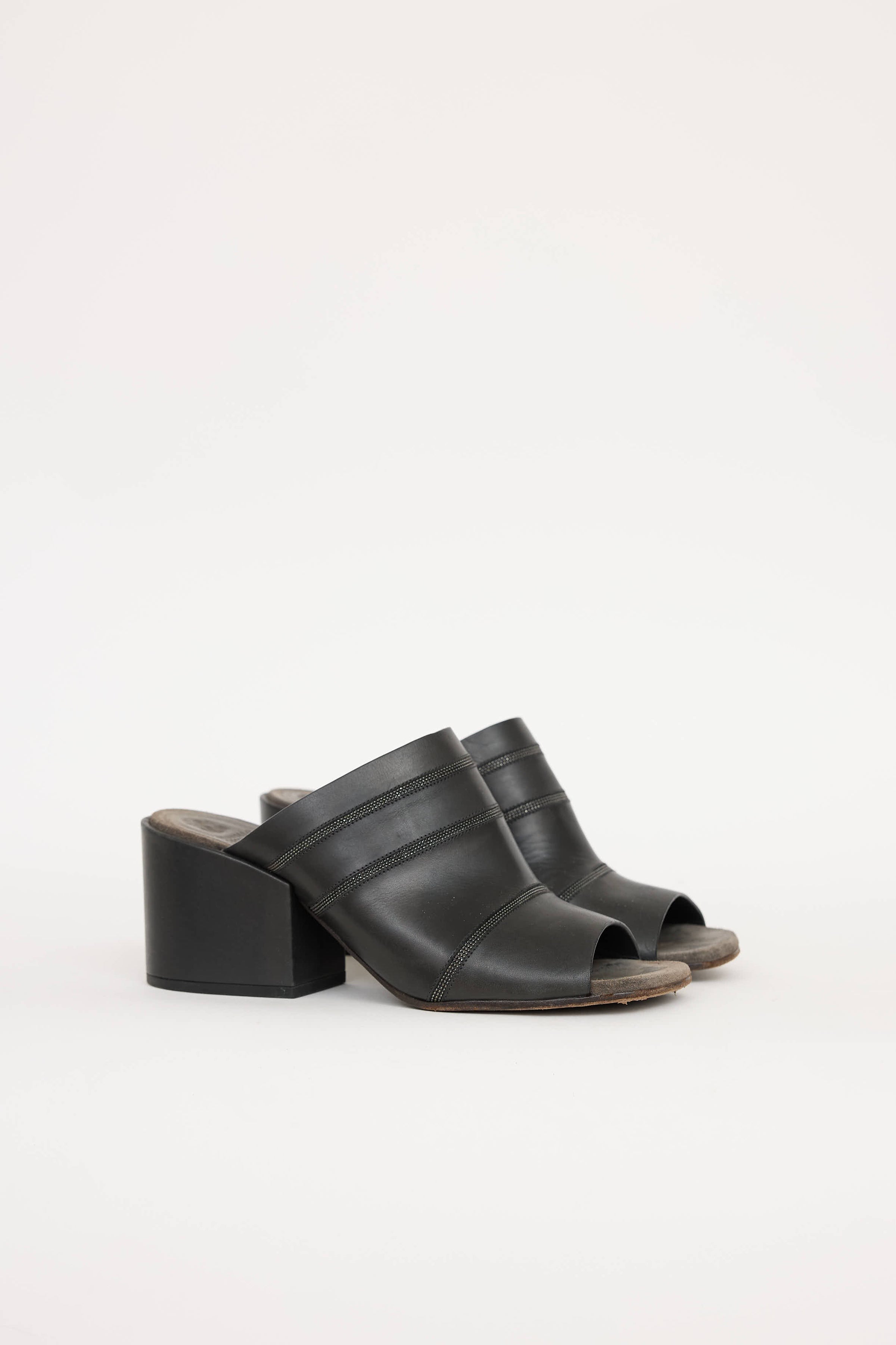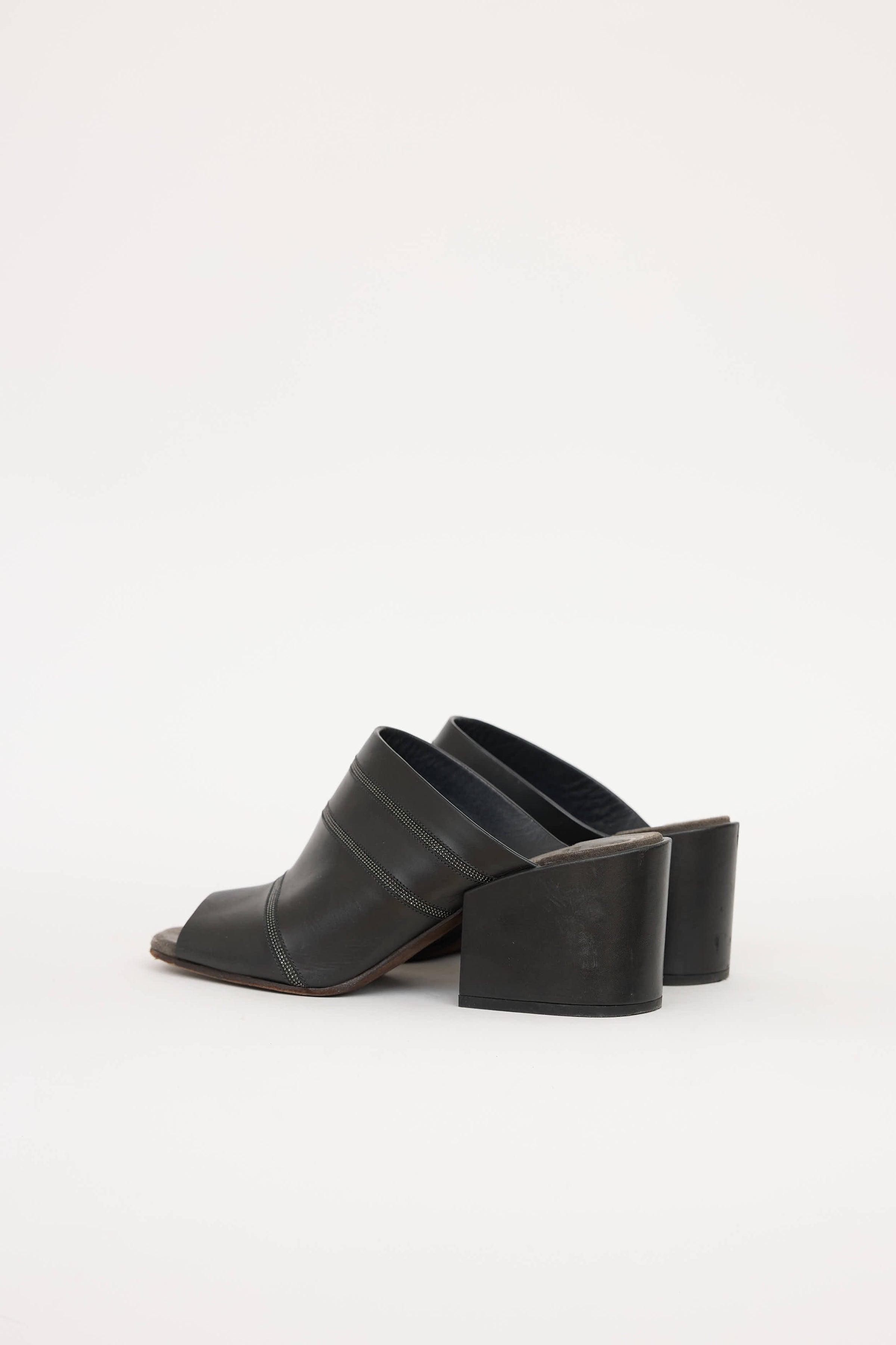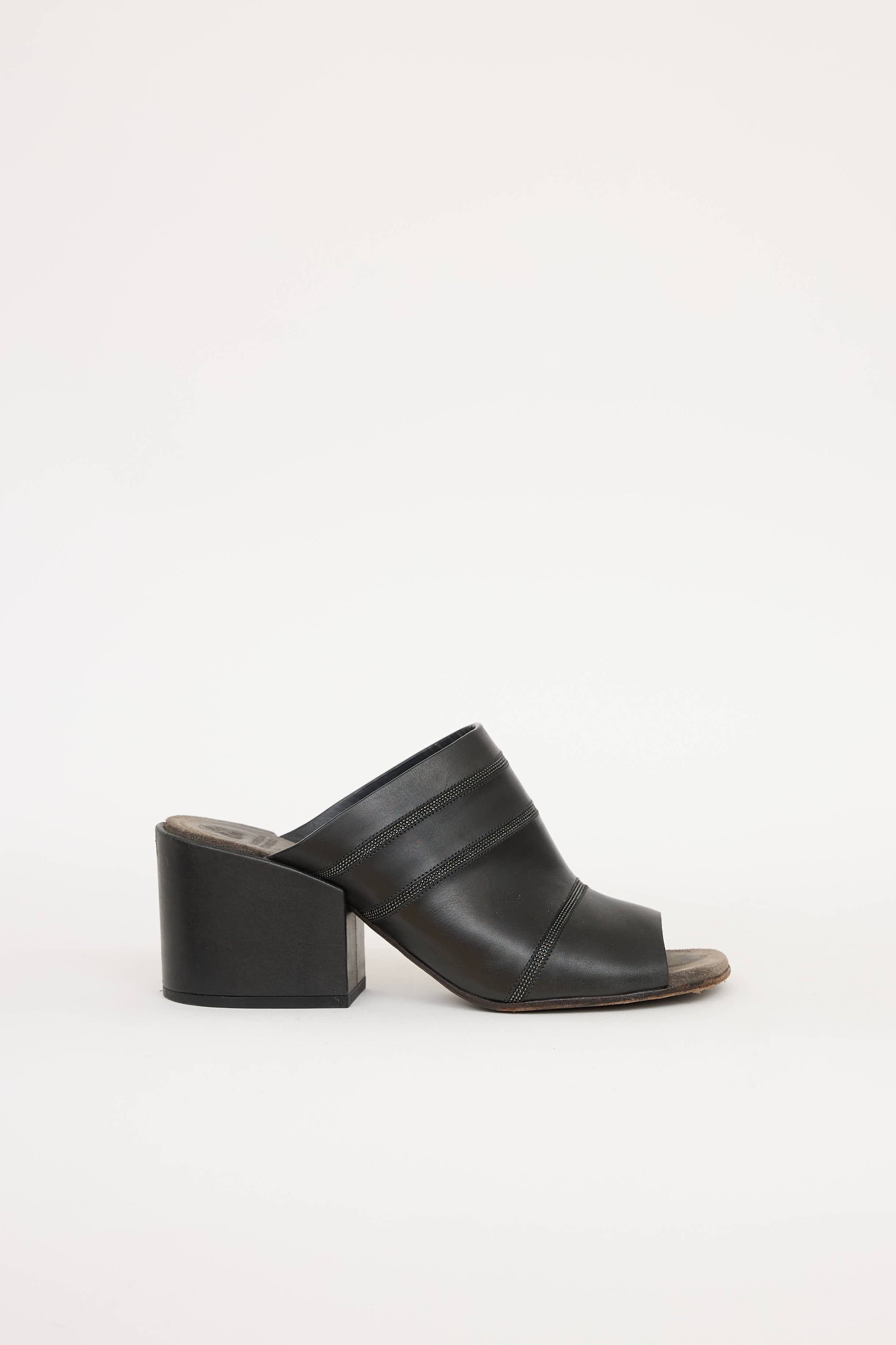 Pre-owned Brunello Cucinelli black leather Monili mule featuring square toe, strap at vamp with Monili detail, and block heel.