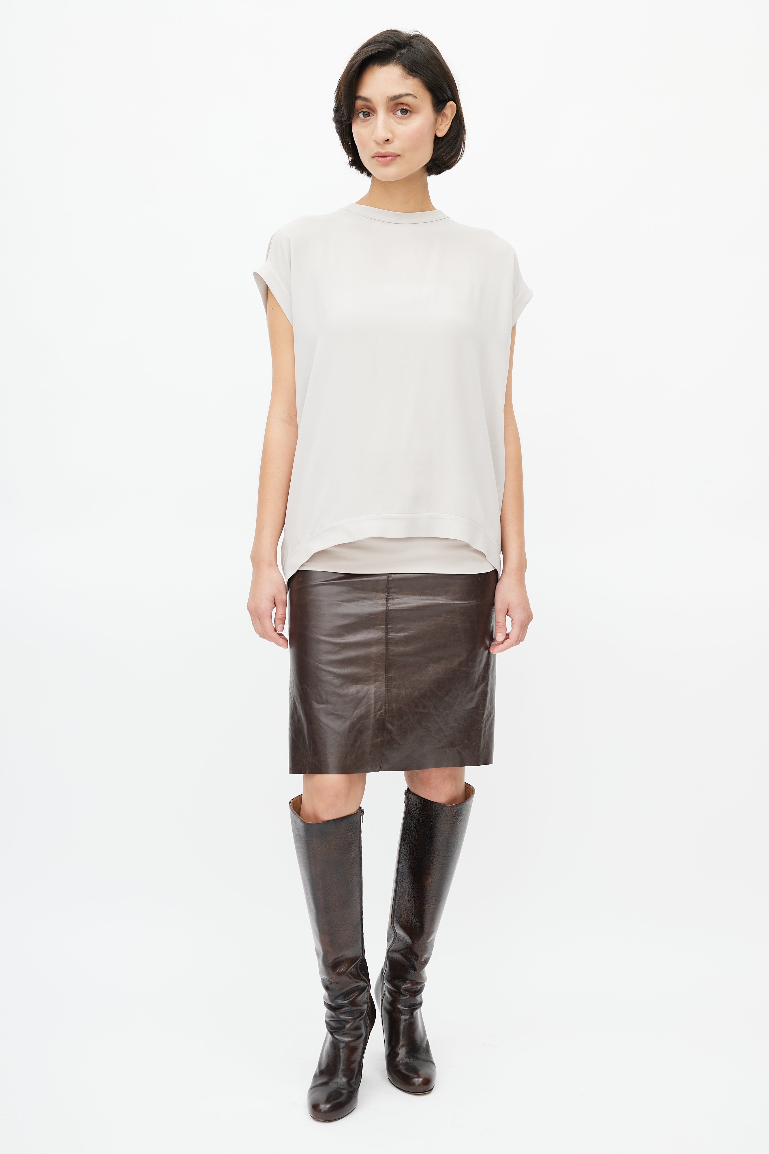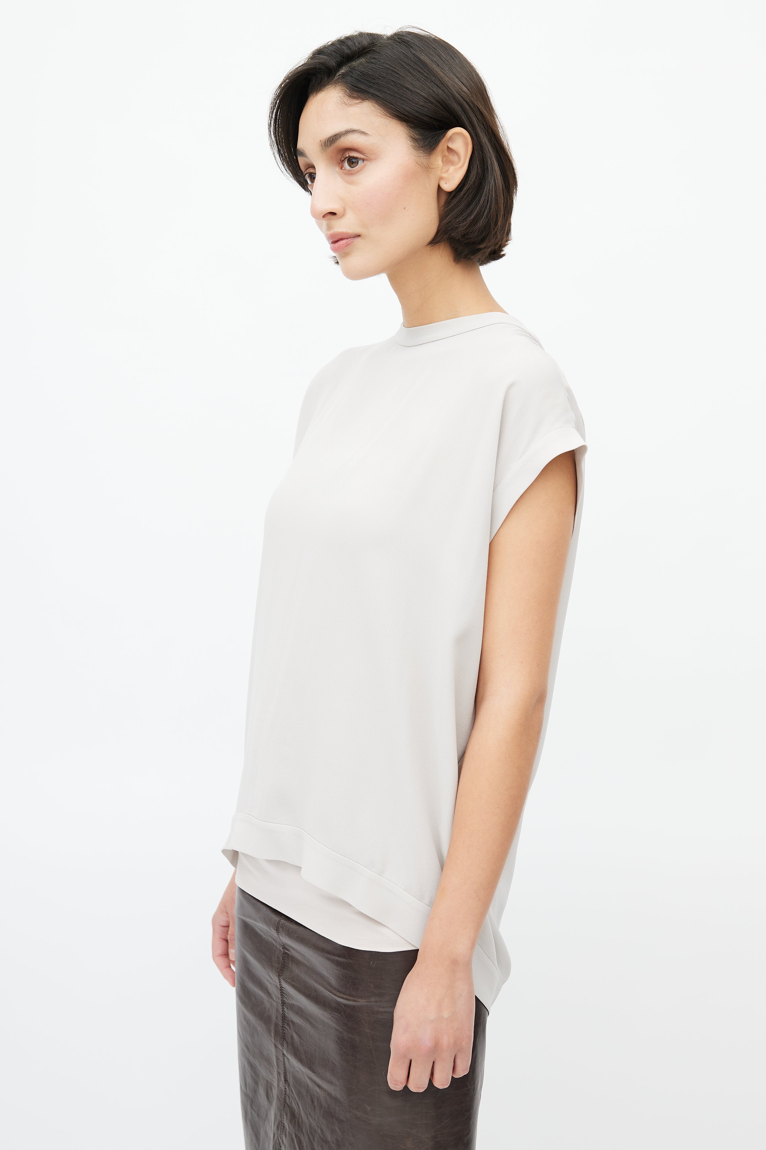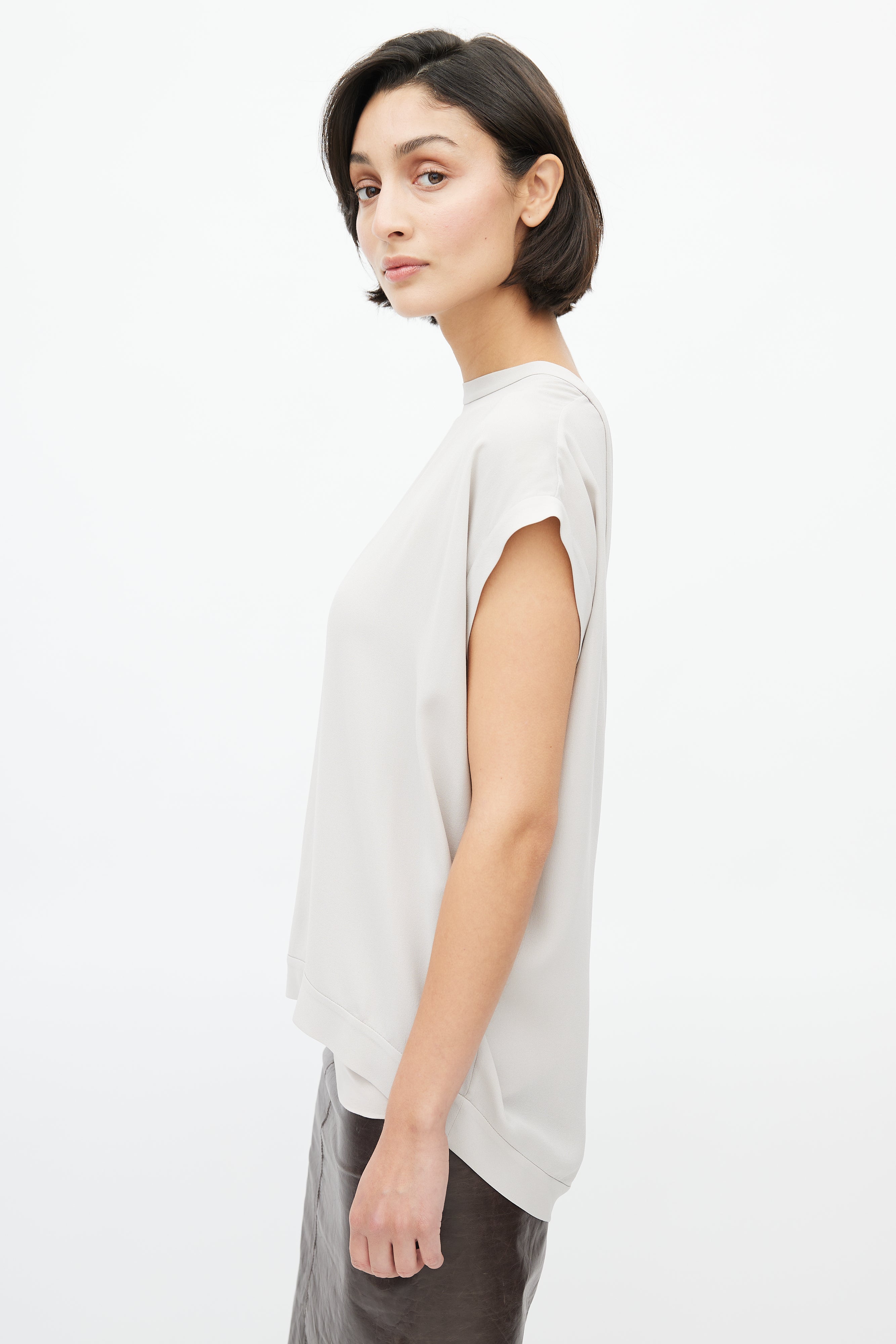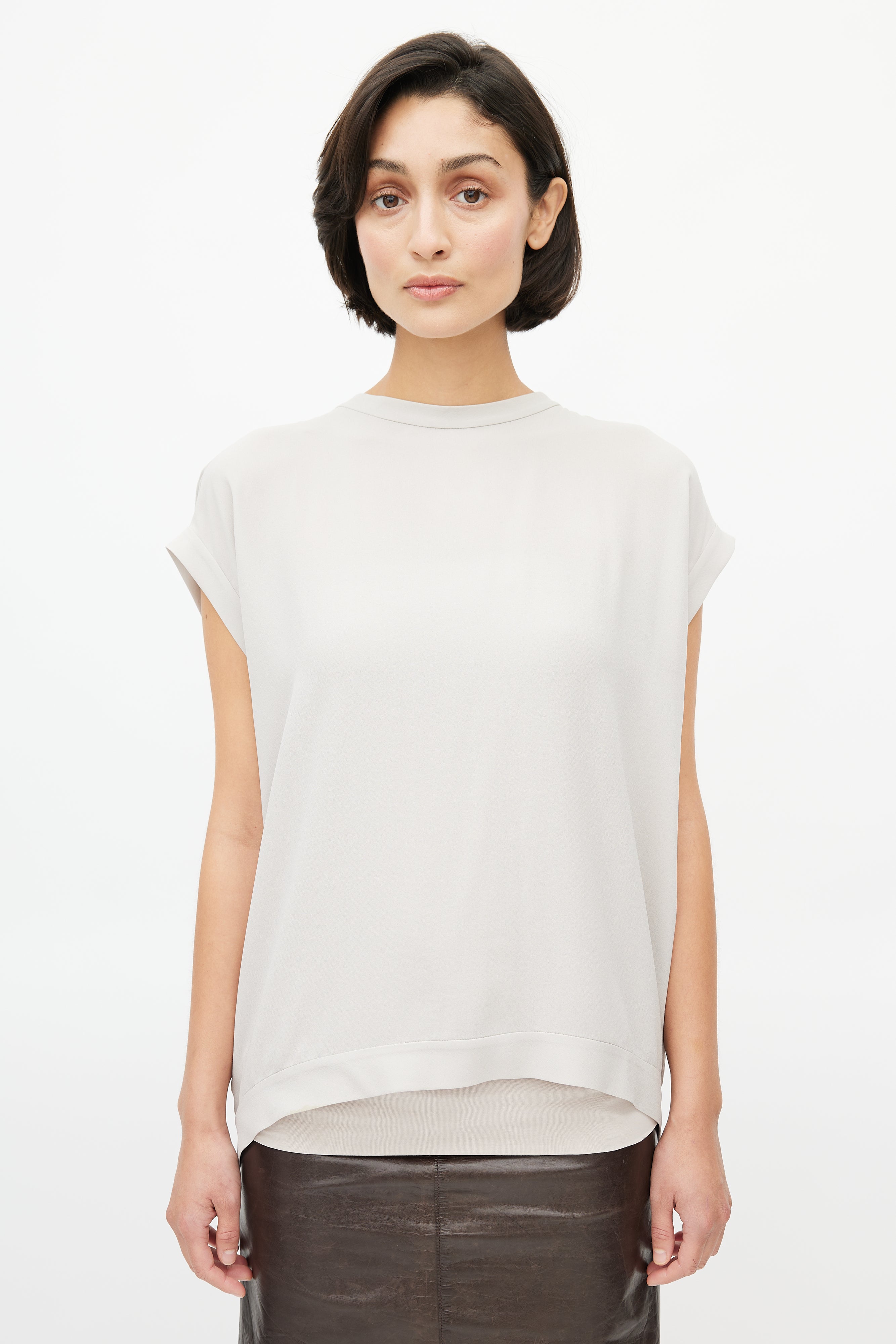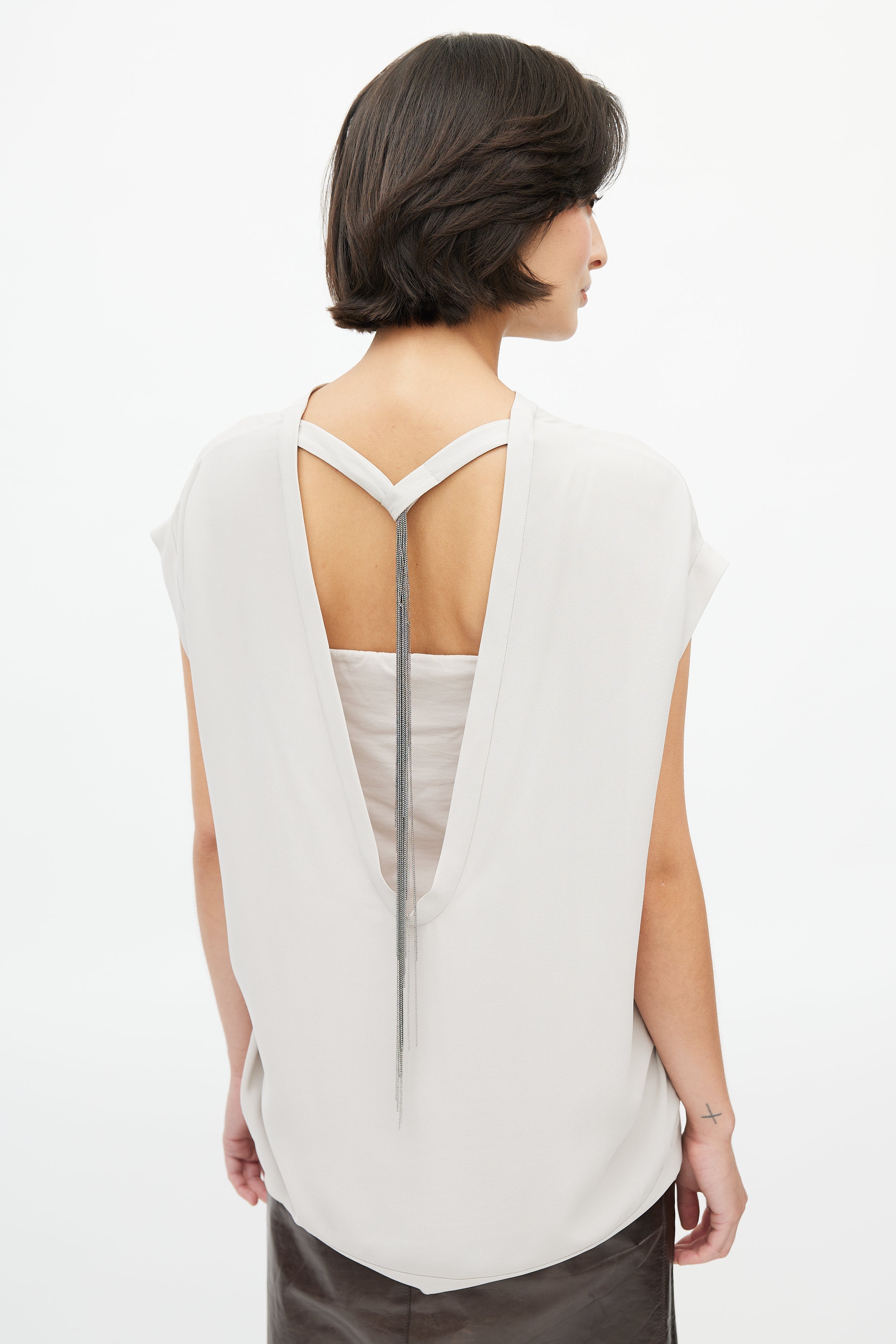 Pre-owned Brunello Cucinelli light grey top featuring crew neckline, drop shoulders, cap sleeves, plunge back with Monili tie. Comes with matching tube top.