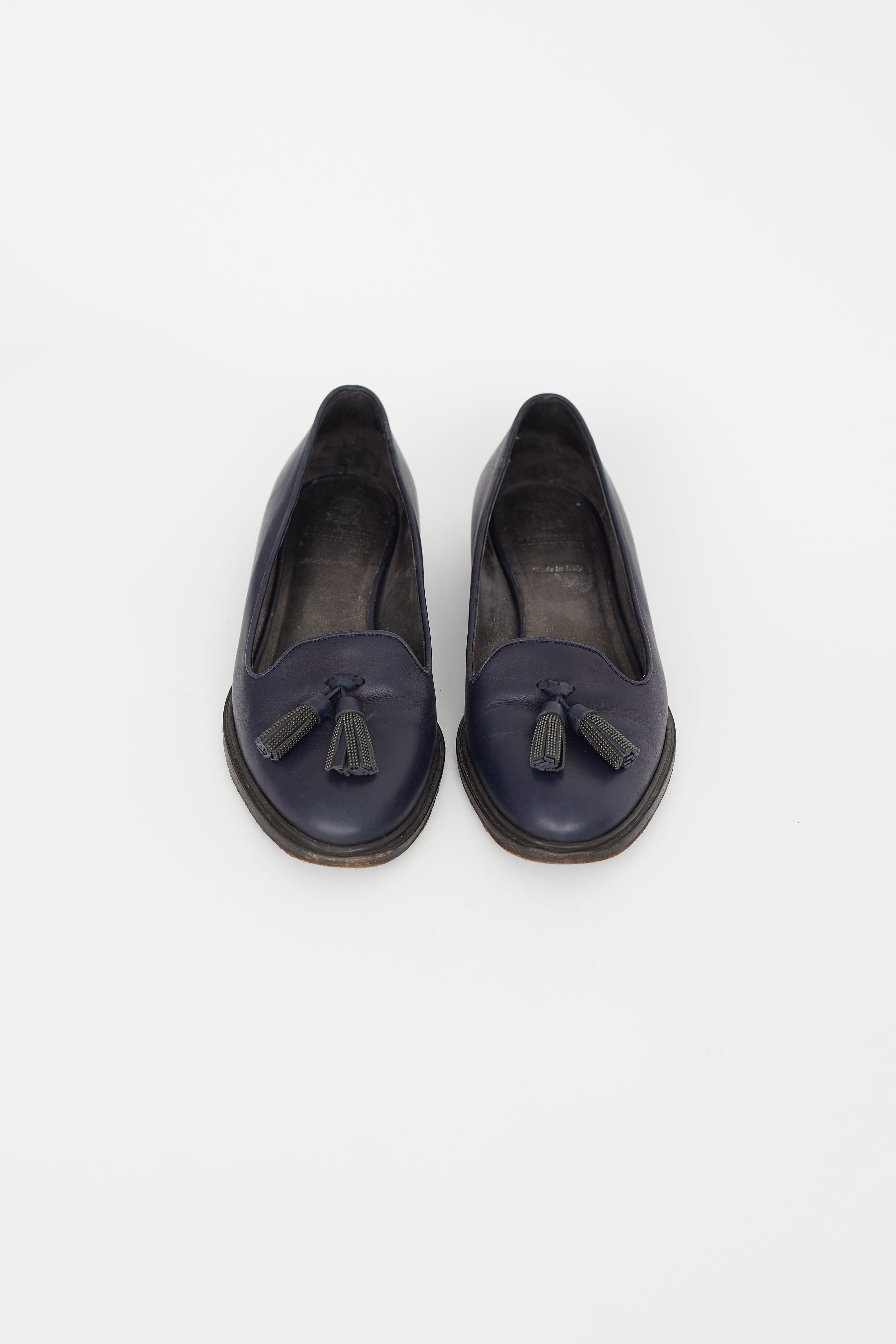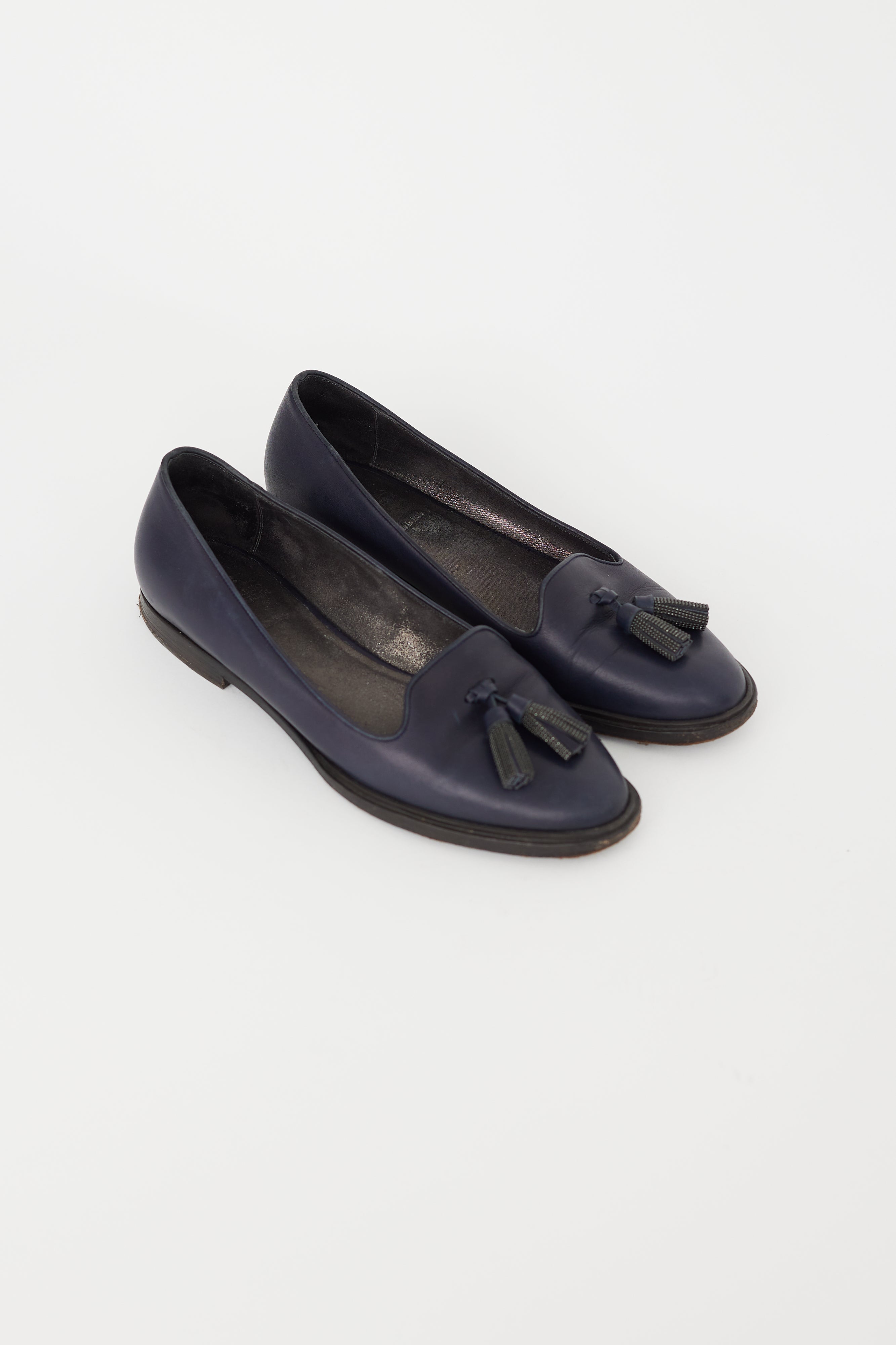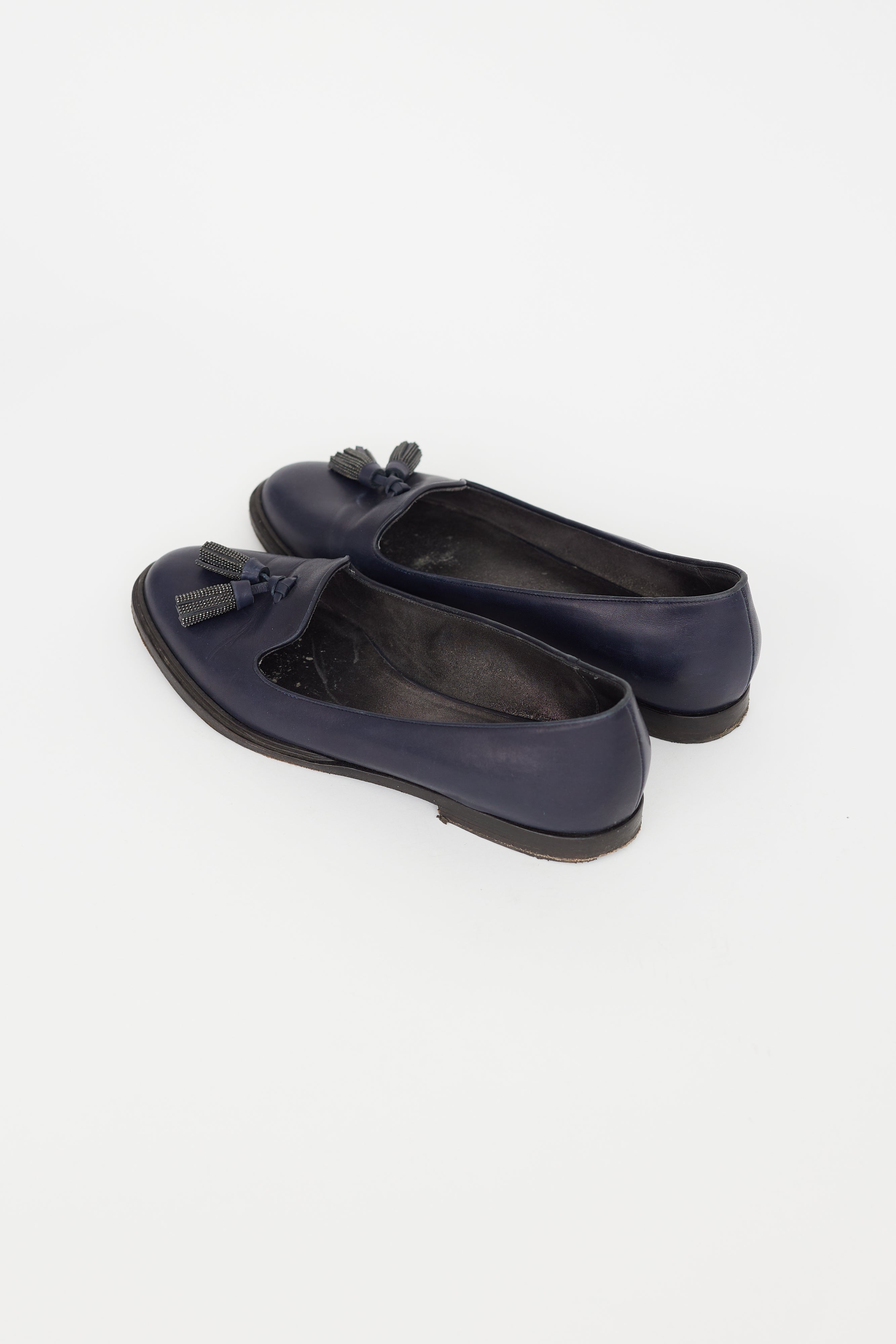 Pre-owned Brunello Cucinelli navy blue leather loafer featuring rounded toe, navy tassels at vamp, Monili beads embellishment, stacked heel, and leather insole.