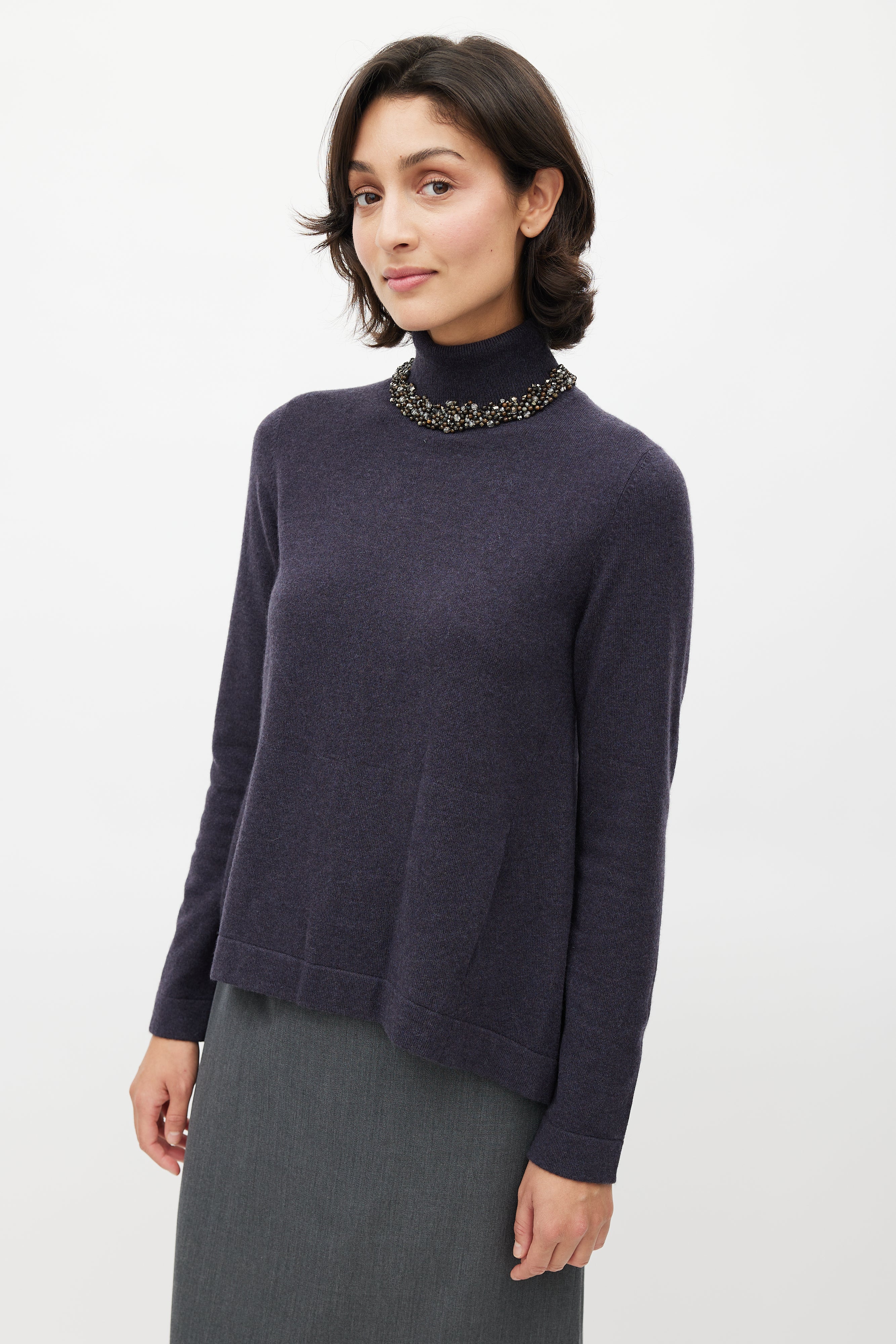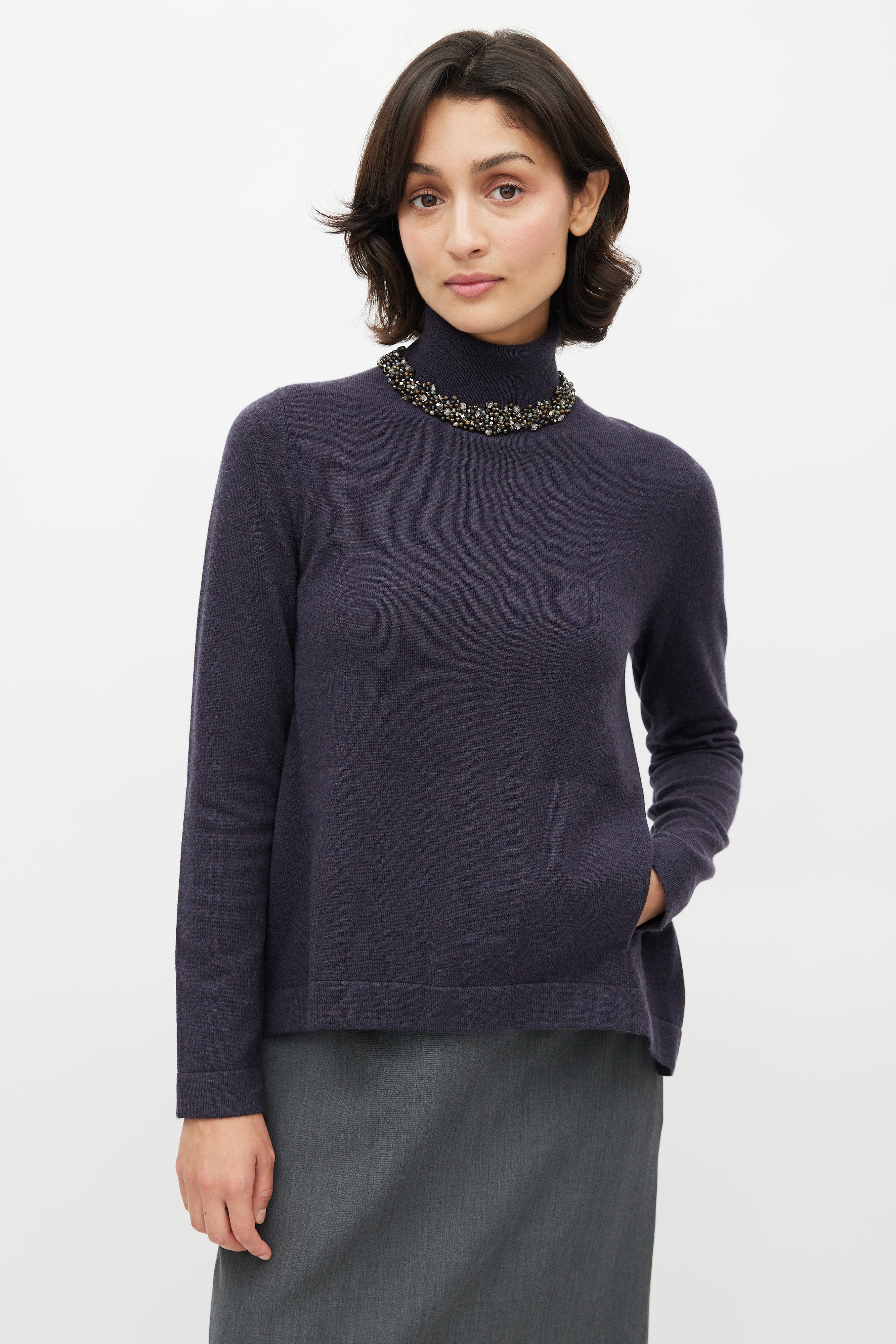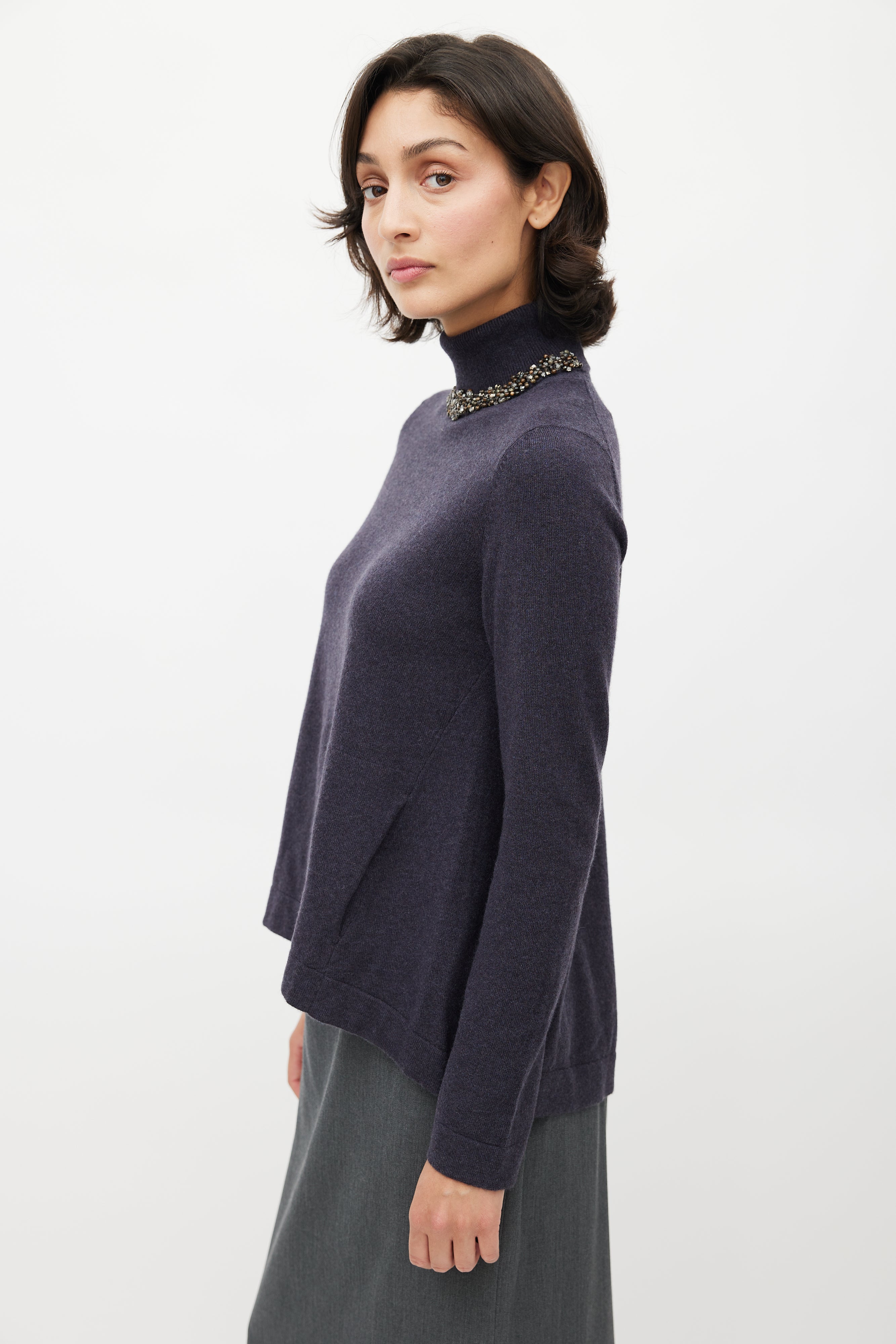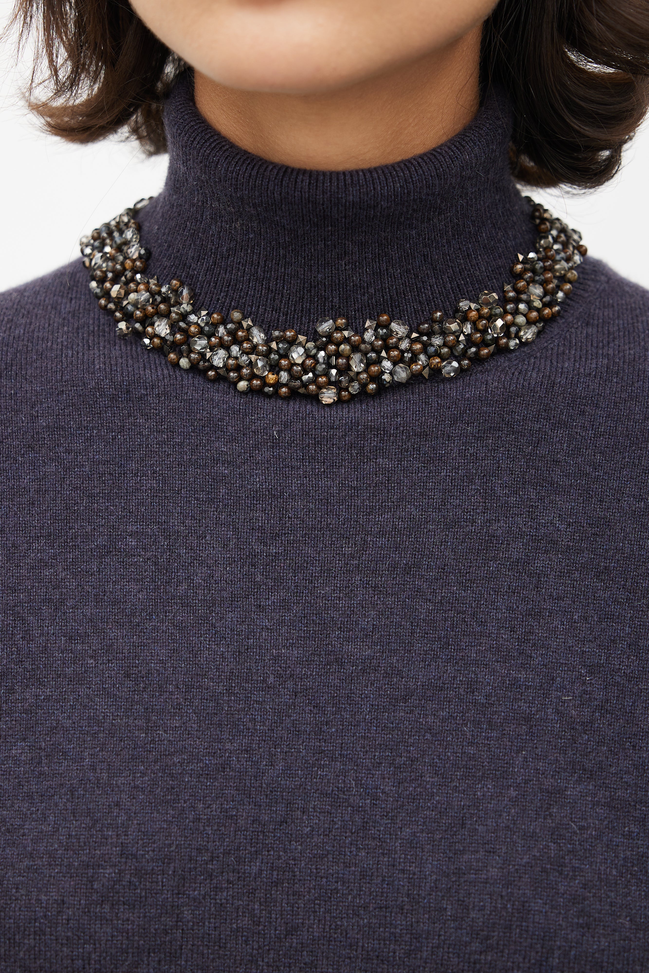 Brunello Cucinelli navy cashmere sweater featuring a turtleneck with jewel embellishment, long sleeves, and kangaroo pocket at front.