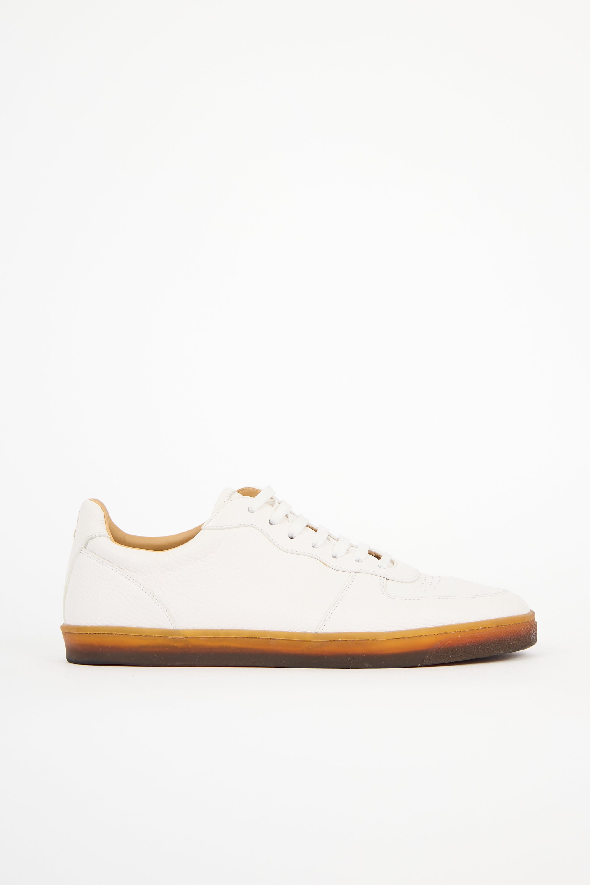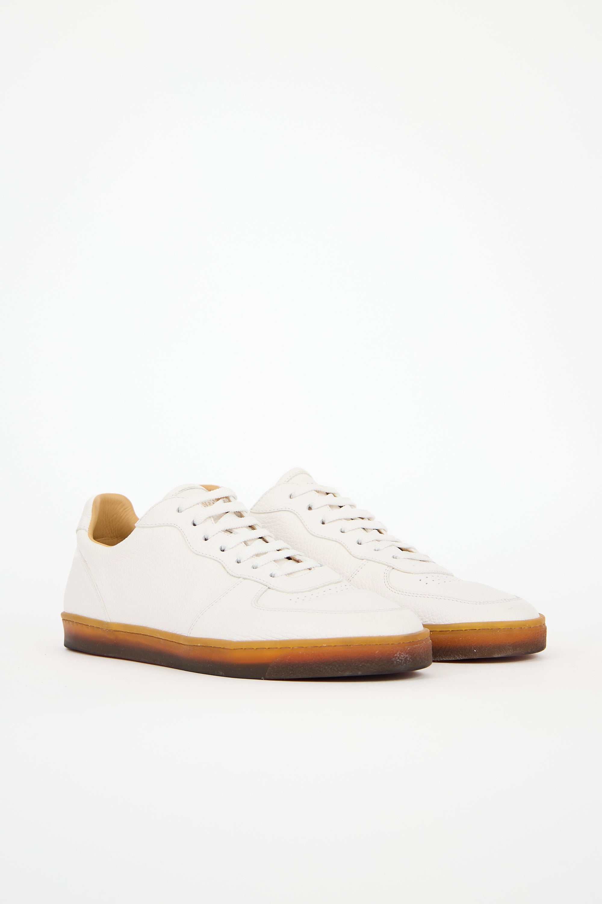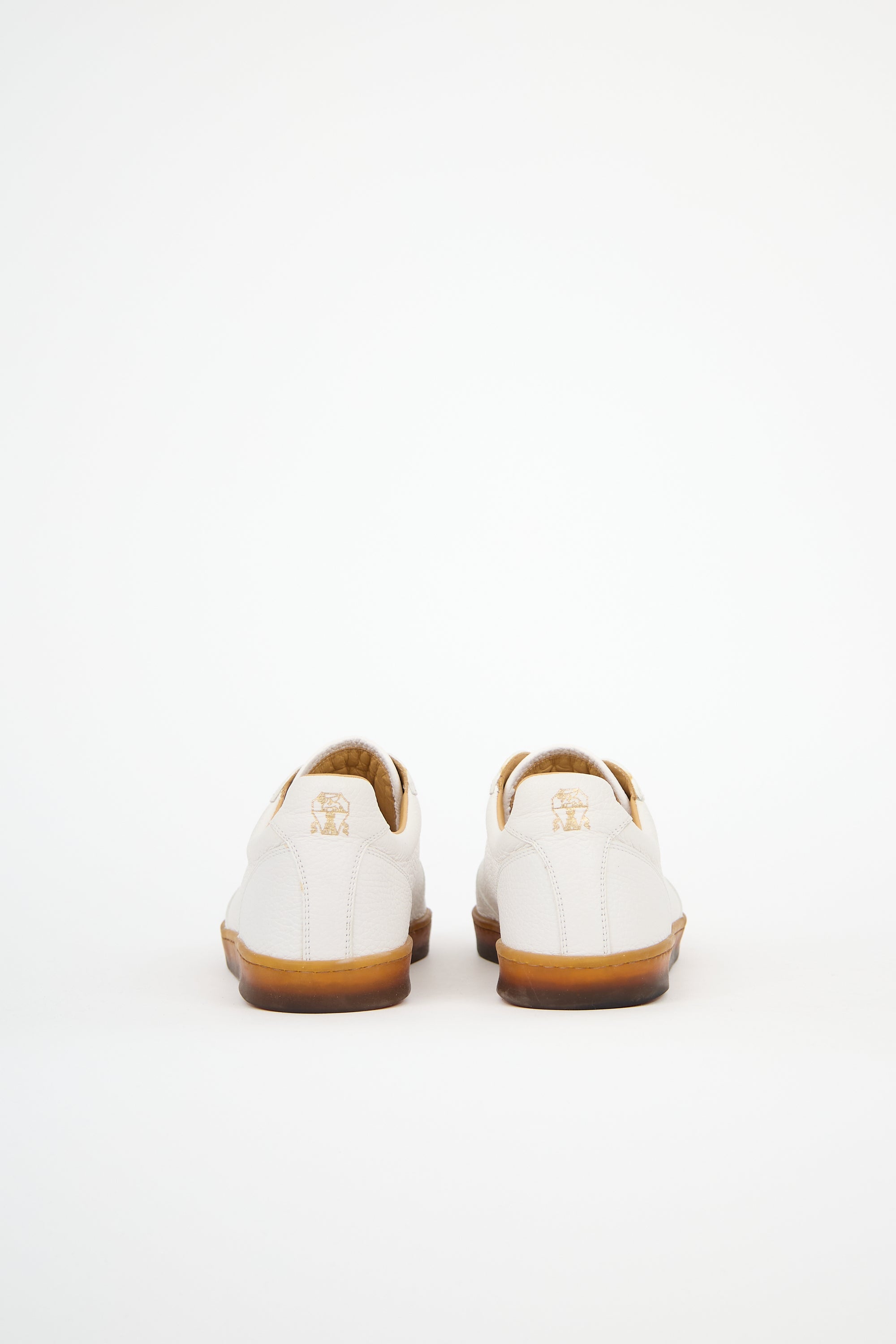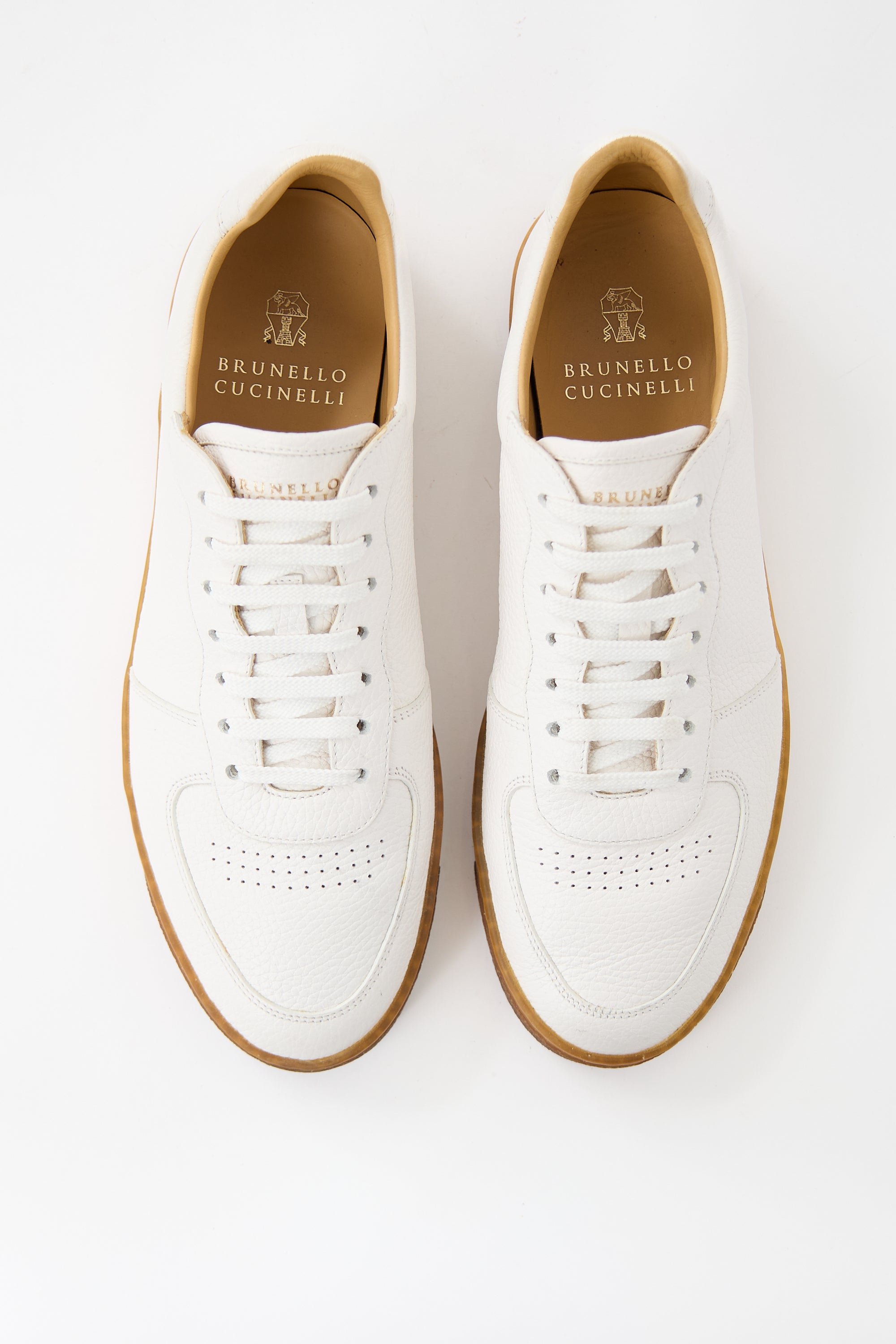 Pre-owned Brunello Cucinelli white pebbled leather sneakers featuring rounded toe, lace up front, stamped logo at tongue and counter, and crepe rubber sole.
