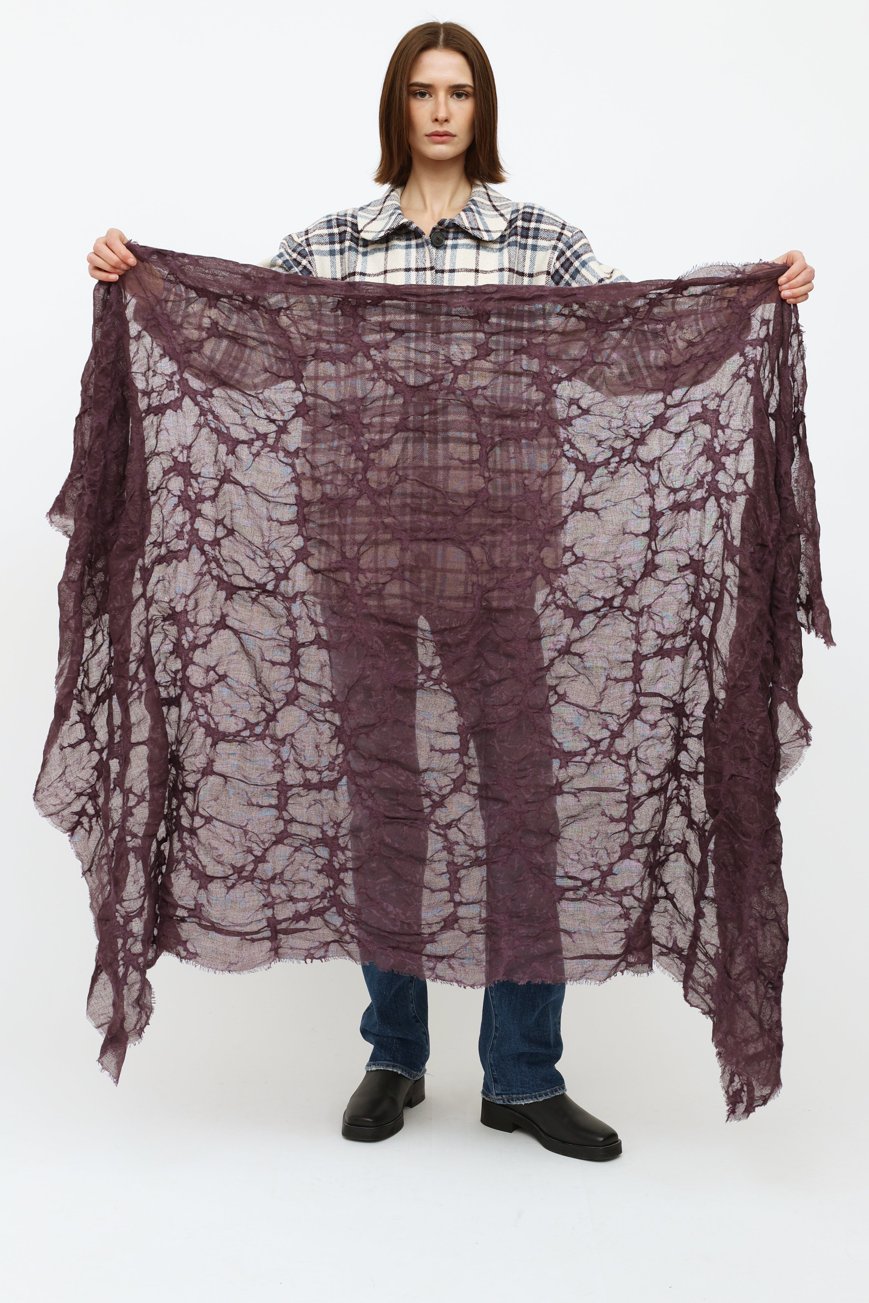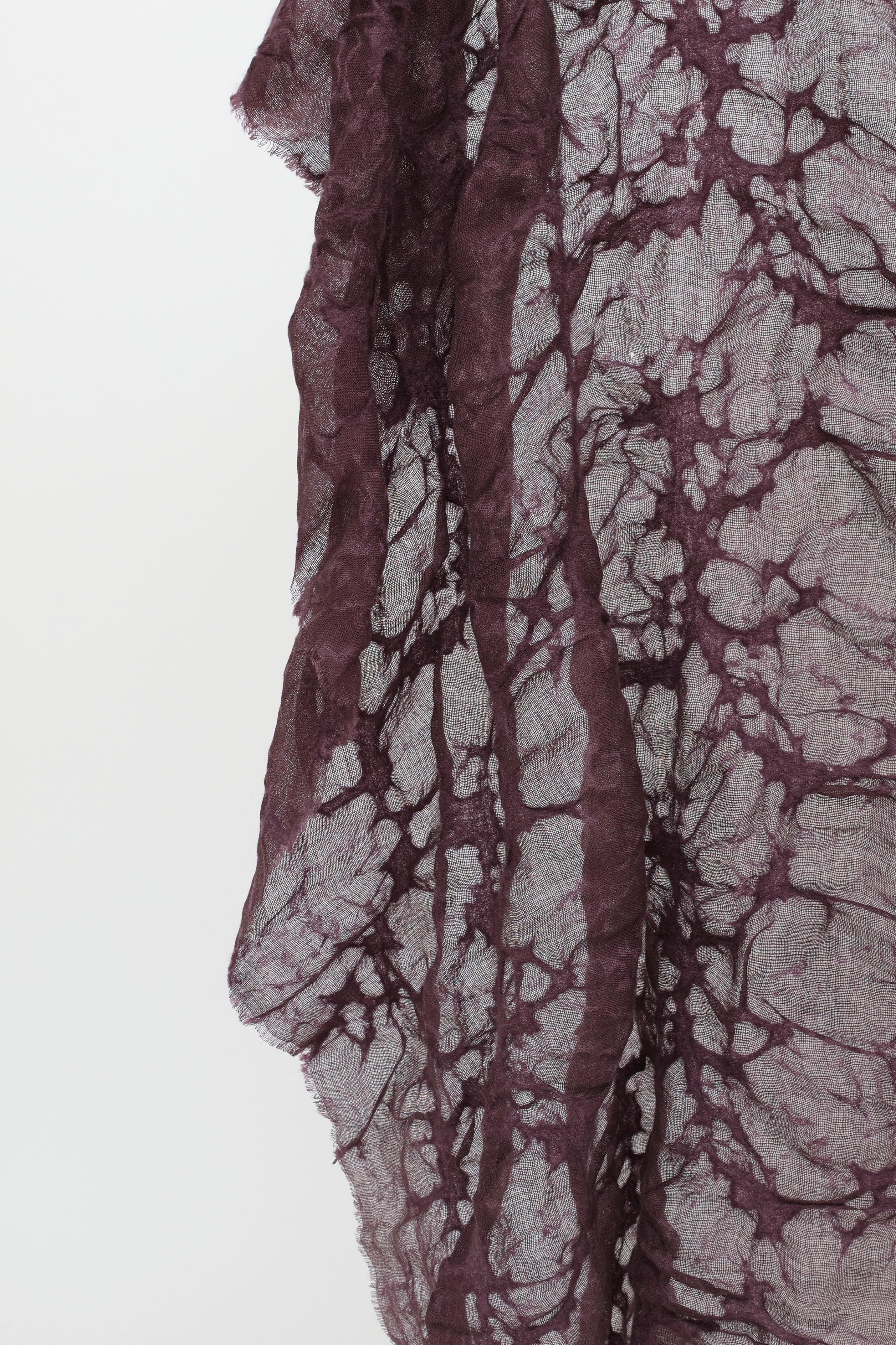 Pre-owned Brunello Cucinelli purple cashmere scarf featuring a raw hemline, cashmere texturing throughout, and embroidered logo patch at hemline.