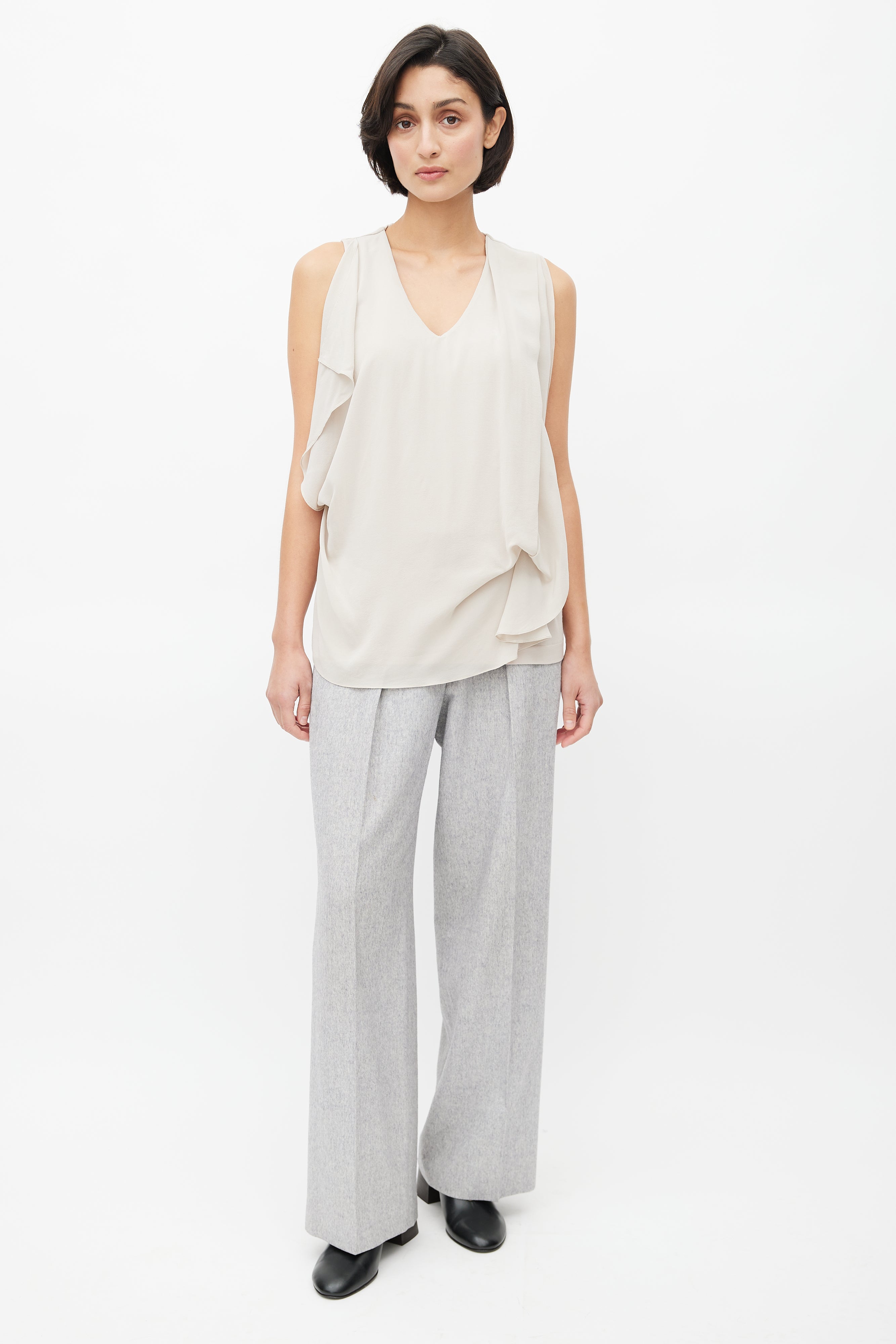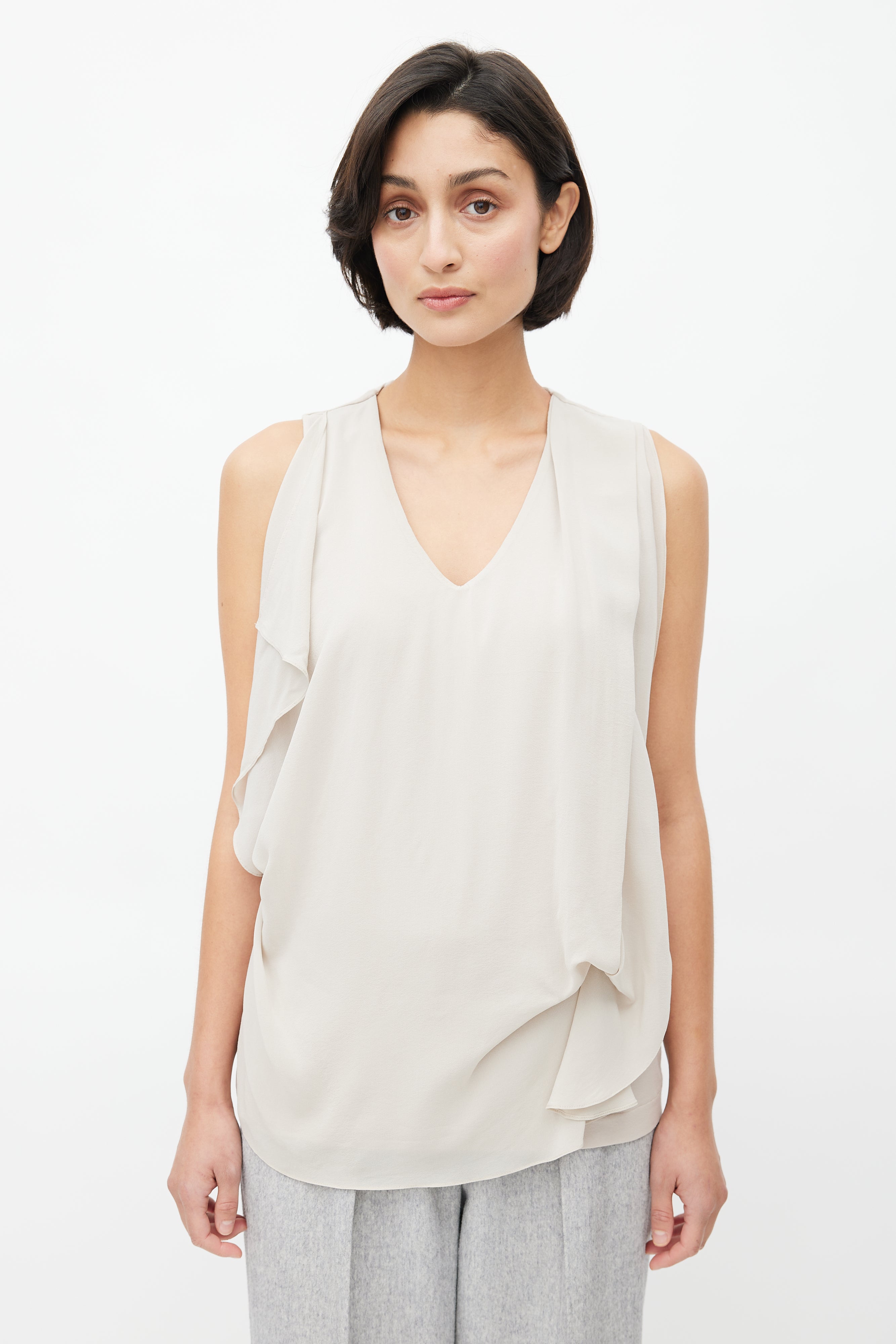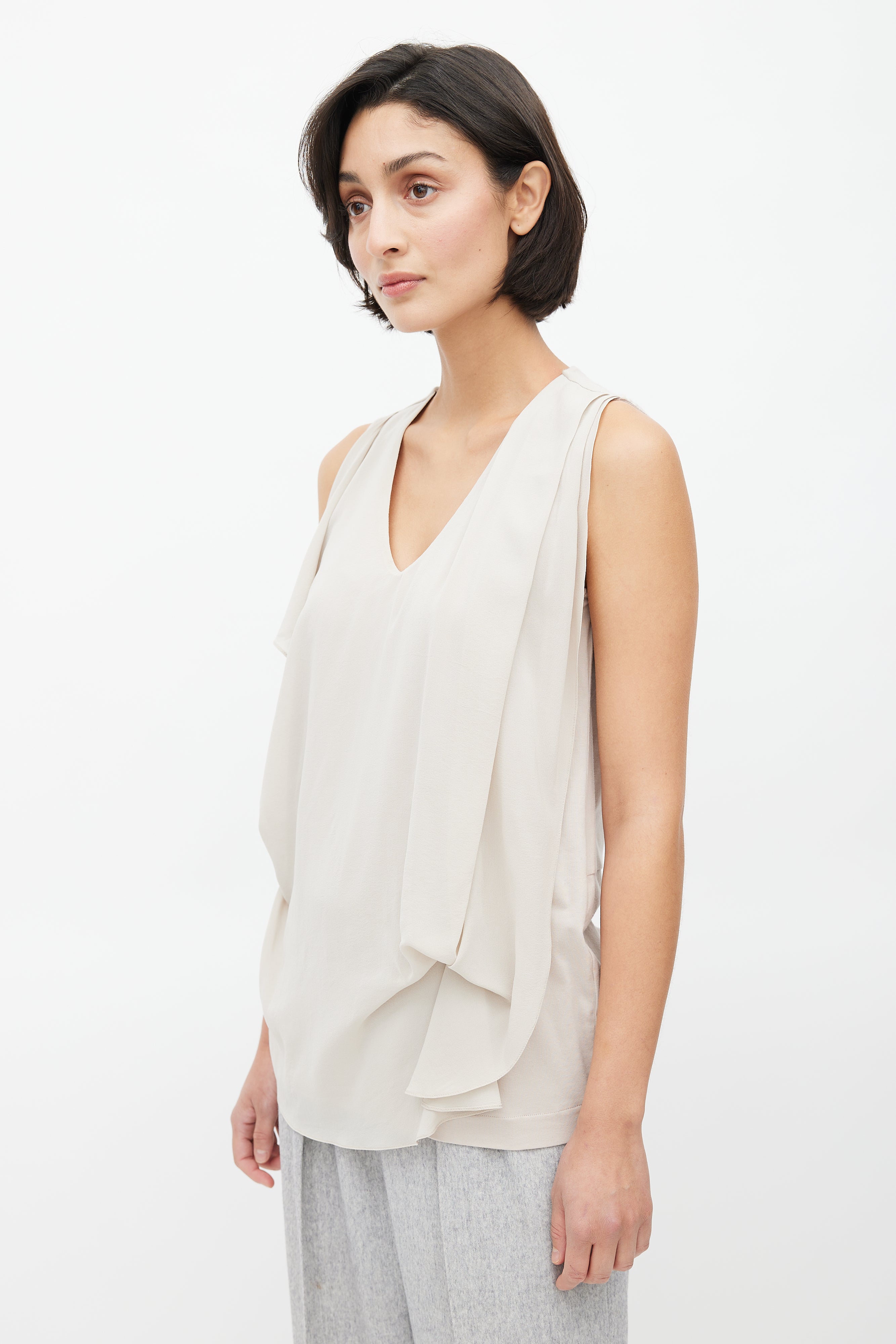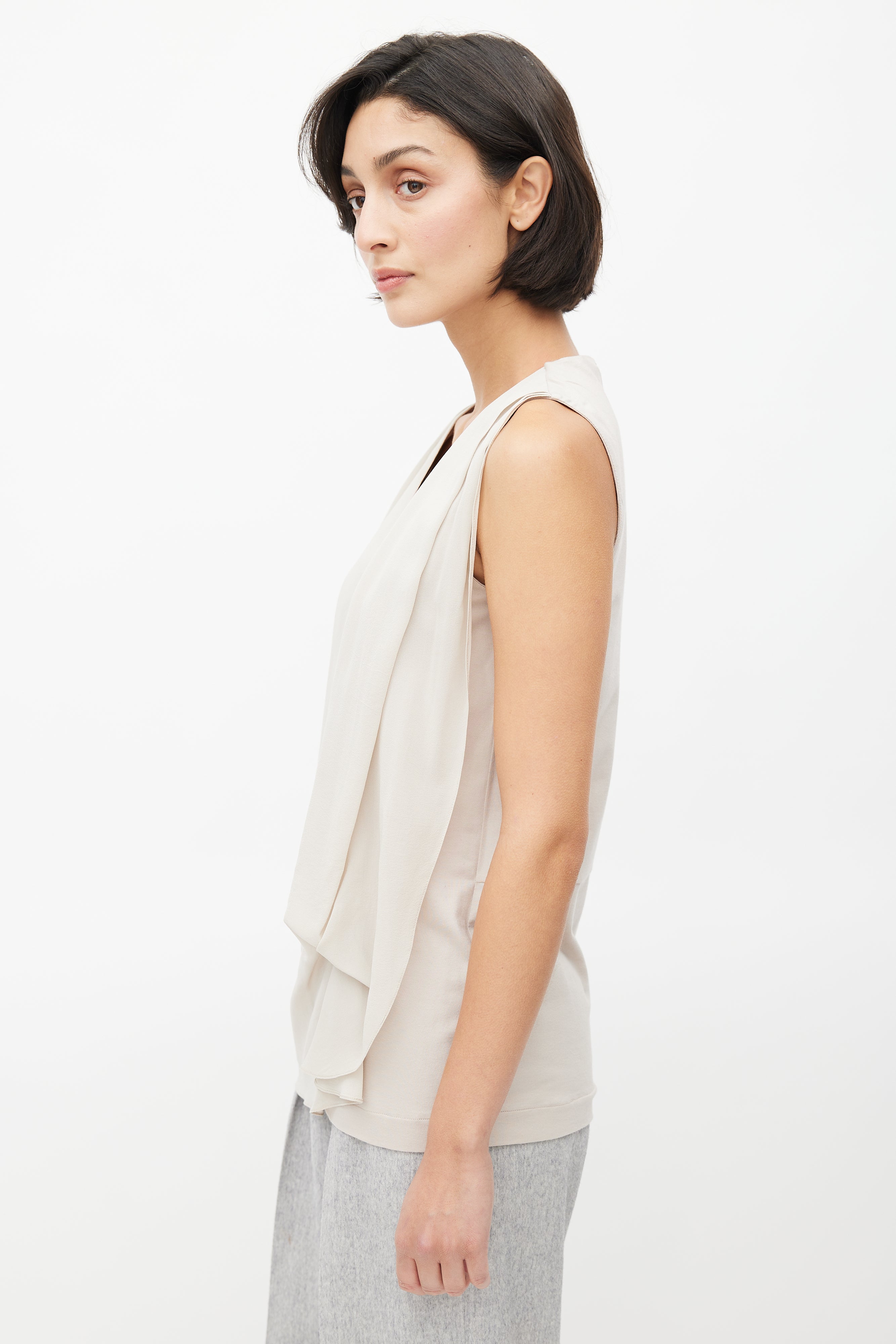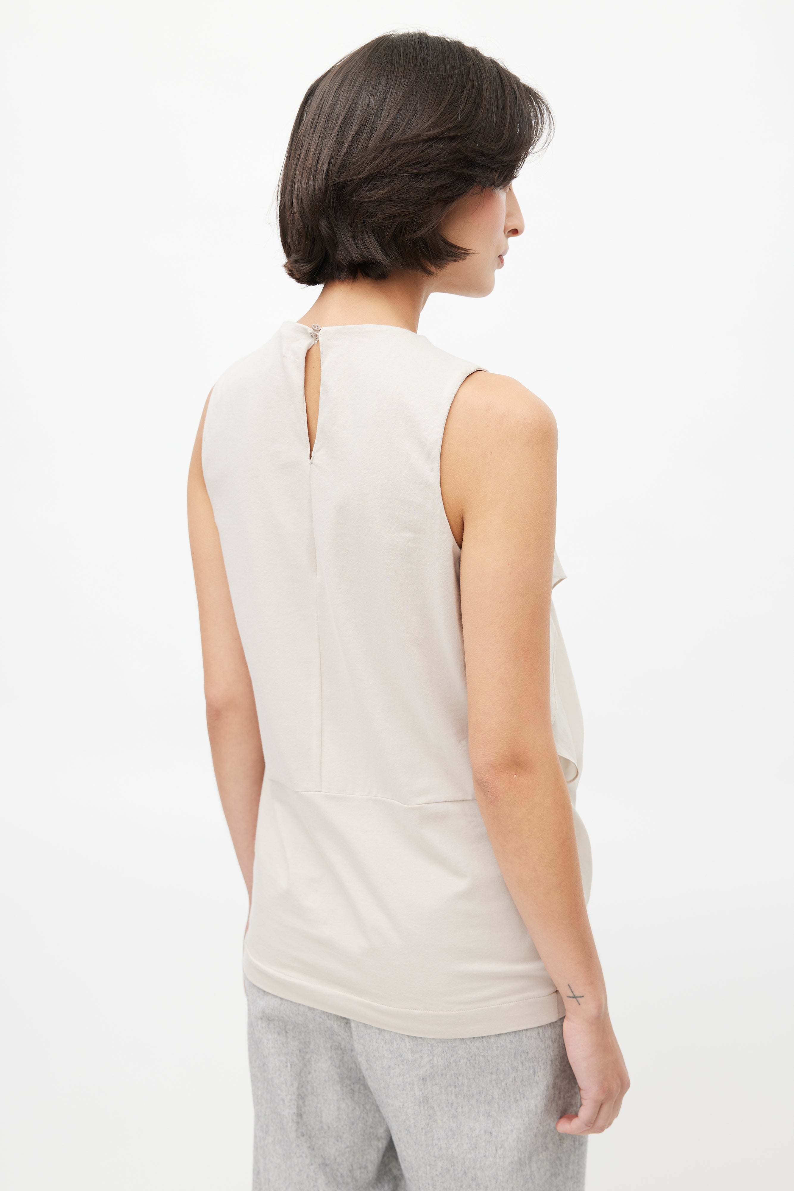 Pre-owned Brunello Cucinelli taupe blouse featuring V-neckline, draping at front, knit back, and keyhole back with button fastening.