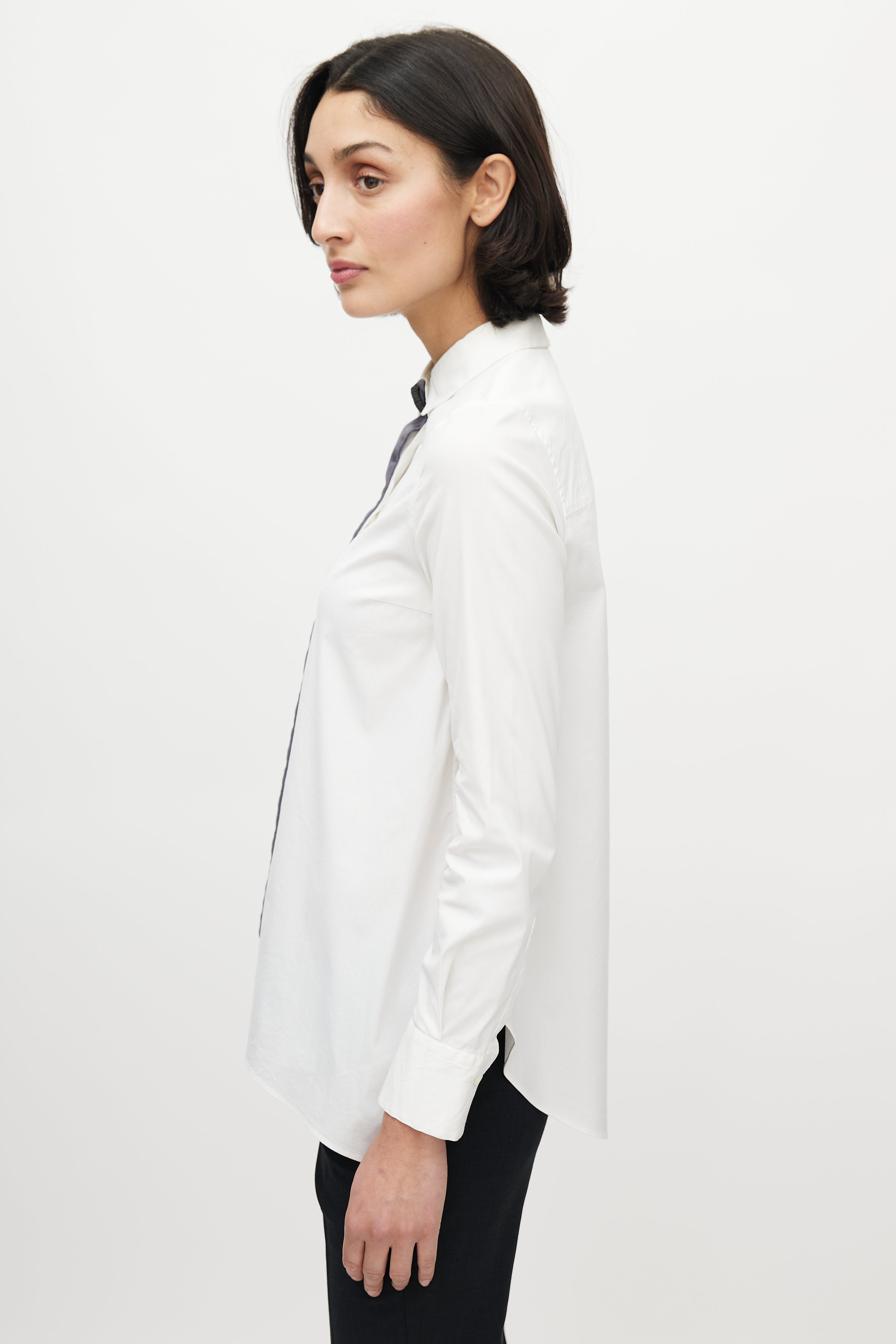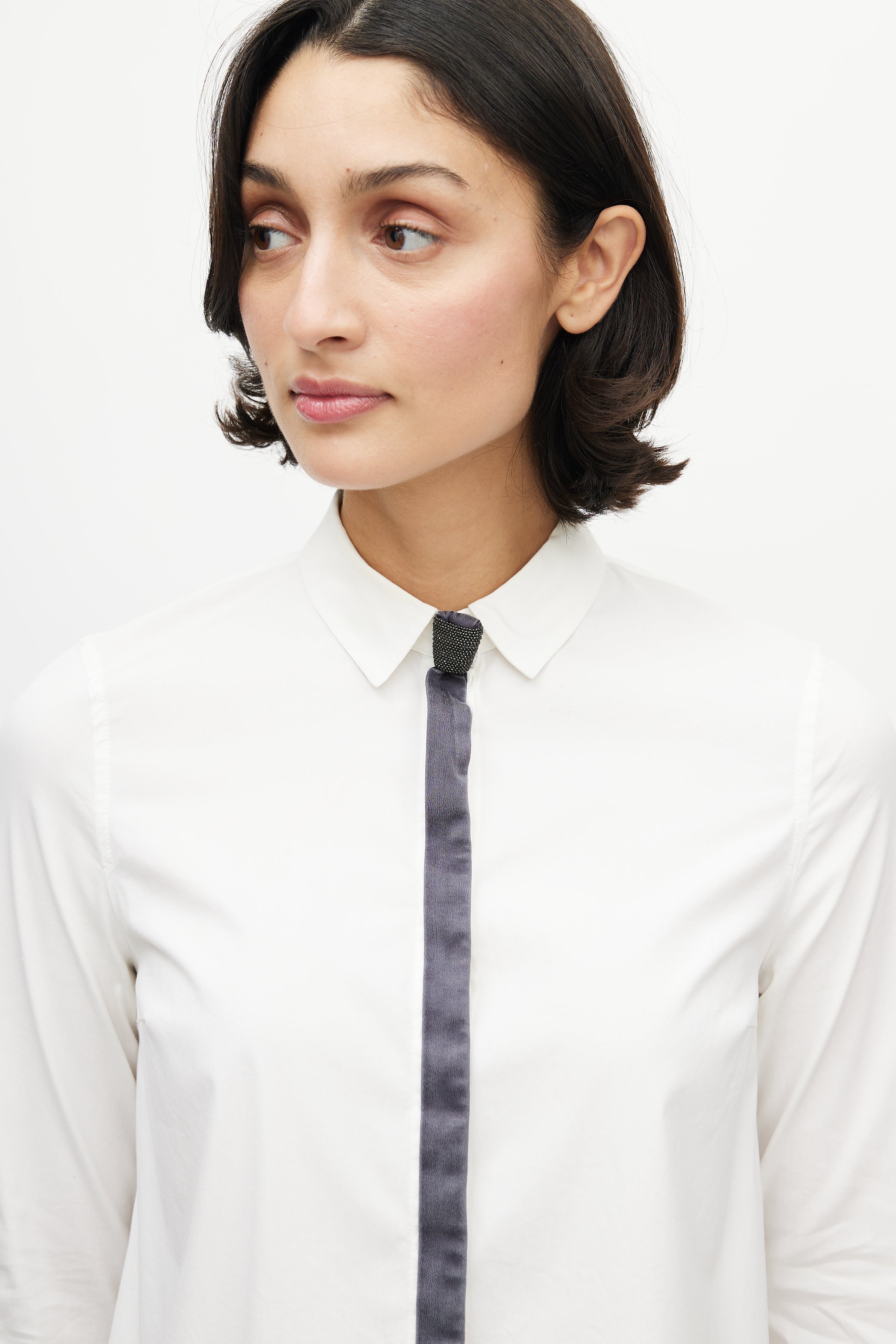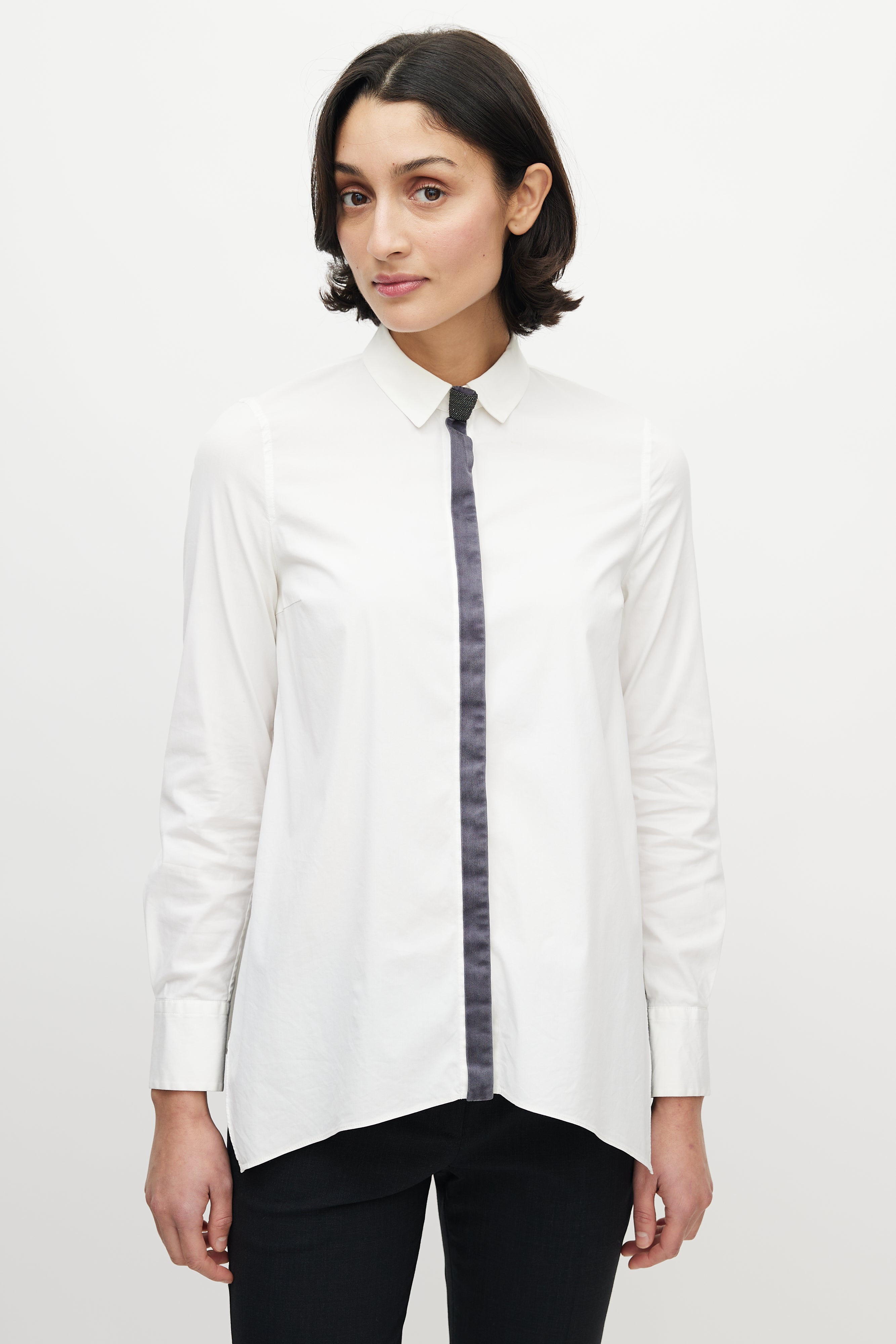 Pre-owned Brunello Cucinelli white shirt featuring a grey monili bead tie trim at front, pointed collar, long sleeves with buttoned cuffs, and button up closure.