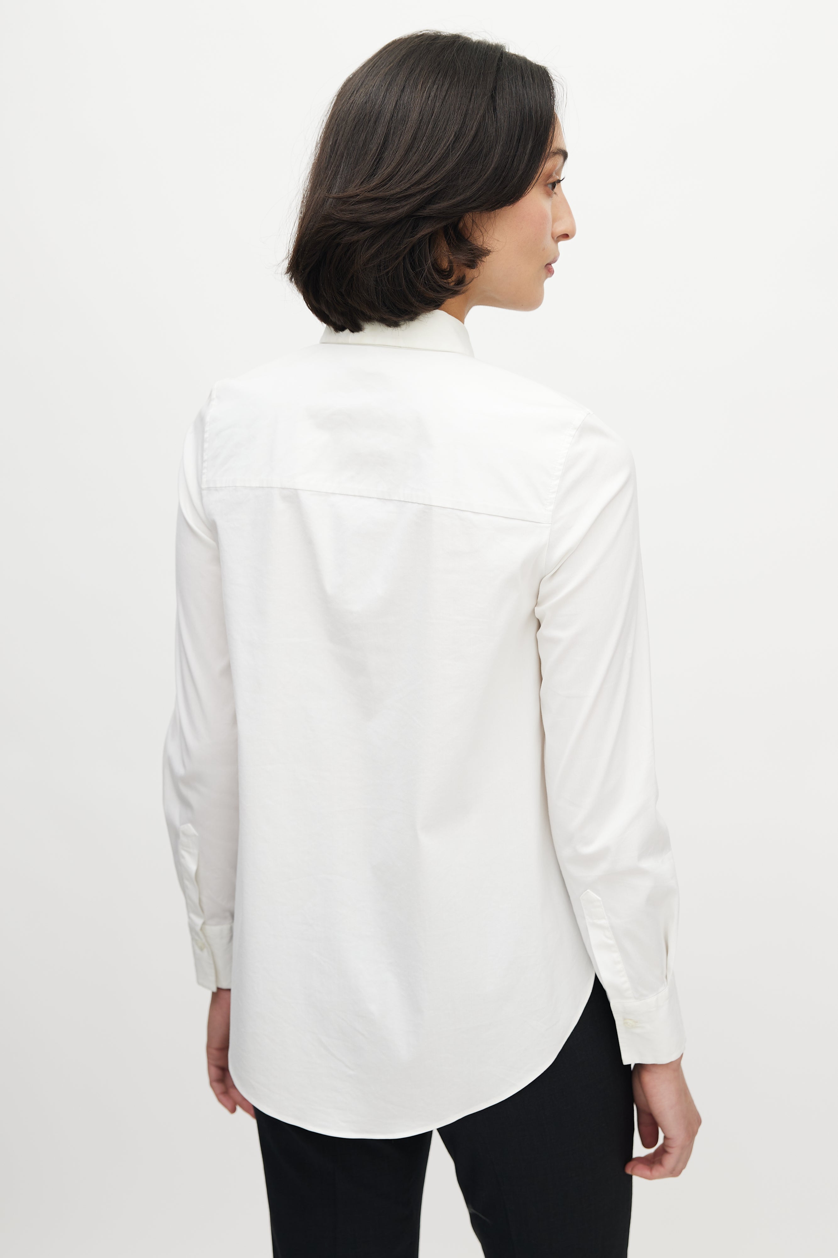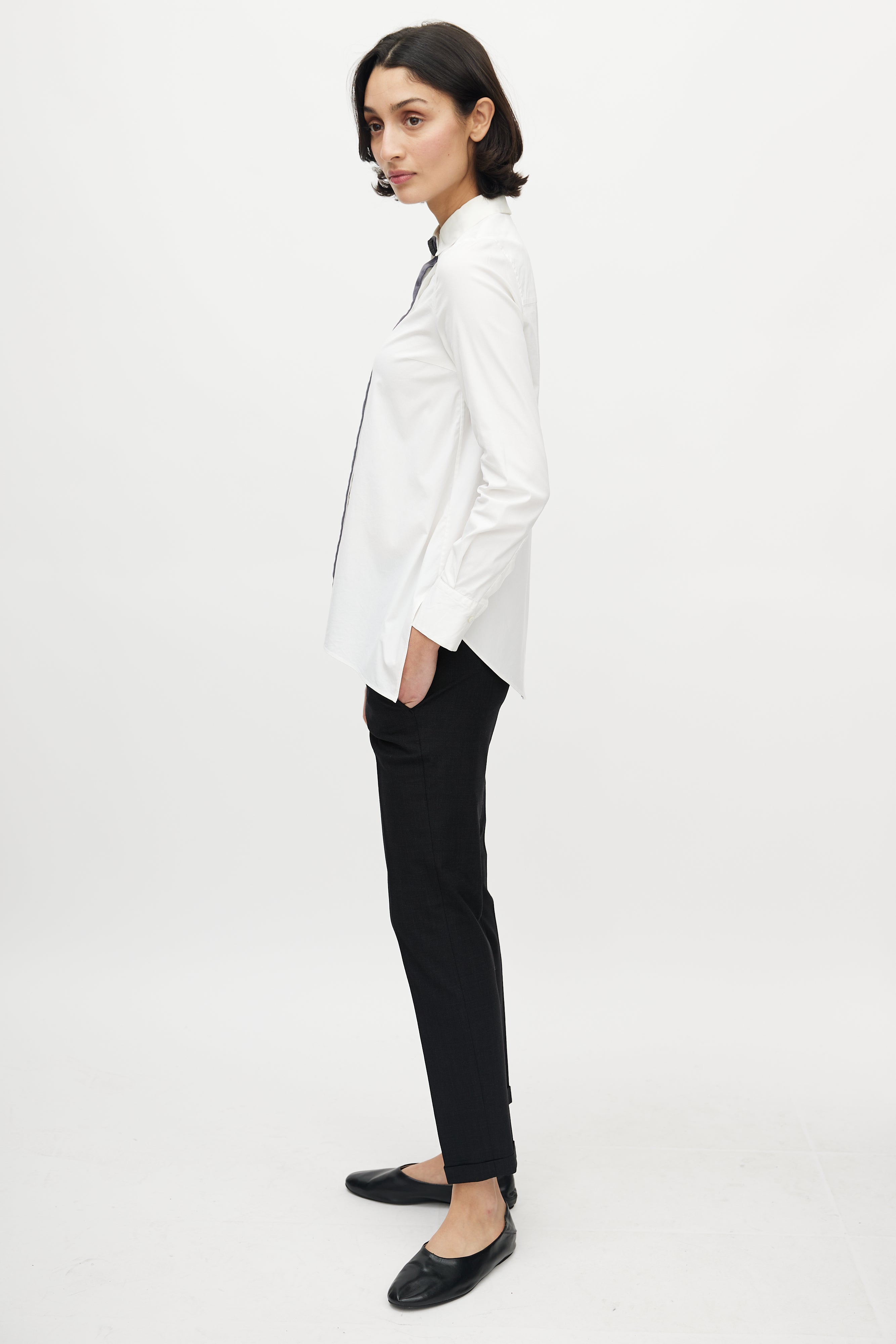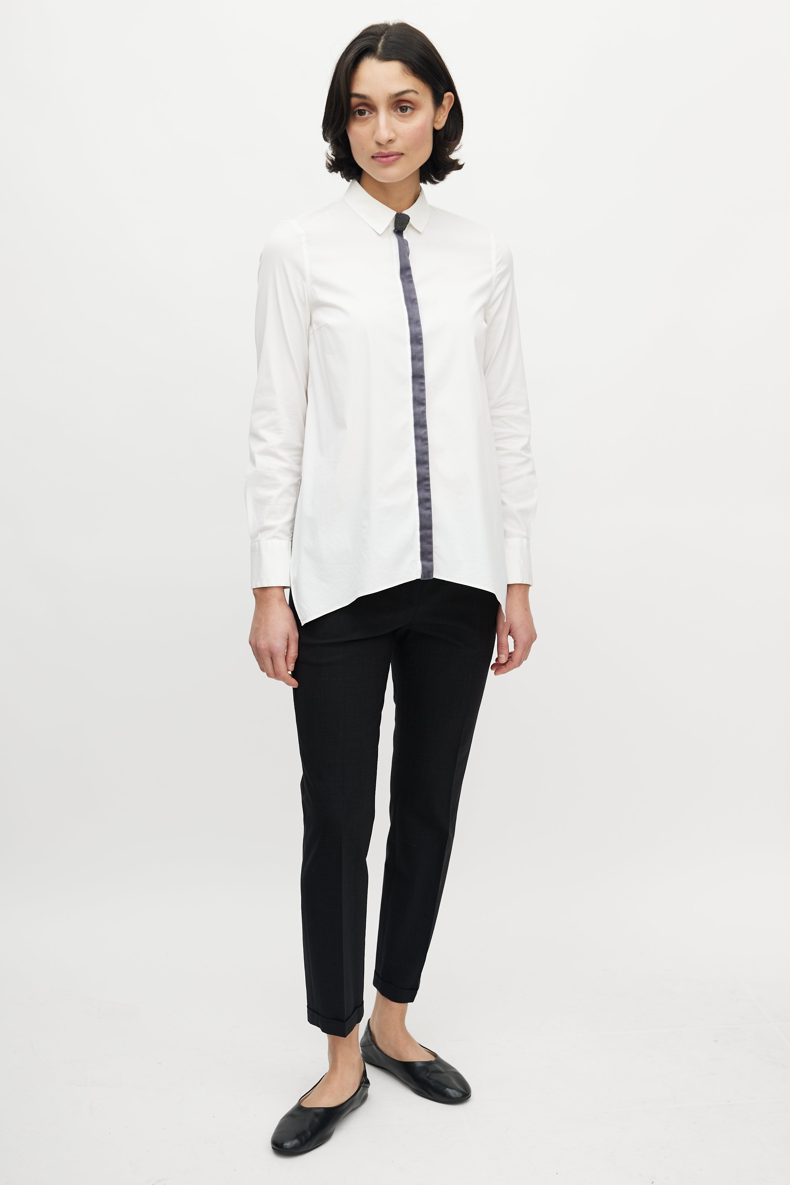 Pre-owned Brunello Cucinelli white shirt featuring a grey monili bead tie trim at front, pointed collar, long sleeves with buttoned cuffs, and button up closure.