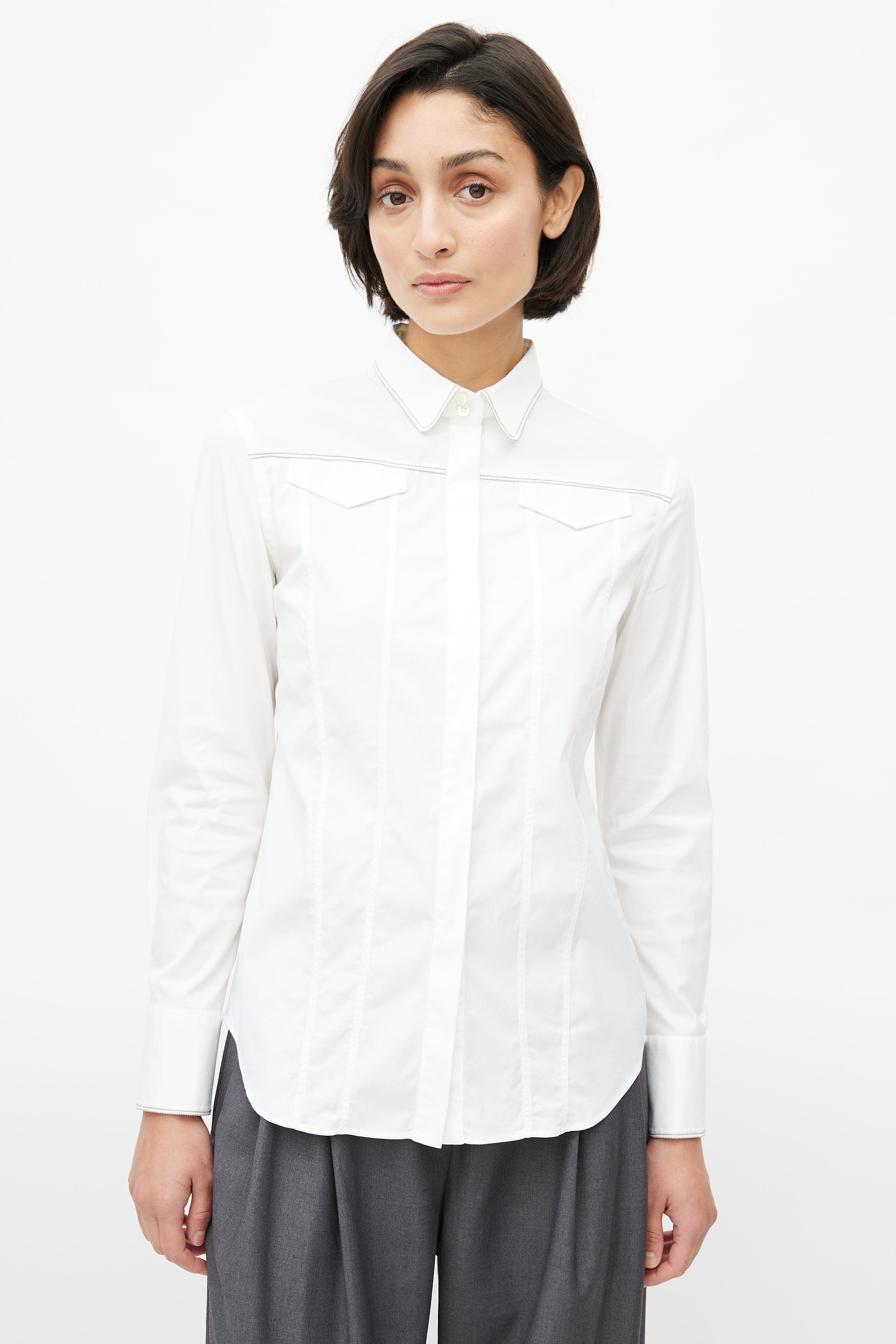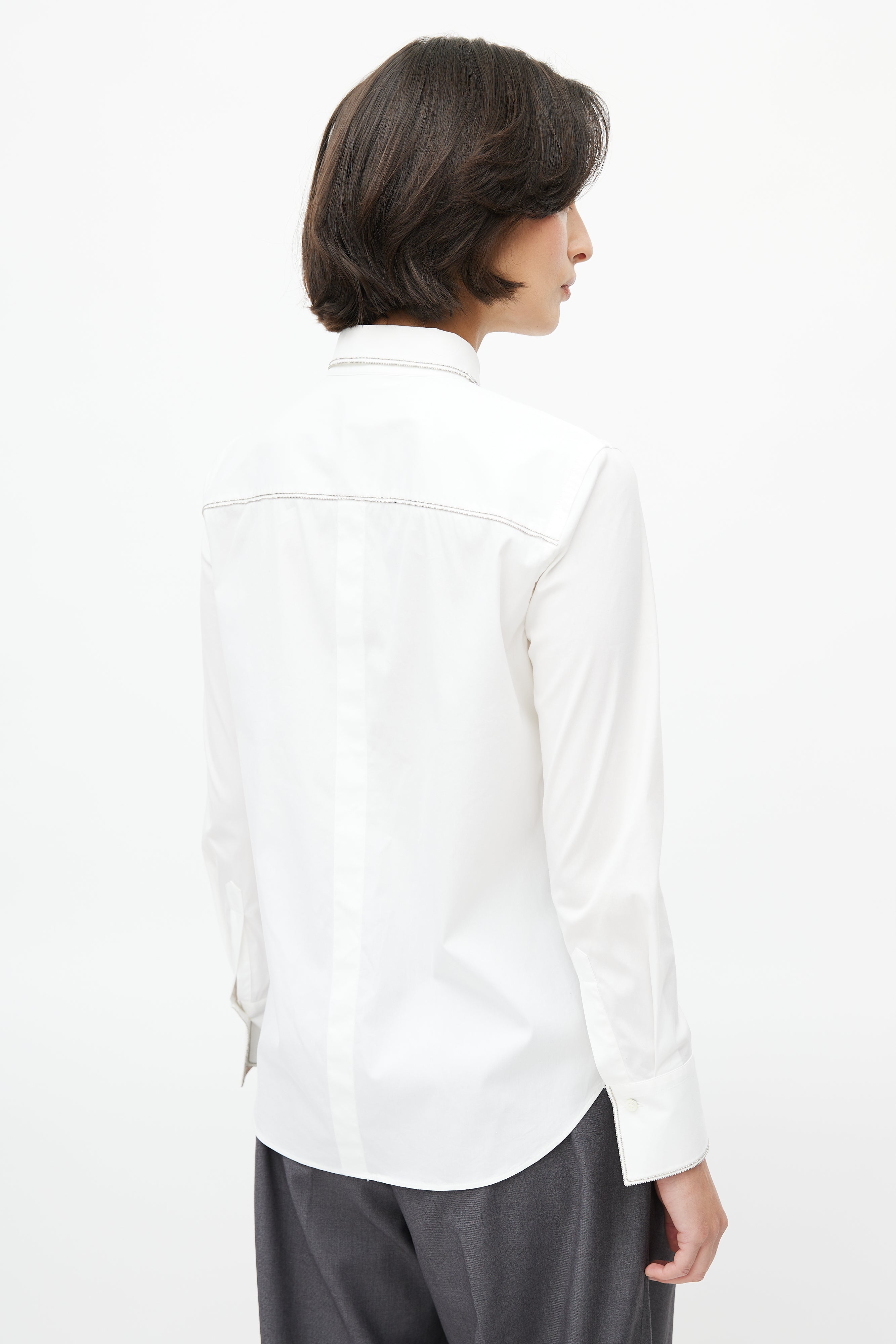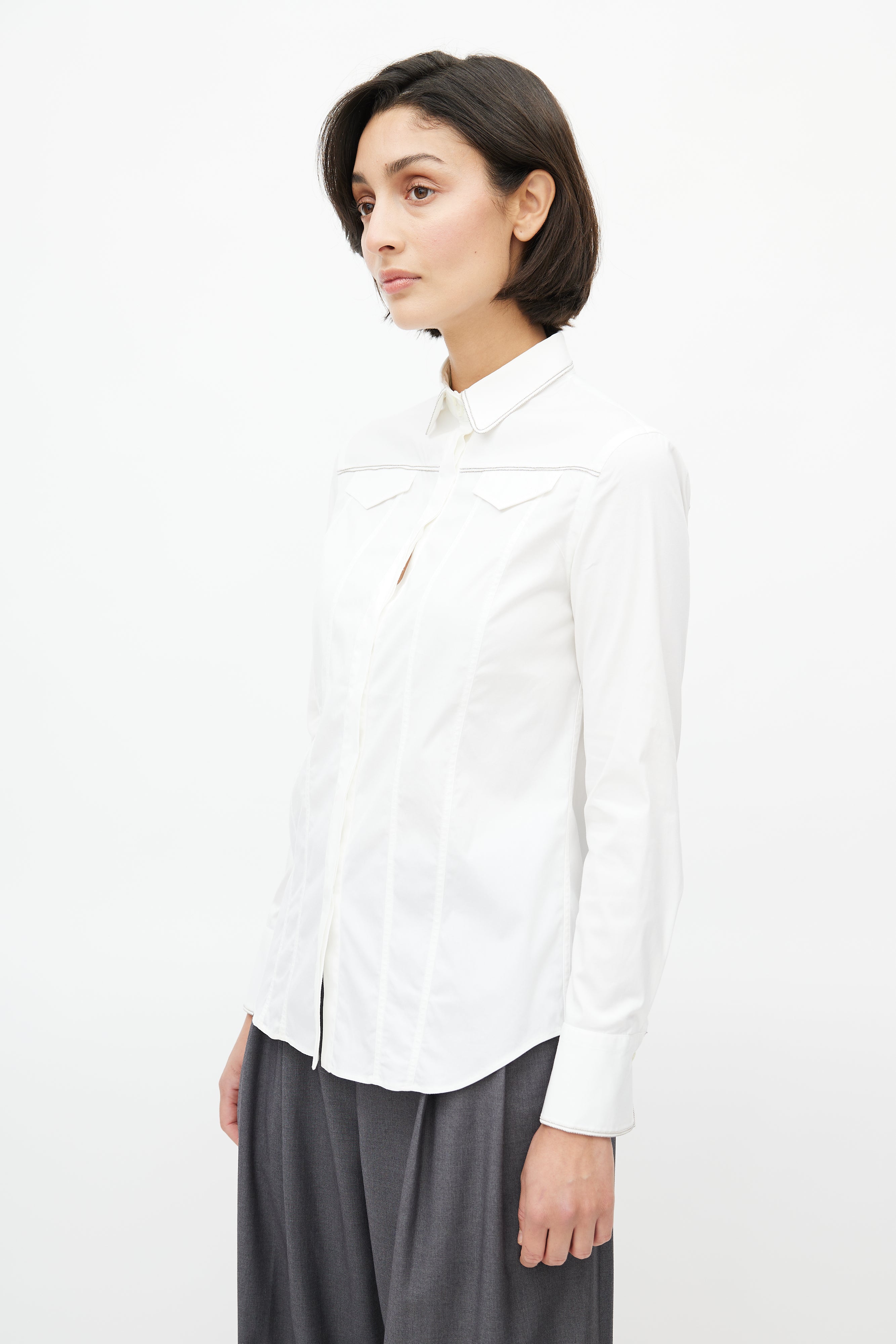 Pre-owned Brunello Cucinelli white shirt featuring concealed button up front, buttoned cuffs, faux flap pockets at chest, darting throughout, and Monili bead embellishment throughout.