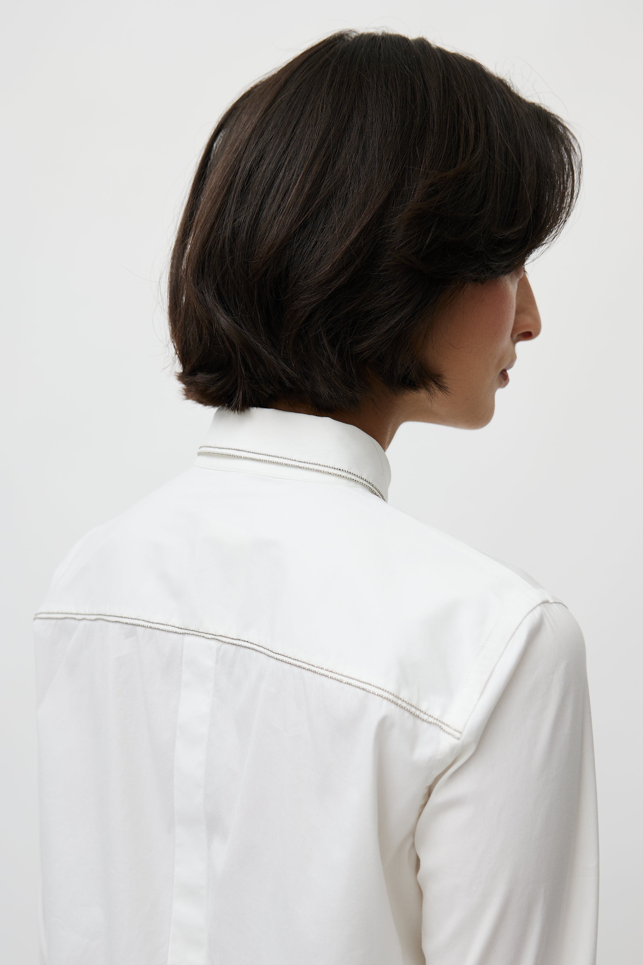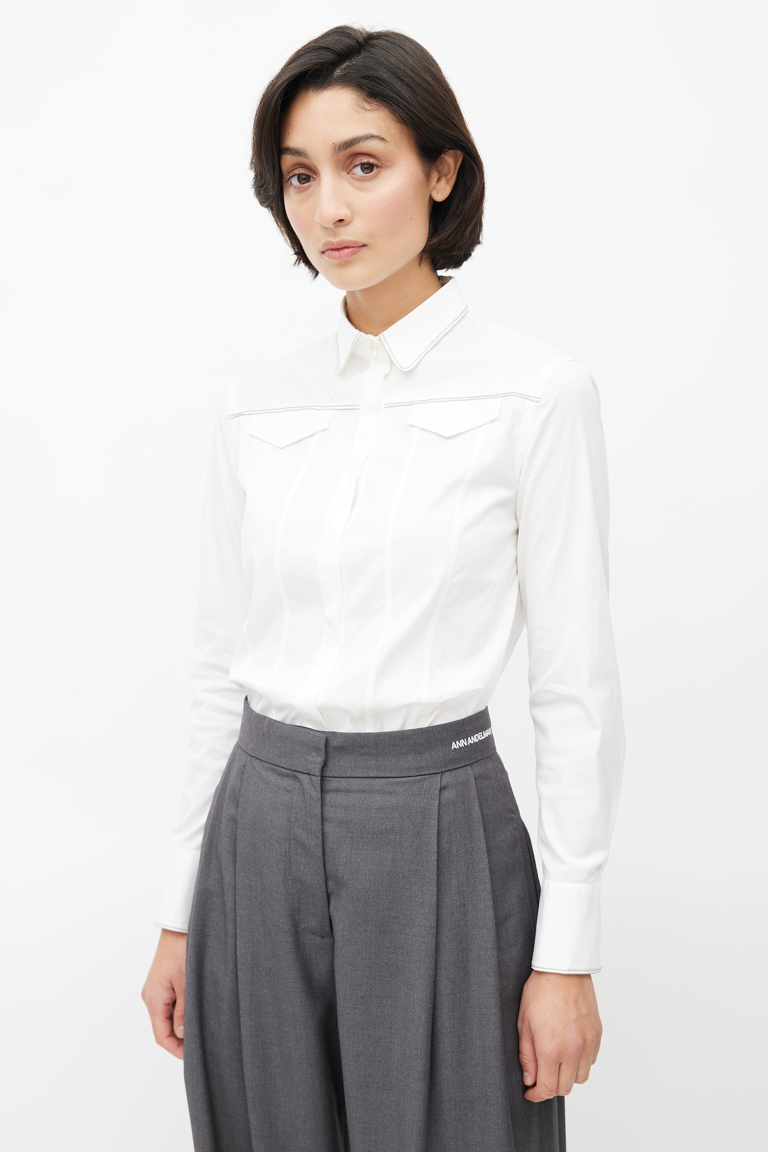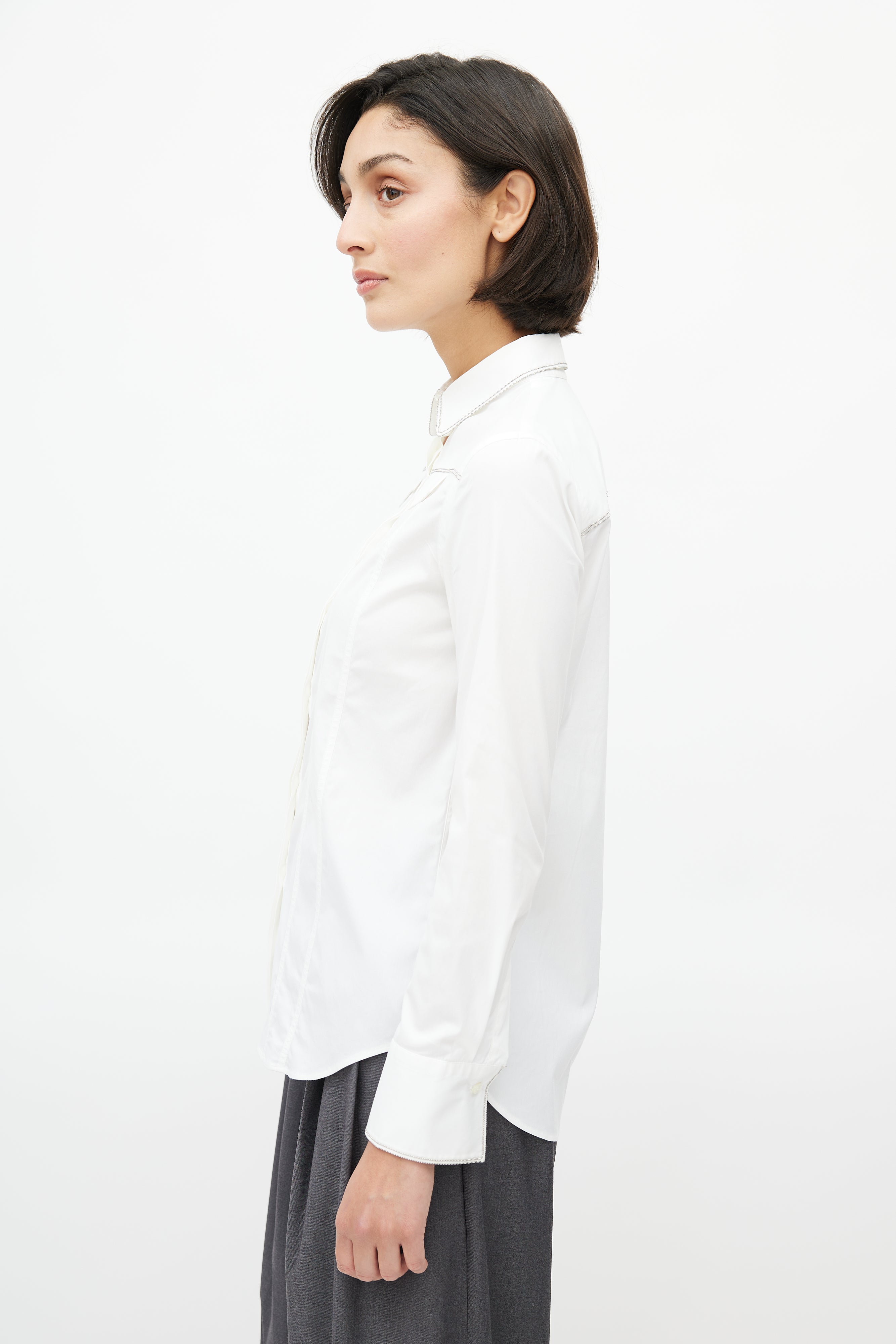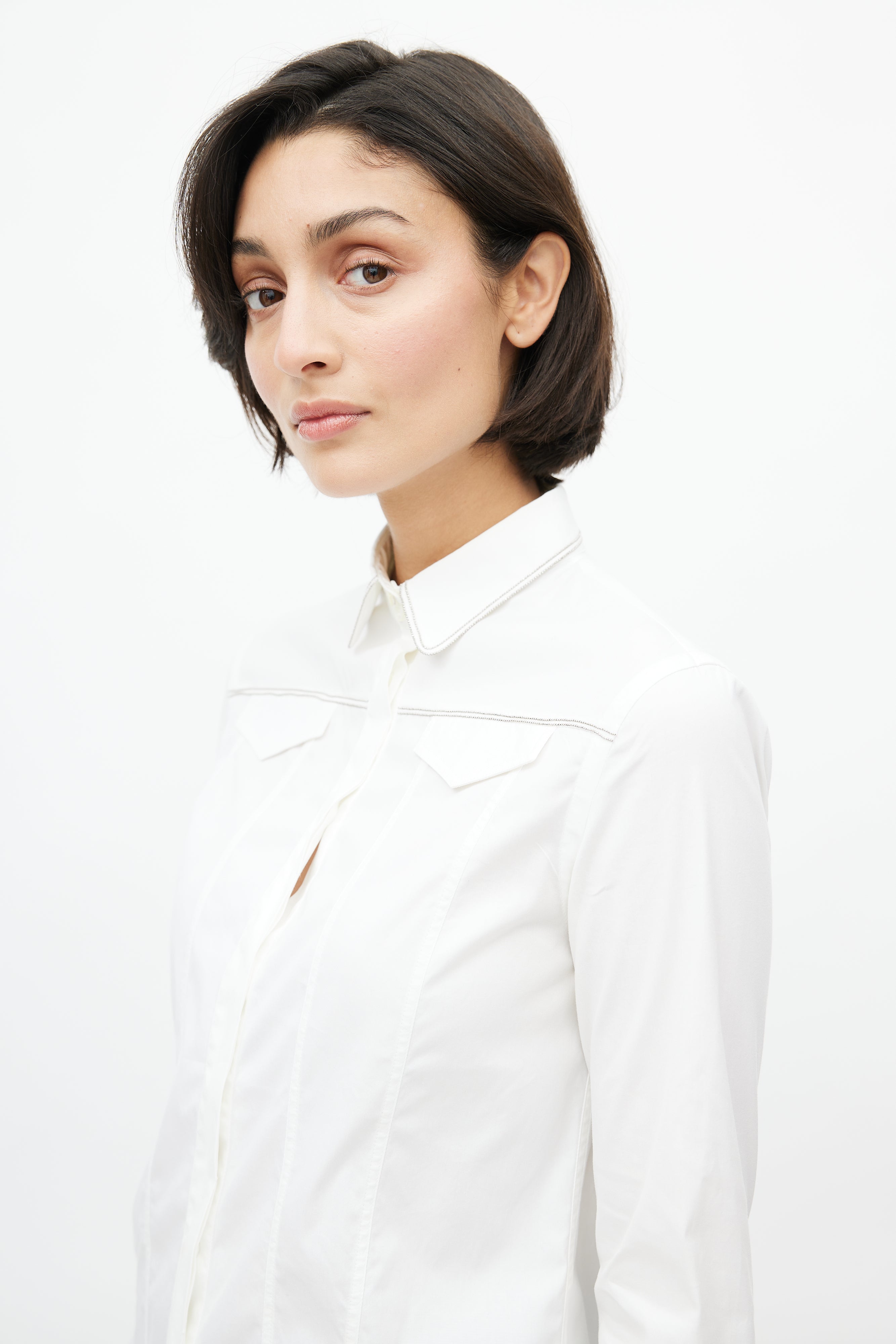 Pre-owned Brunello Cucinelli white shirt featuring concealed button up front, buttoned cuffs, faux flap pockets at chest, darting throughout, and Monili bead embellishment throughout.