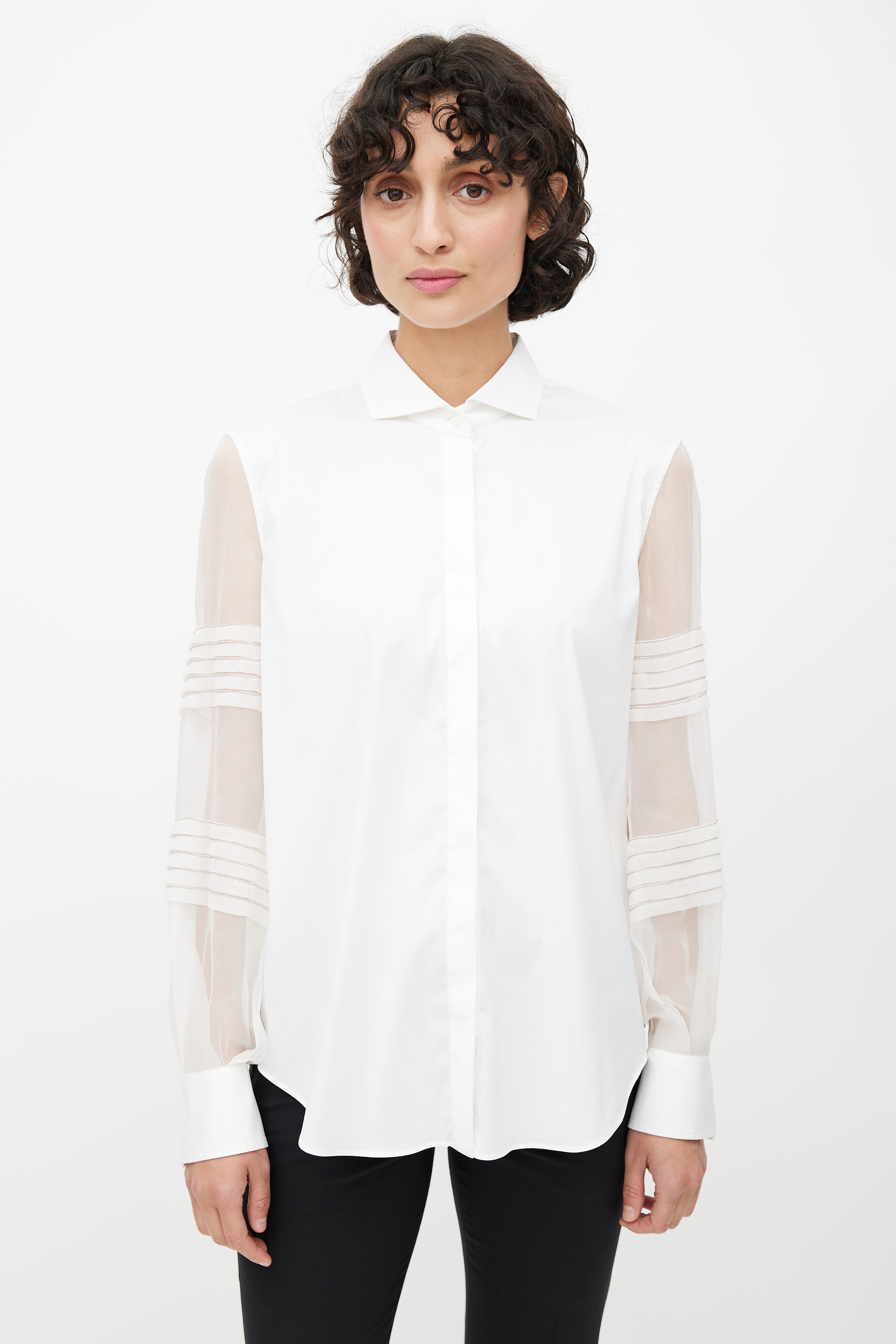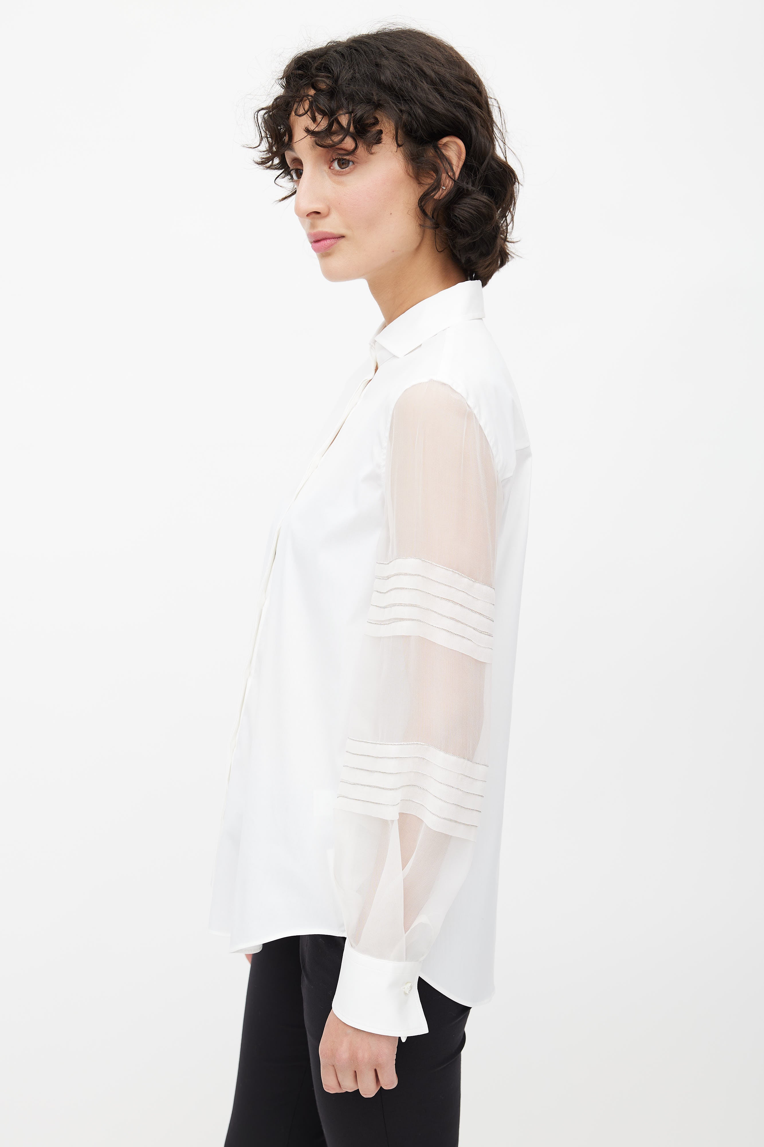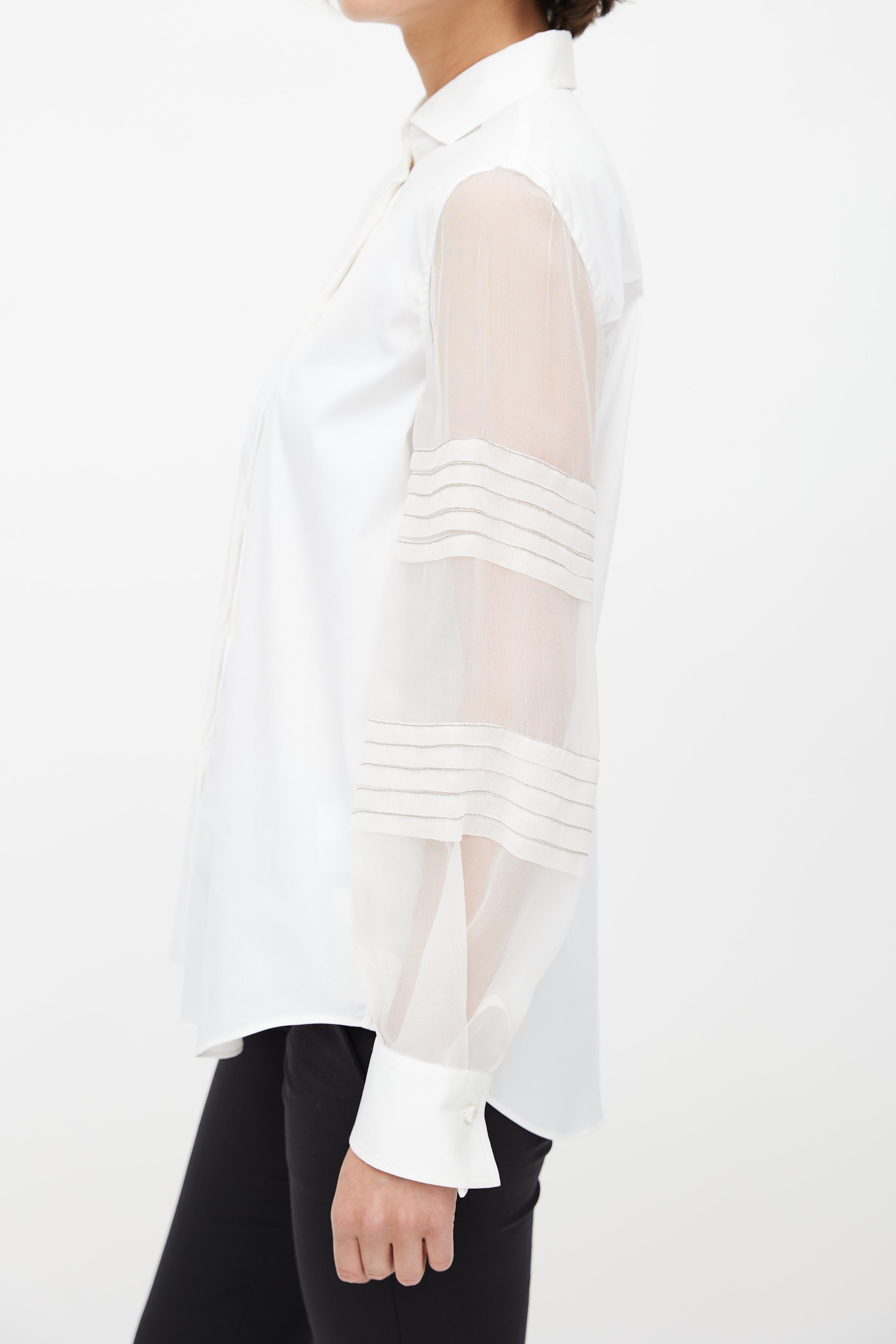 Pre-owned Brunello Cucinelli white monilli bead button up blouse featuring a foldover collar, button up front, sheer sleeves with pleated details and monilli bead trim and buttoned cuffs.