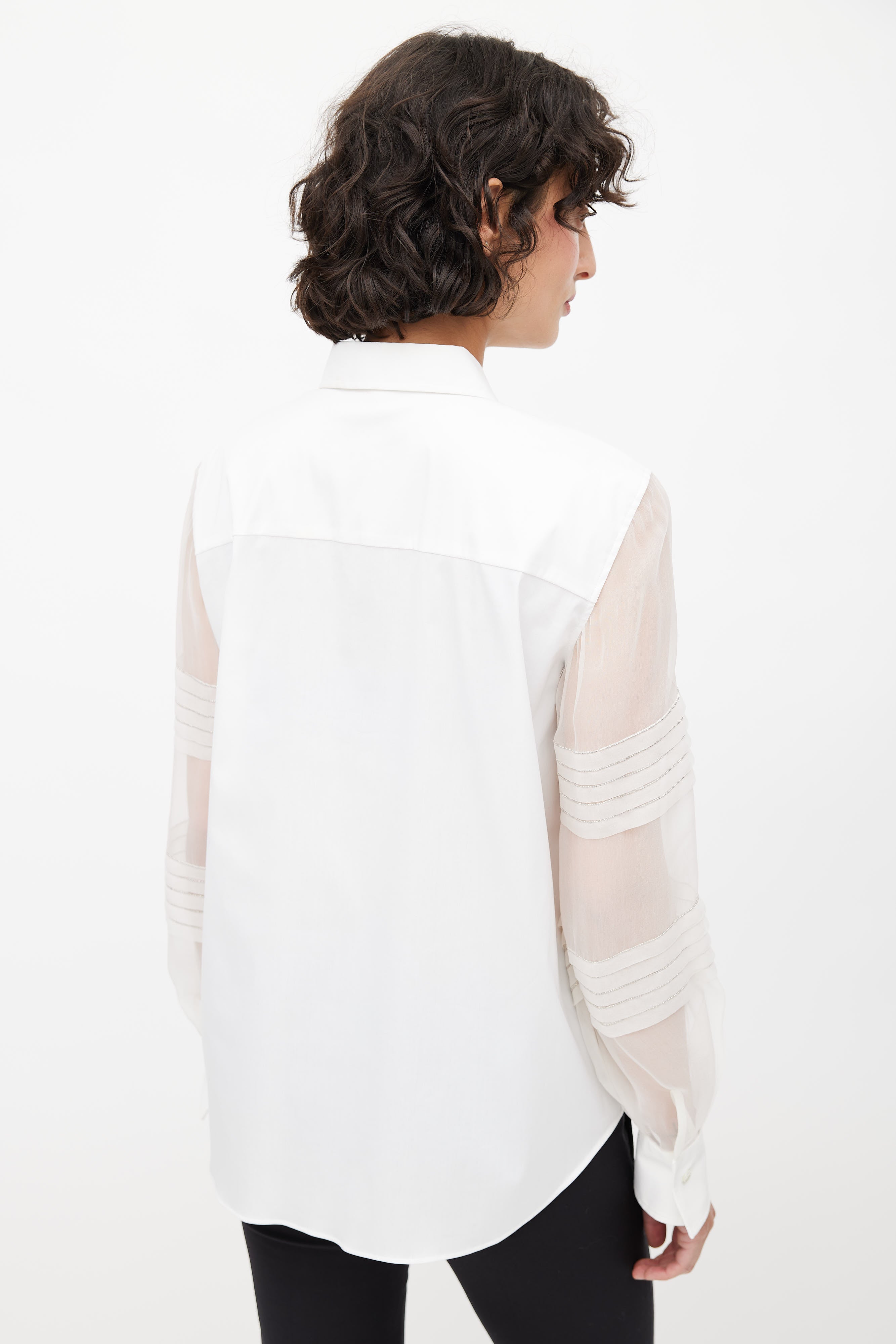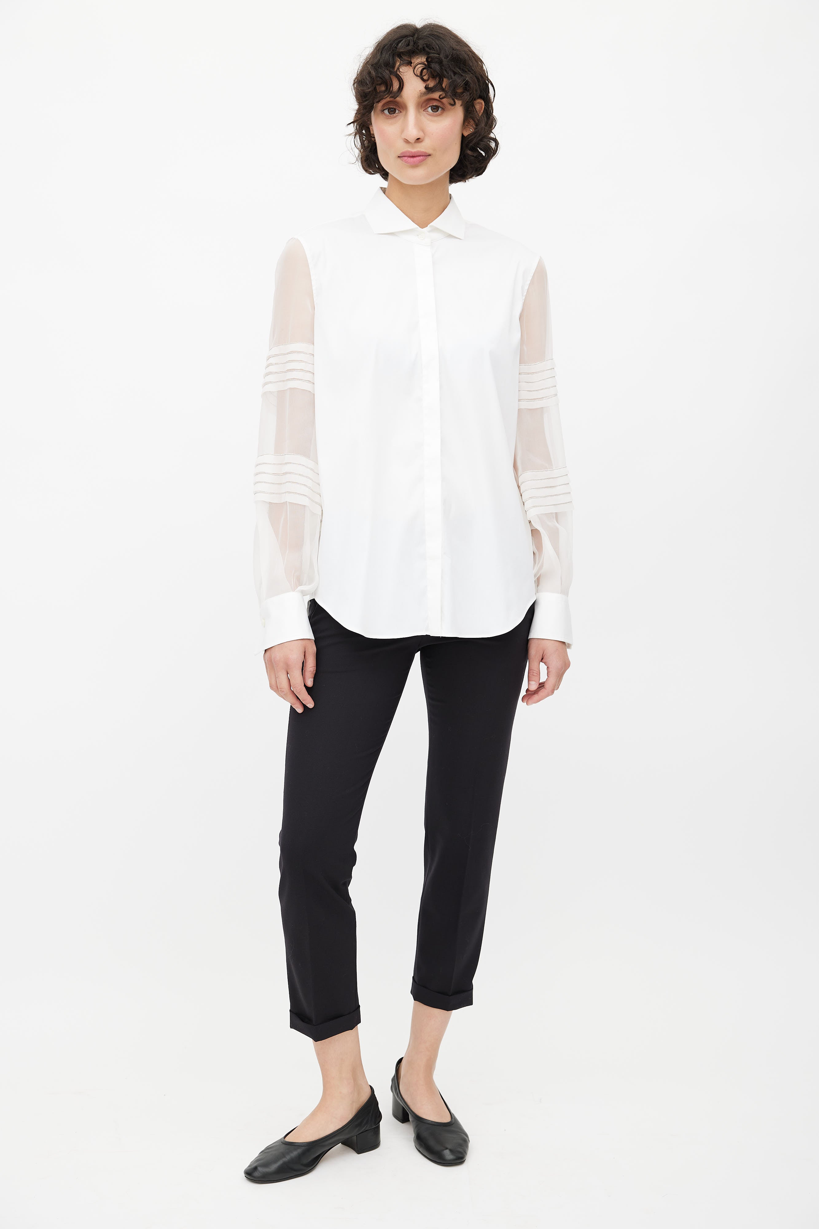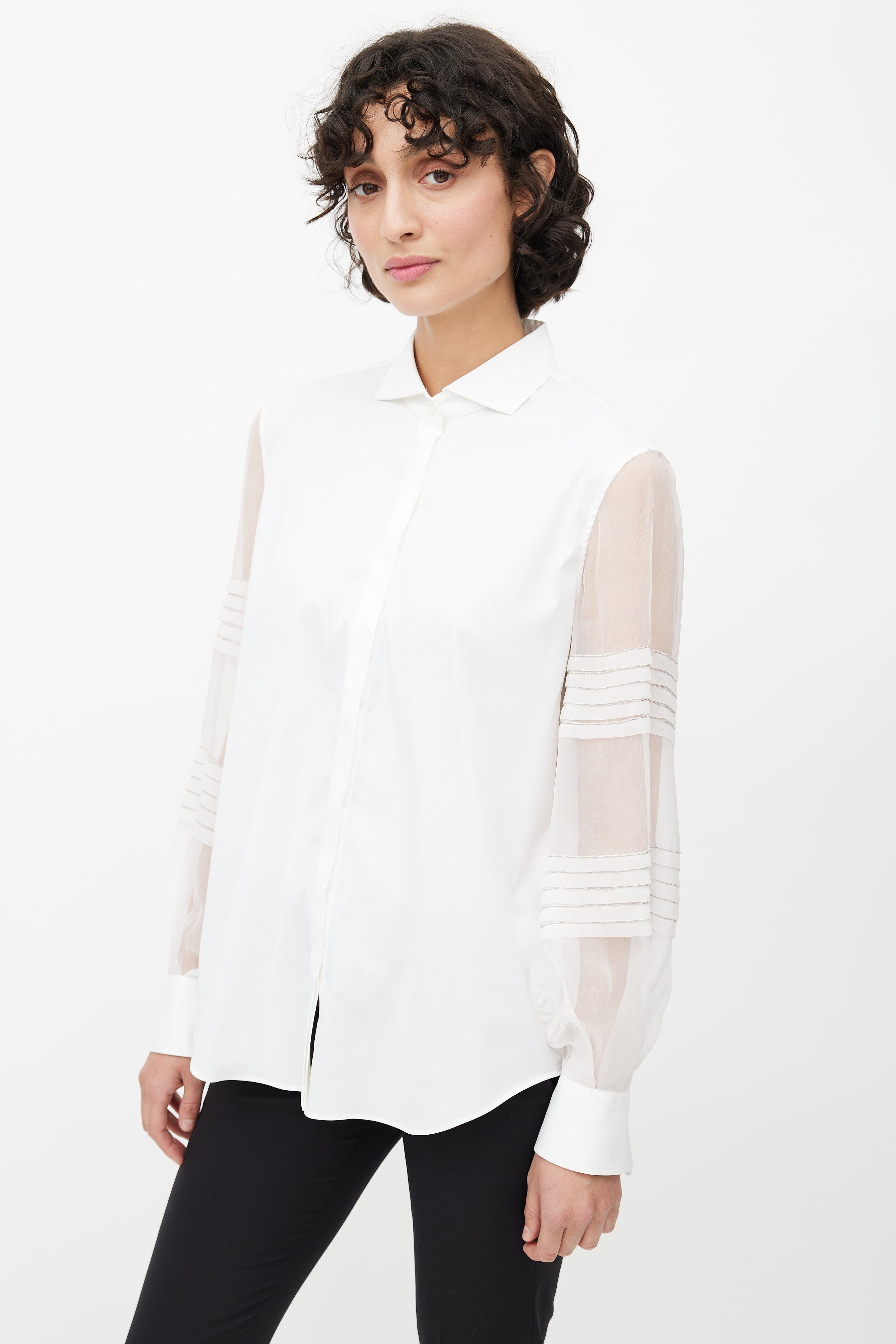 Pre-owned Brunello Cucinelli white monilli bead button up blouse featuring a foldover collar, button up front, sheer sleeves with pleated details and monilli bead trim and buttoned cuffs.