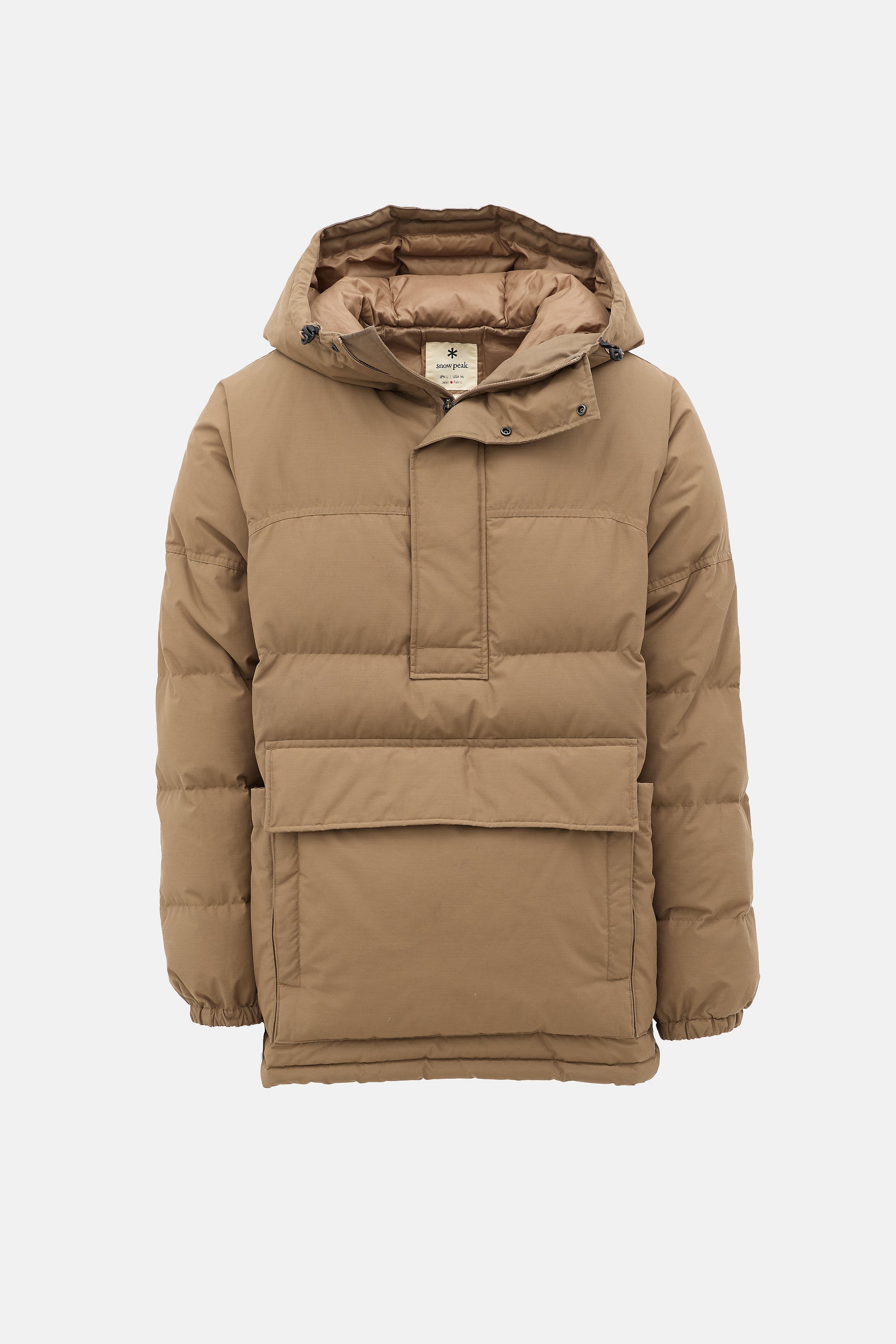Pre-owned Snow Peak brown down puffer jacket featuring drawcord hood, half zip up front, front flap pocket with zip compartment, two slip pockets at sides, drawcord hem, and elasticized cuffs. Padded and lined.
