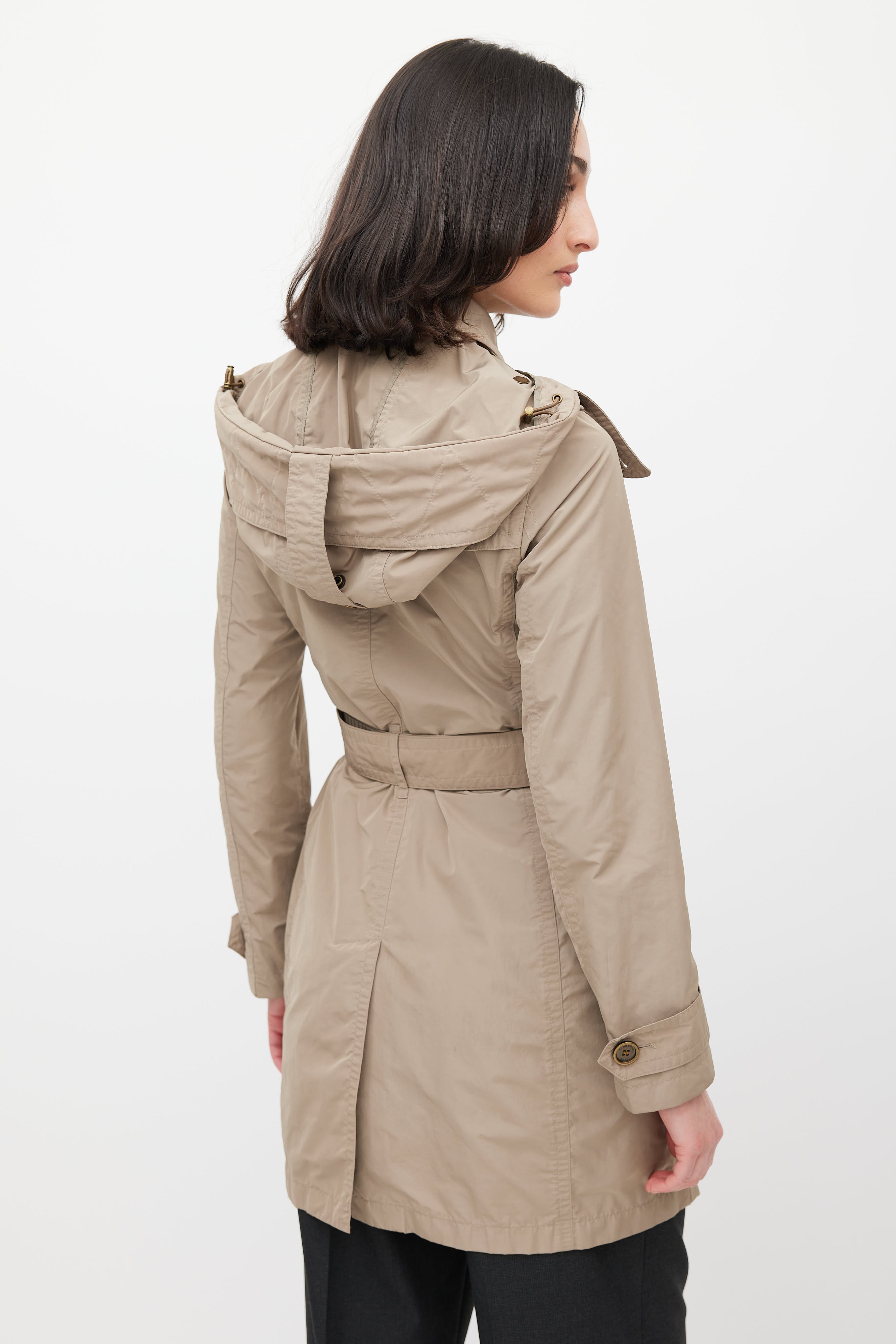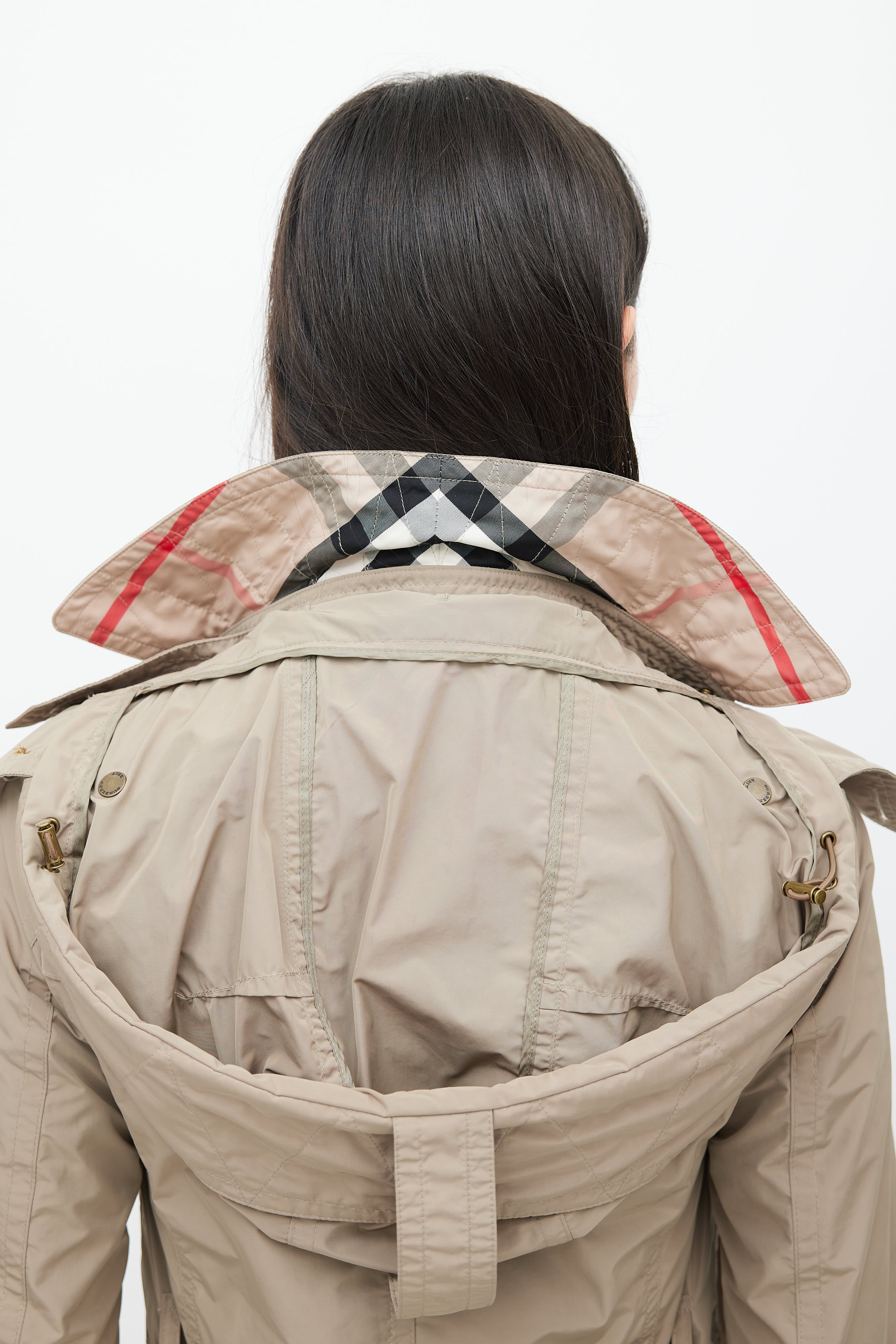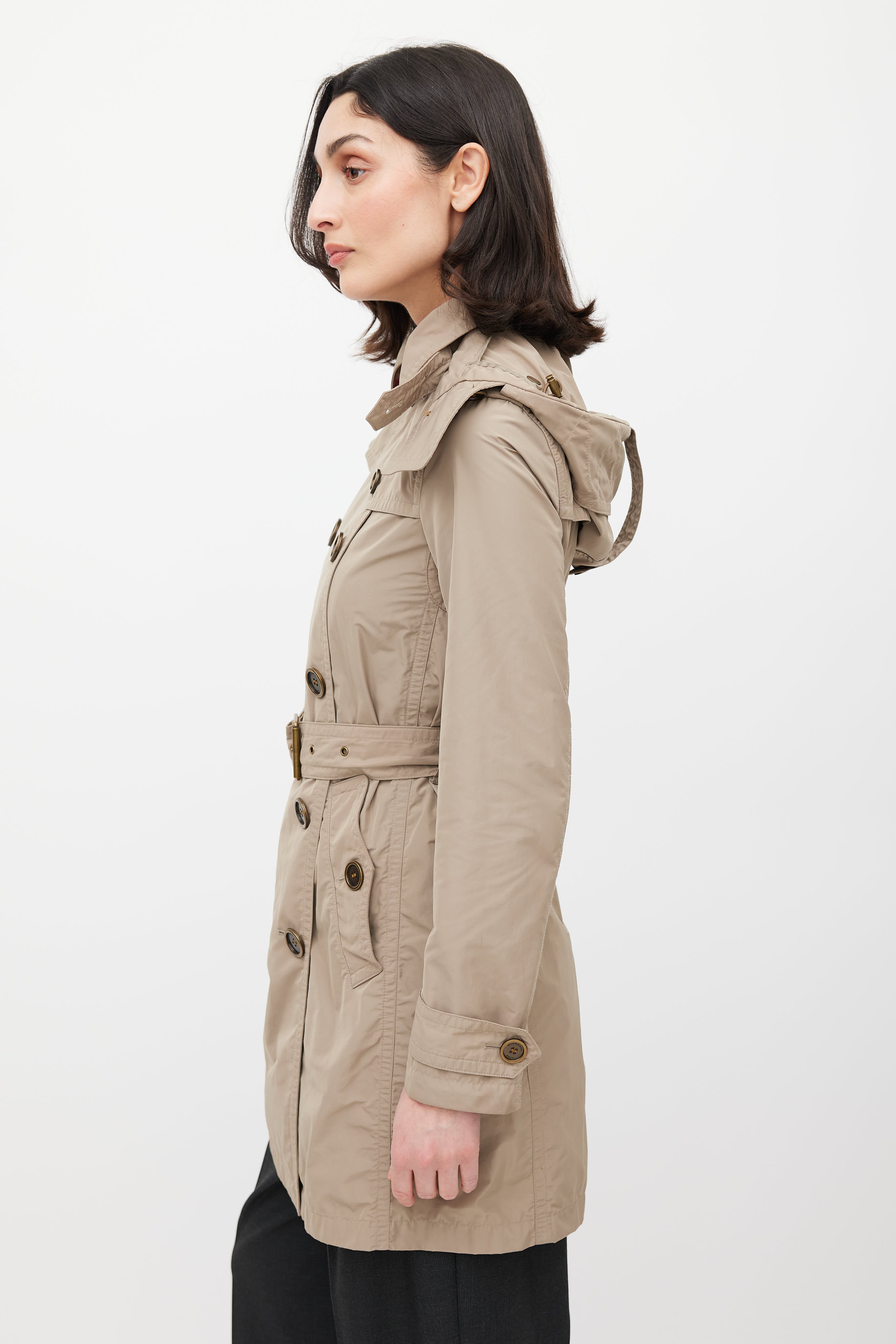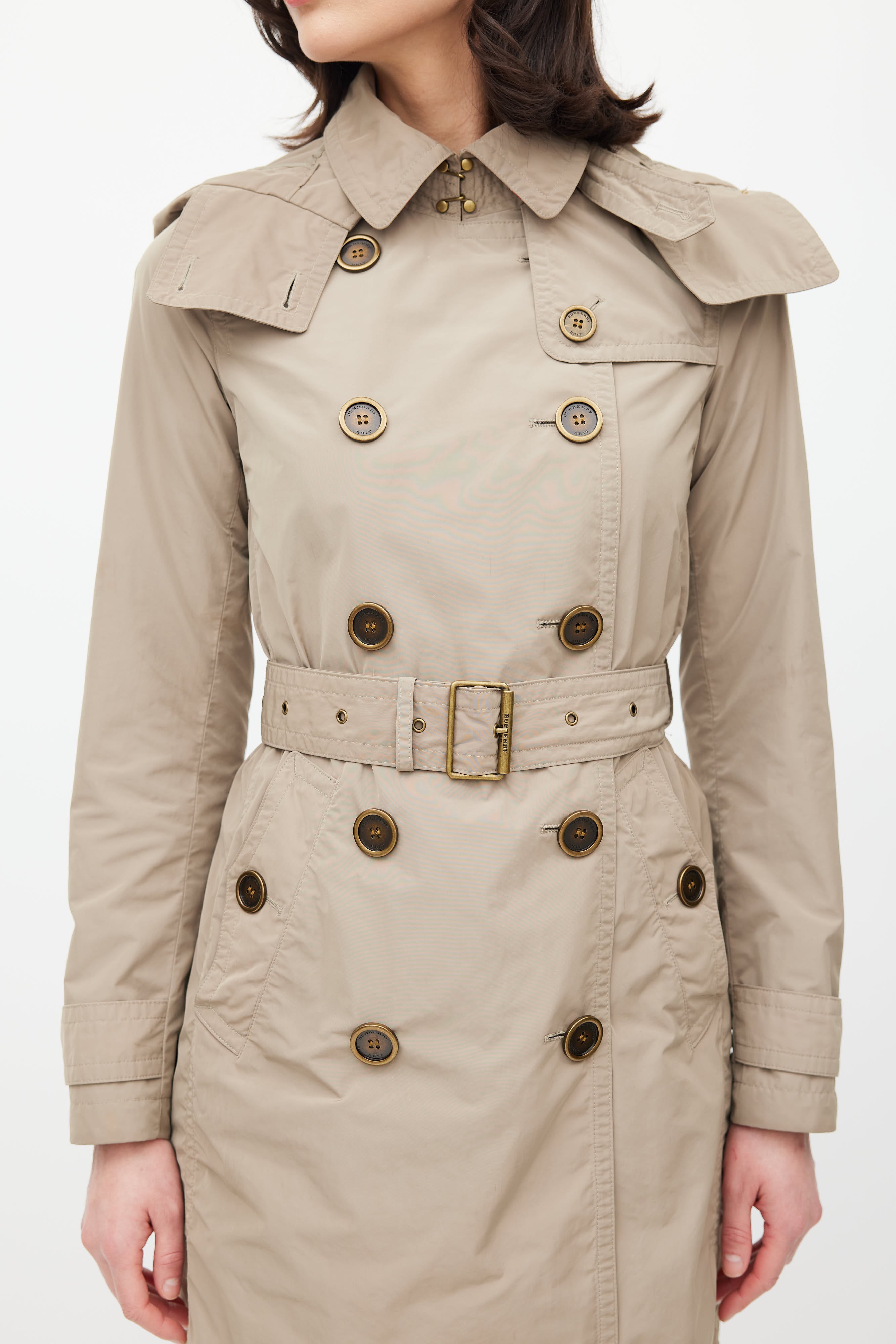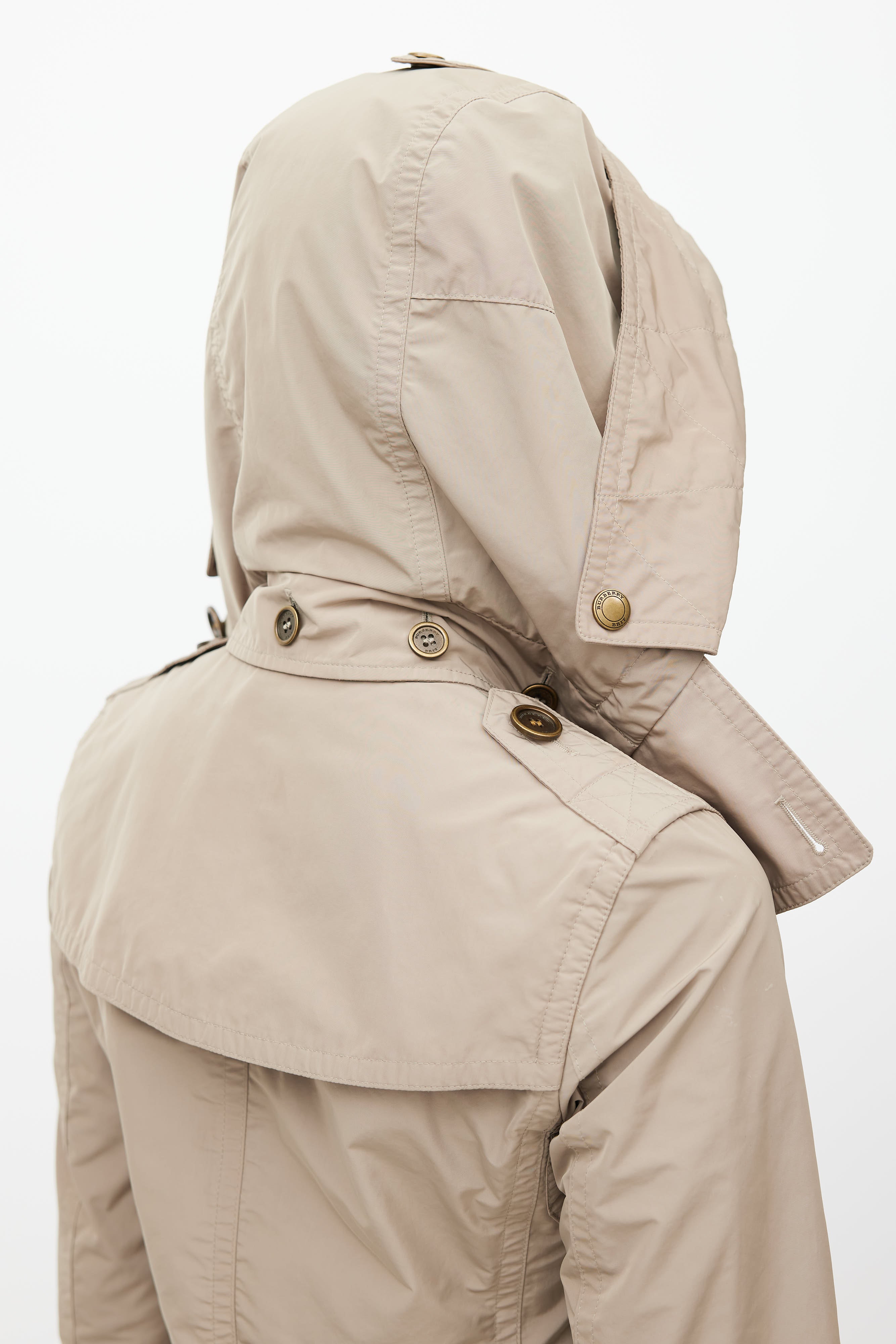 Pre-owned Burberry Brit beige nylon coat featuring a removable drawstring hood, long sleeves with buttoned cuffs, two slip pockets at hip, tie belt at waist, epaulets at shoulder, and double breasted button closure. Lined.