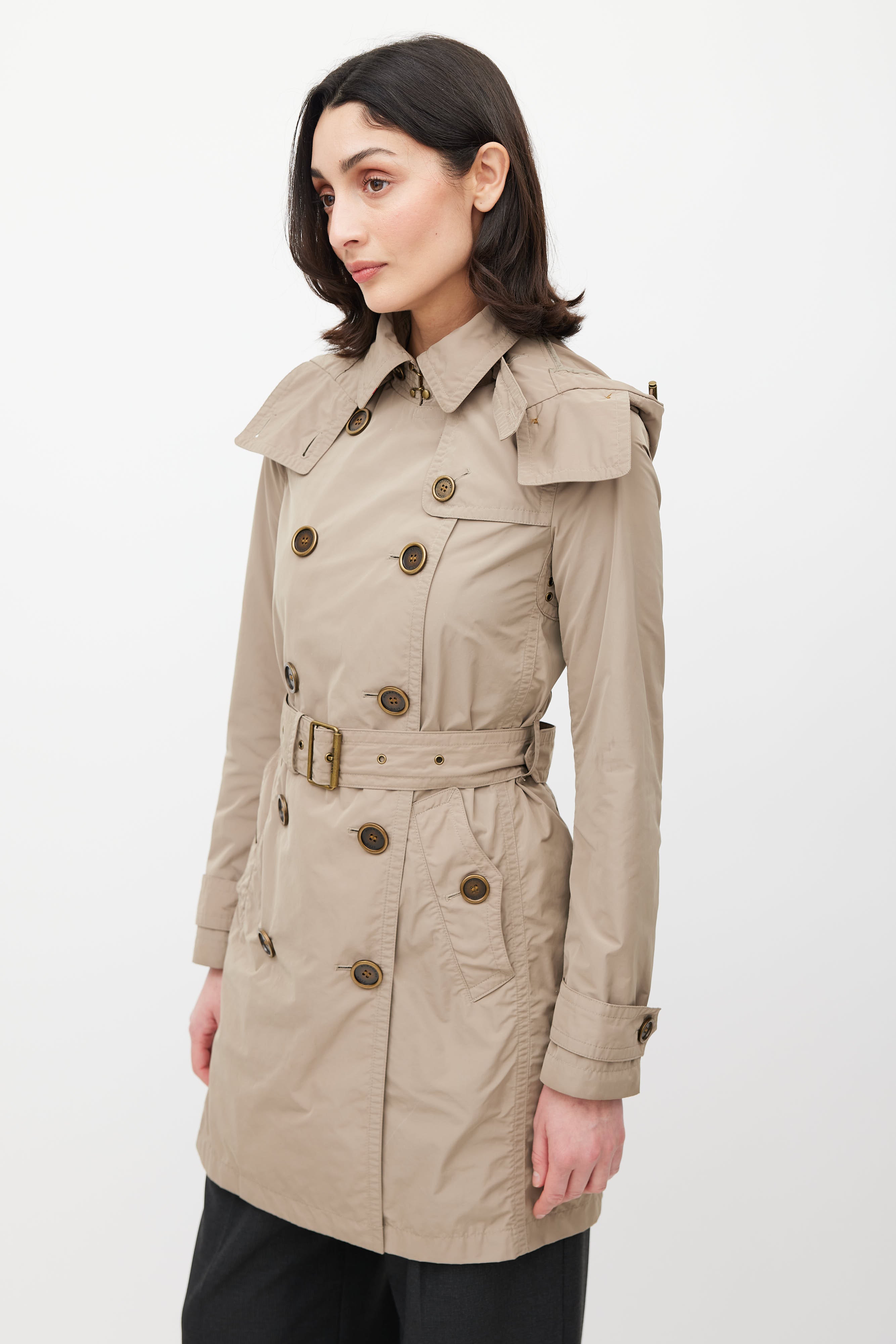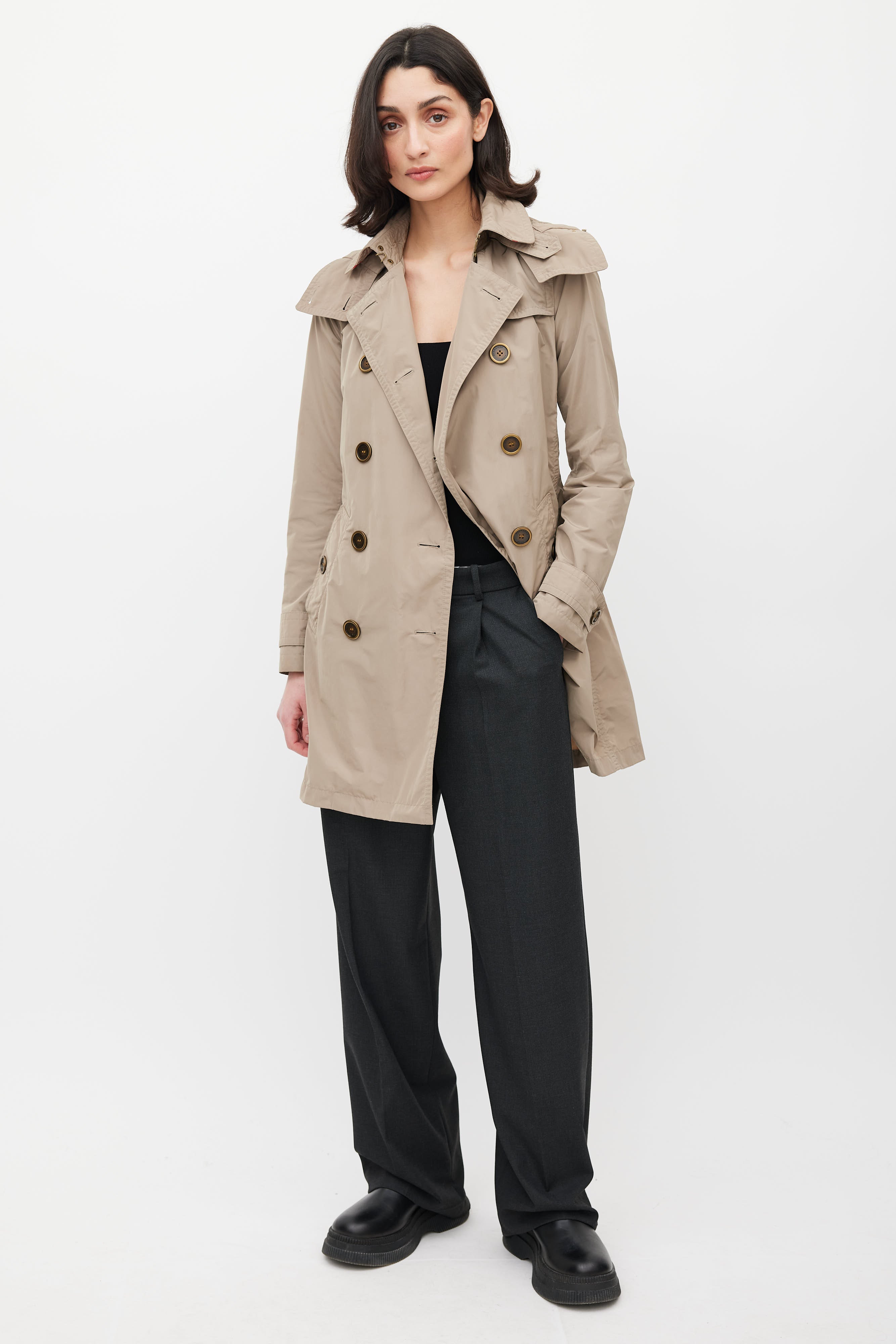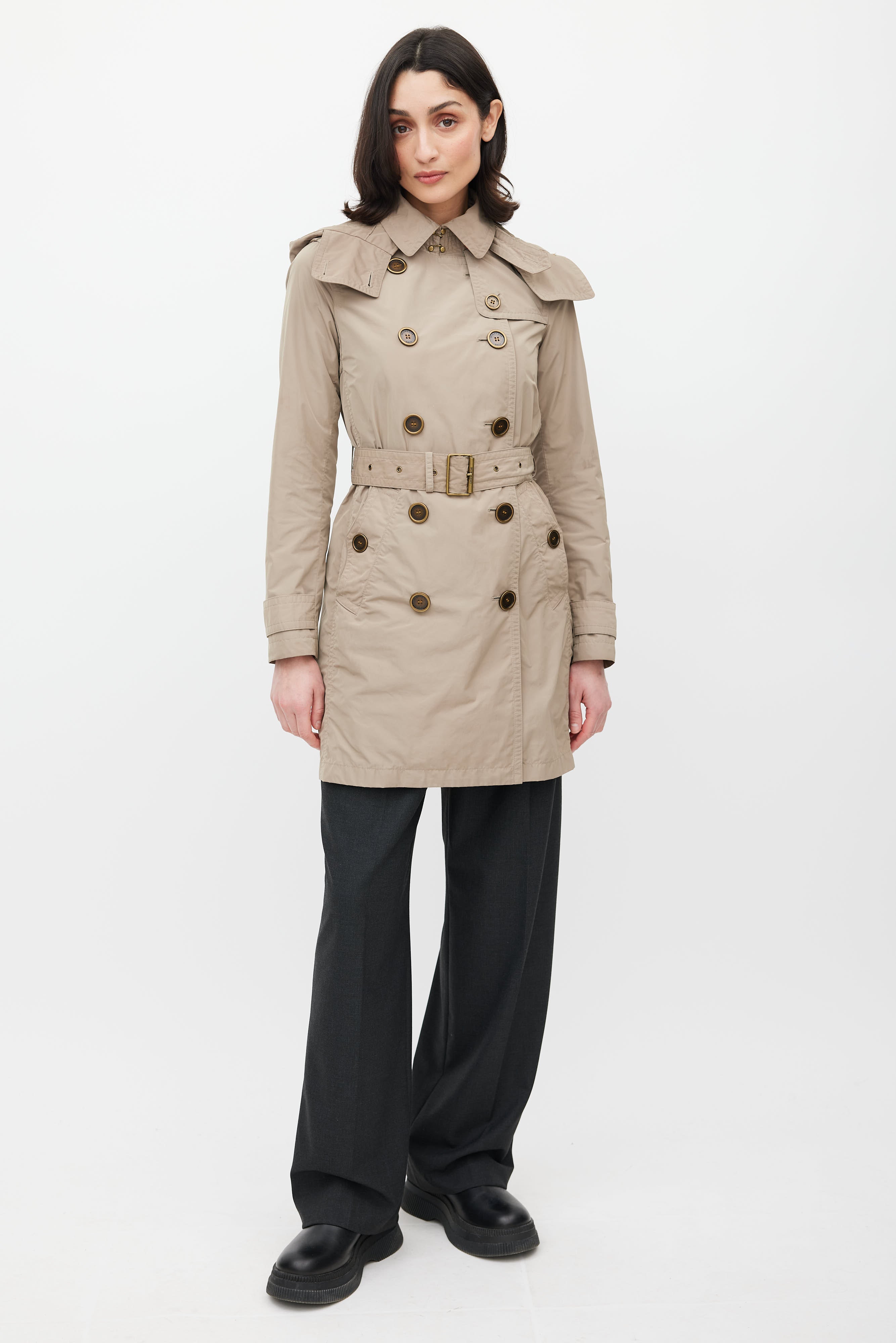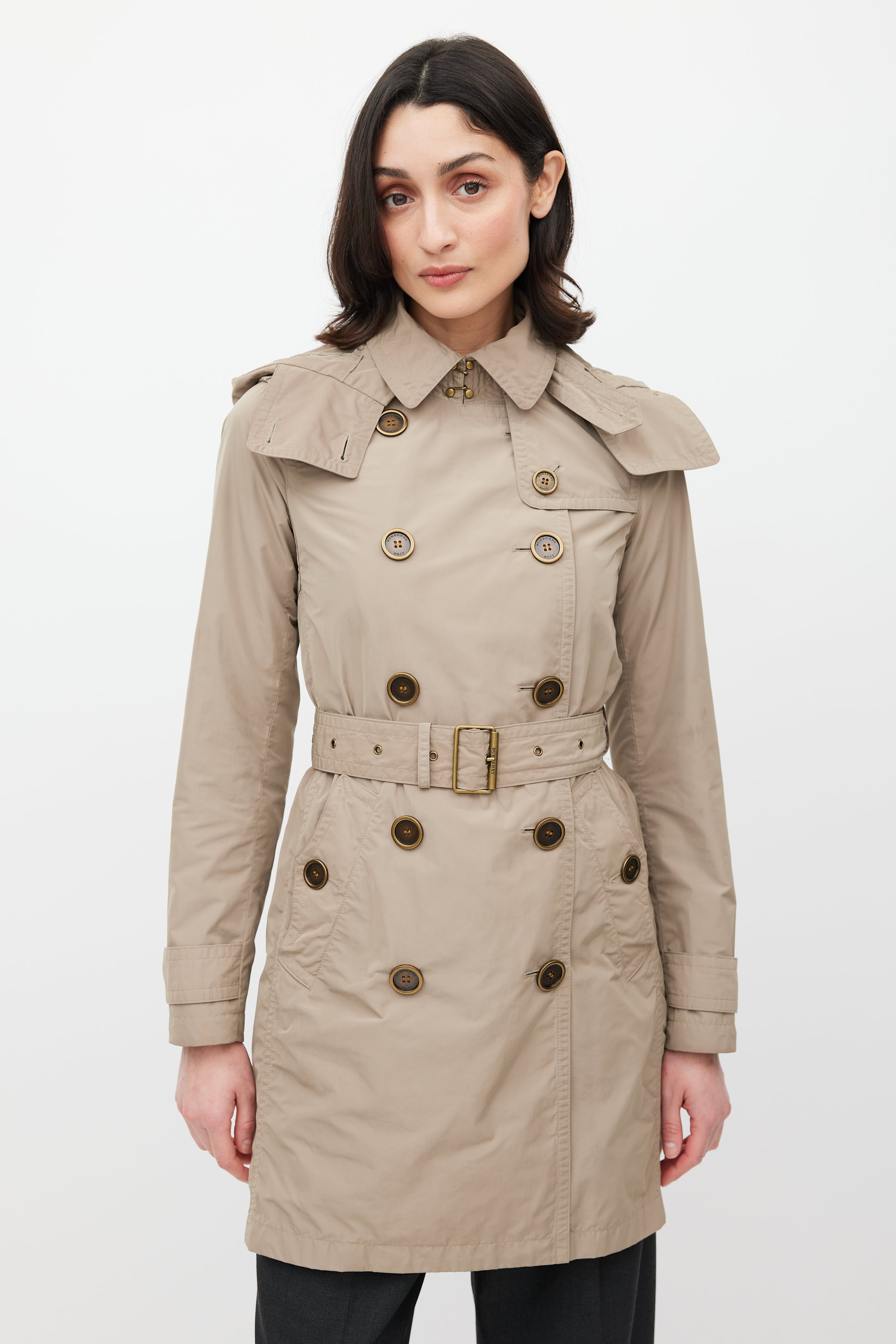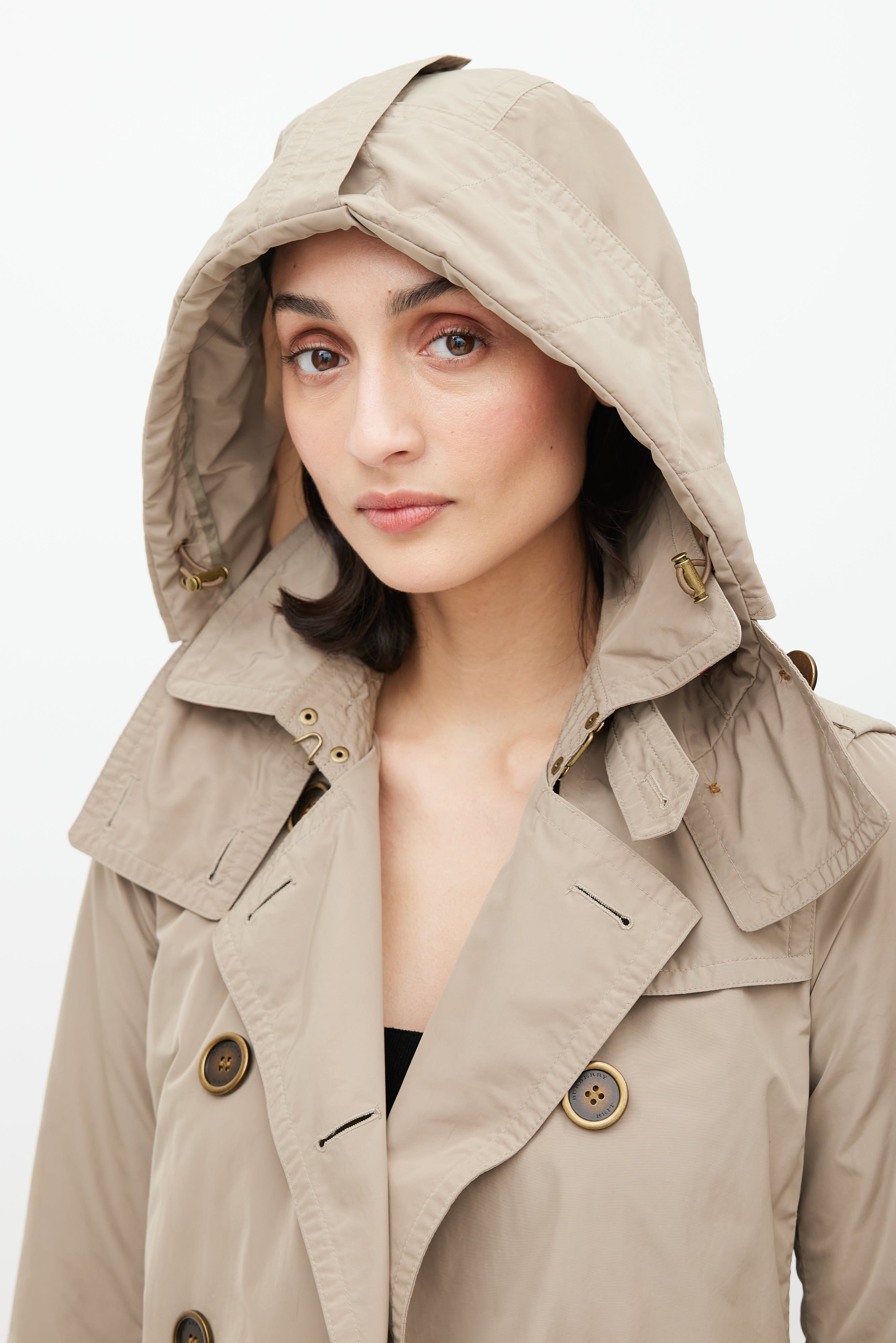 Pre-owned Burberry Brit beige nylon coat featuring a removable drawstring hood, long sleeves with buttoned cuffs, two slip pockets at hip, tie belt at waist, epaulets at shoulder, and double breasted button closure. Lined.