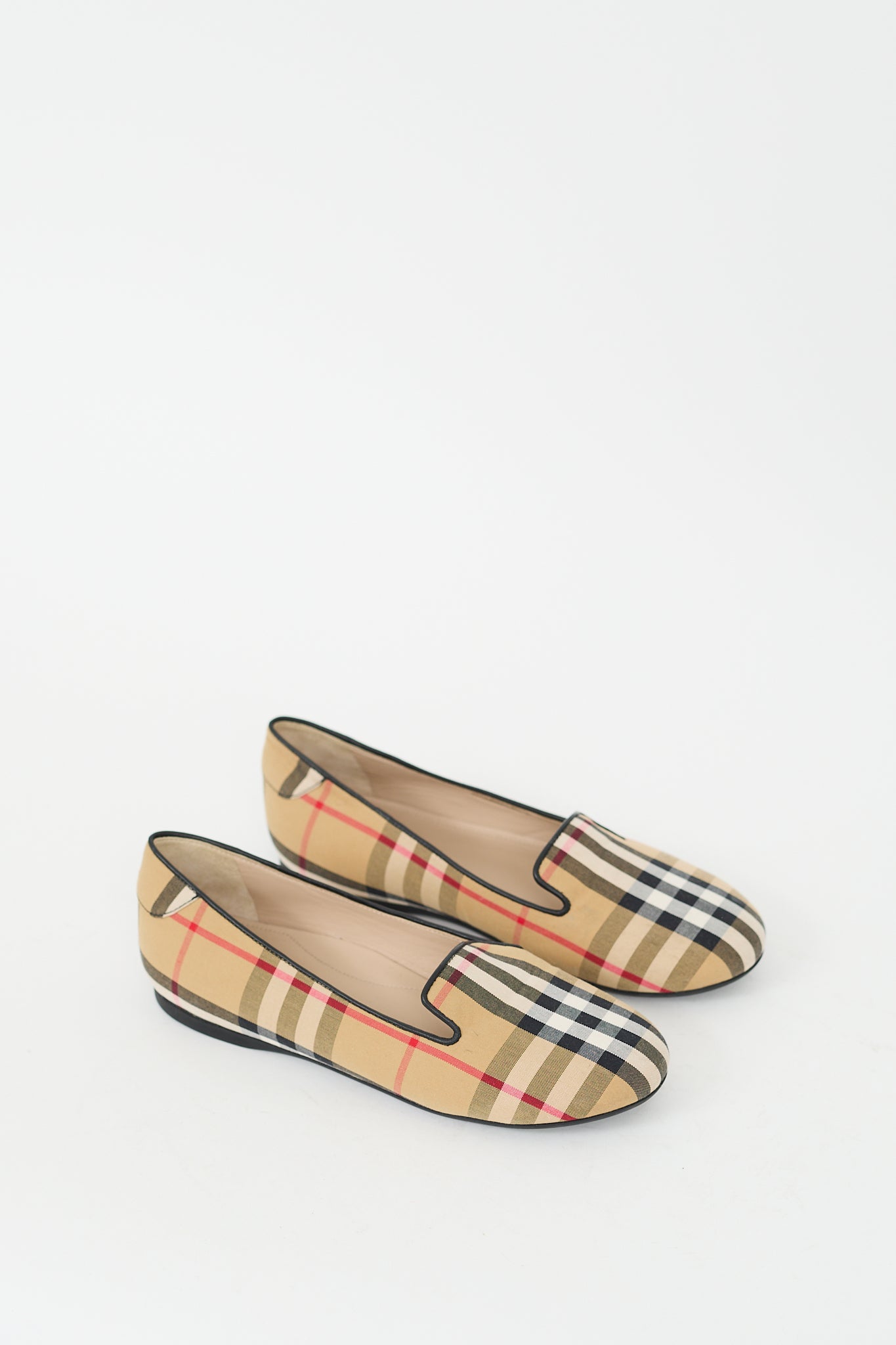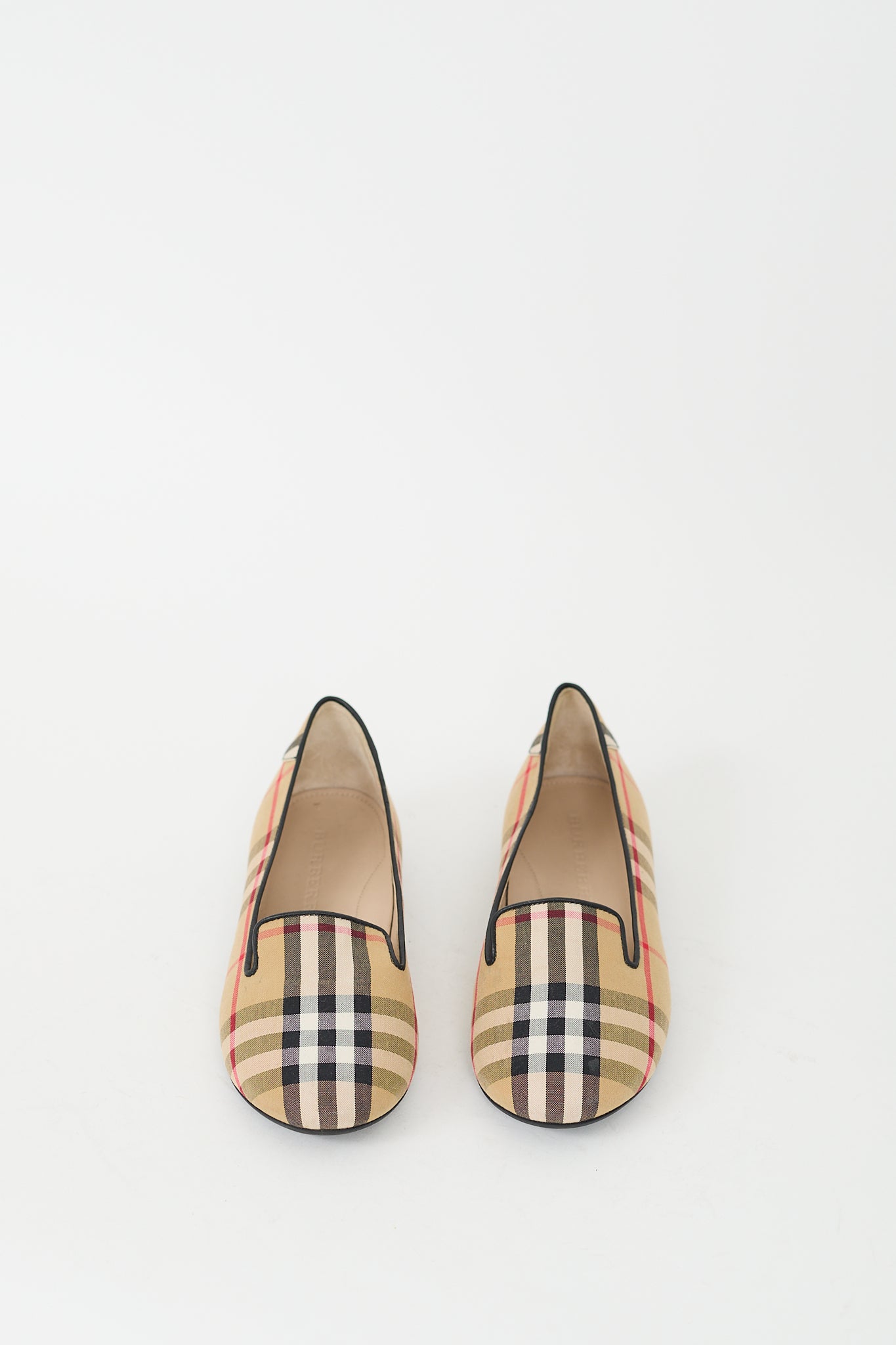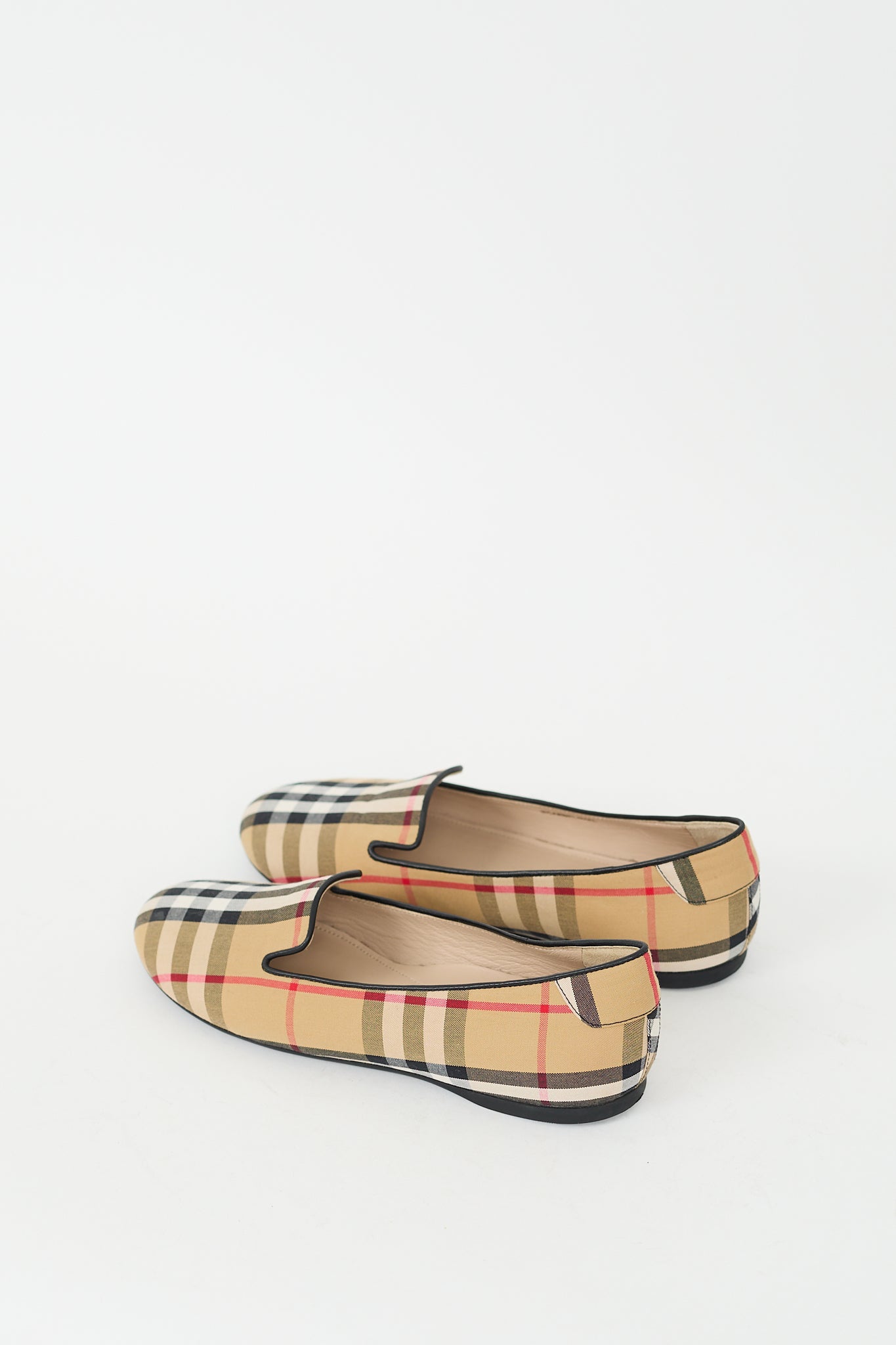 Pre-owned Burberry beige and multicolour House Check flats featuring rounded toe, notched lapel, black leather topline trim, leather insole, and slip on entry.