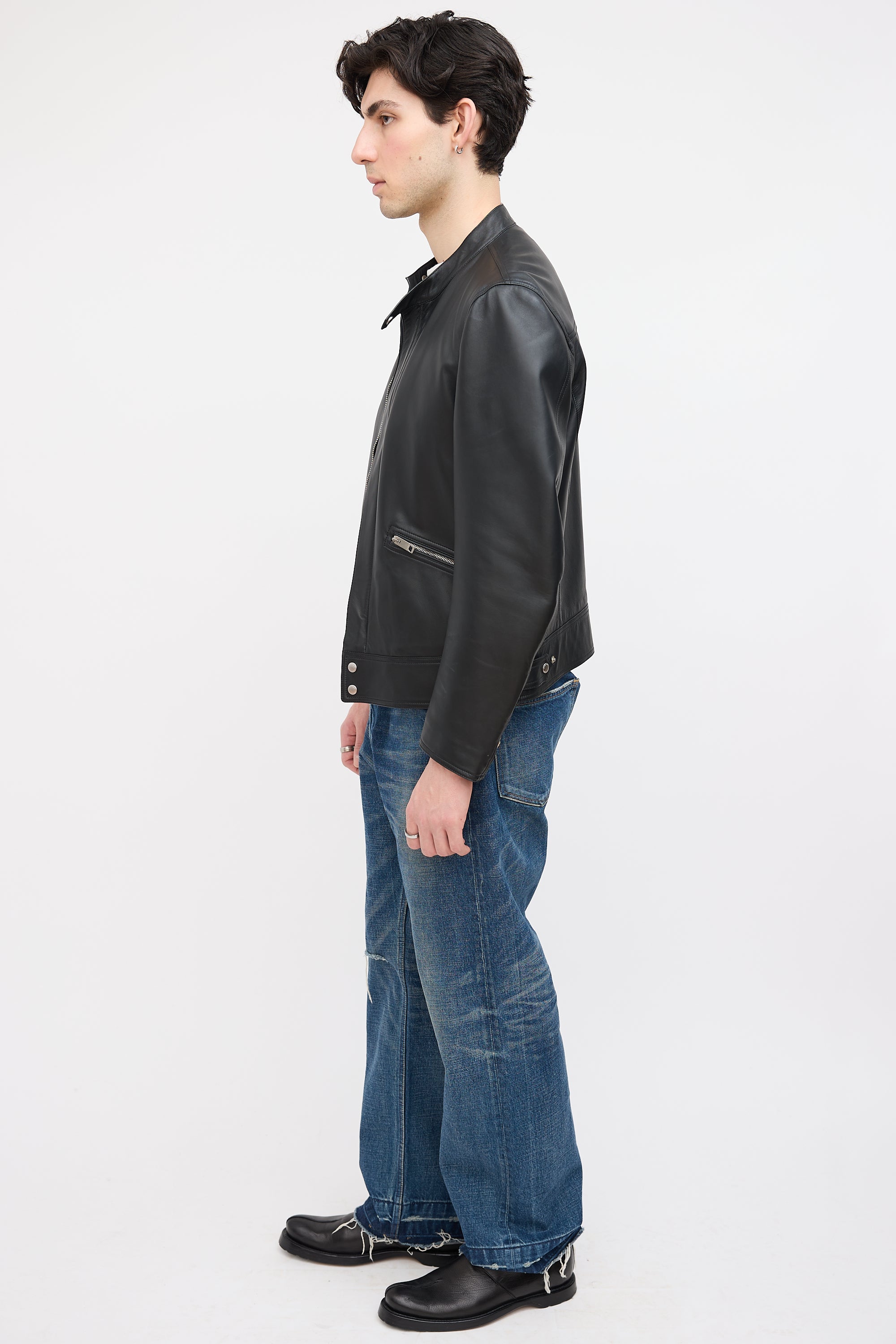 Pre-owned Burberry black leather racer jacket featuring stand collar, concealed zip up front, two zip pockets at waist, two interior chest pockets, and buttoned cuffs and hem.