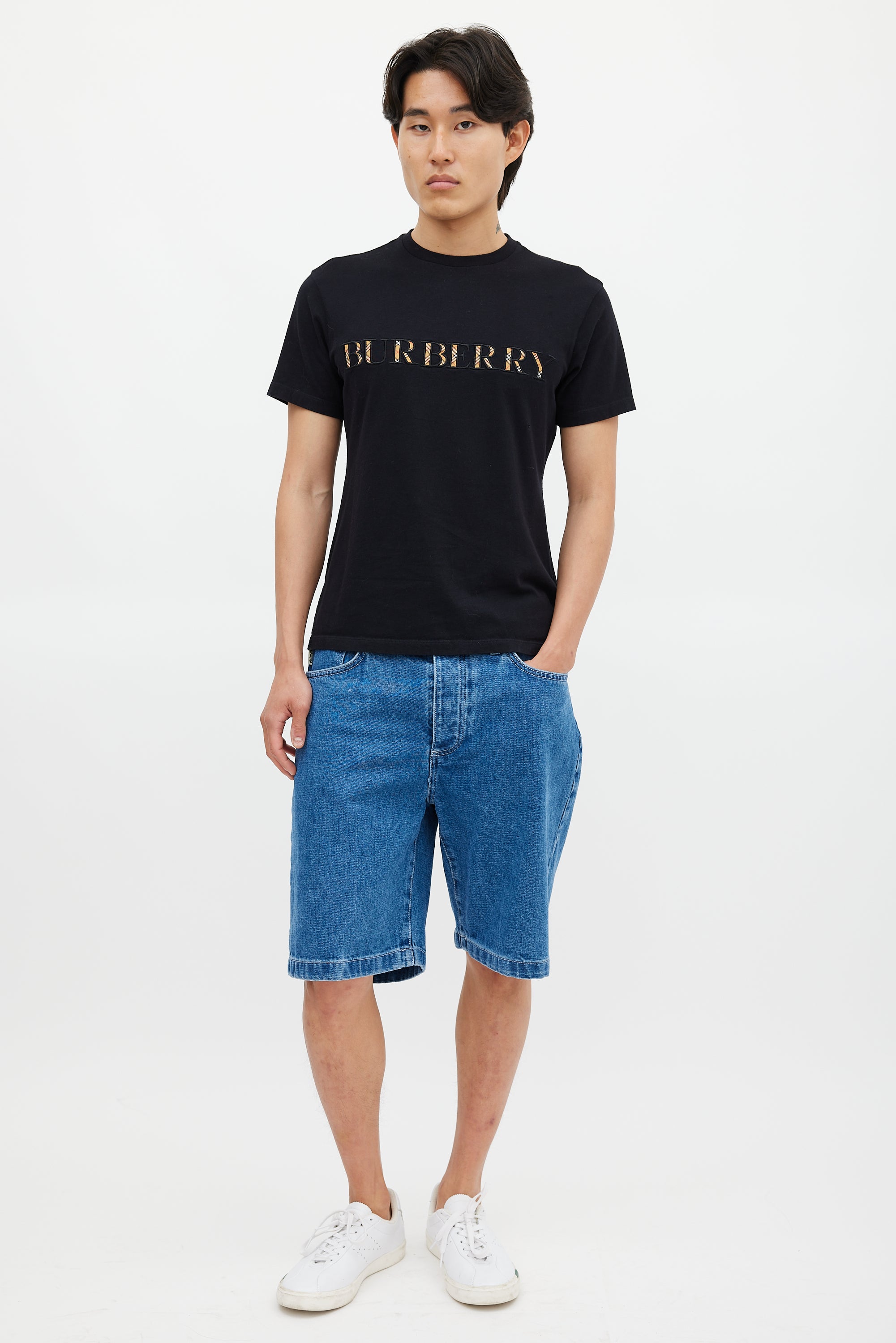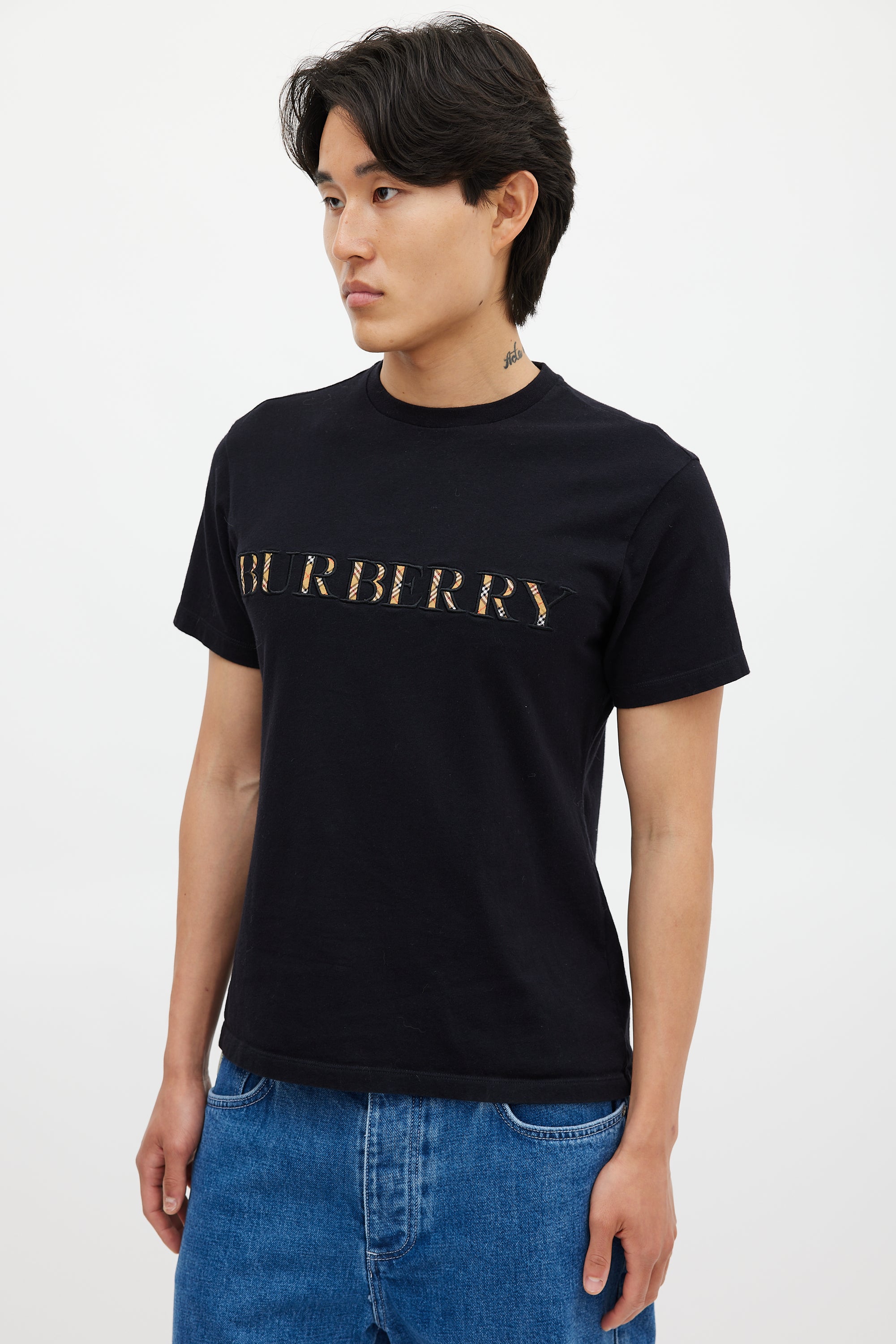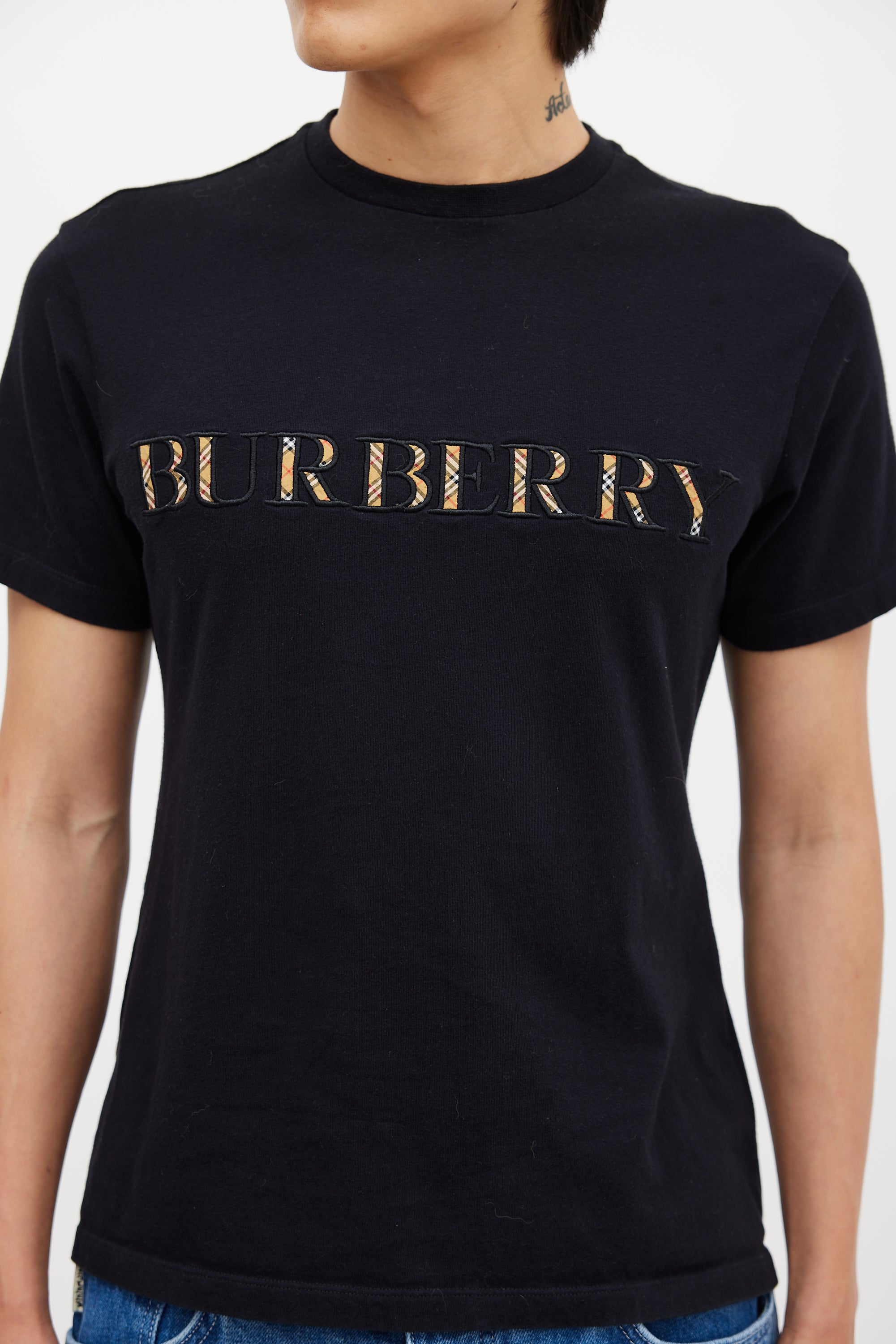 Pre-owned Burberry black T-shirt featuring a multicolour Nova Check pattern logo at chest, round neckline, and short sleeves.
