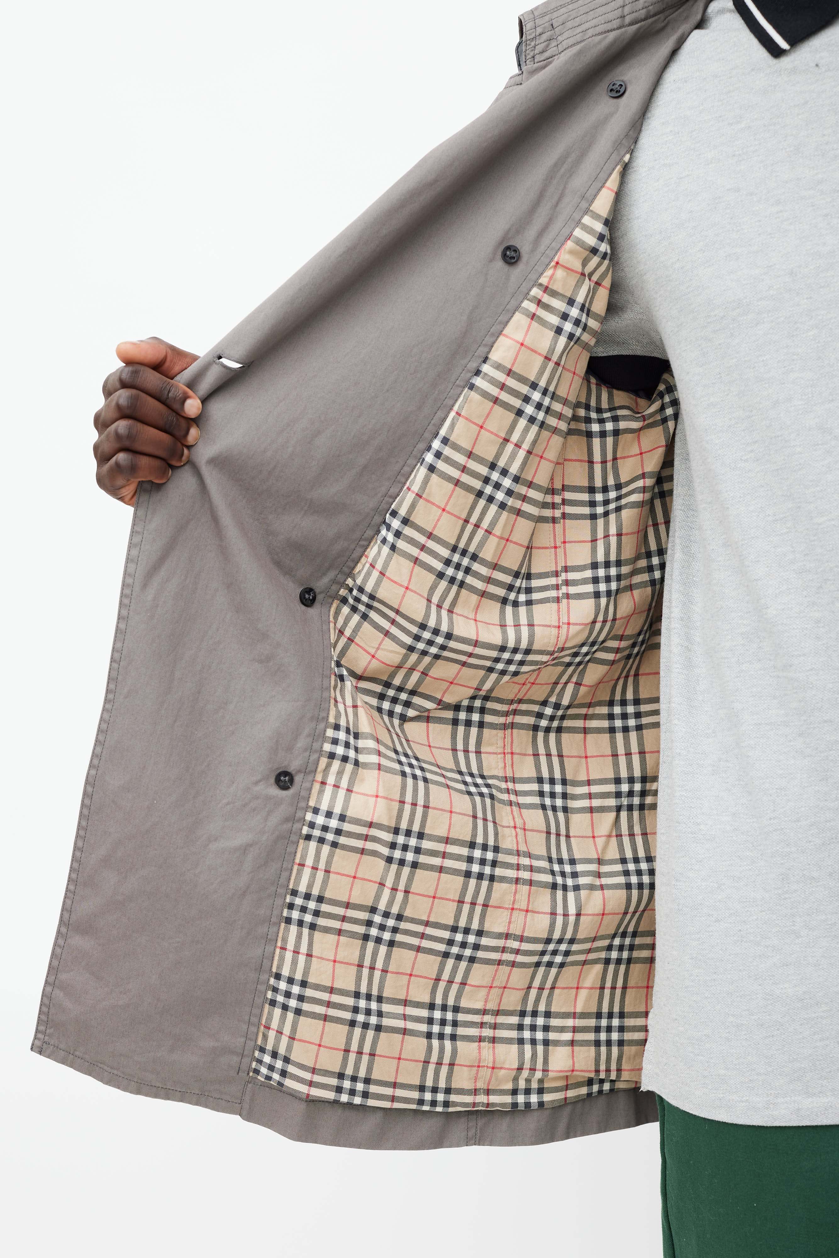 Pre-owned Burberry Brit grey cotton trench coat featuring a collared neckline with buckled strap, epaulettes with button fastenings, double breast button front, two slip pockets with buttoned flap at chest, two cargo pockets with buttoned flaps at hip, long sleeves with adjustable strap at cuff, and signature beige Nova check print throughout interior. Lined.