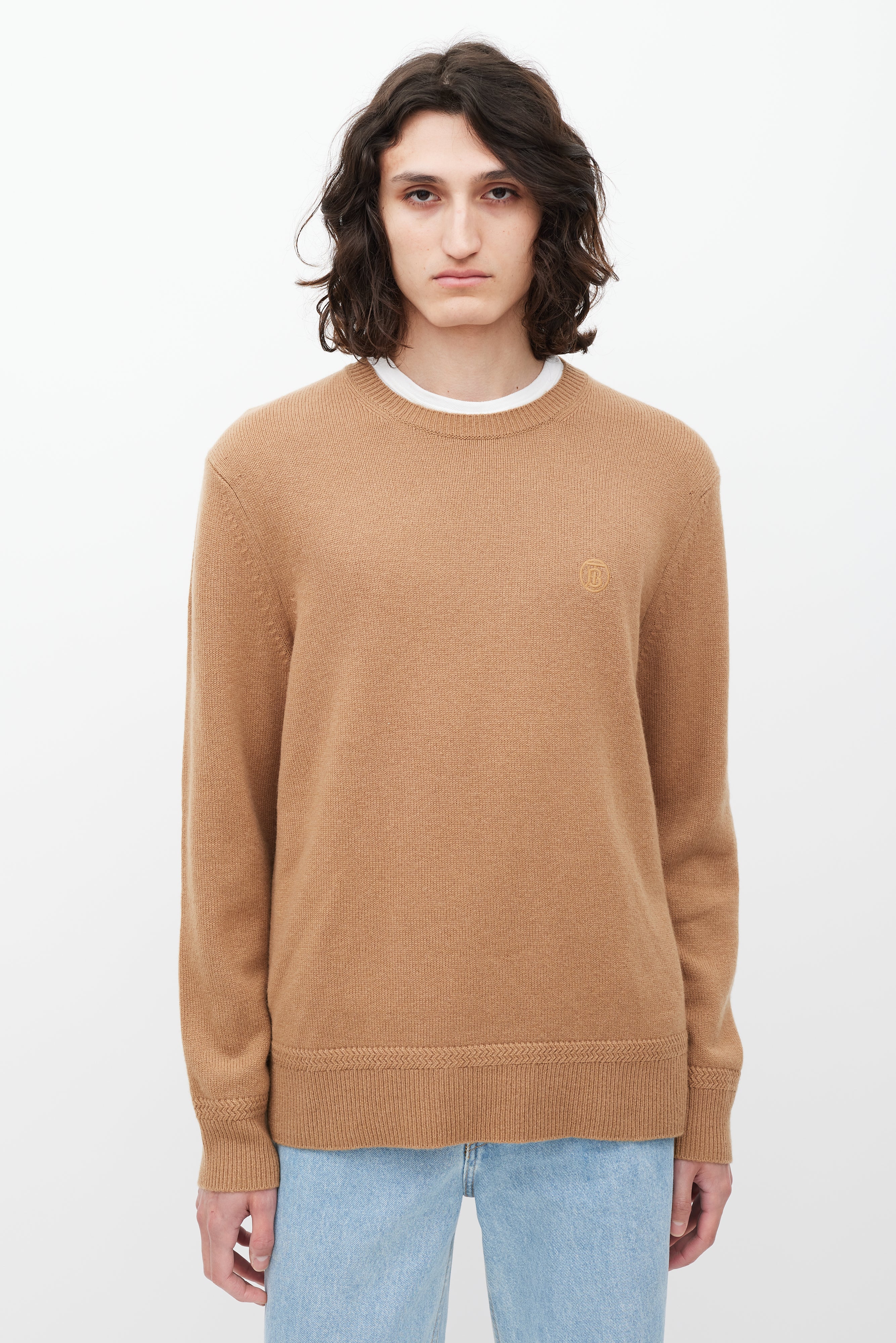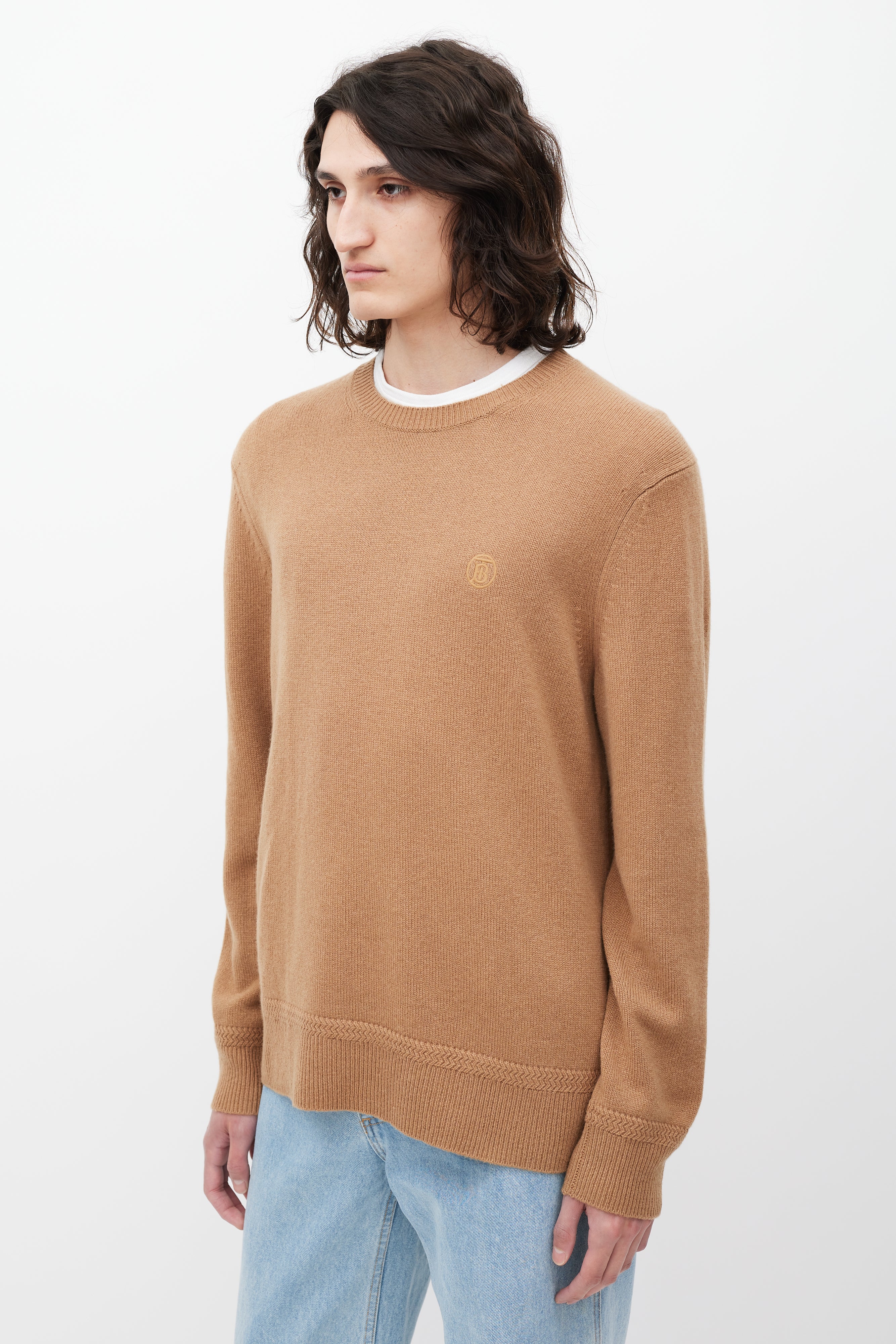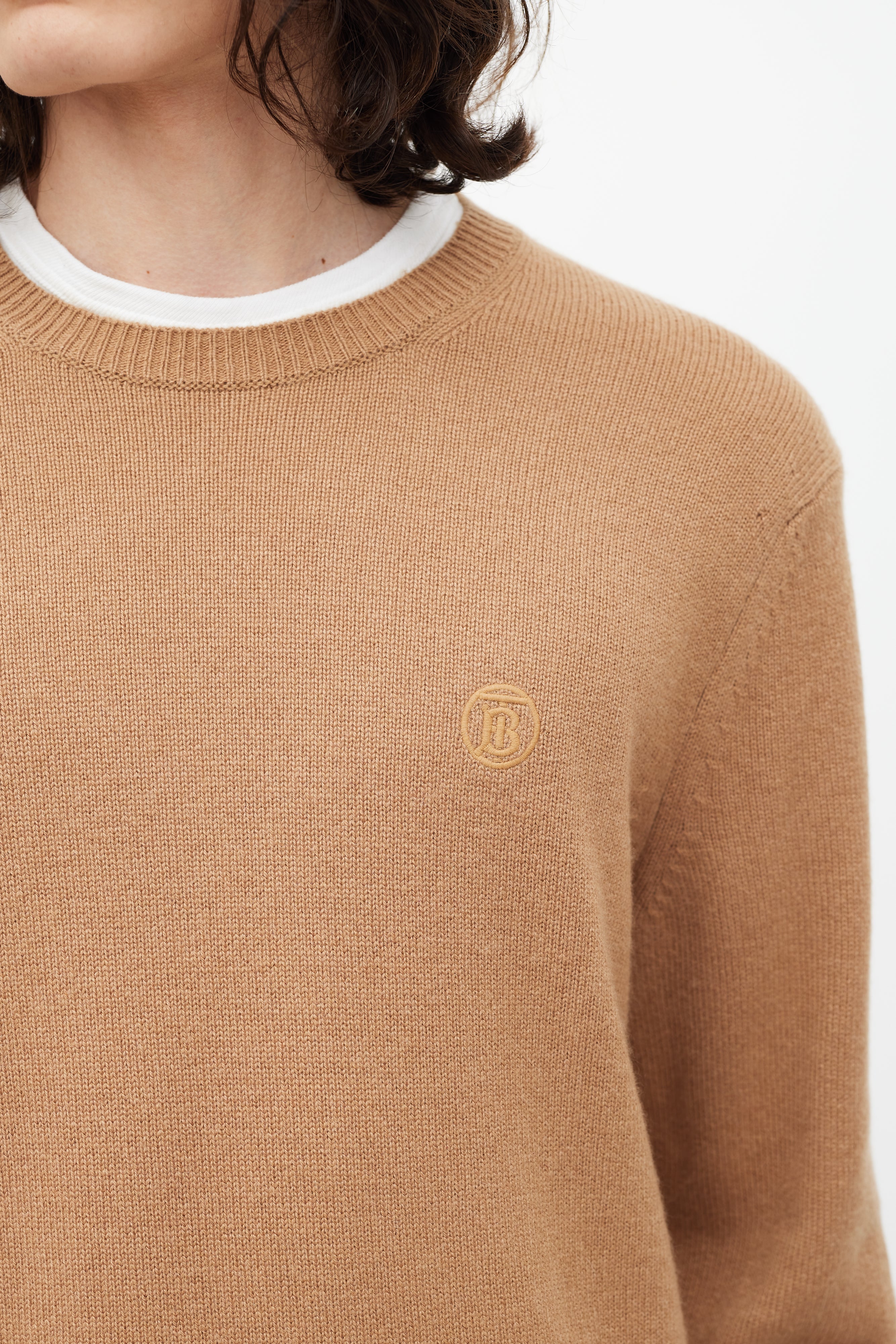 Pre-owned Burberry brown cashmere sweater featuring a rounded neckline, embroidered TB logo at left chest, and ribbing at neck, hem, and cuffs.