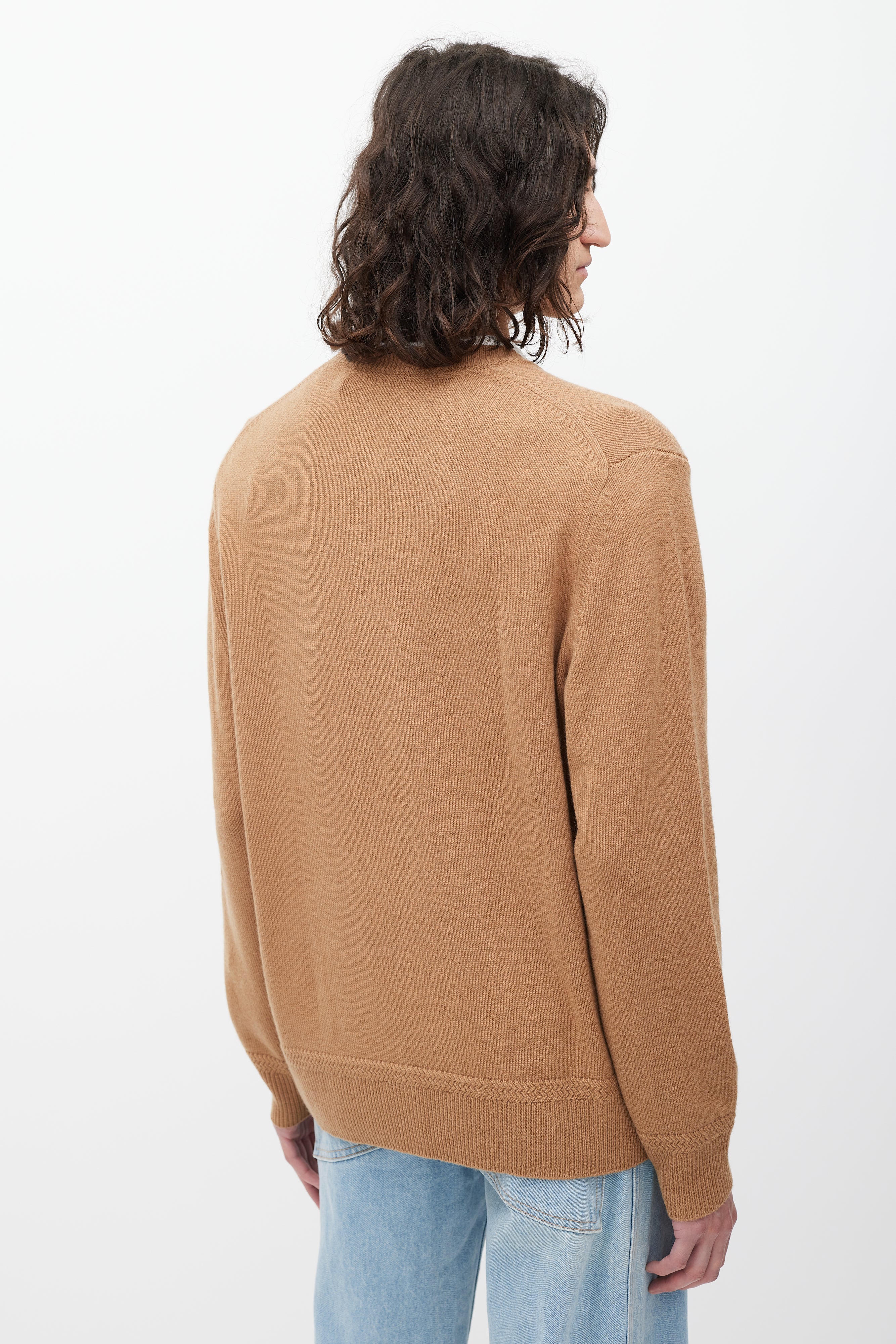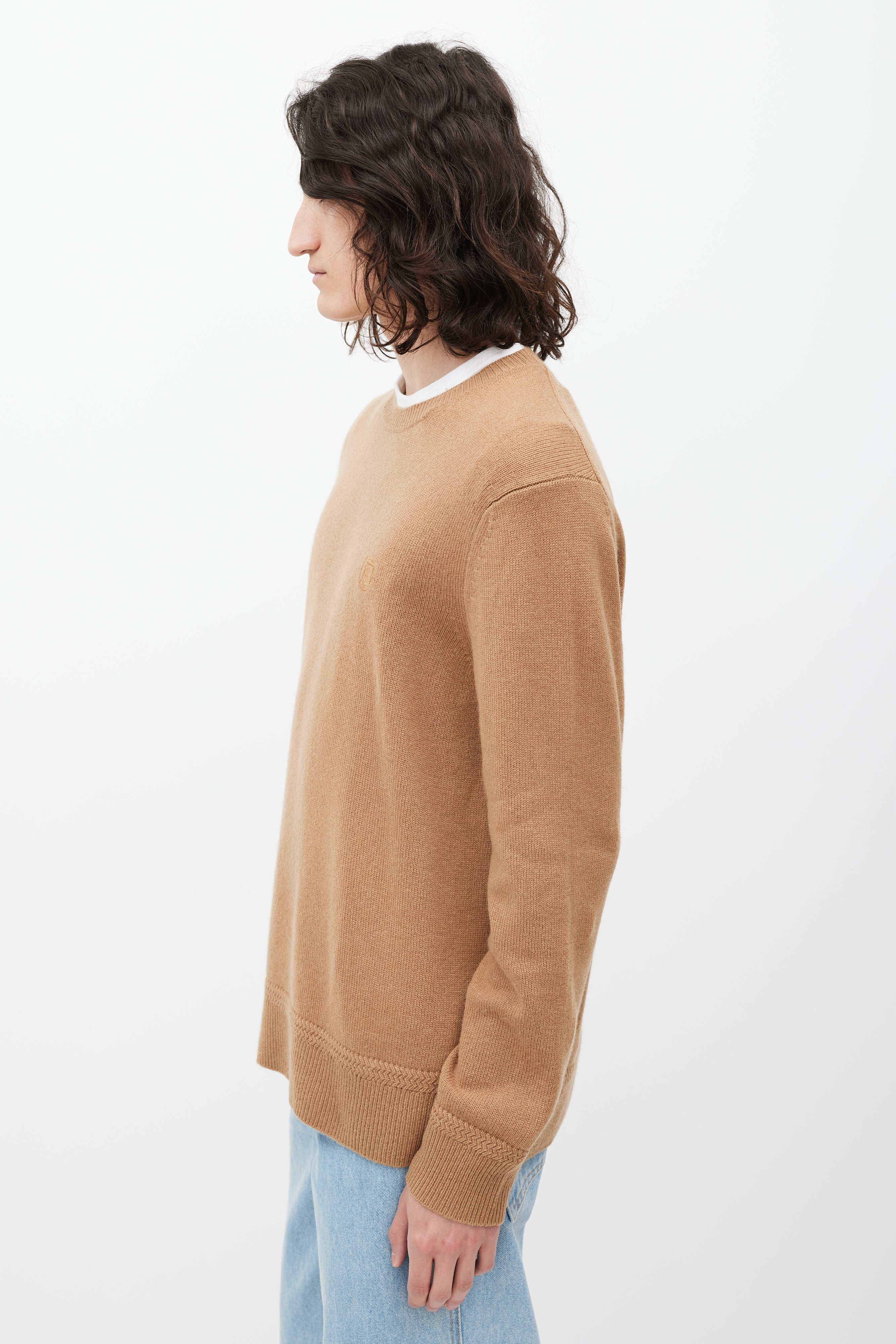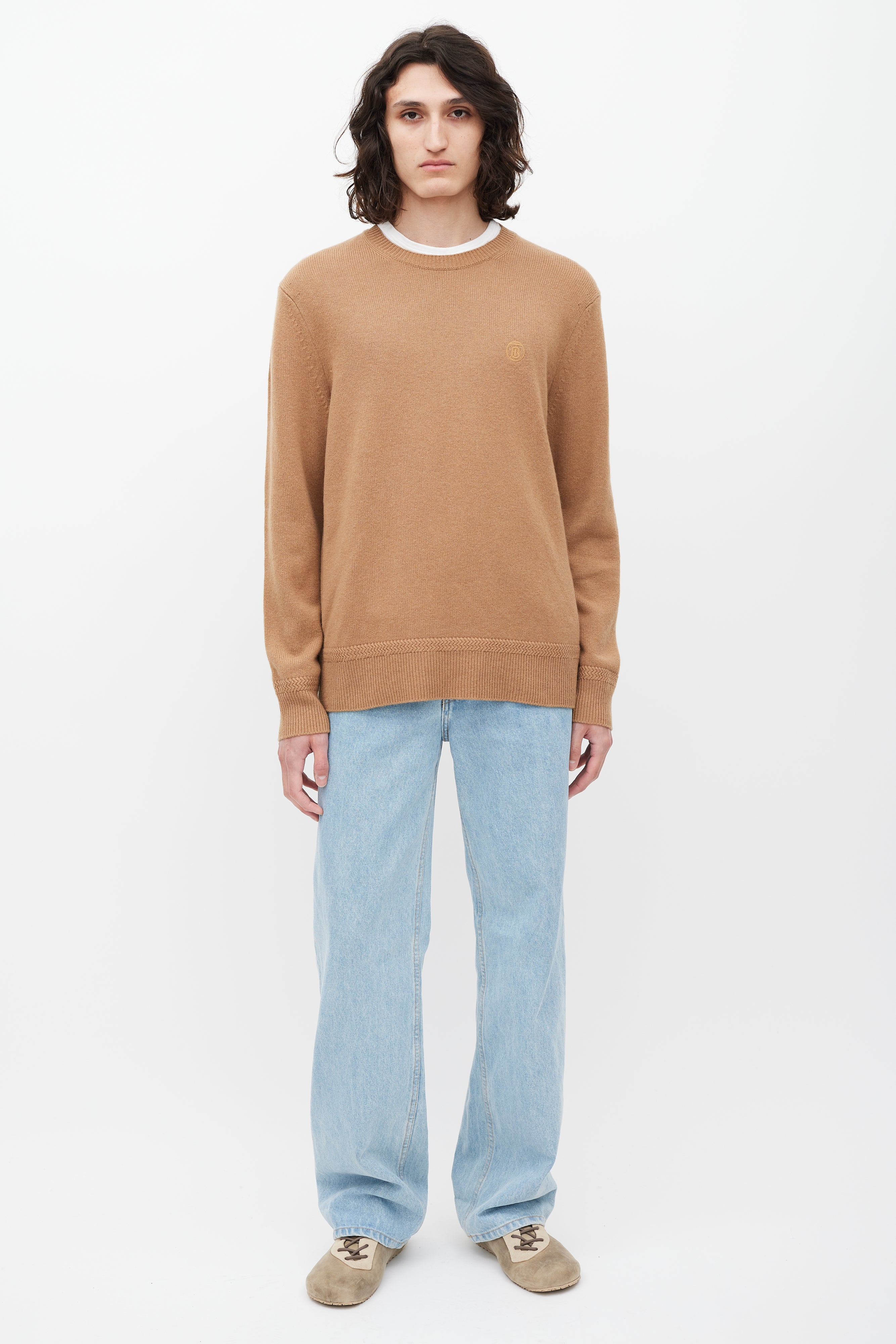 Pre-owned Burberry brown cashmere sweater featuring a rounded neckline, embroidered TB logo at left chest, and ribbing at neck, hem, and cuffs.