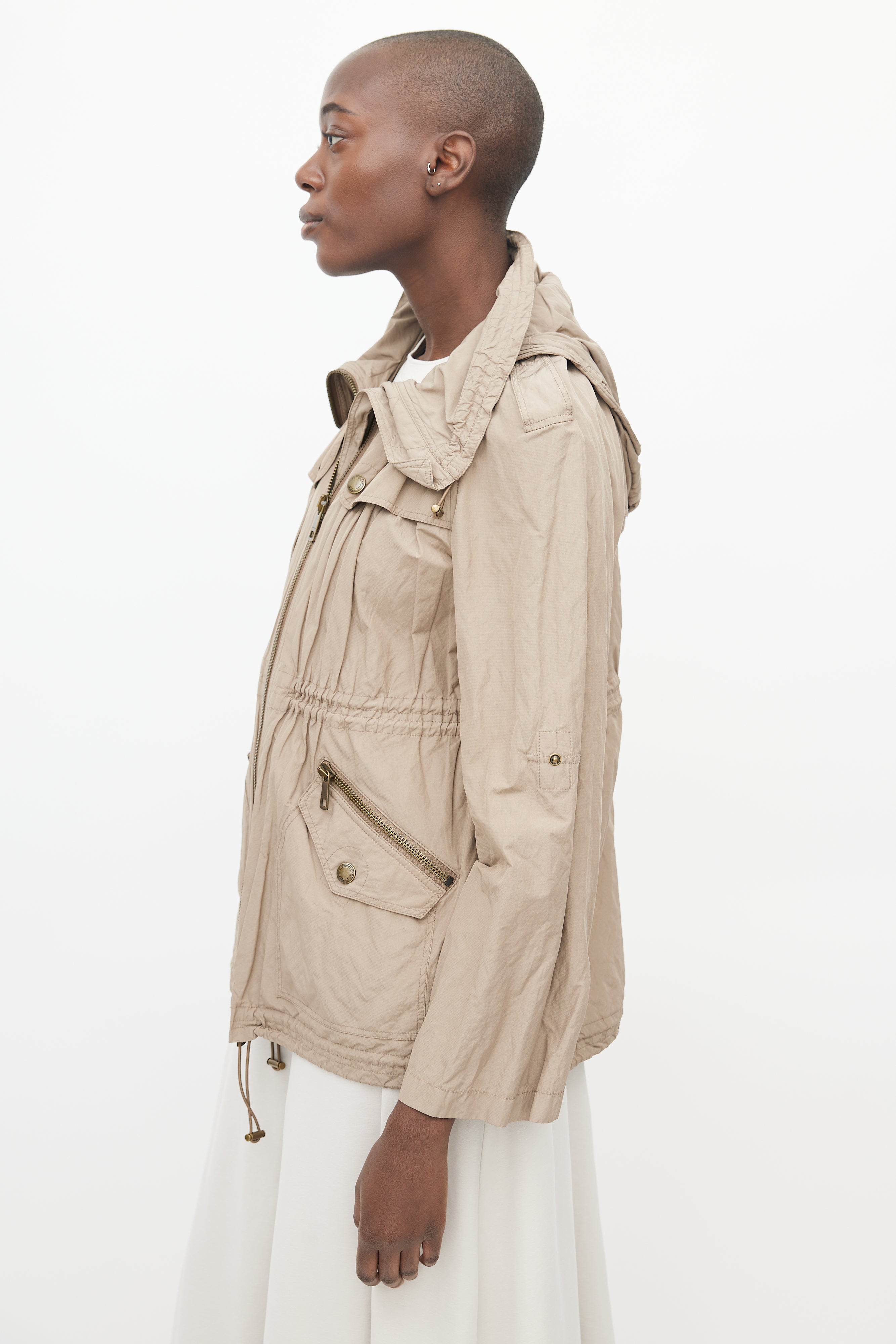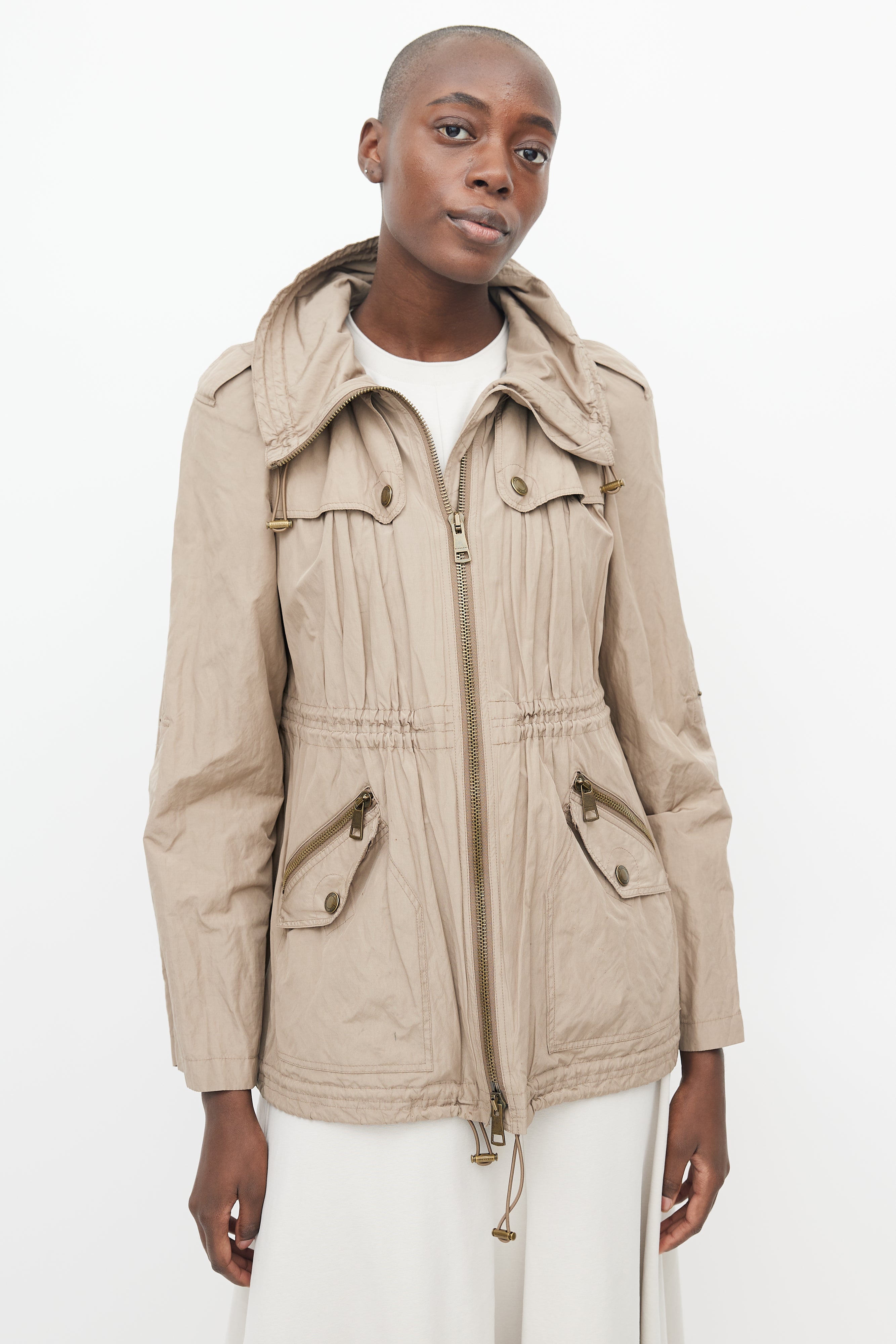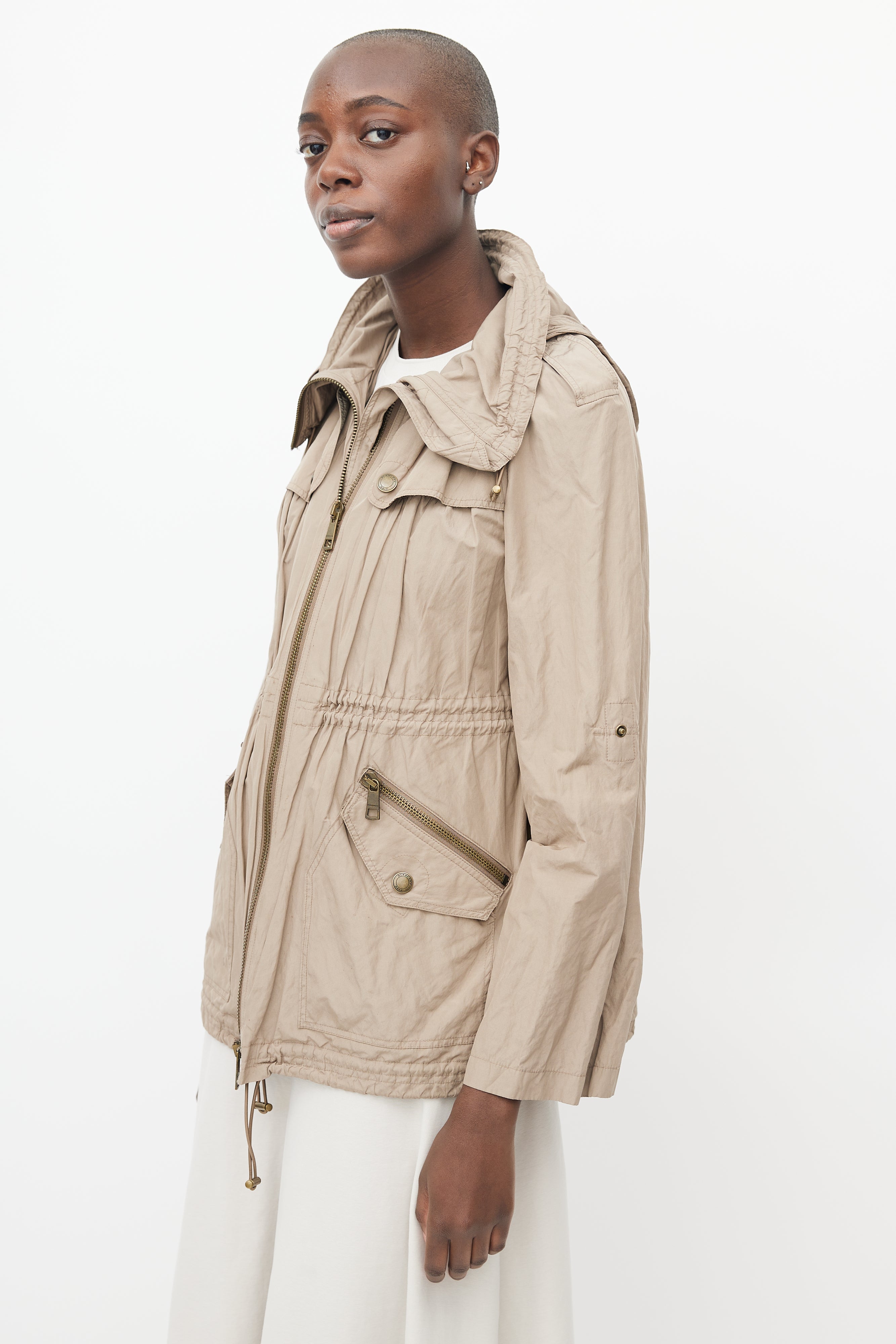Pre-owned Burberry Brit cargo jacket featuring diagonal zip pockets at front, drawstring at waist, storm flaps at front and back, double zip at front, drawstring at bottom and around hood. Unlined.