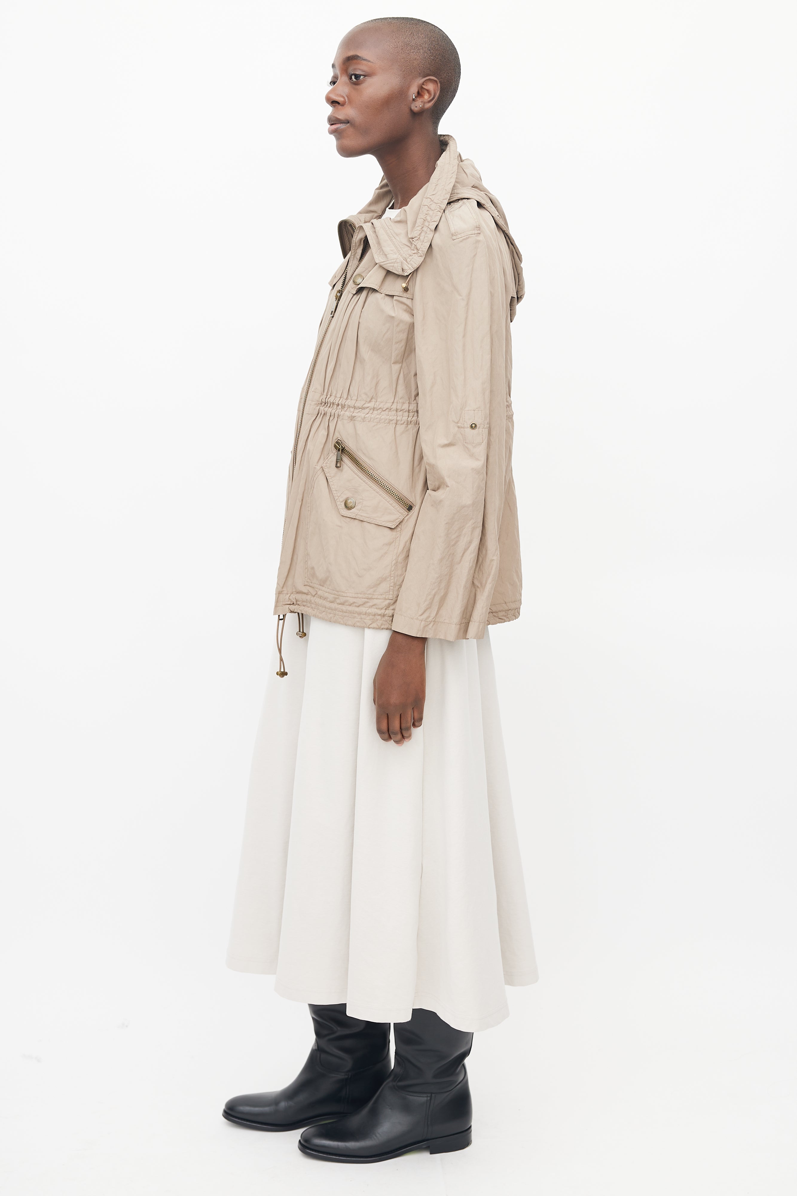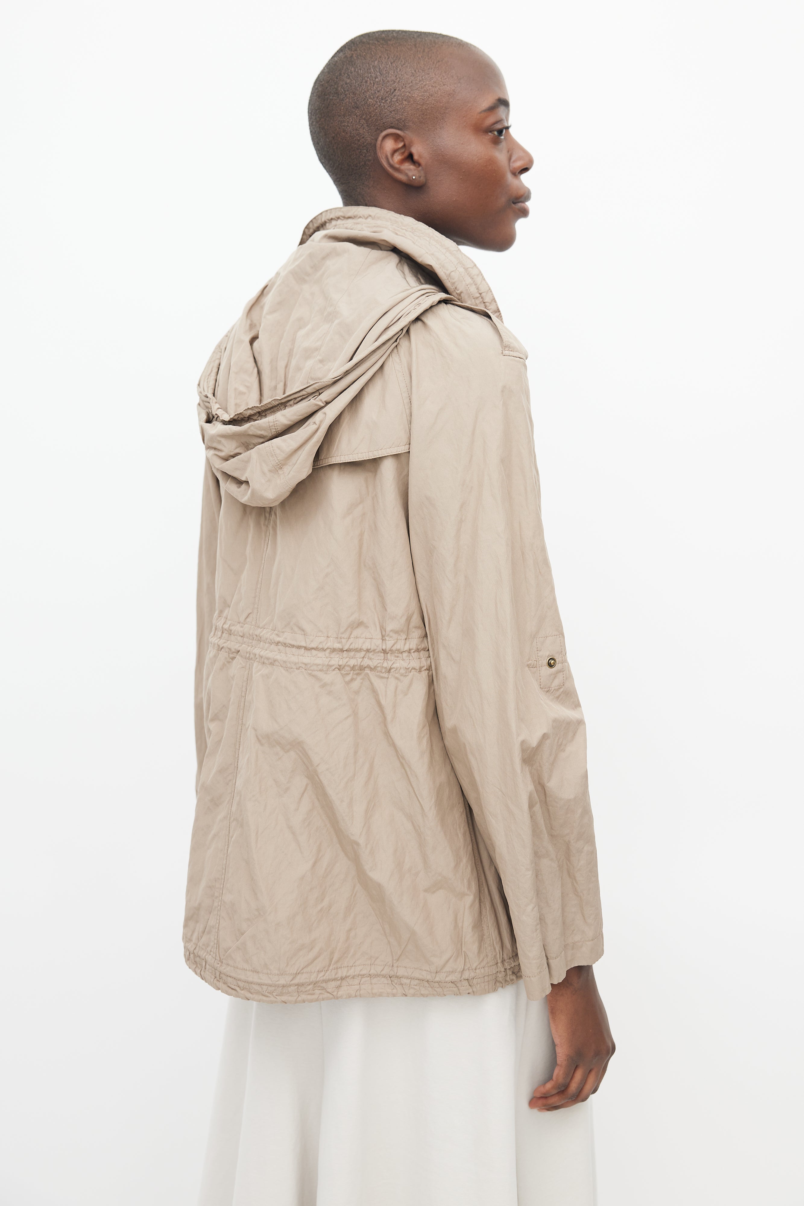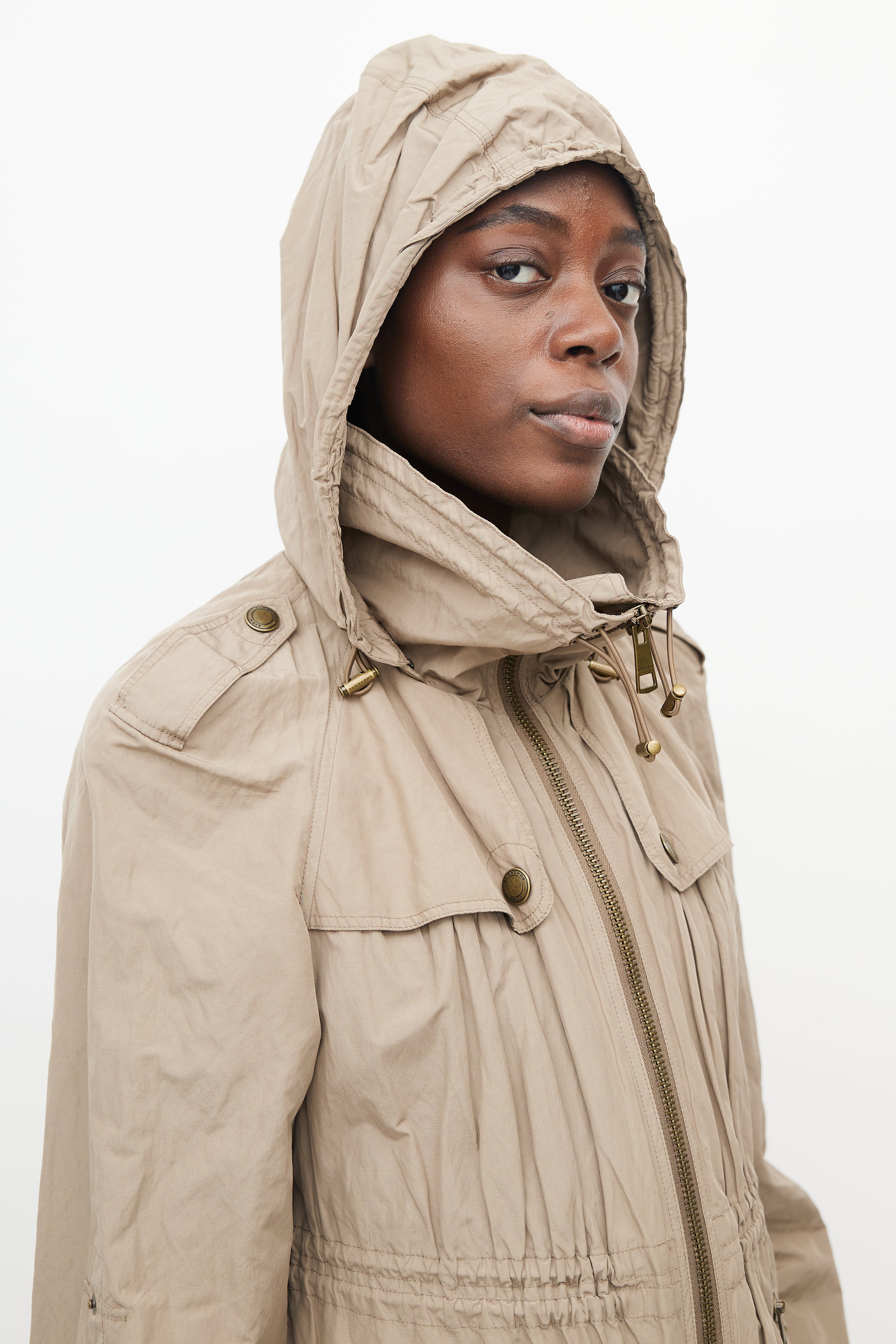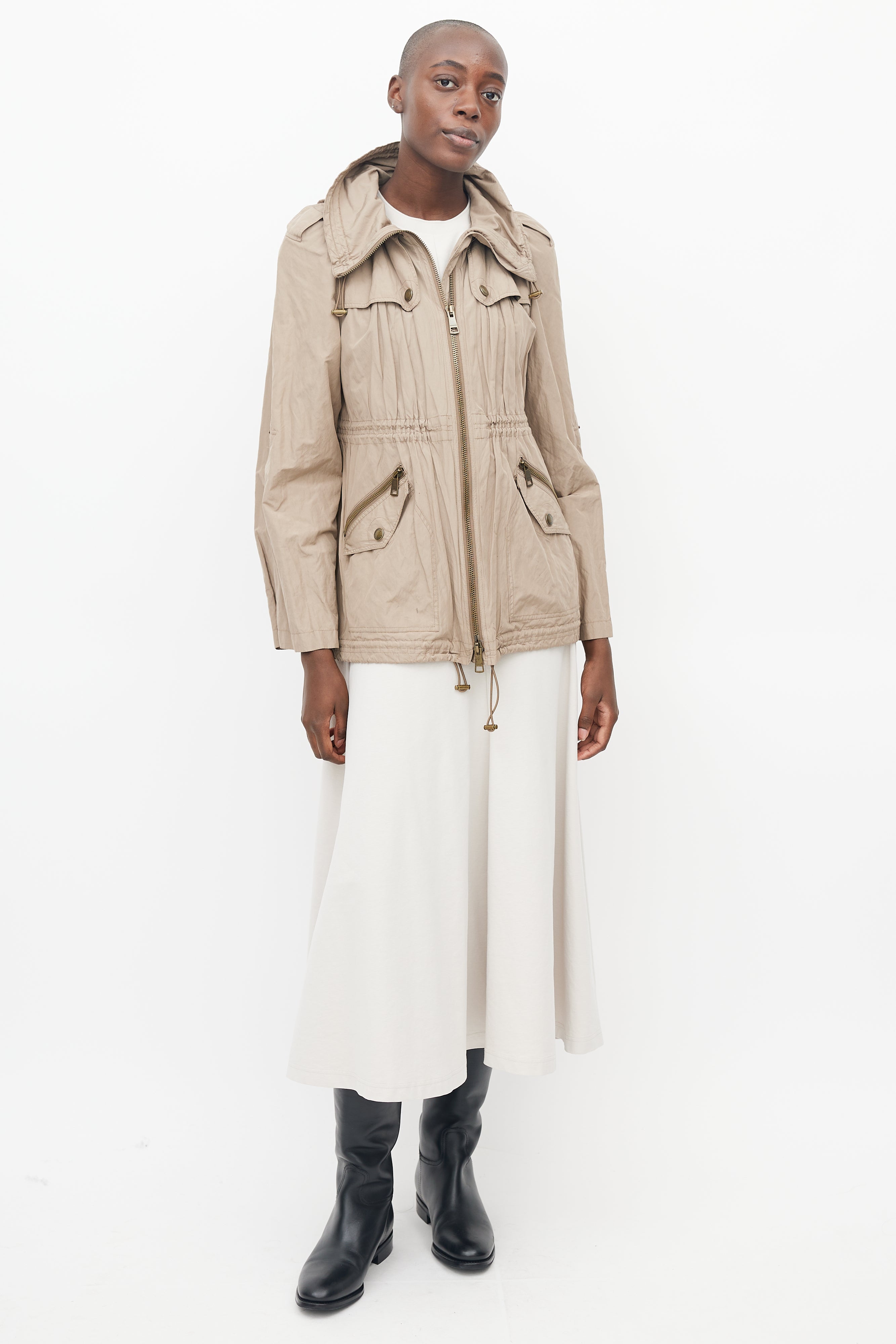 Pre-owned Burberry Brit cargo jacket featuring diagonal zip pockets at front, drawstring at waist, storm flaps at front and back, double zip at front, drawstring at bottom and around hood. Unlined.