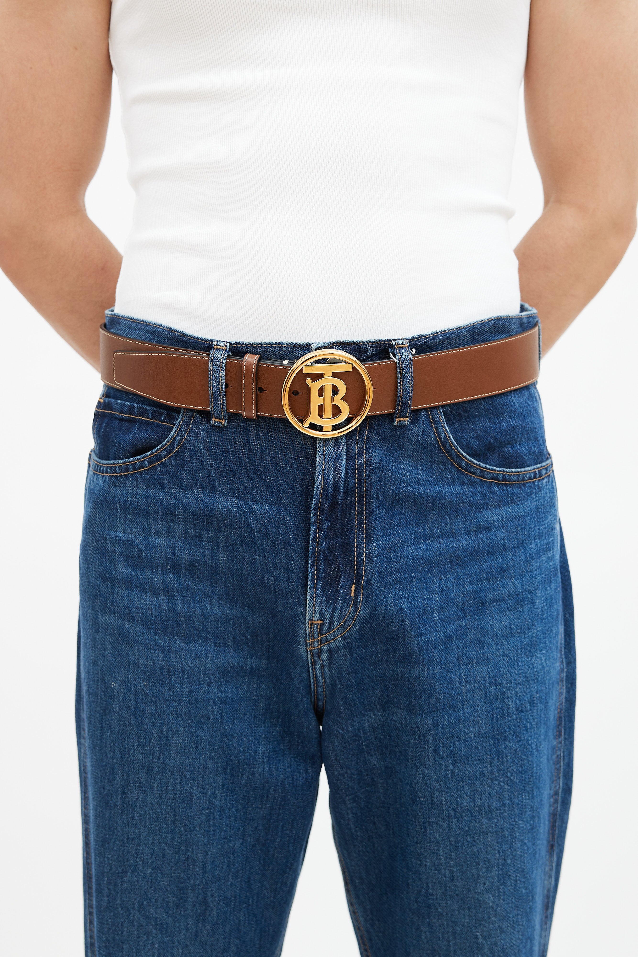 Pre-owned Burberry brown leather logo belt featuring contrast topstitching throughout, gold logo buckle, and single belt loop.