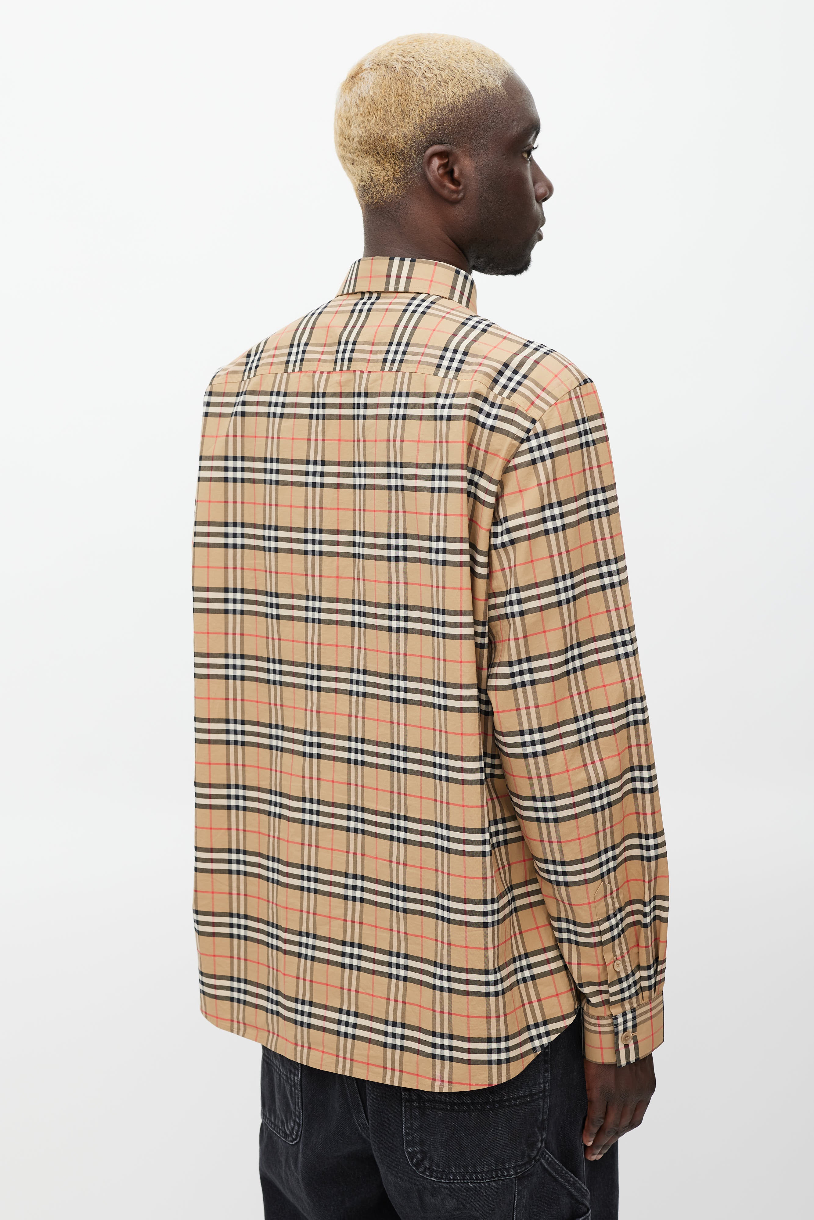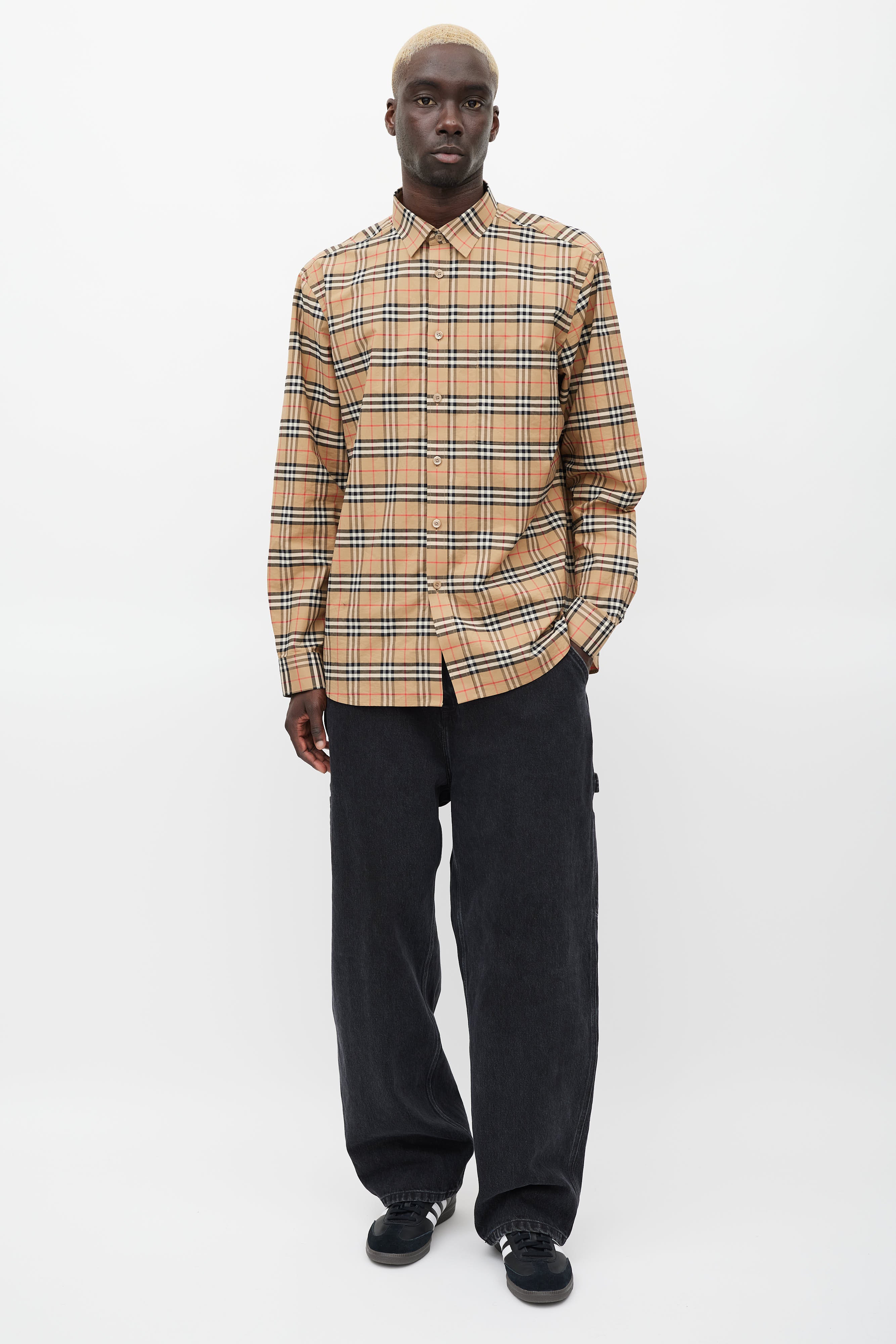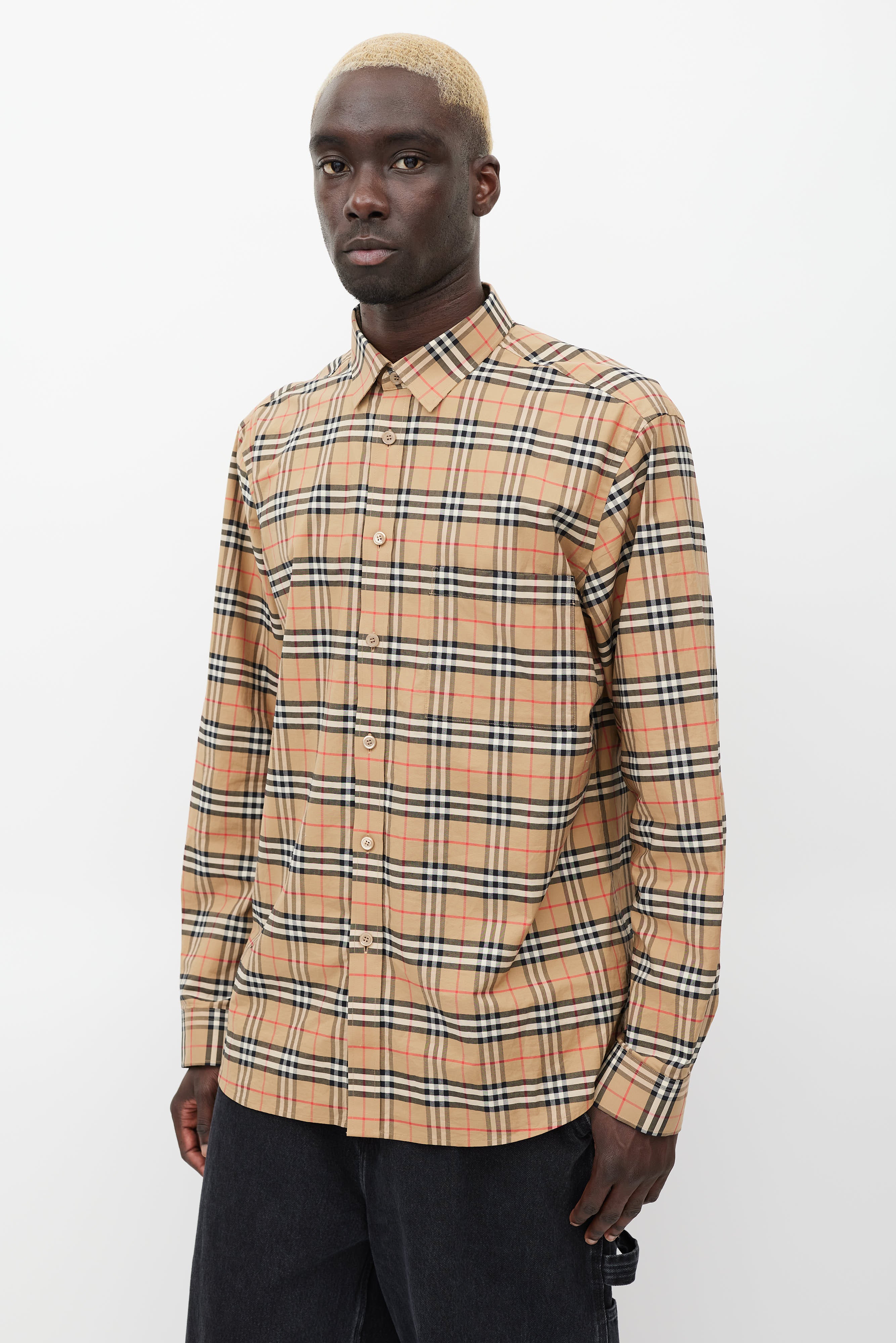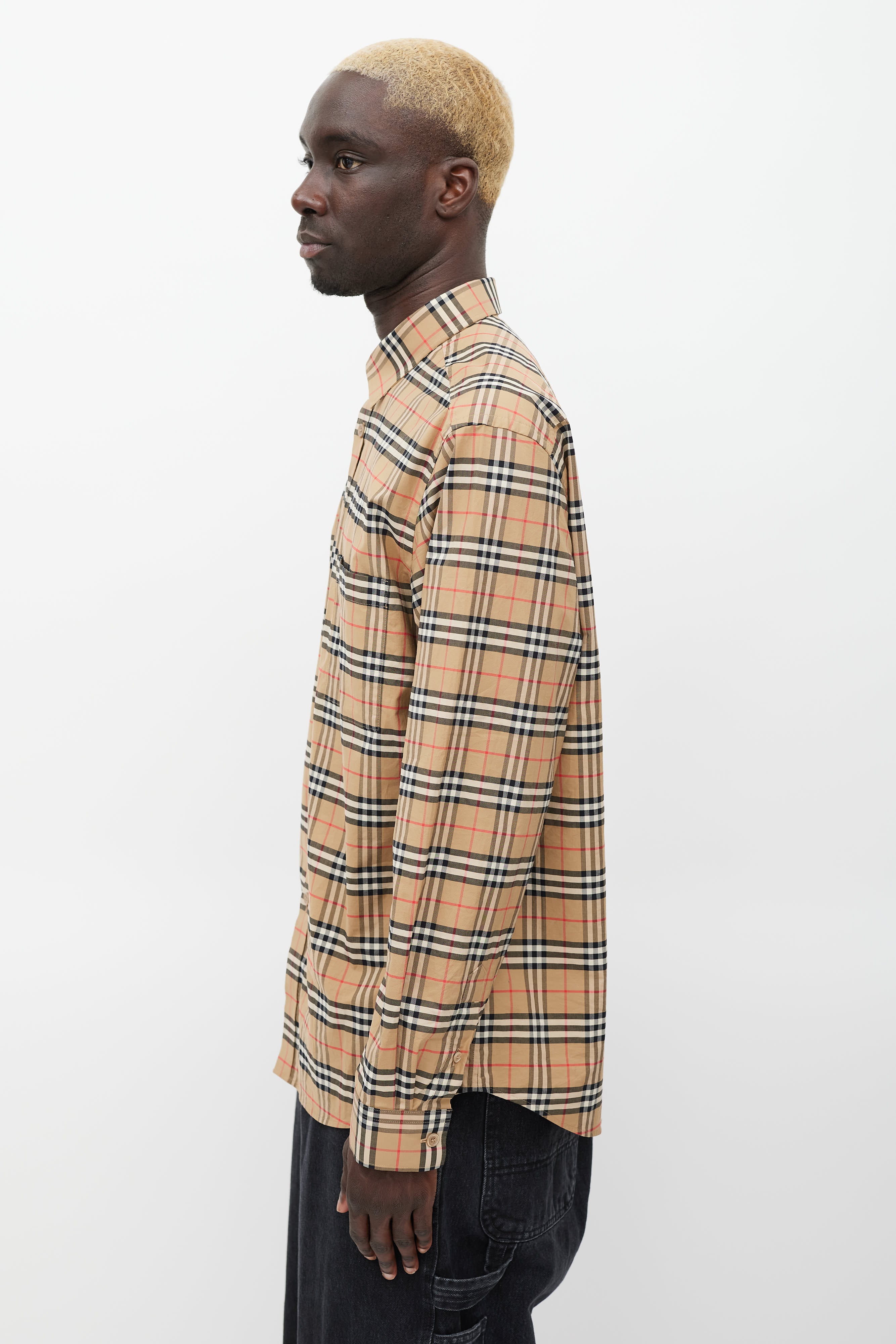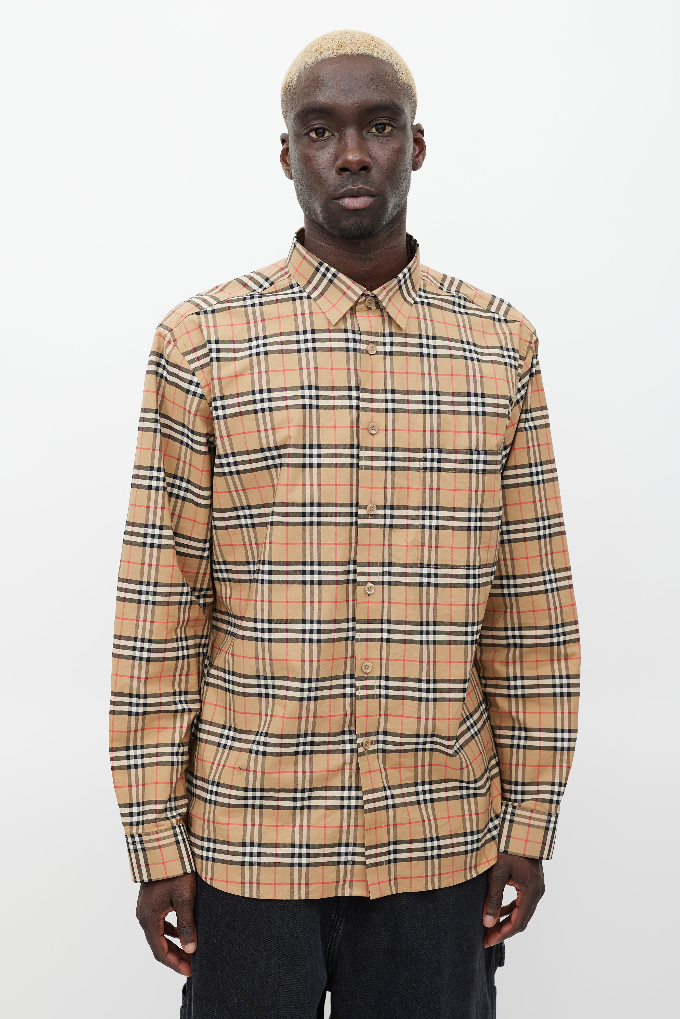 Pre-owned Burberry brown shirt featuring signature Nova check print throughout, pointed collar, patch pocket at left chest, button front, and long sleeves with buttoned cuffs.